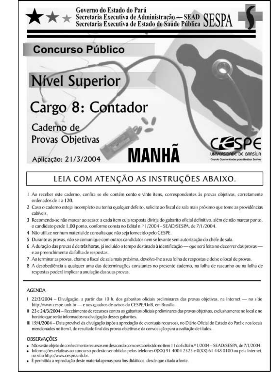 pcimarkpci MDAwMDowMDAwOjAwMDA6MDAwMDowMDAwOmZmZmY6MzZlOTpjMjU5:VGh1LCAxNiBTZXAgMjAyMSAxNToyMToxNiAtMDMwMA== pcimarkpci MDAwMDowMDAwOjAwMDA6MDAwMDowMDAwOmZmZmY6MzZlOTpjMjU5:VGh1LCAxNiBTZXAgMjAyMSAxNToyMToxNiAtMDMwMA== UnB / CESPE – SESPA/PA / Concurso Público – Aplicação: 21/3/2004 É permitida a reprodução apenas para fins didáticos, desde que citada a fonte. Cargo 8: Contador – 1 – De acordo com o comando a que cada um dos itens de 1 a 120 se refira, marque, na folha de respostas, para cada item: o campo designado com o código C, caso julgue o item CERTO; ou o campo designado com o código E, caso julgue o item ERRADO. A ausência de marcação ou a marcação de ambos os campos não serão apenadas, ou seja, não receberão pontuação negativa. Para as devidas marcações, use a folha de rascunho e, posteriormente, a folha de respostas, que é o único documento válido para a correção das suas provas. PARTE I – CONHECIMENTOS BÁSICOS Lição de sabedoria Um cientista muito preocupado com os problemas do mundo passava dias em seu laboratório, tentando encontrar meios de minorá-los. Certo dia, seu filho de 7 anos de idade invadiu o seu santuário decidido a ajudá-lo. O cientista, nervoso pela interrupção, tentou fazer o filho brincar em outro lugar. Vendo que seria impossível, procurou algo que pudesse distrair a criança. De repente, deparou-se com o mapa do mundo. Estava ali o que procurava. Recortou o mapa em vários pedaços e, junto com um rolo de fita adesiva, entregou ao filho dizendo: — Você gosta de quebra-cabeça? Então vou lhe dar o mundo para consertar. Aqui está ele todo quebrado. Veja se consegue consertá-lo bem direitinho. Mas faça tudo sozinho. Pelos seus cálculos, a criança levaria dias para recompor o mapa. Passadas algumas horas, ouviu o filho chamando-o calmamente. A princípio, o pai não deu crédito às palavras do filho. Seria impossível na sua idade conseguir recompor um mapa que jamais havia visto. Relutante, o cientista levantou os olhos de suas anotações, certo de que veria um trabalho digno de uma criança. Para sua surpresa, o mapa estava completo. Todos os pedaços haviam sido colocados nos devidos lugares. Como seria possível? Como o menino havia sido capaz? — Você não sabia como era o mundo, meu filho, como conseguiu? — Pai, eu não sabia como era o mundo, mas, quando você tirou o papel da revista para recortar, eu vi que do outro lado havia a figura de um homem. Quando você me deu o mundo para consertar, eu tentei, mas não consegui. Foi aí que me lembrei do homem, virei os recortes e comecei a consertar o homem que eu sabia como era. Quando consegui consertar o homem, virei a folha e vi que havia consertado o mundo! Autor anônimo. Mensagem que circulou por e-mail em fev./2004 (com adaptações). Julgue os itens subseqüentes, quanto às idéias, à tipologia textual e à grafia do texto Lição de sabedoria. � O título justifica-se porque, em função dos fatos narrados, depreende-se que o mundo só estará concertado quando houver harmonia entre os homens. � O texto, predominantemente descritivo, conta o espanto de um homem diante da esperteza de seu filho. � Os vocábulos “laboratório”, “santuário” e “vários” estão escritos com acento agudo porque são palavras paroxítonas terminadas em ditongo. � O pai, cientifico, tomando consciência da impossibilidade de o filho removê-lo de seu intento de pesquisador, buscou alguma tarefa que pudesse fazer a criança partilhar de suas atividades narrativas. � O cientista, relutante ao erguer os olhos de suas anotações, certamente julgando que encontraria um trabalho infantil, admirado constatou que o mapa-múndi estava completo e que os pedaços tinham sido postos em seus devidos lugares. Julgue o emprego do sinal indicativo de crase nos itens que se seguem. � A busca de soluções capazes de propiciar à humanidade a solução de seus problemas é o intuito maior de qualquer indivíduo que se dedique à pesquisa científica. � Aspirava à participar das atividades científicas do pai àquela criança esperta. � Ao constatar que, analisando à contraface da folha, existiam as partes da figura humana à mostra, a criança conseguiu desvendar à incógnita do desconserto do mundo. pcimarkpci MDAwMDowMDAwOjAwMDA6MDAwMDowMDAwOmZmZmY6MzZlOTpjMjU5:VGh1LCAxNiBTZXAgMjAyMSAxNToyMToxNiAtMDMwMA== UnB / CESPE – SESPA/PA / Concurso Público – Aplicação: 21/3/2004 É permitida a reprodução apenas para fins didáticos, desde que citada a fonte. Cargo 8: Contador – 2 – Texto I – itens de 9 a 30 Substantivo versus adjetivo Além das denúncias de tráfico de influência,1 lavagem de dólares, prevaricação, sonegação de impostos, nepotismo, fisiologismo e clientelismo político, outro tema que se encontra no centro das discussões éticas e políticas no4 país é o papel da imprensa. Acusam, do lado de lá, a imprensa, entre outras coisas, de sensacionalista, injusta, partidária, tendenciosa,7 integrante do ficcional sindicato do golpe ou daqueles segmentos interessados em destruir as instituições, como a presidência da República.10 Para melhor avaliar o que ocorre hoje nessa relação entre imprensa e governo, os jornalistas, cientistas políticos, sociólogos e historiadores de amanhã terão mais isenção e13 muito o que pesquisar. Hoje, estamos todos envolvidos como profissionais, como cidadãos. O senso profissional do jornalista mistura-se com16 sentimentos difusos de patriotismo, ódio, raiva, impotência, esperança, descrença. O momento apresenta um quadro rico em detalhes carregados de tensão. O conflito manifesta uma19 semântica, mediante a qual se tenta conquistar a opinião pública. Os acusados, alvos de denúncias substantivas,22 partem para o contra-ataque, na tentativa de atingir seus acusadores com frases adjetivas. De preferência, desabonadoras. A tática não é nova. Quando Nero procurou25 algu
