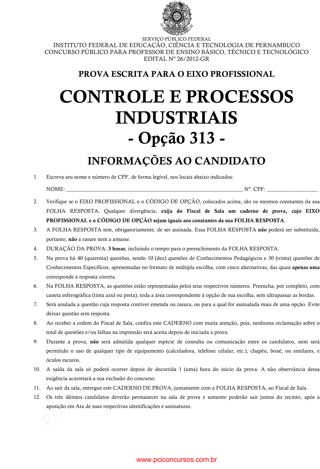 pcimarkpci MDAwMDowMDAwOjAwMDA6MDAwMDowMDAwOmZmZmY6MzZlOTpjMjU5:VGh1LCAxNiBTZXAgMjAyMSAxNTo0NDoyMSAtMDMwMA== SERVIÇO PÚBLICO FEDERAL INSTITUTO FEDERAL DE EDUCAÇÃO, CIÊNCIA E TECNOLOGIA DE PERNAMBUCO CONCURSO PÚBLICO PARA PROFESSOR DE ENSINO BÁSICO, TÉCNICO E TECNOLÓGICO EDITAL Nº 26/2012-GR PROVA ESCRITA PARA O EIXO PROFISSIONAL CONTROLE E PROCESSOS INDUSTRIAIS - Opção 313 - INFORMAÇÕES AO CANDIDATO 1. Escreva seu nome e número de CPF, de forma legível, nos locais abaixo indicados: NOME: __________________________________________________________________ Nº. CPF: ___________________ 2. Verifique se o EIXO PROFISSIONAL e o CÓDIGO DE OPÇÃO, colocados acima, são os mesmos constantes da sua FOLHA RESPOSTA. Qualquer divergência, exija do Fiscal de Sala um caderno de prova, cujo EIXO PROFISSIONAL e o CÓDIGO DE OPÇÃO sejam iguais aos constantes da sua FOLHA RESPOSTA. 3. A FOLHA RESPOSTA tem, obrigatoriamente, de ser assinada. Essa FOLHA RESPOSTA não poderá ser substituída, portanto, não a rasure nem a amasse. 4. DURAÇÃO DA PROVA: 3 horas, incluindo o tempo para o preenchimento da FOLHA RESPOSTA. 5. Na prova há 40 (quarenta) questões, sendo 10 (dez) questões de Conhecimentos Pedagógicos e 30 (trinta) questões de Conhecimentos Específicos, apresentadas no formato de múltipla escolha, com cinco alternativas, das quais apenas uma corresponde à resposta correta. 6. Na FOLHA RESPOSTA, as questões estão representadas pelos seus respectivos números. Preencha, por completo, com caneta esferográfica (tinta azul ou preta), toda a área correspondente à opção de sua escolha, sem ultrapassar as bordas. 7. Será anulada a questão cuja resposta contiver emenda ou rasura, ou para a qual for assinalada mais de uma opção. Evite deixar questão sem resposta. 8. Ao receber a ordem do Fiscal de Sala, confira este CADERNO com muita atenção, pois, nenhuma reclamação sobre o total de questões e/ou falhas na impressão será aceita depois de iniciada a prova. 9. Durante a prova, não será admitida qualquer espécie de consulta ou comunicação entre os candidatos, nem será permitido o uso de qualquer tipo de equipamento (calculadora, telefone celular, etc.), chapéu, boné, ou similares, e óculos escuros. 10. A saída da sala só poderá ocorrer depois de decorrida 1 (uma) hora do início da prova. A não observância dessa exigência acarretará a sua exclusão do concurso. 11. Ao sair da sala, entregue este CADERNO DE PROVA, juntamente com a FOLHA RESPOSTA, ao Fiscal de Sala. 12. Os três últimos candidatos deverão permanecer na sala de prova e somente poderão sair juntos do recinto, após a aposição em Ata de suas respectivas identificações e assinaturas. www.pciconcursos.com.br pcimarkpci MDAwMDowMDAwOjAwMDA6MDAwMDowMDAwOmZmZmY6MzZlOTpjMjU5:VGh1LCAxNiBTZXAgMjAyMSAxNTo0NDoyMSAtMDMwMA== CONHECIMENTOS PEDAGÓGICOS 1. A Lei de Diretrizes e Bases da Educação Nacional nº 9.394, de 20 de dezembro de 1996, apresenta diretrizes para todas as modalidades e níveis de ensino, disciplinando a educação escolar. Sobre os conhecimentos profissionais informais adquiridos em experiências extra-escolares, essa Lei possibilita a) a análise para inclusão sistêmica dos conhecimentos formais e informais nas matrizes curriculares ou nos componentes curriculares de áreas afins. b) o reconhecimento e a certificação de conhecimentos adquiridos na educação profissional, tecnológica ou no trabalho para fins de conclusão de estudos. c) o reconhecimento dos conhecimentos formais e informais adquiridos em experiências extra-escolares para promover a contextualização. d) a observância desses conhecimentos, via análise criteriosa, para isenção de estudos em componentes curriculares correspondentes. e) a identificação dos conhecimentos extra-escolares para ressignificação do currículo formal, promovendo maior relação teoria-prática. 2. A Lei Nº 11.892, de 29 de dezembro de 2008, institui a Rede Federal de Educação Profissional, Científica e Tecnológica; cria, portanto, os Institutos Federais de Educação, Ciência e Tecnologia. A partir dessa Lei, é correto afirmar que os Institutos Federais a) são equiparados às universidades devido a sua excelência predominante na oferta de educação tecnológica voltada para formação de tecnólogos nas áreas de engenharia. b) constituem-se centros de educação preferencialmente tecnológica para atender às demandas produtivas locais e regionais, investindo em ciência e tecnologia. c) ao serem equiparados às universidades, tendem à diminuição da oferta de educação profissional em nível técnico, investindo mais em educação superior tecnológica. d) ofertarão 50% das suas vagas para educação profissional de nível superior, tendo em vista sua nova reestrutura organizacional e sistêmica de instituição superior tecnológica. e) são equiparados às universidades, para efeito das disposições legais que regem a regulação, supervisão e avaliação das instituições de educação superior. 3. Mais especificamente sobre os Direitos Humanos como princípio de vida que visa contribuir com uma melhor convivência humana em sociedade, através do respeito às diferenças, a Resolução CNE/CEB Nº 2, de 30 de janeiro de 2012, determina que os direitos humanos a) sejam tratados de forma integrada, como princípio norteador, permeando todo currículo do ensino médio. b) constituam-se em nova disciplina curricular eletiva em todos os anos do ensino médio. c) sejam incluídos nos currículos escolares em forma de componente curricular opinativo. d) sejam propostos e implementados pelo projeto político-pedagógico como área das ciências humanas. e) constituam-se em conteúdos obrigatórios de Filosofia e Sociologia, com a finalidade de promover a cidadania. 4. Analisando a Resolução CNE/CEB Nº 2, de 30 de janeiro de 2012, que define as diretrizes curriculares nacionais para o ensino médio, e