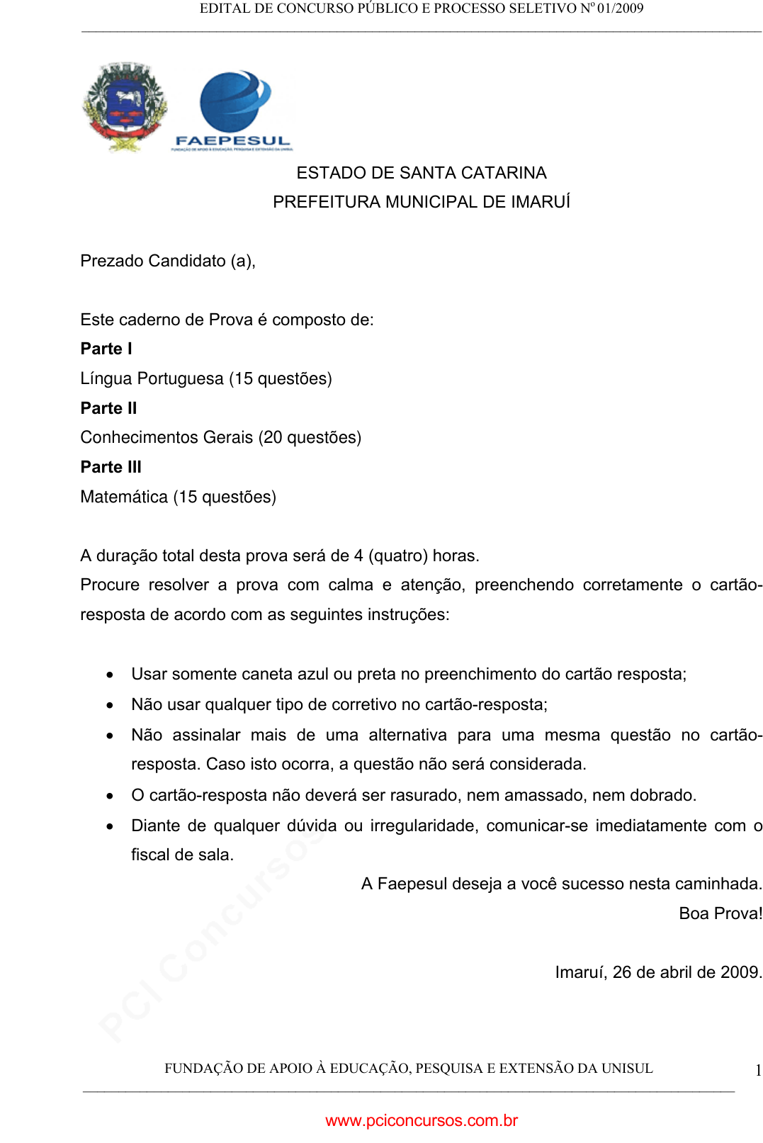 pcimarkpci MDAwMDowMDAwOjAwMDA6MDAwMDowMDAwOmZmZmY6MzZlOTpjMjU5:RnJpLCAxNyBTZXAgMjAyMSAwMjozODo1OCAtMDMwMA== EDITAL DE CONCURSO PÚBLICO E PROCESSO SELETIVO No 01/2009 ________________________________________________________________________________________________ FUNDAÇÃO DE APOIO À EDUCAÇÃO, PESQUISA E EXTENSÃO DA UNISUL 1 ESTADO DE SANTA CATARINA PREFEITURA MUNICIPAL DE IMARUÍ Prezado Candidato (a), Este caderno de Prova é composto de: Parte I Língua Portuguesa (15 questões) Parte II Conhecimentos Gerais (20 questões) Parte III Matemática (15 questões) A duração total desta prova será de 4 (quatro) horas. Procure resolver a prova com calma e atenção, preenchendo corretamente o cartão- resposta de acordo com as seguintes instruções: • Usar somente caneta azul ou preta no preenchimento do cartão resposta; • Não usar qualquer tipo de corretivo no cartão-resposta; • Não assinalar mais de uma alternativa para uma mesma questão no cartão- resposta. Caso isto ocorra, a questão não será considerada. • O cartão-resposta não deverá ser rasurado, nem amassado, nem dobrado. • Diante de qualquer dúvida ou irregularidade, comunicar-se imediatamente com o fiscal de sala. A Faepesul deseja a você sucesso nesta caminhada. Boa Prova! Imaruí, 26 de abril de 2009. ____________________________________________________________________________________________ www.pciconcursos.com.br pcimarkpci MDAwMDowMDAwOjAwMDA6MDAwMDowMDAwOmZmZmY6MzZlOTpjMjU5:RnJpLCAxNyBTZXAgMjAyMSAwMjozODo1OCAtMDMwMA== EDITAL DE CONCURSO PÚBLICO E PROCESSO SELETIVO No 01/2009 ________________________________________________________________________________________________ FUNDAÇÃO DE APOIO À EDUCAÇÃO, PESQUISA E EXTENSÃO DA UNISUL 2 Prova de Língua Portuguesa AMAZÔNIA E GARIMPO (Rafael Della Giustina Leal) Dia 30 de dezembro o barco chegou a Manaus, foram três dias descendo o rio Negro, dormindo em rede e comendo frango com farinha. Despedi-me dos conhecidos e dois dias depois estava em outro barco, dessa vez com destino a Santarém. Antes do barco partir, enquanto pendurava minha rede, reconheci o cearense. Seu nome é Wilson, ele agora viaja com a mãe que me olha com ar de desconfiança, eu comento com ela que nunca vi alguém contar tantas piadas quanto o filho dela. Antes do barco partir eu aproveitei que o som do bar ainda não havia sido ligado para sentar-me a uma mesa e ler um pouco. O livro: Amazônia, a valsa da galáxia – o abc da grande planície, escrito por meus tios Raimundo Caruso e Mariléia Leal Caruso. Resultado de uma viagem de cerca de três meses na região amazônica em que, conforme a contracapa, “o casal (…) – ela, geógrafa; ele, escritor e jornalista – percorreu milhares de quilômetros, recolheu dados e entrevistou importantes historiadores, cientistas, exploradores e intelectuais da Amazônia”. Enquanto lia, Wilson chegou e começamos a conversar, ele perguntou se eu era “doutor” (professor ou pesquisador), pois vivia com aquele livro e meu caderninho a tiracolo. Falei-lhe de que tratava o livro e que estava lendo sobre garimpo. Ele trabalhava como garimpeiro desde os 12 anos de idade, agora estava com 25. 01. Em relação ao texto, é CORRETO afirmar que: A. Dentre os passageiros do barco está Wilson, um homem de 25 anos que tinha como companhia de viagem os tios. B. Quem nos conta a história narrada em “Amazônia e Garimpo” é um geógrafo, que adora livros, e que está há três meses viajando pela região Amazônica. C. O texto é narrado por um homem que viaja de barco com destino a Santarém e encontra um cearense que trabalhava como garimpeiro desde os 12 anos. D. Wilson, narrador da história, que viaja com a sua mãe, está percorrendo a região Amazônica em busca de matéria para o seu livro que já tem até título. E. Dentre os passageiros do barco, destaca-se o cearense-garimpeiro que, ao encontrar o passageiro que nos conta a história, o olha com ar de desconfiança. 02. Leia com atenção as alternativas, observando os TERMOS GRIFADOS e, depois, assinale aquela que preserva o MESMO SENTIDO DO TEXTO. A. “Dia 30 de dezembro o barco chegou a Manaus, foram três dias navegando pelo rio Negro.” B. “[...] dois dias depois estava em outro barco, dessa vez com passagem por Santarém”. C. “Seu nome é Wilson, ele agora viaja com a mãe que me olha com ar de curiosidade[...]”. D. “Enquanto lia, Wilson chegou e começamos a conversar, ele perguntou se eu era médico”. E. “Falei-lhe de que cuidava do livro e que estava lendo sobre garimpo”. ____________________________________________________________________________________________ www.pciconcursos.com.br pcimarkpci MDAwMDowMDAwOjAwMDA6MDAwMDowMDAwOmZmZmY6MzZlOTpjMjU5:RnJpLCAxNyBTZXAgMjAyMSAwMjozODo1OCAtMDMwMA== EDITAL DE CONCURSO PÚBLICO E PROCESSO SELETIVO No 01/2009 ________________________________________________________________________________________________ FUNDAÇÃO DE APOIO À EDUCAÇÃO, PESQUISA E EXTENSÃO DA UNISUL 3 03. Assinale a alternativa que contém uma palavra proparoxítona, uma paroxítona e uma oxítona: A. Pôneis, táxi, três. B. Geógrafa, álibi, ímã. C. Quilômetro; galáxia, alguém. D. Sílaba, Amazônia, pé. E. Planície, amável, vatapá. 04. Na frase “Despedi-me dos conhecidos e dois dias depois estava em outro barco, dessa vez com destino a Santarém.”, os termos grifados são, respectivamente: A. Preposição, verbo, substantivo abstrato, substantivo comum. B. Pronome, verbo, substantivo comum, substantivo próprio. C. Verbo, substantivo, adjetivo, substantivo coletivo. D. Advérbio, verbo, substantivo próprio, adjetivo. E. Pronome, verbo, advérbio, substantivo abstrato. 05. Indique a frase em que o termo grifado é o antônimo do termo apresentado no texto “Amazônia e Garimpo”: A. “Resultado de uma viagem de cerca de três meses na região amazônica em que, de acordo com a contracapa [...]”. B. “Des