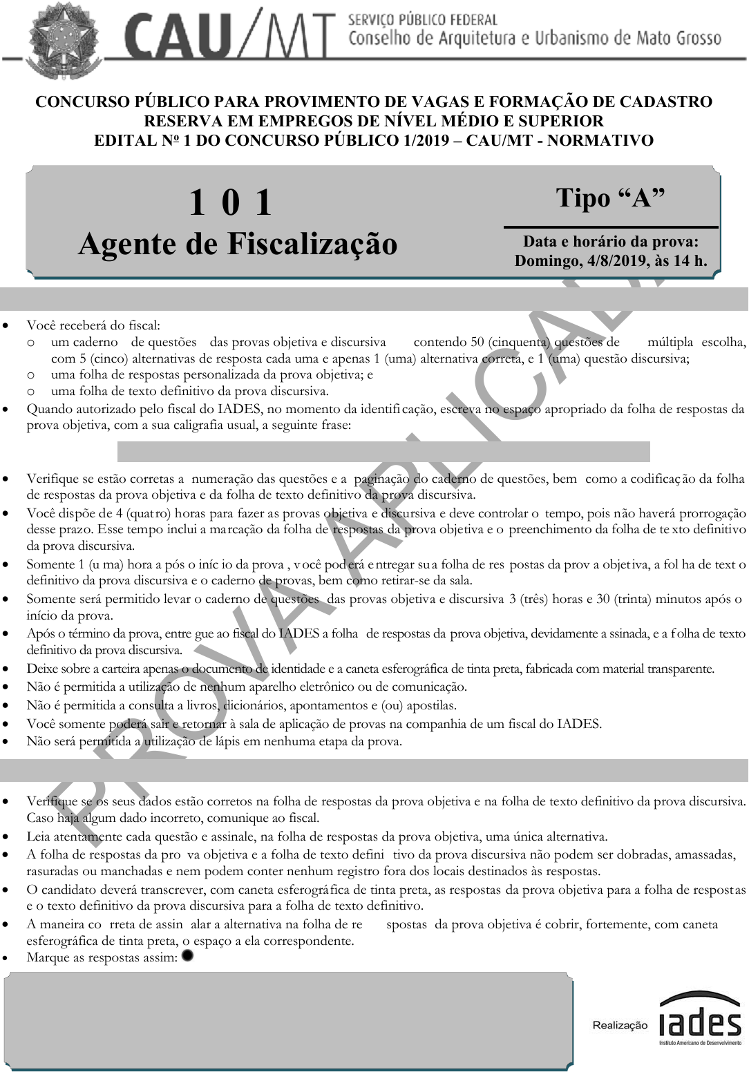 P R O V A A P L IC A D A CONCURSO PÚBLICO PARA PROVIMENTO DE VAGAS E FORMAÇÃO DE CADASTRO RESERVA EM EMPREGOS DE NÍVEL MÉDIO E SUPERIOR EDITAL No 1 DO CONCURSO PÚBLICO 1/2019 – CAU/MT - NORMATIVO 1 0 1 Agente de Fiscalização Tipo “A” Data e horário da prova: Domingo, 4/8/2019, às 14 h. I N S T R U Ç Õ E S Você receberá do fiscal: o um caderno de questões das provas objetiva e discursiva contendo 50 (cinquenta) questões de múltipla escolha, com 5 (cinco) alternativas de resposta cada uma e apenas 1 (uma) alternativa correta, e 1 (uma) questão discursiva; o uma folha de respostas personalizada da prova objetiva; e o uma folha de texto definitivo da prova discursiva. Quando autorizado pelo fiscal do IADES, no momento da identifi cação, escreva no espaço apropriado da folha de respostas da prova objetiva, com a sua caligrafia usual, a seguinte frase: O segredo do sucesso é saber o que ninguém mais sabe. Verifique se estão corretas a numeração das questões e a paginação do caderno de questões, bem como a codificação da folha de respostas da prova objetiva e da folha de texto definitivo da prova discursiva. Você dispõe de 4 (quatro) horas para fazer as provas objetiva e discursiva e deve controlar o tempo, pois não haverá prorrogação desse prazo. Esse tempo inclui a marcação da folha de respostas da prova objetiva e o preenchimento da folha de te xto definitivo da prova discursiva. Somente 1 (u ma) hora a pós o iníc io da prova , você poderá entregar sua folha de res postas da prov a objet iva, a fol ha de text o definitivo da prova discursiva e o caderno de provas, bem como retirar-se da sala. Somente será permitido levar o caderno de questões das provas objetiva e discursiva 3 (três) horas e 30 (trinta) minutos após o início da prova. Após o término da prova, entre gue ao fiscal do IADES a folha de respostas da prova objetiva, devidamente a ssinada, e a f olha de texto definitivo da prova discursiva. Deixe sobre a carteira apenas o documento de identidade e a caneta esferográfica de tinta preta, fabricada com material transparente. Não é permitida a utilização de nenhum aparelho eletrônico ou de comunicação. Não é permitida a consulta a livros, dicionários, apontamentos e (ou) apostilas. Você somente poderá sair e retornar à sala de aplicação de provas na companhia de um fiscal do IADES. Não será permitida a utilização de lápis em nenhuma etapa da prova. I N S T R U Ç Õ E S P A R A A P R O V A O BJ E T I V A E D I S C U R S I V A Verifique se os seus dados estão corretos na folha de respostas da prova objetiva e na folha de texto definitivo da prova discursiva. Caso haja algum dado incorreto, comunique ao fiscal. Leia atentamente cada questão e assinale, na folha de respostas da prova objetiva, uma única alternativa. A folha de respostas da pro va objetiva e a folha de texto defini tivo da prova discursiva não podem ser dobradas, amassadas, rasuradas ou manchadas e nem podem conter nenhum registro fora dos locais destinados às respostas. O candidato deverá transcrever, com caneta esferográfica de tinta preta, as respostas da prova objetiva para a folha de respostas e o texto definitivo da prova discursiva para a folha de texto definitivo. A maneira co rreta de assin alar a alternativa na folha de re spostas da prova objetiva é cobrir, fortemente, com caneta esferográfica de tinta preta, o espaço a ela correspondente. Marque as respostas assim: www.pciconcursos.com.br P R O V A A P L IC A D A CONCURSO PÚBLICO – CAU/MT 101 – AGENTE DE FISCALIZAÇÃO – TIPO “A” PÁGINA 2/16 P R O V A O B J E T I V A CONHECIMENTOS GERAIS Questões de 1 a 25 LÍNGUA PORTUGUESA Questões de 1 a 10 _______________________ Texto 1 para responder às questões de 1 a 3. Arquitetura para todos: empreendimentos devem prever acessibilidade 1 4 7 Novos empreendimentos residenciais no País deverão incorporar recursos de acessibilidade em todas as áreas de uso comum. Já as unidades habitacionais devem ser adaptadas de acordo com a demanda do comprador. Os condomínios terão prazo de 18 meses para se adaptarem às novas regras. Essas novas regras foram instituídas pelo Decreto no 9.451/2018 e regulamentam a Lei Brasileira de Inclusão 10 13 16 19 22 25 (Lei no 13.146/2015). O Decreto estabelece que os compradores dos imóveis podem solicitar à construtora, por escrito, até o início da obra, a adaptação razoável de sua unidade, informando sobre os itens de sua escolha para instalação na residência. As construtoras e as incorporadoras estão proibidas de cobrar ________________________ valores adicionais pelos serviços. Define também que 2% das vagas de garagem ou estacionamento vinculadas ao empreendimento sejam reservadas para veículos que transportem pessoas com deficiência e mobilidade reduzida. O texto é resultado de negociação com associações da construção civil e das pessoas com deficiência e foi objeto de consulta pública nacional e várias audiências públicas. Além das unidades residenciais, já foram regulamentados os artigos da LBI que tratam das micro e pequenas empresas; arenas, teatros e cinemas e unidades do ________________________ setor hoteleiro, entre outros. Disponível em: <https://www.caubr.gov.br>. Acesso em: 21 jun. 2019, com adaptações. QUESTÃO 1 Com base nas informações do texto e nas relações entre elas, assinale a alternativa correta. (A) Somente a partir do segundo parágrafo, são apresentadas informações que justificam, de forma satisfatória, a mensagem expressa pelo título. (B) O Decreto no 9.451/2018 instituiu regras que obrigam todos os empreendimentos residenciais a incluírem, caso sejam solicitados pelos compradores dos imóveis, itens de acessibilidade em todas as áreas de uso comum e nas unidades habitacionais. (C) É correto concluir que, segundo o Decreto no 9.451/2018, as construtoras e as incorporadoras somente poderão cobrar valores adicion