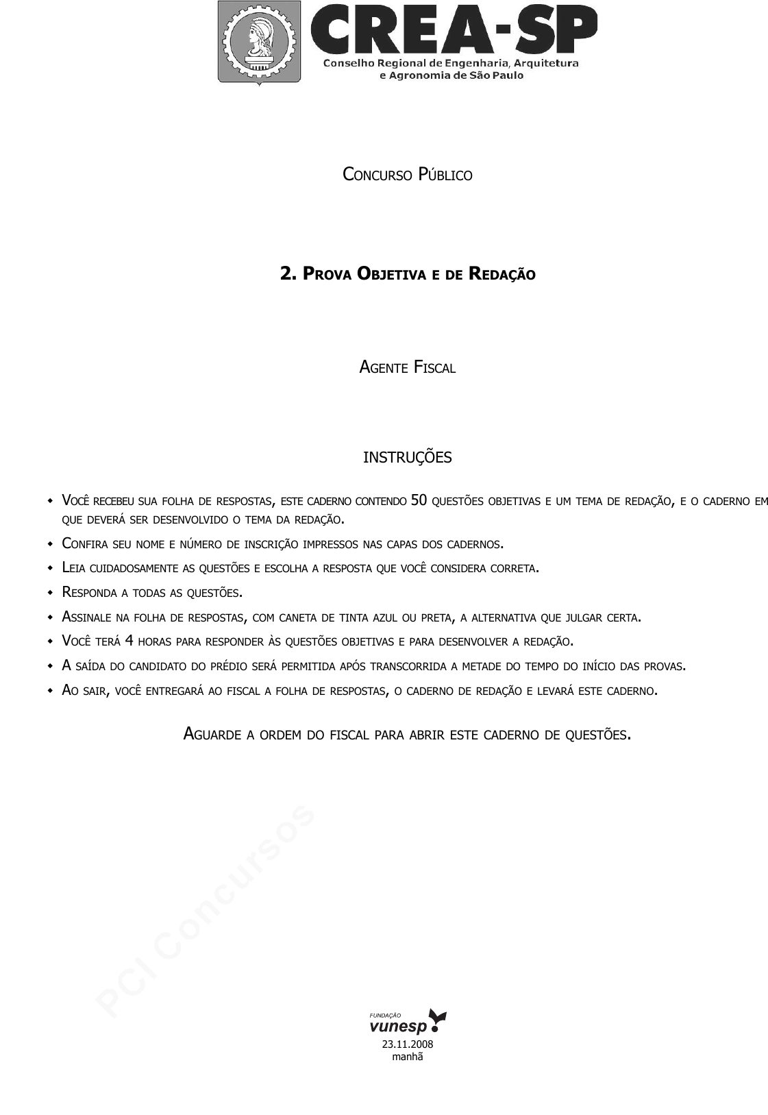 pcimarkpci MDAwMDowMDAwOjAwMDA6MDAwMDowMDAwOmZmZmY6MzZlOTpjMjU5:RnJpLCAxNyBTZXAgMjAyMSAwNTo0ODoxMyAtMDMwMA== CONCURSO PÚBLICO 2. PROVA OBJETIVA E DE REDAÇÃO AGENTE FISCAL INSTRUÇÕES VOCÊ RECEBEU SUA FOLHA DE RESPOSTAS, ESTE CADERNO CONTENDO 50 QUESTÕES OBJETIVAS E UM TEMA DE REDAÇÃO, E O CADERNO EM QUE DEVERÁ SER DESENVOLVIDO O TEMA DA REDAÇÃO. CONFIRA SEU NOME E NÚMERO DE INSCRIÇÃO IMPRESSOS NAS CAPAS DOS CADERNOS. LEIA CUIDADOSAMENTE AS QUESTÕES E ESCOLHA A RESPOSTA QUE VOCÊ CONSIDERA CORRETA. RESPONDA A TODAS AS QUESTÕES. ASSINALE NA FOLHA DE RESPOSTAS, COM CANETA DE TINTA AZUL OU PRETA, A ALTERNATIVA QUE JULGAR CERTA. VOCÊ TERÁ 4 HORAS PARA RESPONDER ÀS QUESTÕES OBJETIVAS E PARA DESENVOLVER A REDAÇÃO. A SAÍDA DO CANDIDATO DO PRÉDIO SERÁ PERMITIDA APÓS TRANSCORRIDA A METADE DO TEMPO DO INÍCIO DAS PROVAS. AO SAIR, VOCÊ ENTREGARÁ AO FISCAL A FOLHA DE RESPOSTAS, O CADERNO DE REDAÇÃO E LEVARÁ ESTE CADERNO. AGUARDE A ORDEM DO FISCAL PARA ABRIR ESTE CADERNO DE QUESTÕES. 23.11.2008 manhã pcimarkpci MDAwMDowMDAwOjAwMDA6MDAwMDowMDAwOmZmZmY6MzZlOTpjMjU5:RnJpLCAxNyBTZXAgMjAyMSAwNTo0ODoxMyAtMDMwMA== 2CREA0801/02-AgFiscal LÍNGUA PORTUGUESA Leia o texto para responder às questões de números 01 a 09. Do tamanho do Maracanã Nelson Rodrigues cunhou a pérola: “Mário Filho foi tão grande que deveria ter sido enterrado no Maracanã”. Vinda do irmão, a frase pode soar como um exagero. Mas o genial dramaturgo não estava sozinho em sua admiração. Mário Rodrigues Filho foi o inventor do jornalismo esportivo moderno no Brasil. Tudo começou por um desses acasos do destino, no início da década de 1920. “O pai dele, Mário Rodrigues, deixou o fecha- mento de A Crítica em suas mãos. Sem ter notícias para completar a primeira página, resolveu colocar uma reportagem sobre o jogo entre Flamengo e Vasco que aconteceria nas Laranjeiras”, conta o também jornalista Mário Neto, que guarda em casa diversas lembranças do avô. Mário Rodrigues, que considerava o futebol uma atividade de malandros, ficou possesso com aquela decisão do filho. Mas o caminho estava aberto: no dia seguinte, não restou um exemplar do jornal nas bancas. Em 1931, Mário Filho fundou aquele que é considerado o primeiro jornal inteiramente dedicado ao esporte em todo o pla- neta, O Mundo Sportivo. A partir daí, revolucionou o modo como a imprensa descrevia jogadores e partidas, usando um vocabulário mais popular e cunhando expressões que entrariam para a história, como “Fla-Flu”. Para Mário Neto, o grande feito do avô foi “transformar o jogador de futebol em ser humano”. Assim era sua famosa coluna no jornal O Globo, onde trabalhou com carta-branca do amigo Roberto Marinho até 1937. Naquele ano, ele comprou, em sociedade com Marinho, o Jornal dos Sports, referência na cobertura esportiva por décadas, ainda hoje na ativa. Sua dedicação ao futebol ultrapassou as fronteiras do jorna- lismo esportivo. Com o livro O Negro no Futebol Brasileiro (1947), Mário Filho produziu uma das três obras fundamentais para se entender o país. Isso na opinião de ninguém menos que Gilberto Freyre. Quando o governo decidiu construir o maior estádio do mundo, para servir de palco principal da Copa de 1950, seu nome ganhou a honra de batizá-lo: Mário Filho, vulgo Maracanã. “Meu avô era uma pessoa querida por todos”, relembra Mário Neto.” Tanto que dominava os ambientes onde chegava, fosse na redação ou em uma ocasião social”. No irmão famoso tinha um fã: “Ele era um verdadeiro ídolo para o Nelson. Os dois se encontravam todos os dias e se falavam por duas, três horas. Amigos como Armando Nogueira e João Saldanha também estavam sempre presentes.” Nem só de futebol vivia Mário. Também de carnaval. Foi dele a idéia de organizar, em 1933, o primeiro concurso de escolas de samba, na Praça Onze. No ano seguinte, o evento foi oficializado. Se merecia ser enterrado no Maracanã, seu centenário certa- mente ocuparia um jornal inteiro. Não foi o que ocorreu. Falecido em 1966 de ataque cardíaco, Mário faria cem anos em junho último. A data passou em branco na imprensa. O que Nelson Rodrigues diria sobre tamanha injustiça? Talvez isto: “Não há nada mais relapso do que a memória.” (Revista de História da Biblioteca Nacional, setembro, 2008) 01. A partir da leitura do texto, pode-se afirmar que (A) Mário Filho pode ser considerado um expoente para a crônica futebolística, tanto para o jornalismo quanto para a literatura. (B) o dramaturgo Nelson Rodrigues auxiliava o irmão na elaboração das notícias jornalísticas de O Globo. (C) o primeiro jornal dedicado ao esporte surgiu em 1920, com reportagens feitas nos campos de futebol. (D) o Maracanã foi o estádio em que Mário Filho revolucio- nou o papel da imprensa futebolística. (E) os primeiros concursos de escolas de samba eram apre- sentados no estádio Mário Filho. 02. Para o pai de Mário Filho, (A) os esportes, na década de 1920, permitiam que as pessoas pudessem extravasar seus sentimentos. (B) no futebol, os jogadores eram transformados em heróis nacionais. (C) o futebol não era bem visto, sendo considerado uma atividade para desocupados. (D) todos os jornais deveriam ter colunas esportivas. (E) a imprensa tinha papel preponderante para o resultado dos jogos esportivos. 03. Mário Filho é considerado (A) um dos iniciadores dos relatos esportivos em revistas e jornais de veiculação diária. (B) o escritor que mais publicou livros acerca do tema futebol. (C) o fundador do jornal O Globo, até hoje em circulação. (D) o organizador das primeiras escolas de samba, em todo o país. (E) o precursor do jornalismo esportivo, no Brasil. 04. “Não há nada mais relapso do que a memória”. A afirmação refere-se (A) aos eventos que culminaram com a publicação do livro O negro no futebol brasileiro. (B) aos amigos que auxiliavam o jornalista a escrever suas colunas. (C) à dedicação