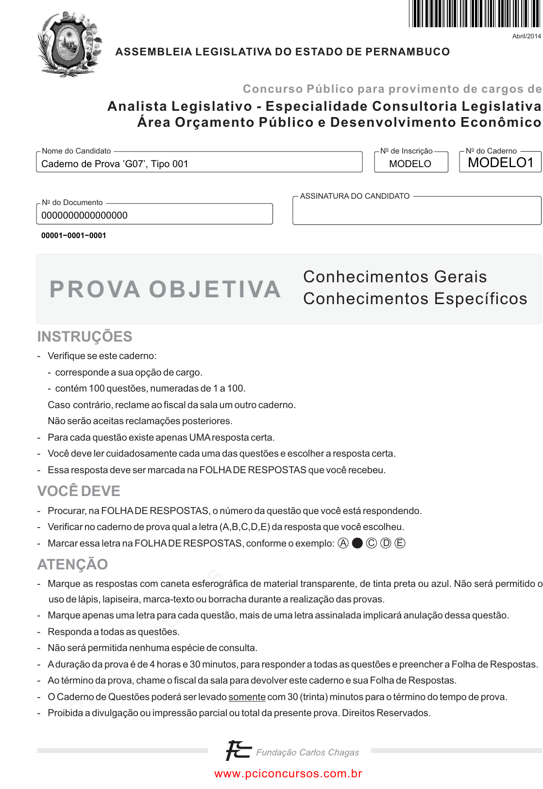 pcimarkpci MDAwMDowMDAwOjAwMDA6MDAwMDowMDAwOmZmZmY6MzZlOTpjMjU5:RnJpLCAxNyBTZXAgMjAyMSAxODowOToxNCAtMDMwMA== N do CadernooN de Inscriçãoo ASSINATURA DO CANDIDATO N do Documentoo Nome do Candidato Abril/2014 ASSEMBLEIA LEGISLATIVA DO ESTADO DE PERNAMBUCO Analista Legislativo - Especialidade Consultoria Legislativa Área Orçamento Público e Desenvolvimento Econômico Concurso Público para provimento de cargos de PROVA OBJETIVA Conhecimentos Gerais Conhecimentos Específicos INSTRUÇÕES VOCÊ DEVE ATENÇÃO - Verifique se este caderno: - corresponde a sua opção de cargo. - contém 100 questões, numeradas de 1 a 100. Caso contrário, reclame ao fiscal da sala um outro caderno. Não serão aceitas reclamações posteriores. - Para cada questão existe apenas UMAresposta certa. - Você deve ler cuidadosamente cada uma das questões e escolher a resposta certa. - Essa resposta deve ser marcada na FOLHADE RESPOSTAS que você recebeu. - Procurar, na FOLHADE RESPOSTAS, o número da questão que você está respondendo. - Verificar no caderno de prova qual a letra (A,B,C,D,E) da resposta que você escolheu. - Marcar essa letra na FOLHADE RESPOSTAS, conforme o exemplo: - - Marque apenas uma letra para cada questão, mais de uma letra assinalada implicará anulação dessa questão. - Responda a todas as questões. - Não será permitida nenhuma espécie de consulta. - Aduração da prova é de 4 horas e 30 minutos, para responder a todas as questões e preencher a Folha de Respostas. - Ao término da prova, chame o fiscal da sala para devolver este caderno e sua Folha de Respostas. - O Caderno de Questões poderá ser levado com 30 (trinta) minutos para o término do tempo de prova. - Proibida a divulgação ou impressão parcial ou total da presente prova. Direitos Reservados. Marque as respostas com caneta esferográfica de material transparente, de tinta preta ou azul. Não será permitido o uso de lápis, lapiseira, marca-texto ou borracha durante a realização das provas. somente A C D E Caderno de Prova ’G07’, Tipo 001 MODELO 0000000000000000 MODELO1 00001−0001−0001 www.pciconcursos.com.br pcimarkpci MDAwMDowMDAwOjAwMDA6MDAwMDowMDAwOmZmZmY6MzZlOTpjMjU5:RnJpLCAxNyBTZXAgMjAyMSAxODowOToxNCAtMDMwMA== 2 ALEPE-Conhecimentos Gerais1 CONHECIMENTOS GERAIS Língua Portuguesa Atenção: O texto abaixo refere-se às questões de números 1 a 5. 1 5 10 15 20 25 30 35 No século VI a.C., os primeiros filósofos gregos preocuparam-se em conhecer os elementos constitutivos das coisas. Eles investigaram a Natureza, à busca de um princípio estável, comum a todos os seres, que explicasse a sua origem e as suas transformações. Físicos, como foram chamados por Aristóteles, esses primeiros filósofos, de Tales a Anaxímenes, fundaram uma tradição de estudo da Natureza, seguida e aprofundada, entre outros, por Heráclito, Pitágoras, Demócrito. Na segunda metade do século V a.C., os Sofistas, professores da juventude ateniense numa época de crise, inspirados mais pelo interesse prático do que por uma intenção teórica pura, debateram, entre outras ideias, o Bem, a Virtude, o Belo, a Lei e a Justiça, formulando, a respeito de seu conteúdo, teses ousadas e contraditórias. Não obstante a falta de rigor e o propósito de confundir os adversários, com a habilidade de raciocínio que os notabilizou, os Sofistas tiveram o indiscutível mérito de introduzir, no estudo da sociedade e da cultura, o ponto de vista reflexivo-crítico que caracteriza a filosofia. Mas seria preciso esperar por Sócrates (470-399 a.C.), misto de pedagogo e de filósofo, que procurou definir os valores morais, as profissões, o governo e o comportamento social, para que esse ponto de vista se insinuasse também na apreciação das artes. Sócrates, que discorria sobre todos os assuntos humanos, entrou, certa vez, no ateliê do pintor Parrásio, e a este perguntou o que a Pintura poderia representar. Platão (427-347 a.C.), discípulo de Sócrates, fez, no seu diálogo A república, um confronto, que se tornou decisivo pelas implicações filosóficas que encerra, entre Arte e Realidade. Levando em conta o caráter representativo da Pintura e da Escultura, o filósofo concluía, nesse diálogo, não só que essas artes estão muito abaixo da verdadeira Beleza que a inteligência humana se destina a conhecer, como também que, em comparação com os objetivos da ciência, é supérflua a atividade daqueles que pintam e esculpem, pois o que 40 produzem é inconsistente e ilusório. Por outro lado, Platão observa que a Poesia e a Música exercem influência muito grande sobre os nossos estados de ânimo, e que afetam, positiva ou negativamente, o comportamento moral dos homens. (Adaptado de: NUNES, Benedito. Introdução à filoso- fia da arte. 4. ed., São Paulo: Ática, 1999, p. 7 e 8) 1. No texto, o autor (A) comenta o percurso da filosofia com o intuito de comprovar que o pensamento filosófico se eleva sobre todas as outras formas de conhecimento, principalmente a relacionada ao universo das artes. (B) objetiva, entre outros aspectos, demonstrar que a denominação que Aristóteles deu aos primeiros filósofos constitui equívoco que a própria história se encarregou de corrigir. (C) debate distintas perspectivas da reflexão filosófica, ao longo dos séculos, para evidenciar o papel decisivo que Platão desempenha na pesquisa da inteligência humana. (D) cita pensadores para evidenciar caminho consti- tutivo do pensamento filosófico, considerando distin- tos aspectos sobre os quais recaíram as inquieta- ções desses intelectuais nesse percurso. (E) firma, respeitando a cronologia, a relevância de cada um dos pensadores que compõem a história da Filosofia até seu apogeu, quando esta reconhece o significativo papel das artes plásticas na área filosófica. _________________________________________________________ 2. Sobre os Sofistas, tal como caracterizados no texto, é correto afirmar: (A) foram s