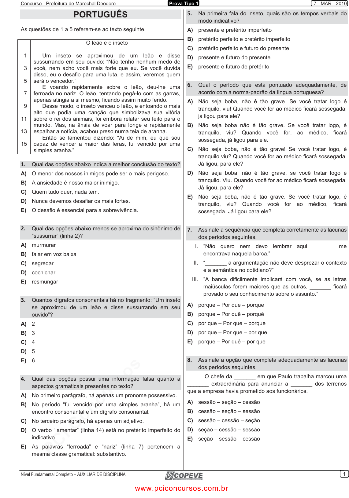 pcimarkpci MDAwMDowMDAwOjAwMDA6MDAwMDowMDAwOmZmZmY6MzZlOTpjMjU5:U2F0LCAxOCBTZXAgMjAyMSAxMDowOToxOSAtMDMwMA== Concurso - Prefeitura de Marechal Deodoro Prova Tipo 1 7 - MAR - 2010 Nível Fundamental Completo – AUXILIAR DE DISCIPLINA 1 PORTUGUÊS As questões de 1 a 5 referem-se ao texto seguinte. 1 3 5 7 9 11 13 15 O leão e o inseto Um inseto se aproximou de um leão e disse sussurrando em seu ouvido: “Não tenho nenhum medo de você, nem acho você mais forte que eu. Se você duvida disso, eu o desafio para uma luta, e assim, veremos quem será o vencedor.” E voando rapidamente sobre o leão, deu-lhe uma ferroada no nariz. O leão, tentando pegá-lo com as garras, apenas atingia a si mesmo, ficando assim muito ferido. Desse modo, o inseto venceu o leão, e entoando o mais alto que podia uma canção que simbolizava sua vitória sobre o rei dos animais, foi embora relatar seu feito para o mundo. Mas, na ânsia de voar para longe e rapidamente espalhar a notícia, acabou preso numa teia de aranha. Então se lamentou dizendo: “Ai de mim, eu que sou capaz de vencer a maior das feras, fui vencido por uma simples aranha.” 1. Qual das opções abaixo indica a melhor conclusão do texto? A) O menor dos nossos inimigos pode ser o mais perigoso. B) A ansiedade é nosso maior inimigo. C) Quem tudo quer, nada tem. D) Nunca devemos desafiar os mais fortes. E) O desafio é essencial para a sobrevivência. 2. Qual das opções abaixo menos se aproxima do sinônimo de “sussurrar” (linha 2)? A) murmurar B) falar em voz baixa C) segredar D) cochichar E) resmungar 3. Quantos dígrafos consonantais há no fragmento: “Um inseto se aproximou de um leão e disse sussurrando em seu ouvido”? A) 2 B) 3 C) 4 D) 5 E) 6 4. Qual das opções possui uma informação falsa quanto a aspectos gramaticais presentes no texto? A) No primeiro parágrafo, há apenas um pronome possessivo. B) No período “fui vencido por uma simples aranha”, há um encontro consonantal e um dígrafo consonantal. C) No terceiro parágrafo, há apenas um adjetivo. D) O verbo “lamentar” (linha 14) está no pretérito imperfeito do indicativo. E) As palavras “ferroada” e “nariz” (linha 7) pertencem a mesma classe gramatical: substantivo. 5. Na primeira fala do inseto, quais são os tempos verbais do modo indicativo? A) presente e pretérito imperfeito B) pretérito perfeito e pretérito imperfeito C) pretérito perfeito e futuro do presente D) presente e futuro do presente E) presente e futuro de pretérito 6. Qual o período que está pontuado adequadamente, de acordo com a norma-padrão da língua portuguesa? A) Não seja boba, não é tão grave. Se você tratar logo é tranquilo, viu! Quando você for ao médico ficará sossegada, já ligou para ele? B) Não seja boba não é tão grave. Se você tratar logo, é tranquilo, viu? Quando você for, ao médico, ficará sossegada, já ligou para ele. C) Não seja boba, não é tão grave! Se você tratar logo, é tranquilo viu? Quando você for ao médico ficará sossegada. Já ligou, para ele? D) Não seja boba, não é tão grave, se você tratar logo é tranquilo. Viu. Quando você for ao médico ficará sossegada. Já ligou, para ele? E) Não seja boba, não é tão grave. Se você tratar logo, é tranquilo, viu? Quando você for ao médico, ficará sossegada. Já ligou para ele? 7. Assinale a sequência que completa corretamente as lacunas dos períodos seguintes. I. “Não quero nem devo lembrar aqui _______ me encontrava naquela barca.” II. “_______ a argumentação não deve desprezar o contexto e a semântica no cotidiano?” III. “A banca dificilmente implicará com você, se as letras maiúsculas forem maiores que as outras, _______ ficará provado o seu conhecimento sobre o assunto.” A) porque – Por que – porque B) porque – Por quê – porquê C) por que – Por que – porque D) por que – Por que – por que E) porque – Por quê – por que 8. Assinale a opção que completa adequadamente as lacunas dos períodos seguintes. O chefe da _______ em que Paulo trabalha marcou uma _______ extraordinária para anunciar a _______ dos terrenos que a empresa havia prometido aos funcionários. A) sessão – seção – cessão B) cessão – seção – sessão C) sessão – cessão – seção D) seção – cessão – sessão E) seção – sessão – cessão www.pciconcursos.com.br pcimarkpci MDAwMDowMDAwOjAwMDA6MDAwMDowMDAwOmZmZmY6MzZlOTpjMjU5:U2F0LCAxOCBTZXAgMjAyMSAxMDowOToxOSAtMDMwMA== Concurso - Prefeitura de Marechal Deodoro Prova Tipo 1 7 - MAR - 2010 Nível Fundamental Completo – AUXILIAR DE DISCIPLINA 2 As questões 9 e 10 referem-se ao texto seguinte. 1 3 5 “Não deixe de acreditar no amor, mas certifique-se de estar entregando seu coração para alguém que dê valor aos mesmos sentimentos que você dá; manifeste suas ideias e planos, para saber se vocês combinam, e certifique-se de que quando estão juntos aquele abraço vale mais que qualquer palavra...” 9. Os pronomes “seu” (linha 2), “alguém” (linha 2) e “aquele” (linha 5) são, respectivamente, A) pessoal, indefinido e demonstrativo. B) possessivo, indefinido e demonstrativo. C) possessivo, relativo e demonstrativo. D) demonstrativo, indefinido e possessivo. E) pessoal, relativo e possessivo. 10. Qual a opção em que os dois substantivos são concretos? A) amor – sentimentos (linhas 1 e 3) B) coração – ideias (linhas 2 e 3) C) valor – ideias (linhas 2 e 3) D) abraço – palavra (linhas 5 e 6) E) coração – planos (linhas 2 e 4) As questões de 11 a 14 referem-se ao texto seguinte. Mudar ou não Ao contrário do que já foi, hoje são valorizadas as pessoas que mudam. Raul Seixas foi profético quando disse que preferia ser uma metamorfose ambulante a ter aquela velha opinião formada sobre tudo. É claro que não se cobra de ninguém que seja tão maluco-beleza, mas a estagnação paga pedágio dobrado. Somos estimulados, sim, a ser meta