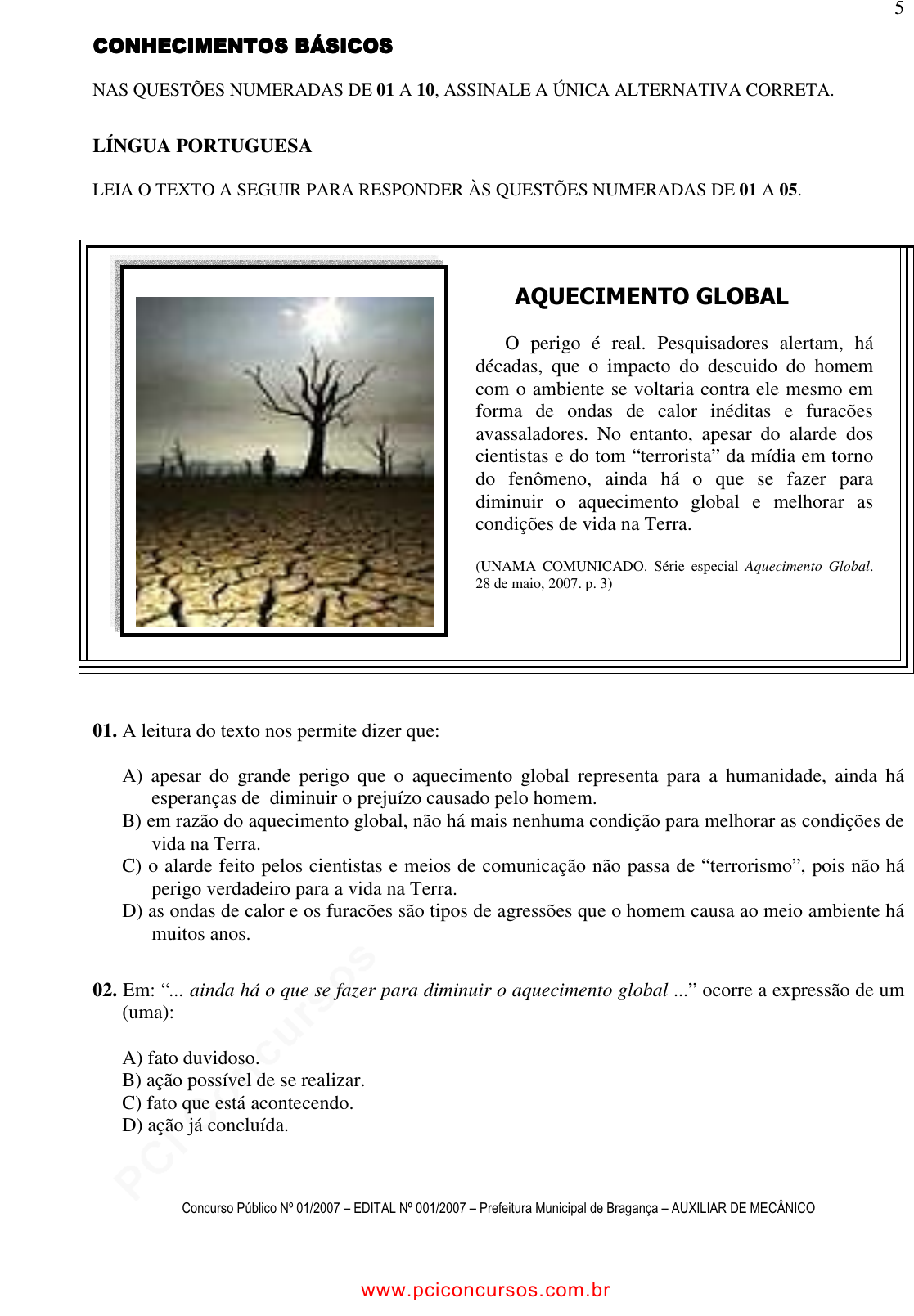 pcimarkpci MDAwMDowMDAwOjAwMDA6MDAwMDowMDAwOmZmZmY6MzZlOTpjMjU5:U2F0LCAxOCBTZXAgMjAyMSAxMTo1MDowMCAtMDMwMA== Concurso Público Nº 01/2007 – EDITAL Nº 001/2007 – Prefeitura Municipal de Bragança – AUXILIAR DE MECÂNICO 5 CONHECIMENTOS BÁSICOSCONHECIMENTOS BÁSICOSCONHECIMENTOS BÁSICOSCONHECIMENTOS BÁSICOS NAS QUESTÕES NUMERADAS DE 01 A 10, ASSINALE A ÚNICA ALTERNATIVA CORRETA. LÍNGUA PORTUGUESA LEIA O TEXTO A SEGUIR PARA RESPONDER ÀS QUESTÕES NUMERADAS DE 01 A 05. AQUECIMENTO GLOBAL O perigo é real. Pesquisadores alertam, há décadas, que o impacto do descuido do homem com o ambiente se voltaria contra ele mesmo em forma de ondas de calor inéditas e furacões avassaladores. No entanto, apesar do alarde dos cientistas e do tom “terrorista” da mídia em torno do fenômeno, ainda há o que se fazer para diminuir o aquecimento global e melhorar as condições de vida na Terra. (UNAMA COMUNICADO. Série especial Aquecimento Global. 28 de maio, 2007. p. 3) 01. A leitura do texto nos permite dizer que: A) apesar do grande perigo que o aquecimento global representa para a humanidade, ainda há esperanças de diminuir o prejuízo causado pelo homem. B) em razão do aquecimento global, não há mais nenhuma condição para melhorar as condições de vida na Terra. C) o alarde feito pelos cientistas e meios de comunicação não passa de “terrorismo”, pois não há perigo verdadeiro para a vida na Terra. D) as ondas de calor e os furacões são tipos de agressões que o homem causa ao meio ambiente há muitos anos. 02. Em: “... ainda há o que se fazer para diminuir o aquecimento global ...” ocorre a expressão de um (uma): A) fato duvidoso. B) ação possível de se realizar. C) fato que está acontecendo. D) ação já concluída. www.pciconcursos.com.br pcimarkpci MDAwMDowMDAwOjAwMDA6MDAwMDowMDAwOmZmZmY6MzZlOTpjMjU5:U2F0LCAxOCBTZXAgMjAyMSAxMTo1MDowMCAtMDMwMA== Concurso Público Nº 01/2007 – EDITAL Nº 001/2007 – Prefeitura Municipal de Bragança – AUXILIAR DE MECÂNICO 6 03. A respeito das palavras em destaque e que fazem parte do texto, assinale a alternativa correta: A) A palavra homem é trissílabo. B) A palavra ambiente é sinônimo de “Terra”. C) As palavras inéditas e fenômeno” são acentuadas pelo mesmo motivo. D) A separação silábica de avassaladores é: a – va – ssa – la – do – res. 04. A respeito de “... o impacto do descuido do homem com o ambiente se voltaria contra ele mesmo em forma de ondas de calor inéditas e furacões avassaladores.”, está correto o que se afirma na alternativa: A) O pronome “ele” se refere a “ambiente”. B) O verbo “voltaria” está no singular para concordar com o substantivo “homem”. C) A palavra “inéditas” deveria estar no masculino singular, já que se refere a “calor” . D) A palavra “mesmo” está no masculino singular porque concorda com o pronome “ele”. 05. Em: “O perigo é real.”, o termo em negrito é: A) oração. B) sujeito da oração. C) predicado. D) sujeito de “real”. www.pciconcursos.com.br pcimarkpci MDAwMDowMDAwOjAwMDA6MDAwMDowMDAwOmZmZmY6MzZlOTpjMjU5:U2F0LCAxOCBTZXAgMjAyMSAxMTo1MDowMCAtMDMwMA== Concurso Público Nº 01/2007 – EDITAL Nº 001/2007 – Prefeitura Municipal de Bragança – AUXILIAR DE MECÂNICO 7 MATEMÁTICA 06. Os moradores de uma alameda (vila de casas), com o objetivo de amenizar o calor, resolveram plantar árvores em toda extensão da rua, dos dois lados. Sabe-se que a rua tem 112 metros de extensão e que os moradores dispõem de 16 mudas de árvores para serem plantadas nos dois lados da alameda, uma bem no início e outra bem no fim da alameda, em igual distância. Desta forma, a distância entre uma árvore e outra deverá ser de: A) 14 m B) 15 m C) 16 m D) 18 m 07. O contrato de trabalho de um funcionário foi assinado em 1º. de maio de 2006, percebendo o mesmo, um salário fixo. Em 20 de dezembro de 2006, o funcionário recebeu o salário relativo ao mês de dezembro, acrescido do 13º. Salário proporcional ao número de meses trabalhados no ano, no caso, 8 meses. Se, neste mês, o funcionário recebeu ao todo R$ 1.350,00, podemos afirmar que o seu salário fixo mensal é de: A) R$ 900,00 B) R$ 810,00 C) R$ 750,00 D) R$ 720,00 08. Uma dona de casa saiu às compras com certa quantia em dinheiro. Na feira, ela gastou 20% dessa quantia; do que restou, gastou 25% no açougue, ficando ainda com R$ 48,00. Essa dona de casa saiu às compras com a quantia de: A) R$ 120,00 B) R$ 90,00 C) R$ 80,00 D) R$ 72,00 09. A premiação de uma corrida rústica foi feita da seguinte maneira: ao primeiro colocado caberia como prêmio o dobro do prêmio recebido pelo segundo colocado e, a este, caberia de prêmio o triplo do valor recebido pelo terceiro colocado acrescido de R$ 100,00. Sabe-se que o prêmio total distribuído pela comissão organizadora foi de R$ 10.000,00. Nestas condições, ao segundo colocado coube a importância de: A) R$ 4.210,00 B) R$ 4.126,00 C) R$ 3.650,00 D) R$ 3.010,00 10. Uma vendedora de lanches vendeu todos os seus 60 pastéis e os 40 copos suco do dia arrecadando um total R$ 76,00. Sabe-se que a oferta da vendedora dizia: 1 salgado + 1 suco por R$ 1,50. Quem comprou 2 pastéis e 2 sucos, pagou ao todo: A) R$ 3,00 B) R$ 3,40 C) R$ 3,60 D) R$ 3,80 www.pciconcursos.com.br pcimarkpci MDAwMDowMDAwOjAwMDA6MDAwMDowMDAwOmZmZmY6MzZlOTpjMjU5:U2F0LCAxOCBTZXAgMjAyMSAxMTo1MDowMCAtMDMwMA== Concurso Público Nº 01/2007 – EDITAL Nº 001/2007 – Prefeitura Municipal de Bragança – AUXILIAR DE MECÂNICO 8 CONHECIMENTOS CONHECIMENTOS CONHECIMENTOS CONHECIMENTOS ESPECÍFIESPECÍFIESPECÍFIESPECÍFICOSCOSCOSCOS NAS QUESTÕES NUMERADAS DE 11 A 20, ASSINALE A ÚNICA ALTERNATIVA CORRETA. 11. O Horímetro é um instrumento usado no painel que serve para medir a (s): A) carga de trabalho do motorista. B) corrente que passa pelo circuito elétrico do painel. C) horas trabalhadas do operador. D) horas trabalhadas da máquina