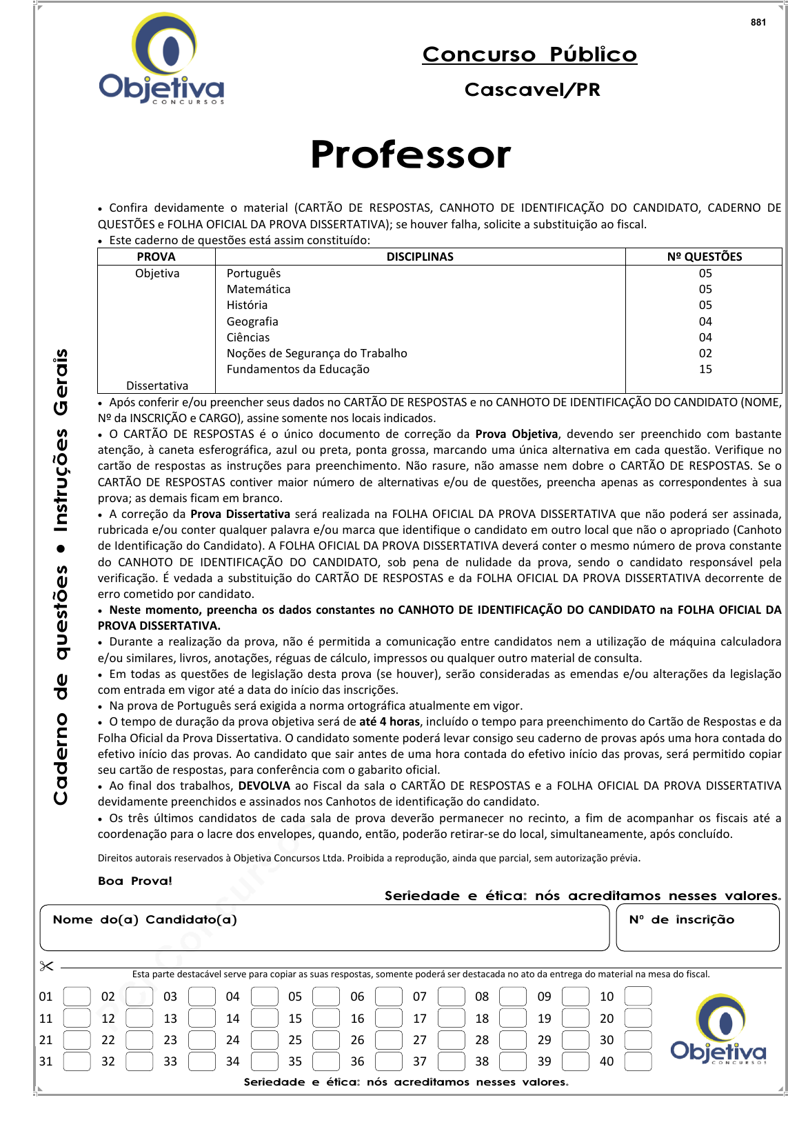 pcimarkpci MDAwMDowMDAwOjAwMDA6MDAwMDowMDAwOmZmZmY6MzZlOTpjMjU5:U3VuLCAxMiBTZXAgMjAyMSAwODoyMDoxNiAtMDMwMA== C a d e rn o d e q u e st õ e s • In st ru çõ e s G e ra is 881 Concurso Público Cascavel/PR Professor • Confira devidamente o material (CARTÃO DE RESPOSTAS, CANHOTO DE IDENTIFICAÇÃO DO CANDIDATO, CADERNO DE QUESTÕES e FOLHA OFICIAL DA PROVA DISSERTATIVA); se houver falha, solicite a substituição ao fiscal. • Este caderno de questões está assim constituído: PROVA DISCIPLINAS Nº QUESTÕES Objetiva Português Matemática História Geografia Ciências Noções de Segurança do Trabalho Fundamentos da Educação 05 05 05 04 04 02 15 Dissertativa • Após conferir e/ou preencher seus dados no CARTÃO DE RESPOSTAS e no CANHOTO DE IDENTIFICAÇÃO DO CANDIDATO (NOME, Nº da INSCRIÇÃO e CARGO), assine somente nos locais indicados. • O CARTÃO DE RESPOSTAS é o único documento de correção da Prova Objetiva, devendo ser preenchido com bastante atenção, à caneta esferográfica, azul ou preta, ponta grossa, marcando uma única alternativa em cada questão. Verifique no cartão de respostas as instruções para preenchimento. Não rasure, não amasse nem dobre o CARTÃO DE RESPOSTAS. Se o CARTÃO DE RESPOSTAS contiver maior número de alternativas e/ou de questões, preencha apenas as correspondentes à sua prova; as demais ficam em branco. • A correção da Prova Dissertativa será realizada na FOLHA OFICIAL DA PROVA DISSERTATIVA que não poderá ser assinada, rubricada e/ou conter qualquer palavra e/ou marca que identifique o candidato em outro local que não o apropriado (Canhoto de Identificação do Candidato). A FOLHA OFICIAL DA PROVA DISSERTATIVA deverá conter o mesmo número de prova constante do CANHOTO DE IDENTIFICAÇÃO DO CANDIDATO, sob pena de nulidade da prova, sendo o candidato responsável pela verificação. É vedada a substituição do CARTÃO DE RESPOSTAS e da FOLHA OFICIAL DA PROVA DISSERTATIVA decorrente de erro cometido por candidato. • Neste momento, preencha os dados constantes no CANHOTO DE IDENTIFICAÇÃO DO CANDIDATO na FOLHA OFICIAL DA PROVA DISSERTATIVA. • Durante a realização da prova, não é permitida a comunicação entre candidatos nem a utilização de máquina calculadora e/ou similares, livros, anotações, réguas de cálculo, impressos ou qualquer outro material de consulta. • Em todas as questões de legislação desta prova (se houver), serão consideradas as emendas e/ou alterações da legislação com entrada em vigor até a data do início das inscrições. • Na prova de Português será exigida a norma ortográfica atualmente em vigor. • O tempo de duração da prova objetiva será de até 4 horas, incluído o tempo para preenchimento do Cartão de Respostas e da Folha Oficial da Prova Dissertativa. O candidato somente poderá levar consigo seu caderno de provas após uma hora contada do efetivo início das provas. Ao candidato que sair antes de uma hora contada do efetivo início das provas, será permitido copiar seu cartão de respostas, para conferência com o gabarito oficial. • Ao final dos trabalhos, DEVOLVA ao Fiscal da sala o CARTÃO DE RESPOSTAS e a FOLHA OFICIAL DA PROVA DISSERTATIVA devidamente preenchidos e assinados nos Canhotos de identificação do candidato. • Os três últimos candidatos de cada sala de prova deverão permanecer no recinto, a fim de acompanhar os fiscais até a coordenação para o lacre dos envelopes, quando, então, poderão retirar-se do local, simultaneamente, após concluído. Direitos autorais reservados à Objetiva Concursos Ltda. Proibida a reprodução, ainda que parcial, sem autorização prévia. Boa Prova! Seriedade e ética: nós acreditamos nesses valores. Esta parte destacável serve para copiar as suas respostas, somente poderá ser destacada no ato da entrega do material na mesa do fiscal. 01 02 03 04 05 06 07 08 09 10 11 12 13 14 15 16 17 18 19 20 21 22 23 24 25 26 27 28 29 30 31 32 33 34 35 36 37 38 39 40 Seriedade e ética: nós acreditamos nesses valores. Nome do(a) Candidato(a) Nº de inscrição pcimarkpci MDAwMDowMDAwOjAwMDA6MDAwMDowMDAwOmZmZmY6MzZlOTpjMjU5:U3VuLCAxMiBTZXAgMjAyMSAwODoyMDoxNiAtMDMwMA== 1 www.objetivas.com.br PORTUGUÊS Erupções de água: como os gêiseres se formam? Um gêiser é uma fonte termal que ________ água periodicamente, lançando uma coluna de água quente e vapor para o ar. Ele costuma aparecer em regiões próximas aos locais onde existem vulcões ativos ou onde há muito calor subterrâneo. O nome gêiser é derivado de Geysir, o nome de uma fonte localizada na Islândia. Em islandês, geysir significa jorrar. O gêiser surge quando a água da superfície (chuva ou neve derretida) penetra no subsolo e entra em contato com rochas vulcânicas muito quentes. Aí, a água vai aquecendo aos poucos. Quando atinge 100 graus Celsius, a pressão aumenta e parte da água é transformada rapidamente em vapor. No estado gasoso, a água ocupa um volume até 1.500 vezes maior – por isso, tende a escapar para fora dos reservatórios. Depois, a pressão alivia e o sistema subterrâneo volta a encher de água, que vaporiza e ganha força para uma nova erupção! As erupções da maioria dos gêiseres ocorrem com espaçamentos irregulares. As pausas podem durar minutos e até anos. O período de duração da erupção também é diferente: pode variar de segundos a horas. A altura da coluna ________ entre um metro e 100 metros, e a quantidade de água que é jorrada varia de poucos litros até dezenas de milhares de litros. Tudo isso depende da temperatura, da quantidade e da velocidade das correntes de água subterrânea e do tamanho do gêiser. O surgimento do gêiser depende de vários fatores naturais, como quantidade, temperatura, distribuição e movimento das águas infiltradas e das rochas que abrigam a água. Assim, o regime periódico de um gêiser só se mantém se as erupções não destruírem as condições para