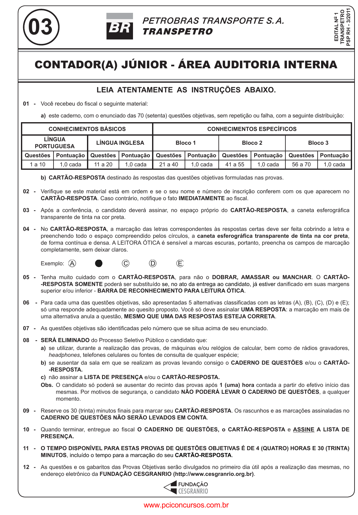 pcimarkpci MDAwMDowMDAwOjAwMDA6MDAwMDowMDAwOmZmZmY6MzZlOTpjMjU5:VGh1LCAxNiBTZXAgMjAyMSAxNTozMTozMSAtMDMwMA== CONTADOR(A) JÚNIOR - ÁREA AUDITORIA INTERNA1 LEIA ATENTAMENTE AS INSTRUÇÕES ABAIXO. 01 - Você recebeu do fiscal o seguinte material: a) este caderno, com o enunciado das 70 (setenta) questões objetivas, sem repetição ou falha, com a seguinte distribuição: b) CARTÃO-RESPOSTA destinado às respostas das questões objetivas formuladas nas provas. 02 - Verifique se este material está em ordem e se o seu nome e número de inscrição conferem com os que aparecem no CARTÃO-RESPOSTA. Caso contrário, notifique o fato IMEDIATAMENTE ao fiscal. 03 - Após a conferência, o candidato deverá assinar, no espaço próprio do CARTÃO-RESPOSTA, a caneta esferográfica transparente de tinta na cor preta. 04 - No CARTÃO-RESPOSTA, a marcação das letras correspondentes às respostas certas deve ser feita cobrindo a letra e preenchendo todo o espaço compreendido pelos círculos, a caneta esferográfica transparente de tinta na cor preta, de forma contínua e densa. A LEITORA ÓTICA é sensível a marcas escuras, portanto, preencha os campos de marcação completamente, sem deixar claros. Exemplo: 05 - Tenha muito cuidado com o CARTÃO-RESPOSTA, para não o DOBRAR, AMASSAR ou MANCHAR. O CARTÃO- -RESPOSTA SOMENTE poderá ser substituído se, no ato da entrega ao candidato, já estiver danificado em suas margens superior e/ou inferior - BARRA DE RECONHECIMENTO PARA LEITURA ÓTICA. 06 - Para cada uma das questões objetivas, são apresentadas 5 alternativas classificadas com as letras (A), (B), (C), (D) e (E); só uma responde adequadamente ao quesito proposto. Você só deve assinalar UMA RESPOSTA: a marcação em mais de uma alternativa anula a questão, MESMO QUE UMA DAS RESPOSTAS ESTEJA CORRETA. 07 - As questões objetivas são identificadas pelo número que se situa acima de seu enunciado. 08 - SERÁ ELIMINADO do Processo Seletivo Público o candidato que: a) se utilizar, durante a realização das provas, de máquinas e/ou relógios de calcular, bem como de rádios gravadores, headphones, telefones celulares ou fontes de consulta de qualquer espécie; b) se ausentar da sala em que se realizam as provas levando consigo o CADERNO DE QUESTÕES e/ou o CARTÃO- -RESPOSTA. c) não assinar a LISTA DE PRESENÇA e/ou o CARTÃO-RESPOSTA. Obs. O candidato só poderá se ausentar do recinto das provas após 1 (uma) hora contada a partir do efetivo início das mesmas. Por motivos de segurança, o candidato NÃO PODERÁ LEVAR O CADERNO DE QUESTÕES, a qualquer momento. 09 - Reserve os 30 (trinta) minutos finais para marcar seu CARTÃO-RESPOSTA. Os rascunhos e as marcações assinaladas no CADERNO DE QUESTÕES NÃO SERÃO LEVADOS EM CONTA. 10 - Quando terminar, entregue ao fiscal O CADERNO DE QUESTÕES, o CARTÃO-RESPOSTA e ASSINE A LISTA DE PRESENÇA. 11 - O TEMPO DISPONÍVEL PARA ESTAS PROVAS DE QUESTÕES OBJETIVAS É DE 4 (QUATRO) HORAS E 30 (TRINTA) MINUTOS, incluído o tempo para a marcação do seu CARTÃO-RESPOSTA. 12 - As questões e os gabaritos das Provas Objetivas serão divulgados no primeiro dia útil após a realização das mesmas, no endereço eletrônico da FUNDAÇÃO CESGRANRIO (http://www.cesgranrio.org.br). CONTADOR(A) JÚNIOR - ÁREA AUDITORIA INTERNA 03 ED IT A L N o 1 TR A N SP ET R O PS P R H - 3/ 20 11 CONHECIMENTOS BÁSICOS CONHECIMENTOS ESPECÍFICOS LÍNGUA PORTUGUESA LÍNGUA INGLESA Bloco 1 Bloco 2 Bloco 3 Questões Pontuação Questões Pontuação Questões Pontuação Questões Pontuação Questões Pontuação 1 a 10 1,0 cada 11 a 20 1,0 cada 21 a 40 1,0 cada 41 a 55 1,0 cada 56 a 70 1,0 cada www.pciconcursos.com.br pcimarkpci MDAwMDowMDAwOjAwMDA6MDAwMDowMDAwOmZmZmY6MzZlOTpjMjU5:VGh1LCAxNiBTZXAgMjAyMSAxNTozMTozMSAtMDMwMA== CONTADOR(A) JÚNIOR - ÁREA AUDITORIA INTERNA 2 LÍNGUA PORTUGUESA Um pouco de silêncio Nesta trepidante cultura nossa, da agitação e do barulho, gostar de sossego é uma excentricidade. Sob a pressão do ter de parecer, ter de participar, ter de adquirir, ter de qualquer coisa, assumimos uma infinidade de obrigações. Muitas desnecessárias, ou- tras impossíveis, algumas que não combinam conos- co nem nos interessam. Não há perdão nem anistia para os que ficam de fora da ciranda: os que não se submetem mas ques- tionam, os que pagam o preço de sua relativa auto- nomia, os que não se deixam escravizar, pelo menos sem alguma resistência. O normal é ser atualizado, produtivo e bem-in- formado. É indispensável circular, estar enturmado. Quem não corre com a manada praticamente nem existe, se não se cuidar botam numa jaula: um animal estranho. Acuados pelo relógio, pelos compromissos, pela opinião alheia, disparamos sem rumo – ou em trilhas determinadas – feito hamsters que se alimentam de sua própria agitação. Ficar sossegado é perigoso: pode parecer doença. Recolher-se em casa, ou dentro de si mesmo, ame- aça quem leva um susto cada vez que examina sua alma. Estar sozinho é considerado humilhante, sinal de que não se arrumou ninguém – como se amizade ou amor se “arrumasse” em loja. [...] Além do desgosto pela solidão, temos horror à quietude. Logo pensamos em depressão: quem sabe terapia e antidepressivo? Criança que não brinca ou salta nem participa de atividades frenéticas está com algum problema. O silêncio nos assusta por retumbar no vazio dentro de nós. Quando nada se move nem faz baru- lho, notamos as frestas pelas quais nos espiam coi- sas incômodas e mal resolvidas, ou se enxerga outro ângulo de nós mesmos. Nos damos conta de que não somos apenas figurinhas atarantadas correndo entre casa, trabalho e bar, praia ou campo. Existe em nós, geralmente nem percebido e nada valorizado, algo além desse que paga contas, transa, ganha dinheiro, e come, envelhece, e um dia (mas isso é só para os outros!) vai morrer. Quem é esse que afinal sou eu? Quais seus desejos e medos, seus projetos e son