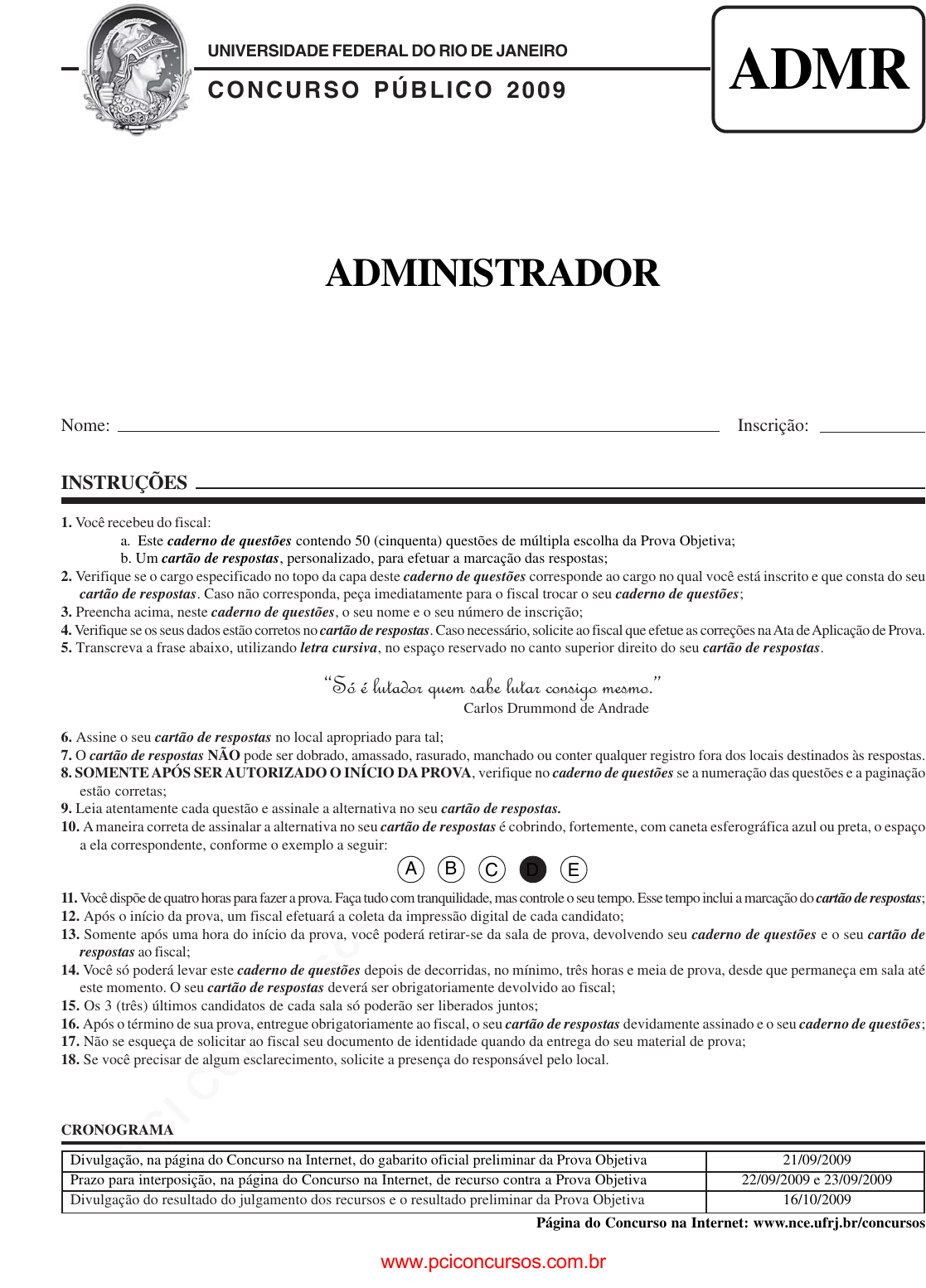 pcimarkpci MDAwMDowMDAwOjAwMDA6MDAwMDowMDAwOmZmZmY6MzZlOTpjMjU5:VGh1LCAxNiBTZXAgMjAyMSAyMDoyMjowMSAtMDMwMA== ADMINISTRADOR UNIVERSIDADE FEDERAL DO RIO DE JANEIRO CONCURSO PÚBLICO 2009 ADMR INSTRUÇÕES 1. Você recebeu do fiscal: a. Este caderno de questões contendo 50 (cinquenta) questões de múltipla escolha da Prova Objetiva; b. Um cartão de respostas, personalizado, para efetuar a marcação das respostas; 2. Verifique se o cargo especificado no topo da capa deste caderno de questões corresponde ao cargo no qual você está inscrito e que consta do seu cartão de respostas. Caso não corresponda, peça imediatamente para o fiscal trocar o seu caderno de questões; 3. Preencha acima, neste caderno de questões, o seu nome e o seu número de inscrição; 4. Verifique se os seus dados estão corretos no cartão de respostas. Caso necessário, solicite ao fiscal que efetue as correções na Ata de Aplicação de Prova. 5. Transcreva a frase abaixo, utilizando letra cursiva, no espaço reservado no canto superior direito do seu cartão de respostas. “Só é lutador quem sabe lutar consigo mesmo.” Carlos Drummond de Andrade 6. Assine o seu cartão de respostas no local apropriado para tal; 7. O cartão de respostas NÃO pode ser dobrado, amassado, rasurado, manchado ou conter qualquer registro fora dos locais destinados às respostas. 8. SOMENTE APÓS SER AUTORIZADO O INÍCIO DA PROVA, verifique no caderno de questões se a numeração das questões e a paginação estão corretas; 9. Leia atentamente cada questão e assinale a alternativa no seu cartão de respostas. 10. A maneira correta de assinalar a alternativa no seu cartão de respostas é cobrindo, fortemente, com caneta esferográfica azul ou preta, o espaço a ela correspondente, conforme o exemplo a seguir: 11. Você dispõe de quatro horas para fazer a prova. Faça tudo com tranquilidade, mas controle o seu tempo. Esse tempo inclui a marcação do cartão de respostas; 12. Após o início da prova, um fiscal efetuará a coleta da impressão digital de cada candidato; 13. Somente após uma hora do início da prova, você poderá retirar-se da sala de prova, devolvendo seu caderno de questões e o seu cartão de respostas ao fiscal; 14. Você só poderá levar este caderno de questões depois de decorridas, no mínimo, três horas e meia de prova, desde que permaneça em sala até este momento. O seu cartão de respostas deverá ser obrigatoriamente devolvido ao fiscal; 15. Os 3 (três) últimos candidatos de cada sala só poderão ser liberados juntos; 16. Após o término de sua prova, entregue obrigatoriamente ao fiscal, o seu cartão de respostas devidamente assinado e o seu caderno de questões; 17. Não se esqueça de solicitar ao fiscal seu documento de identidade quando da entrega do seu material de prova; 18. Se você precisar de algum esclarecimento, solicite a presença do responsável pelo local. A B C D E CRONOGRAMA Divulgação, na página do Concurso na Internet, do gabarito oficial preliminar da Prova Objetiva 21/09/2009 Prazo para interposição, na página do Concurso na Internet, de recurso contra a Prova Objetiva 22/09/2009 e 23/09/2009 Divulgação do resultado do julgamento dos recursos e o resultado preliminar da Prova Objetiva 16/10/2009 Página do Concurso na Internet: www.nce.ufrj.br/concursos Nome: Inscrição: www.pciconcursos.com.br pcimarkpci MDAwMDowMDAwOjAwMDA6MDAwMDowMDAwOmZmZmY6MzZlOTpjMjU5:VGh1LCAxNiBTZXAgMjAyMSAyMDoyMjowMSAtMDMwMA== Universidade Federal do Rio de Janeiro Concurso Público 2009 2 www.pciconcursos.com.br pcimarkpci MDAwMDowMDAwOjAwMDA6MDAwMDowMDAwOmZmZmY6MzZlOTpjMjU5:VGh1LCAxNiBTZXAgMjAyMSAyMDoyMjowMSAtMDMwMA== Universidade Federal do Rio de Janeiro Concurso Público 2009 3 LÍNGUA PORTUGUESA Leia o texto abaixo e responda as questões 1 a 3. A OUTRA EPIDEMIA Lya Luft - Veja, 15-07-2009 Para mim, escrever é sempre questionar, não importa se estou escrevendo um romance, um poema, um artigo. Como ficcionista, meu espaço de trabalho é o drama humano: palco, cenário, bastidores e os mais variados personagens com os quais invento histórias de magia ou desespero. Como colunista, observo e comento a realidade. O quadro não anda muito animador, embora na crise mundial o Brasil pareça estar se saindo melhor que a maioria dos países. De tirar o chapéu, se isso se concretizar e perdurar. Do ponto de vista da moralidade, por outro lado, até em instituições públicas que julgávamos venerandas, a cada dia há um novo espanto. Não por obra de todos os que lá foram colocados (por nós), mas o que ficamos sabendo é difícil de acreditar. Teríamos de andar feito o velho filósofo grego Diógenes, que percorria as ruas em dia claro com uma lanterna na mão. Questionado, respondia procurar um homem honrado. Vamos ter de sair aos bandos, aos magotes, catando essa figura, não uma, mas multidões delas, para consertar isso, que parece não ter arrumação? 1 - Assinale a alternativa em que a segunda forma do segmento altera o sentido do segmento inicial. (A) “Para mim, escrever é sempre questionar” = Escrever, para mim, é sempre questionar; (B) “para consertar isso” = para isso ser consertado; (C) “o drama humano” = o drama do homem; (D) “os que lá foram colocados” = os que foram colocados lá; (E) “não uma, mas multidões” = não multidões, mas uma. 2 - “De tirar o chapéu, se isso se concretizar e perdurar. Do ponto de vista da moralidade, por outro lado, até em instituições públicas que julgávamos venerandas, a cada dia há um novo espanto. Não por obra de todos os que lá foram colocados (por nós), mas o que ficamos sabendo é difícil de acreditar”. A alternativa que informa o valor semântico correto do elemento destacado é: (A) SE = condição; (B) POR OUTRO LADO = lugar; (C) ATÉ = direção; (D) POR = causa; (E) MAS = concessão. 3 - “Para mim, escrever é sempre questionar”; a forma plural correta dessa frase é: (A) Para n