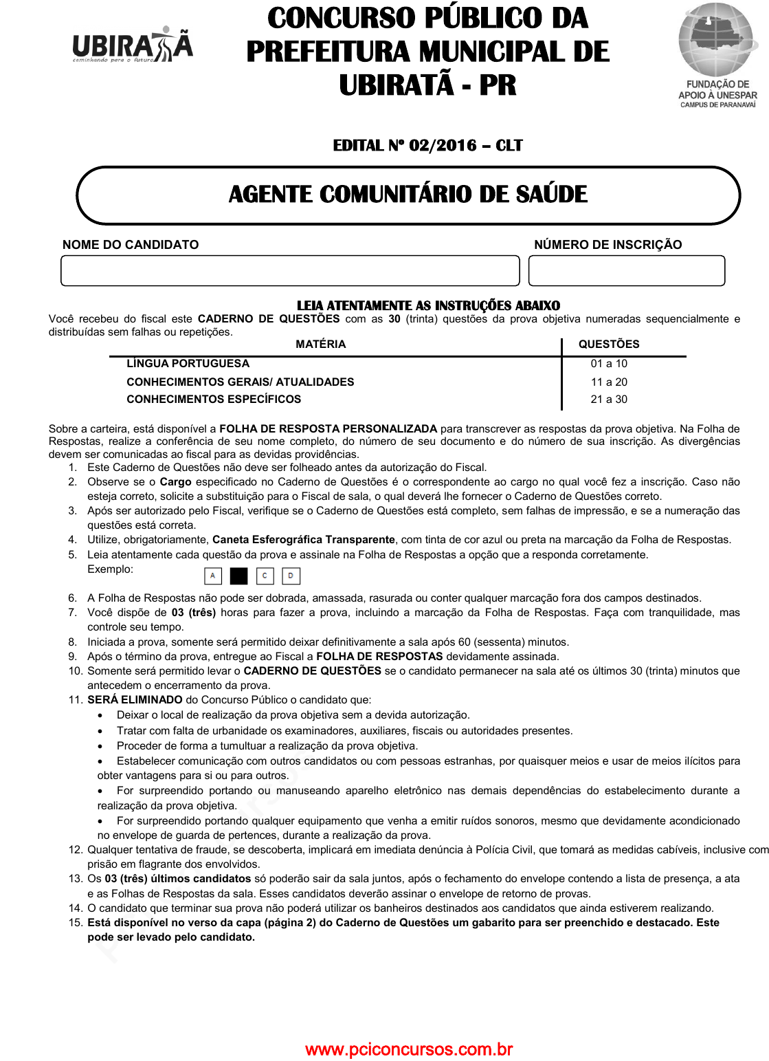 pcimarkpci MDAwMDowMDAwOjAwMDA6MDAwMDowMDAwOmZmZmY6MzZlOTpjMjU5:RnJpLCAxNyBTZXAgMjAyMSAwMDoyMToyMSAtMDMwMA== CONCURSO PÚBLICO DA PREFEITURA MUNICIPAL DE UBIRATÃ - PR EDITAL Nº 02/2016 – CLT NOME DO CANDIDATO NÚMERO DE INSCRIÇÃO LEIA ATENTAMENTE AS INSTRUÇÕES ABAIXO Você recebeu do fiscal este CADERNO DE QUESTÕES com as 30 (trinta) questões da prova objetiva numeradas sequencialmente e distribuídas sem falhas ou repetições. MATÉRIA QUESTÕES LÍNGUA PORTUGUESA 01 a 10 CONHECIMENTOS GERAIS/ ATUALIDADES 11 a 20 CONHECIMENTOS ESPECÍFICOS 21 a 30 Sobre a carteira, está disponível a FOLHA DE RESPOSTA PERSONALIZADA para transcrever as respostas da prova objetiva. Na Folha de Respostas, realize a conferência de seu nome completo, do número de seu documento e do número de sua inscrição. As divergências devem ser comunicadas ao fiscal para as devidas providências. 1. Este Caderno de Questões não deve ser folheado antes da autorização do Fiscal. 2. Observe se o Cargo especificado no Caderno de Questões é o correspondente ao cargo no qual você fez a inscrição. Caso não esteja correto, solicite a substituição para o Fiscal de sala, o qual deverá lhe fornecer o Caderno de Questões correto. 3. Após ser autorizado pelo Fiscal, verifique se o Caderno de Questões está completo, sem falhas de impressão, e se a numeração das questões está correta. 4. Utilize, obrigatoriamente, Caneta Esferográfica Transparente, com tinta de cor azul ou preta na marcação da Folha de Respostas. 5. Leia atentamente cada questão da prova e assinale na Folha de Respostas a opção que a responda corretamente. Exemplo: 6. A Folha de Respostas não pode ser dobrada, amassada, rasurada ou conter qualquer marcação fora dos campos destinados. 7. Você dispõe de 03 (três) horas para fazer a prova, incluindo a marcação da Folha de Respostas. Faça com tranquilidade, mas controle seu tempo. 8. Iniciada a prova, somente será permitido deixar definitivamente a sala após 60 (sessenta) minutos. 9. Após o término da prova, entregue ao Fiscal a FOLHA DE RESPOSTAS devidamente assinada. 10. Somente será permitido levar o CADERNO DE QUESTÕES se o candidato permanecer na sala até os últimos 30 (trinta) minutos que antecedem o encerramento da prova. 11. SERÁ ELIMINADO do Concurso Público o candidato que: Deixar o local de realização da prova objetiva sem a devida autorização. Tratar com falta de urbanidade os examinadores, auxiliares, fiscais ou autoridades presentes. Proceder de forma a tumultuar a realização da prova objetiva. Estabelecer comunicação com outros candidatos ou com pessoas estranhas, por quaisquer meios e usar de meios ilícitos para obter vantagens para si ou para outros. For surpreendido portando ou manuseando aparelho eletrônico nas demais dependências do estabelecimento durante a realização da prova objetiva. For surpreendido portando qualquer equipamento que venha a emitir ruídos sonoros, mesmo que devidamente acondicionado no envelope de guarda de pertences, durante a realização da prova. 12. Qualquer tentativa de fraude, se descoberta, implicará em imediata denúncia à Polícia Civil, que tomará as medidas cabíveis, inclusive com prisão em flagrante dos envolvidos. 13. Os 03 (três) últimos candidatos só poderão sair da sala juntos, após o fechamento do envelope contendo a lista de presença, a ata e as Folhas de Respostas da sala. Esses candidatos deverão assinar o envelope de retorno de provas. 14. O candidato que terminar sua prova não poderá utilizar os banheiros destinados aos candidatos que ainda estiverem realizando. 15. Está disponível no verso da capa (página 2) do Caderno de Questões um gabarito para ser preenchido e destacado. Este pode ser levado pelo candidato. AGENTE COMUNITÁRIO DE SAÚDE www.pciconcursos.com.br pcimarkpci MDAwMDowMDAwOjAwMDA6MDAwMDowMDAwOmZmZmY6MzZlOTpjMjU5:RnJpLCAxNyBTZXAgMjAyMSAwMDoyMToyMSAtMDMwMA== RASCUNHO DESTAQUE AQUI ……………………………………………………………………………………………………………………………………………………. GABARITO Concurso Público da Prefeitura Municipal de Ubiratã - PR http://www.fundacaofafipa.org.br/concurso 1 2 3 4 5 6 7 8 9 10 11 12 13 14 15 16 17 18 19 20 21 22 23 24 25 26 27 28 29 30 www.pciconcursos.com.br pcimarkpci MDAwMDowMDAwOjAwMDA6MDAwMDowMDAwOmZmZmY6MzZlOTpjMjU5:RnJpLCAxNyBTZXAgMjAyMSAwMDoyMToyMSAtMDMwMA== Cargo: AGENTE COMUNITÁRIO DE SAÚDE Página - 3 - LÍNGUA PORTUGUESA Areia movediça Gabriela Cabral A areia movediça é um fenômeno natural que se forma quando um grande fluxo de água preenche espaços existentes sobre finas partículas de areia que se encontram soltas. Essa junção faz com que a areia se torne móvel como um líquido e, por seu movimento, recebe o nome de “movediça”. Normalmente, esse fenômeno acontece nas margens dos rios, lagos, praias, pântanos e em regiões próximas a fontes subterrâneas. Apesar de ocorrer em maior número nas regiões acima citadas, a areia movediça pode ser formada e encontrada em qualquer local onde exista água e areia que possam se unir. Erroneamente vemos em filmes e desenhos que basta segurar em algo para conseguir escapar da areia movediça, o que não é verdade. O peso de uma pessoa que está na areia movediça equivale ao peso de um carro médio, ou seja, é muito difícil retirar uma pessoa da areia. Se acontecer de um indivíduo começar a afundar, o importante é que ele não se movimente, pois isso faz com que a areia se comporte como líquido e o indivíduo afunda ainda mais, portanto, deve-se permanecer imóvel para que o corpo consiga flutuar. A flutuação do corpo acontece porque a densidade dele é menor do que a densidade da areia. Dessa forma, basta que o indivíduo tenha paciência para esperar o tempo de flutuar, já que cada poço de areia movediça possui uma relação diferente entre água e areia, apresentan