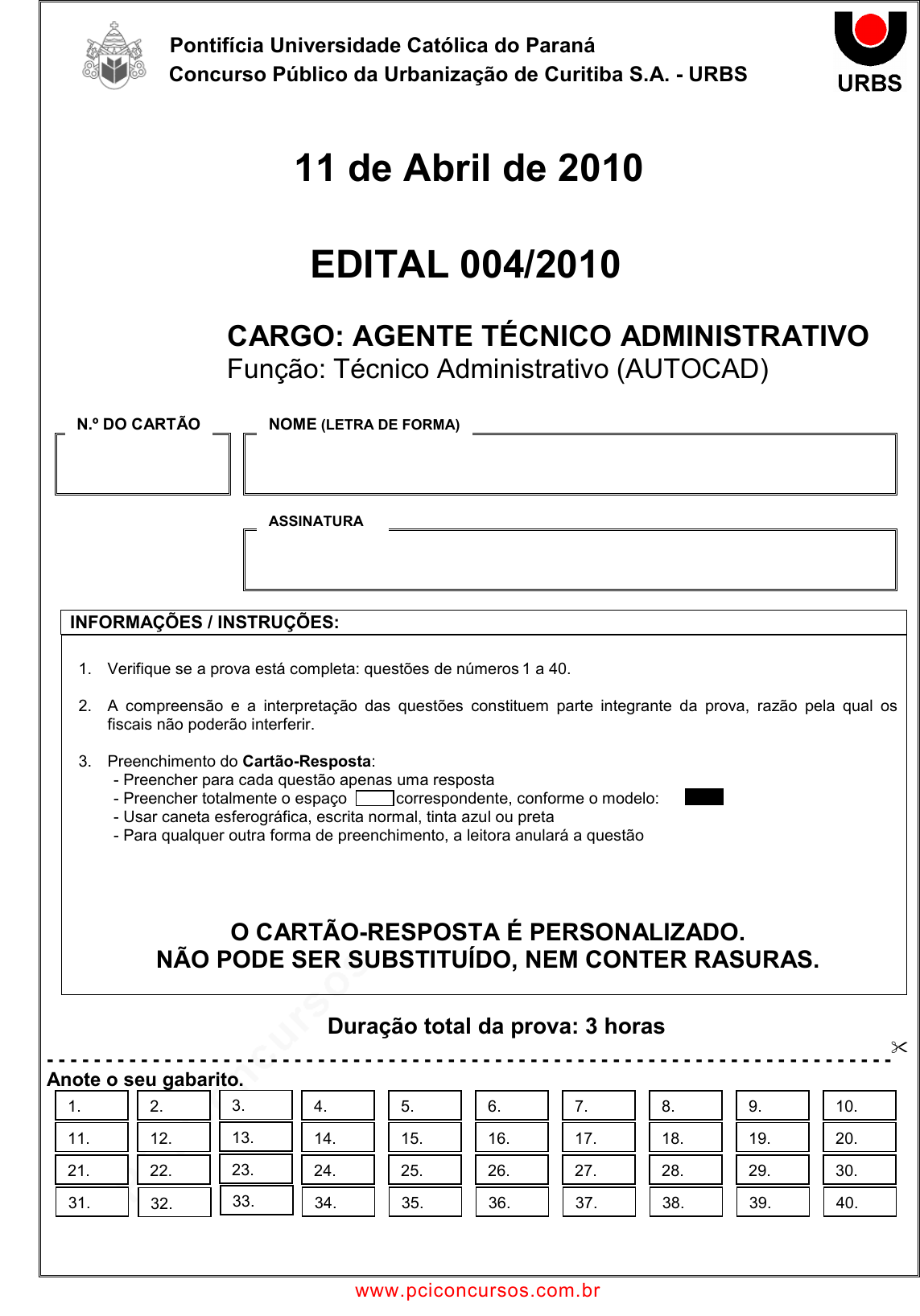 pcimarkpci MDAwMDowMDAwOjAwMDA6MDAwMDowMDAwOmZmZmY6MzZlOTpjMjU5:RnJpLCAxNyBTZXAgMjAyMSAwNjo1MzozNyAtMDMwMA== Pontifícia Universidade Católica do Paraná Concurso Público da Urbanizaç ão de Curitiba S.A. - URBS 11 de Abril de 2010 EDITAL 004/2010 CARGO: AGENTE TÉCNICO ADMINISTRATIVO Função: Técnico Administrativo (AUTOCAD) INFORMAÇÕES / INSTRUÇÕES: 1. Verifique se a prova está completa: questões de números 1 a 40. 2. A compreensão e a interpretação das questões constituem parte integrante da prova, razão pela qual os fiscais não poderão interferir. 3. Preenchimento do Cartão-Resposta : - Preencher para cada questão apenas uma resposta - Preencher totalmente o espaço correspondente, conforme o modelo: - Usar caneta esferográfica, escrita normal, tinta azul ou preta - Para qualquer outra forma de preenchimento, a leitora anulará a questão O CARTÃO-RESPOSTA É PERSONALIZADO. NÃO PODE SER SUBSTITUÍDO, NEM CONTER RASURAS. Duração total da prova: 3 horas � - - - - - - - - - - - - - - - - - - - - - - - - - - - - - - - - - - - - - - - - - - - - - - - - - - - - - - - - - - - - - - - - - - - - - - - - Anote o seu gabarito. N.º DO CARTÃO NOME (LETRA DE FORMA) ASSINATURA 1. 2. 3. 4. 5. 6. 7. 8. 9. 10. 31. 32. 33. 34. 35. 36. 37. 38. 39. 40. 11. 12. 13. 14. 15. 16. 17. 18. 19. 20. 21. 22. 23. 24. 25. 26. 27. 28. 29. 30. www.pciconcursos.com.br pcimarkpci MDAwMDowMDAwOjAwMDA6MDAwMDowMDAwOmZmZmY6MzZlOTpjMjU5:RnJpLCAxNyBTZXAgMjAyMSAwNjo1MzozNyAtMDMwMA== Pontifícia Universidade Católica do Paraná – Concurso Público URBS/2010 Pág. 1 www.pciconcursos.com.br pcimarkpci MDAwMDowMDAwOjAwMDA6MDAwMDowMDAwOmZmZmY6MzZlOTpjMjU5:RnJpLCAxNyBTZXAgMjAyMSAwNjo1MzozNyAtMDMwMA== Pontifícia Universidade Católica do Paraná – Concurso Público URBS/2010 Pág. 2 CCOONNHHEECCIIMMEENNTTOOSS EESSPPEECCÍÍFFIICCOOSS 1. Os arquivos nativos do AutoCAD e suas respectivas funções são: I. BAK arquivo de segurança ou backup. II. DXF arquivo de imagem. III. DWG arquivo de desenho. IV. DWT arquivo modelo. A) Apenas as assertivas I e III estão corretas. B) As assertivas I, III e IV estão corretas. C) Apenas a assertiva I está correta. D) Apenas a assertiva II está correta. E) Todas as assertivas estão corretas. 2. A variável FILLMODE tem como função: A) Apresentar ou não o preenchimento de polylines com espessura e de alguns tipos de textura. B) Ajustar a sensibilidade do mouse na tela. C) Apresentar ou não as informações dos objetos no comando properties. D) Apresentar ou não o contorno de superfícies 3D. E) Apresentar ou não o quadro de Layers. 3. O comando REGION cria: A) Regiões que podem ser transformadas em arcos. B) Regiões bi ou tridimensionais. C) Áreas de subtração ou adição. D) Nenhuma das anteriores. E) Áreas bidimensionais a partir de perímetros fechados compostos de polylines, retas, curvas, elipses e splines. 4. O comando AUDIT tem como função: A) Efetuar uma auditoria nas cotas. B) Resolver problemas de somas em cotas acumuladas. C) Examinar o desenho em uso e corrigir erros de arquivo. D) Verificar se o arquivo está pronto para ser impresso. E) Verificar se os Layers estão todos ativos. 5. Assinale a alternativa CORRETA: I. Endpoint captura pontos finais. II. Quadrant captura quadrantes de círculos e arcos. III. Apparent Intersection captura intersecções que ocorrem em entidades com valores de Z diferentes. IV. Node captura o objeto ponto. A) Apenas a afirmação I está correta. B) Apenas as afirmações I e II estão corretas. C) Nenhuma das afirmações está correta. D) Os elementos citados não existem no AutoCAD. E) Todas as afirmações acima estão corretas. 6. Qual comando do AutoCAD faz a concordância de retas por meio de um arco de raio variável? A) O comando FILLET, que pode ser usado em retas paralelas. B) O comando FILLET, que não pode ser utilizado em retas paralelas. C) O comando CHAMFER na sua opção DISTANCE. D) O comando CHAMFER na sua opção ANGLE. E) Não é possível realizar esse tipo de operação. 7. Em caso de dano permanente no arquivo DWG o que podemos fazer? A) Não é possível fazer nada; o desenho terá de ser refeito. B) Renomear o arquivo BAK para DWG e recuperar parte do desenho perdido. C) Importar o arquivo DXF, que o AutoCAD cria automaticamente. D) O arquivo DWG nunca se danifica. E) Abrir o arquivo PLT, que o AutoCAD gera automaticamente. 8. Qual o espaço específico para impressão no AutoCAD? A) Não existe espaço especificamente destinado à impressão no AutoCAD. B) É o espaço 3D. C) É o Model (ou model space). D) O Layout (ou paper space). E) Nenhuma alternativa está correta. 9. Quando utilizamos o comando POLYLINE no AutoCAD, podemos atribuir-lhe espessura real: A) Com a opção Wide. B) Com a opção Length. C) Não é possível atribuir espessura real ao comando Polyline. D) Com a opção Width ou Halfwidth. E) Nenhuma alternativa está correta. www.pciconcursos.com.br pcimarkpci MDAwMDowMDAwOjAwMDA6MDAwMDowMDAwOmZmZmY6MzZlOTpjMjU5:RnJpLCAxNyBTZXAgMjAyMSAwNjo1MzozNyAtMDMwMA== Pontifícia Universidade Católica do Paraná – Concurso Público URBS/2010 Pág. 3 10. Após a criação de uma Polyline, podemos alterar sua espessura real? A) Sim, com o comando Wide. B) Sim, com o comando Polyline. C) Sim, com o comando Pedit. D) Não podemos alterar a espessura real de uma Polyline. E) Nenhuma alternativa está correta. 11. Sobre a definição de BLOCO no AutoCAD e os elementos básicos que o compõem, é CORRETO afirmar: A) O BLOCO é um conjunto de entidades agrupadas e deve possuir Nome, Ponto de base e Seleção de objetos. B) O BLOCO é um desenho complexo e deve possuir Nome e Coordenada dos Objetos. C) O BLOCO é um conjunto de retas, arcos e círculos e deve possuir Ponto de referência, elementos editáveis e Nome. D) O BLOCO é obtido na Internet e possui Layer, Ponto de referência e Nome. E) Nenhuma das alternativas anteriores. 12. Para a criação de um bloco que, no mome