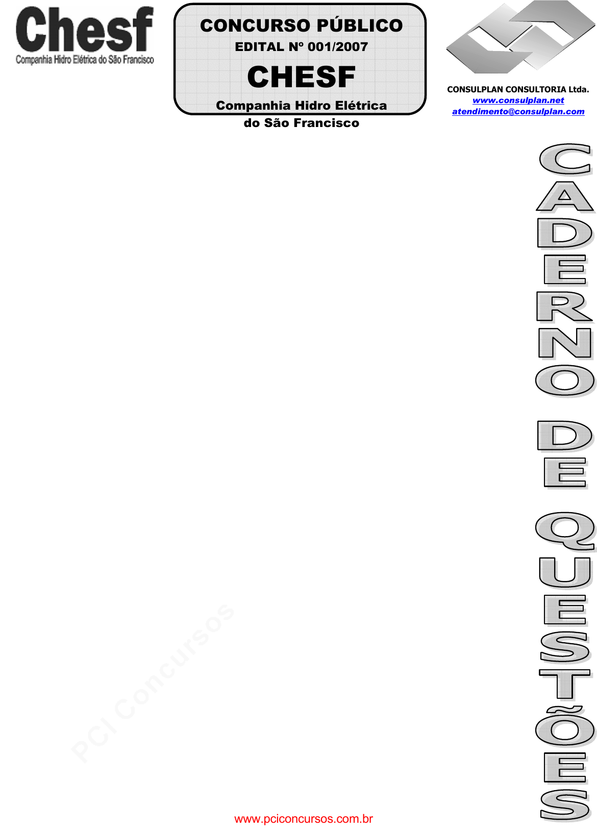 pcimarkpci MDAwMDowMDAwOjAwMDA6MDAwMDowMDAwOmZmZmY6MzZlOTpjMjU5:U2F0LCAxMSBTZXAgMjAyMSAxMDo0Nzo1MyAtMDMwMA== CONCURSO PÚBLICO EDITAL Nº 001/2007 CHESF Companhia Hidro Elétrica do São Francisco CONSULPLAN CONSULTORIA Ltda. www.consulplan.net atendimento@consulplan.com www.pciconcursos.com.br pcimarkpci MDAwMDowMDAwOjAwMDA6MDAwMDowMDAwOmZmZmY6MzZlOTpjMjU5:U2F0LCAxMSBTZXAgMjAyMSAxMDo0Nzo1MyAtMDMwMA== CONCURSO PÚBLICO − CHESF (Companhia Hidro Elétrica do São Francisco) CONSULPLAN CONSULTORIA LTDA www.consulplan.net atendimento@consulplan.com 2 CARGO: ASSISTENTE TÉCNICO A – TÉCNICO EM ELETROTÉCNICA TEXTO: O vento que vinha trazendo a lua Eu estava no apartamento de um amigo, no Posto 6, e quando cheguei à janela vi a lua: já havia nascido toda e subido um pouco sobre o horizonte marinho, avermelhada. Meu amigo fora lá dentro buscar alguma coisa e eu ficara ali, sozinho, naquela janela, presenciando a ascensão da lua cheia. INSTRUÇÕES 01 - Material a ser utilizado: caneta esferográfica azul ou preta. Os objetos restantes devem ser colocados em local indicado pelo fiscal da sala, inclusive aparelho celular desligado, devidamente identificado com etiqueta. 02 - Não é permitido consulta, utilização de livros, códigos, dicionários, apontamentos, apostilas, calculadoras e etc. Bips e telefones celulares, devem ser mantidos desligados, ou qualquer outro material. É expressamente proibido ao candidato entrar ou permanecer com armas no local de realização das provas. Caso o candidato detenha o porte legal de arma e esteja de posse da mesma; deverá entregá-la na Coordenação, buscando-a ao término das provas. 03 - Durante a prova, o candidato não deve levantar-se, comunicar-se com outros candidatos e nem fumar. 04 - A duração da prova é de 03 (TRÊS) horas e 30 (TRINTA) minutos, já incluído o tempo destinado à identificação - que será feita no decorrer da prova - e ao preenchimento da FOLHA DE RESPOSTAS (GABARITO). 05 - Somente em caso de urgência pedir ao fiscal para ir ao sanitário, devendo no percurso permanecer absolutamente calado, podendo antes e depois da entrada no sanitário sofrer revista através de detector de metais. Ao término da prova ao sair da sala, não poderá utilizar os sanitários. Caso ocorra uma emergência, o fiscal deverá ser comunicado. 06 - O caderno de provas consta de: 40 (QUARENTA) questões objetivas de múltipla escolha para Nível Superior, 30 (TRINTA) questões objetivas de múltipla escolha para os Níveis Fundamental, Médio e Médio Técnico. Leia atentamente e marque apenas uma alternativa. 07 - As questões das provas objetivas serão do tipo múltipla escolha, com cinco opções (A a E) e uma única resposta correta. Haverá na folha de respostas para cada questão, um campo designado com o código SR, cujo significado é “sem resposta”, que servirá somente para caracterizar que o candidato desconhece a resposta correta. Portanto, a sua marcação não implicará em apenação ao candidato. 08 - Deve-se marcar na FOLHA DE RESPOSTAS (GABARITO) apenas uma opção em cada questão, com caneta azul ou preta, SEM RASURAS, SEM AMASSÁ-LA, SEM PERFURÁ-LA. Caso contrário, a questão será anulada. 09 - Ao terminar a conferência do caderno de provas, caso o mesmo esteja incompleto ou tenha qualquer defeito, o candidato deverá solicitar ao fiscal de sala que o substitua, não cabendo reclamações posteriores neste sentido. Inclusive devendo o candidato verificar se o cargo/função em que se inscreveu encontra-se devidamente identificado no caderno de provas na parte superior esquerda da folha nº 02. 10 - Os fiscais não estão autorizados a emitir opinião nem prestar esclarecimentos sobre o conteúdo das provas. Cabe, única e exclusivamente ao candidato, interpretar e decidir. 11 - O candidato somente poderá retirar-se do local de realização das provas após 90 (noventa) minutos de seu início e só poderá levar o Caderno de Provas no decurso dos últimos 60 (sessenta) minutos anteriores ao horário previsto para o seu término. 12 - É proibida a reprodução total ou parcial deste material, por qualquer meio ou processo, sem autorização expressa da Consulplan Consultoria. Em nenhuma hipótese a Consulplan Consultoria informará o resultado por telefone. 13 - A desobediência a qualquer uma das recomendações constantes nas presentes instruções poderá implicar na anulação da prova do candidato. RESULTADOS E RECURSOS - Os gabaritos oficiais das provas escritas objetivas de múltipla escolha estarão disponíveis no site www.consulplan.net a partir das 14:00 horas do dia subseqüente à realização das provas objetivas. - Os recursos deverão ser apresentados conforme determinado no item 10 do Edital 001/2007, não esquecendo, principalmente dos seguintes aspectos: a) Caberá recurso contra questões das provas e contra erros ou omissões no gabarito, até 02(dois) dias úteis, a contar do dia subseqüente ao da divulgação desses gabaritos, iniciando-se às 14:00 horas do dia 18 de Junho de 2007 e encerrando-se às 14:00 horas do dia 20 de Junho de 2007. b) A decisão proferida pela Banca Examinadora tem caráter irrecorrível na esfera administrativa, razão pela qual não caberão recursos adicionais. c) Os recursos somente poderão ser feitos via Internet, apenas no prazo recursal, à CONSULPLAN CONSULTORIA, em requerimento próprio disponibilizado no link correlato ao Concurso Público no site www.consulplan.net. d) Serão rejeitados os recursos não fundamentados, enviados via postal, via fac-símile (fax) e os que não contiverem dados necessários à identificação do candidato. www.pciconcursos.com.br pcimarkpci MDAwMDowMDAwOjAwMDA6MDAwMDowMDAwOmZmZmY6MzZlOTpjMjU5:U2F0LCAxMSBTZXAgMjAyMSAxMDo0Nzo1MyAtMDMwMA== CONCURSO PÚBLICO − CHESF (Companhia Hidro Elétrica do São Francisco) CONSULPLAN CONSULTORIA LTDA www.consulplan.net atendimento@consulplan.com 3 Havia certamente todos os ruídos