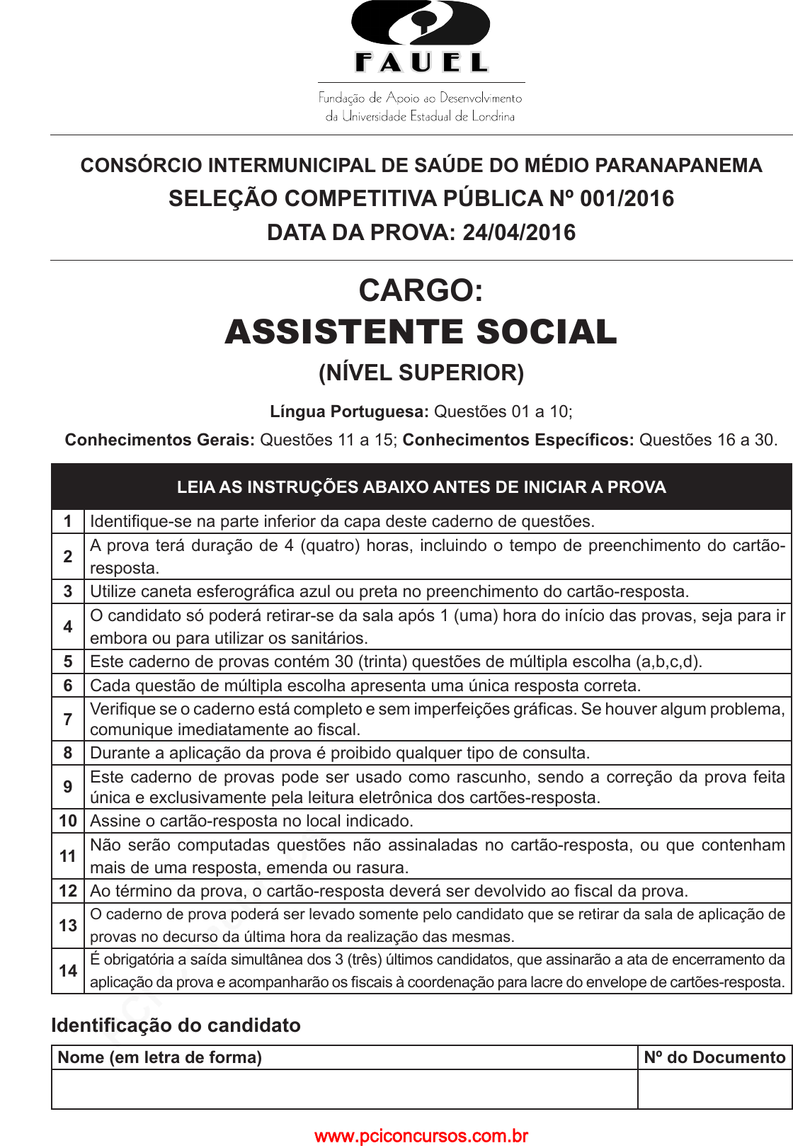 pcimarkpci MDAwMDowMDAwOjAwMDA6MDAwMDowMDAwOmZmZmY6MzZlOTpjMjU5:U2F0LCAxOCBTZXAgMjAyMSAwMTo1Njo1NiAtMDMwMA== CONSÓRCIO INTERMUNICIPAL DE SAÚDE DO MÉDIO PARANAPANEMA SELEÇÃO COMPETITIVA PÚBLICA Nº 001/2016 DATA DA PROVA: 24/04/2016 CARGO: ASSISTENTE SOCIAL (NÍVEL SUPERIOR) Língua Portuguesa: Questões 01 a 10; Conhecimentos Gerais: Questões 11 a 15; Conhecimentos Específicos: Questões 16 a 30. LEIA AS INSTRUÇÕES ABAIXO ANTES DE INICIAR A PROVA 1 Identifique-se na parte inferior da capa deste caderno de questões. 2 A prova terá duração de 4 (quatro) horas, incluindo o tempo de preenchimento do cartão- resposta. 3 Utilize caneta esferográfica azul ou preta no preenchimento do cartão-resposta. 4 O candidato só poderá retirar-se da sala após 1 (uma) hora do início das provas, seja para ir embora ou para utilizar os sanitários. 5 Este caderno de provas contém 30 (trinta) questões de múltipla escolha (a,b,c,d). 6 Cada questão de múltipla escolha apresenta uma única resposta correta. 7 Verifique se o caderno está completo e sem imperfeições gráficas. Se houver algum problema, comunique imediatamente ao fiscal. 8 Durante a aplicação da prova é proibido qualquer tipo de consulta. 9 Este caderno de provas pode ser usado como rascunho, sendo a correção da prova feita única e exclusivamente pela leitura eletrônica dos cartões-resposta. 10 Assine o cartão-resposta no local indicado. 11 Não serão computadas questões não assinaladas no cartão-resposta, ou que contenham mais de uma resposta, emenda ou rasura. 12 Ao término da prova, o cartão-resposta deverá ser devolvido ao fiscal da prova. 13 O caderno de prova poderá ser levado somente pelo candidato que se retirar da sala de aplicação de provas no decurso da última hora da realização das mesmas. 14 É obrigatória a saída simultânea dos 3 (três) últimos candidatos, que assinarão a ata de encerramento da aplicação da prova e acompanharão os fiscais à coordenação para lacre do envelope de cartões-resposta. Identificação do candidato Nome (em letra de forma) Nº do Documento www.pciconcursos.com.br pcimarkpci MDAwMDowMDAwOjAwMDA6MDAwMDowMDAwOmZmZmY6MzZlOTpjMjU5:U2F0LCAxOCBTZXAgMjAyMSAwMTo1Njo1NiAtMDMwMA== 1 QUESTÕES 01 A 10 - LÍNGUA PORTUGUESA Leia o texto e responda às questões de 01 a 08, a seguir: O assassino era o escriba Paulo Leminsky Meu professor de análise sintática era o tipo do sujeito inexistente. Um pleonasmo, o principal predicado da sua vida, regular como um paradigma da 1ª conjugação. Entre uma oração subordinada e um adjunto adverbial, ele não tinha dúvidas: sempre achava um jeito assindético de nos torturar com um aposto. Casou com uma regência. Foi infeliz. Era possessivo como um pronome. E ela era bitransitiva. Tentou ir para os EUA. Não deu. Acharam um artigo indefinido em sua bagagem. A interjeição do bigode declinava partículas expletivas, conectivos e agentes da passiva, o tempo todo. Um dia, matei-o com um objeto direto na cabeça. ________________________________________ 01. A respeito da estrutura e interpretação do texto, é possível afirmar que é: a) um texto jornalístico que faz uso do vocabulário pertencente ao campo da gramática, com fins humorísticos. b) um texto poético que faz uma sátira com o vocabulário gramatical, no intuito de demonstrar a inutilidade destes termos. c) um poema que combina vocábulos pertencentes ao campo do conhecimento gramatical ao fazer uma narrativa, com intenções de expressividade. d) uma narração cuja intenção é demonstrar a falta de objetividade dos termos gramaticais. ________________________________________ 02. A respeito da identificação do sujeito do texto com um “pleonasmo”, podemos afirmar que se trata de uma figura de linguagem cujas características apontam para: a) a redundância e a repetitividade. b) a insegurança e o excesso. c) a circunspecção e a introversão. d) o talento e a comodidade. 03. A respeito da construção “artigo indefinido” na frase: “Acharam um artigo indefinido em sua bagagem”, assinale a alternativa correta: a) O autor utiliza uma classificação gramatical que se refere ao grupo de palavras “o, a, os, as”, no contexto da narrativa, demonstrando a expressividade das palavras em diferentes contextos. b) O autor utiliza uma classificação gramatical que se refere ao grupo de palavras “meu, minha, meus, minhas”, no contexto da narrativa, demonstrando a expressividade das palavras em diferentes contextos. c) O autor utiliza uma classificação gramatical que se refere ao grupo de palavras “este, esta, estes, estas”, no contexto da narrativa, demonstrando a expressividade das palavras em diferentes contextos. d) O autor utiliza uma classificação gramatical que se refere ao grupo de palavras “um, uma, uns, umas”, no contexto da narrativa, demonstrando a expressividade das palavras em diferentes contextos. ________________________________________ 04. No texto, o autor faz menção ao fato do sujeito ser “regular como um paradigma da primeira conjugação”. A respeito dos paradigmas de conjugação verbal, considere as afirmativas abaixo e assinale a alternativa que NÃO corresponde corretamente às funções, características e modos desse tópico gramatical. a) Em Língua Portuguesa, há três tipos de paradigmas de conjugação verbal, a saber, dos verbos que terminam em -ar; -er e -ir. b) Entende-se por “paradigma de conjugação”, de uma maneira geral, as terminações correspondentes aos tempos, pessoas e modos, que se repetem a cada vez que conjugamos um verbo. c) Verbos regulares e irregulares são iguais em suas formas. Dizemos que um verbo é irregular quando seu sentido é dado de acordo com o contexto. d) Não por acaso, os verbos que mais utilizamos têm formas irregulares, donde podemos concluir que um verbo se torna irregular, ou seja, com características diferentes dos verbos regulares, por serem mui