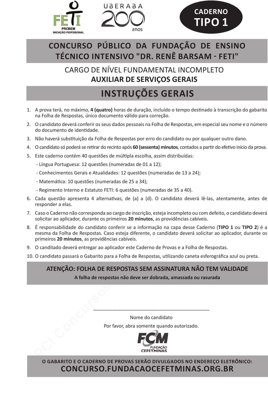 pcimarkpci MDAwMDowMDAwOjAwMDA6MDAwMDowMDAwOmZmZmY6MzZlOTpjMjU5:U2F0LCAxOCBTZXAgMjAyMSAxMzoxOTo0MSAtMDMwMA== 1. A prova terá, no máximo, 4 (quatro) horas de duração, incluído o tempo desti nado à transcrição do gabarito na Folha de Respostas, único documento válido para correção. 2. O candidato deverá conferir os seus dados pessoais na Folha de Respostas, em especial seu nome e o número do documento de identi dade. 3. Não haverá substi tuição da Folha de Respostas por erro do candidato ou por qualquer outro dano. 4. O candidato só poderá se reti rar do recinto após 60 (sessenta) minutos, contados a parti r do efeti vo início da prova. 5. Este caderno contém 40 questões de múlti pla escolha, assim distribuídas: - Língua Portuguesa: 12 questões (numeradas de 01 a 12); - Conhecimentos Gerais e Atualidades: 12 questões (numeradas de 13 a 24); - Matemáti ca: 10 questões (numeradas de 25 a 34); - Regimento Interno e Estatuto FETI: 6 questões (numeradas de 35 a 40). 6. Cada questão apresenta 4 alternati vas, de (a) a (d). O candidato deverá lê-las, atentamente, antes de responder a elas. 7. Caso o Caderno não corresponda ao cargo de inscrição, esteja incompleto ou com defeito, o candidato deverá solicitar ao aplicador, durante os primeiros 20 minutos, as providências cabíveis. 8. É responsabilidade do candidato conferir se a informação na capa desse Caderno (tIpo 1 ou tIpo 2) é a mesma da Folha de Respostas. Caso esteja diferente, o candidato deverá solicitar ao aplicador, durante os primeiros 20 minutos, as providências cabíveis. 9. O canditado deverá entregar ao aplicador este Caderno de Provas e a Folha de Respostas. 10. O candidato passará o Gabarito para a Folha de Respostas, uti lizando caneta esferográfi ca azul ou preta. InstruçÕes geraIs atençÃo: Folha de respostas sem assInatura nÃo tem ValIdade a folha de respostas não deve ser dobrada, amassada ou rasurada o gaBarIto e o Caderno de proVas serÃo dIVulgados no endereço eletrÔnICo: ConCurso.FundaCaoCeFetmInas.org.Br __________________________________________ Nome do candidato Por favor, abra somente quando autorizado. CARGO DE NÍVEL FUNDAMENTAL INCOMPLETO auXIlIar de serVIços geraIs ConCurso púBlICo da FundaçÃo de ensIno técnico intensivo "dr. renê barsam - feti" Caderno tIpo 1 pcimarkpci MDAwMDowMDAwOjAwMDA6MDAwMDowMDAwOmZmZmY6MzZlOTpjMjU5:U2F0LCAxOCBTZXAgMjAyMSAxMzoxOTo0MSAtMDMwMA== pcimarkpci MDAwMDowMDAwOjAwMDA6MDAwMDowMDAwOmZmZmY6MzZlOTpjMjU5:U2F0LCAxOCBTZXAgMjAyMSAxMzoxOTo0MSAtMDMwMA== feti - cargo de nível fundamental incompleto - auxiliar de serviços gerais 3 língua portuguesa as questões de 01 a 09 se referem ao texto a seguir. Leia esta história em quadrinhos, uma criação do cartunista paranaense Will Leite, cuja personagem, Dona Anésia, é uma senhora que fala o que vem na sua cabeça. Disponível em: <http://www.willtirando.com.br/category/anesia/ page/14/>. Acesso em 10 jan. 2020. Adaptado. QuestÃo 01 O texto trata, principalmente, a) de um momento descontraído na vida das perso- nagens. b) de um passeio semanal entre duas mulheres. c) de uma conversa entre uma pessoa mais nova e outra mais velha. d) de um acontecimento cotidiano e conflituoso en- tre mãe e filha. QuestÃo 02 O fato que provoca a reação da filha quanto ao pedi- do feito pela mãe acontece, fundamentalmente, por causa de a) uma dúvida. b) uma pergunta. c) um comentário d) um esquecimento. QuestÃo 03 Avalie o comportamento da jovem quando pergunta por que elas devem voltar à igreja. A resposta da mãe deixa a filha I - irritada. II - indolente. III - constrangida. IV - descontrolada. Está correto apenas o que se afirma em a) I e II. b) I e IV. c) II e III. d) III e IV. QuestÃo 04 Em vez de ficar magoada com a filha, a mãe se mostra irônica e não perde a oportunidade de lhe dar uma alfinetada, ou seja, é certeira na resposta, que lem- bra uma lição de moral. O ditado popular que melhor explica a atitude de D. Anésia é a) “Devagar se vai longe.” b) “Onde há fumaça, há fogo.” c) “Filho de peixe, peixinho é.” d) “Casa de ferreiro, espeto de pau.” pcimarkpci MDAwMDowMDAwOjAwMDA6MDAwMDowMDAwOmZmZmY6MzZlOTpjMjU5:U2F0LCAxOCBTZXAgMjAyMSAxMzoxOTo0MSAtMDMwMA== 4 feti - cargo de nível fundamental incompleto - auxiliar de serviços gerais QuestÃo 05 Leia a passagem transcrita do texto. “Só não esquece a cabeça porque tá colada no pescoço.” Esse trecho indica que a filha foi muito indelicada com sua mãe. Nesse caso, a palavra grifada, no con- texto em que foi usada e sem prejuízo para o sentido, pode ser substituída eXCeto por a) polida. b) grosseira. c) descortês. d) mal-educada. QuestÃo 06 Diante da resposta de D. Anésia, a expressão facial sugere que a filha, no último quadrinho, ficou, ao mesmo tempo, a) curiosa e apática. b) infeliz e violenta. c) surpresa e incrédula. d) estressada e colérica. QuestÃo 07 Preencha corretamente as lacunas do texto, identifi- cando as classes de palavras. No período “Dá meia-volta. Volta pra igreja.”, os ter- mos em destaque pertencem a duas classes de pa- lavras distintas. A primeira, ligada a outra por hífen, exemplifica um _______________, porque nomeia um ser; já a segunda é um _______________, pois indica uma ação. A sequência que preenche corretamente as lacunas do texto é a) substantivo coletivo / artigo. b) adjetivo diminutivo / advérbio. c) adjetivo feminino, singular / pronome. d) substantivo comum, composto / verbo. QuestÃo 08 Leia as frases. I - “Esqueci minha sombrinha lá.” II - “Aproveitei e peguei sua bolsa também.” Sobre esses trechos transcritos do texto, informe se é verdadeiro (V) ou falso (F) o que se afirma. ( ) I e II não possuem verbos. ( ) II apresenta duas orações. ( ) I é uma frase exclamativa. De acordo com as afirmações, a sequência correta é a) F, V, F. b) V, F, F. c) F, V, V. d) V, F, V. QuestÃo 09 Leia os textos seguintes. texto I Trata