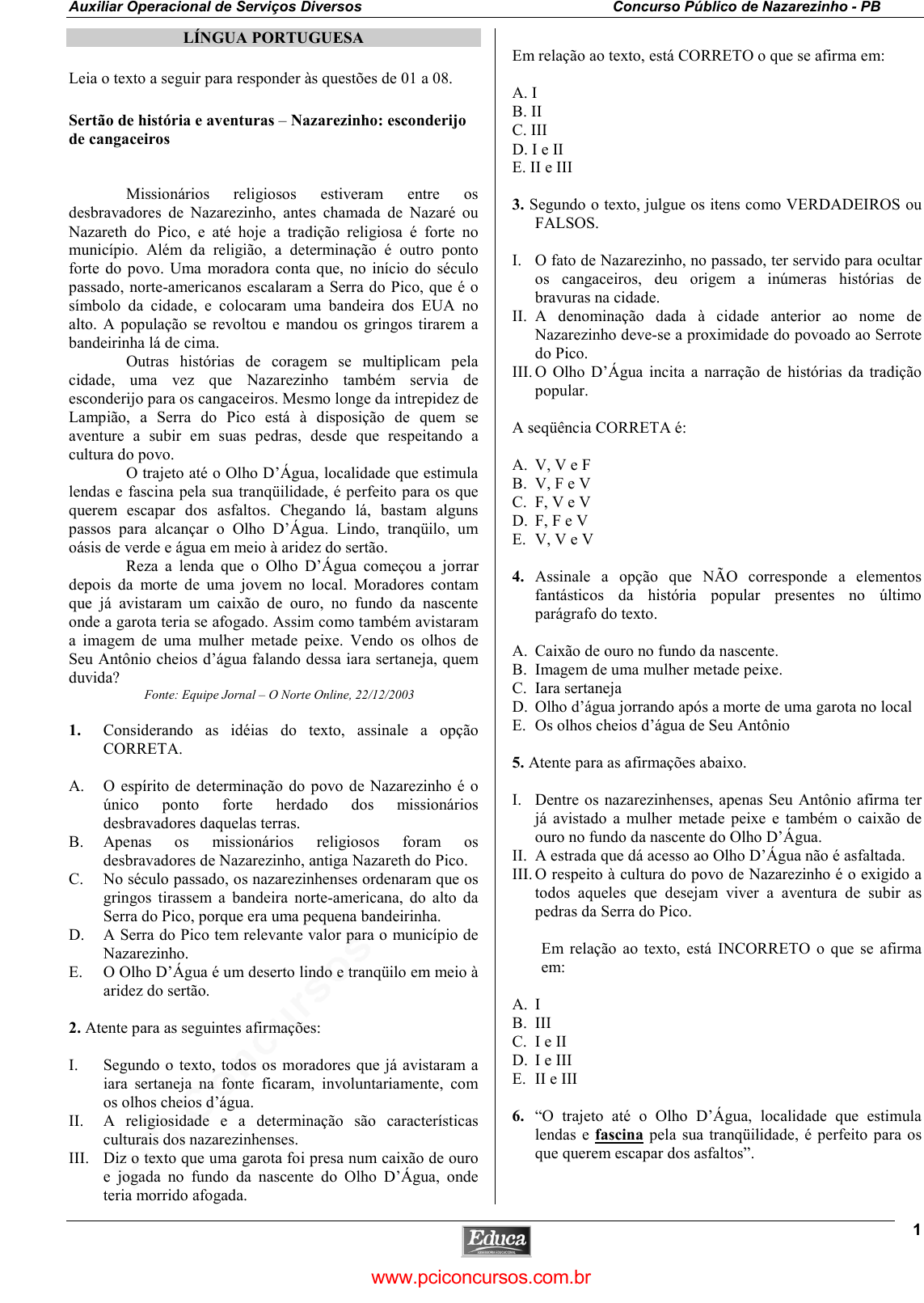 pcimarkpci MDAwMDowMDAwOjAwMDA6MDAwMDowMDAwOmZmZmY6MzZlOTpjMjU5:U2F0LCAxOCBTZXAgMjAyMSAxNjoyMjowMCAtMDMwMA== Auxiliar Operacional de Serviços Diversos Concurso Público de Nazarezinho - PB 1 LÍNGUA PORTUGUESA Leia o texto a seguir para responder às questões de 01 a 08. Sertão de história e aventuras – Nazarezinho: esconderijo de cangaceiros Missionários religiosos estiveram entre os desbravadores de Nazarezinho, antes chamada de Nazaré ou Nazareth do Pico, e até hoje a tradição religiosa é forte no município. Além da religião, a determinação é outro ponto forte do povo. Uma moradora conta que, no início do século passado, norte-americanos escalaram a Serra do Pico, que é o símbolo da cidade, e colocaram uma bandeira dos EUA no alto. A população se revoltou e mandou os gringos tirarem a bandeirinha lá de cima. Outras histórias de coragem se multiplicam pela cidade, uma vez que Nazarezinho também servia de esconderijo para os cangaceiros. Mesmo longe da intrepidez de Lampião, a Serra do Pico está à disposição de quem se aventure a subir em suas pedras, desde que respeitando a cultura do povo. O trajeto até o Olho D’Água, localidade que estimula lendas e fascina pela sua tranqüilidade, é perfeito para os que querem escapar dos asfaltos. Chegando lá, bastam alguns passos para alcançar o Olho D’Água. Lindo, tranqüilo, um oásis de verde e água em meio à aridez do sertão. Reza a lenda que o Olho D’Água começou a jorrar depois da morte de uma jovem no local. Moradores contam que já avistaram um caixão de ouro, no fundo da nascente onde a garota teria se afogado. Assim como também avistaram a imagem de uma mulher metade peixe. Vendo os olhos de Seu Antônio cheios d’água falando dessa iara sertaneja, quem duvida? Fonte: Equipe Jornal – O Norte Online, 22/12/2003 1. Considerando as idéias do texto, assinale a opção CORRETA. A. O espírito de determinação do povo de Nazarezinho é o único ponto forte herdado dos missionários desbravadores daquelas terras. B. Apenas os missionários religiosos foram os desbravadores de Nazarezinho, antiga Nazareth do Pico. C. No século passado, os nazarezinhenses ordenaram que os gringos tirassem a bandeira norte-americana, do alto da Serra do Pico, porque era uma pequena bandeirinha. D. A Serra do Pico tem relevante valor para o município de Nazarezinho. E. O Olho D’Água é um deserto lindo e tranqüilo em meio à aridez do sertão. 2. Atente para as seguintes afirmações: I. Segundo o texto, todos os moradores que já avistaram a iara sertaneja na fonte ficaram, involuntariamente, com os olhos cheios d’água. II. A religiosidade e a determinação são características culturais dos nazarezinhenses. III. Diz o texto que uma garota foi presa num caixão de ouro e jogada no fundo da nascente do Olho D’Água, onde teria morrido afogada. Em relação ao texto, está CORRETO o que se afirma em: A. I B. II C. III D. I e II E. II e III 3. Segundo o texto, julgue os itens como VERDADEIROS ou FALSOS. I. O fato de Nazarezinho, no passado, ter servido para ocultar os cangaceiros, deu origem a inúmeras histórias de bravuras na cidade. II. A denominação dada à cidade anterior ao nome de Nazarezinho deve-se a proximidade do povoado ao Serrote do Pico. III. O Olho D’Água incita a narração de histórias da tradição popular. A seqüência CORRETA é: A. V, V e F B. V, F e V C. F, V e V D. F, F e V E. V, V e V 4. Assinale a opção que NÃO corresponde a elementos fantásticos da história popular presentes no último parágrafo do texto. A. Caixão de ouro no fundo da nascente. B. Imagem de uma mulher metade peixe. C. Iara sertaneja D. Olho d’água jorrando após a morte de uma garota no local E. Os olhos cheios d’água de Seu Antônio 5. Atente para as afirmações abaixo. I. Dentre os nazarezinhenses, apenas Seu Antônio afirma ter já avistado a mulher metade peixe e também o caixão de ouro no fundo da nascente do Olho D’Água. II. A estrada que dá acesso ao Olho D’Água não é asfaltada. III. O respeito à cultura do povo de Nazarezinho é o exigido a todos aqueles que desejam viver a aventura de subir as pedras da Serra do Pico. Em relação ao texto, está INCORRETO o que se afirma em: A. I B. III C. I e II D. I e III E. II e III 6. “O trajeto até o Olho D’Água, localidade que estimula lendas e fascina pela sua tranqüilidade, é perfeito para os que querem escapar dos asfaltos”. www.pciconcursos.com.br pcimarkpci MDAwMDowMDAwOjAwMDA6MDAwMDowMDAwOmZmZmY6MzZlOTpjMjU5:U2F0LCAxOCBTZXAgMjAyMSAxNjoyMjowMCAtMDMwMA== Auxiliar Operacional de Serviços Diversos Concurso Público de Nazarezinho - PB 2 Assinale a opção INCORRETA quanto ao significado da palavra fascina. A. Encanta B. Seduz C. Desaponta D. Atrai E. Enfeitiça 7. Vendo os olhos de Seu Antônio cheios d’água falando dessa iara sertaneja, quem duvida? Assinale a opção que contém a explicação CORRETA para o uso do sinal de pontuação no término do trecho acima. A. Usado, no fim de frase, para separar a fala de Seu Antônio B. Usado para introduzir a fala de Seu Antônio C. Indica a emoção de Seu Antônio D. Usado no fim de frase que constitui uma pergunta E. Usado, no final de frase, para indicar a interrupção da fala de Seu Antônio. 8. “Uma moradora conta que, no início do século passado, norte-americanos escalaram a Serra do Pico, que é o símbolo da cidade, e colocaram uma bandeira dos EUA no alto.” Assinale a opção CORRETA em que os tempos verbais das palavras grifadas, no trecho acima, são respectivamente: A. Tempo passado - tempo passado B. Tempo presente – tempo passado C. Tempo passado – tempo presente D. Tempo presente – tempo presente E. Tempo passado – tempo futuro 9. Assinale a opção CORRETA em que todas as palavras estão acentuadas na mesma posição silábica. A. Nazaré – além – até - está – também B. Água – início – além – oásis - religião C