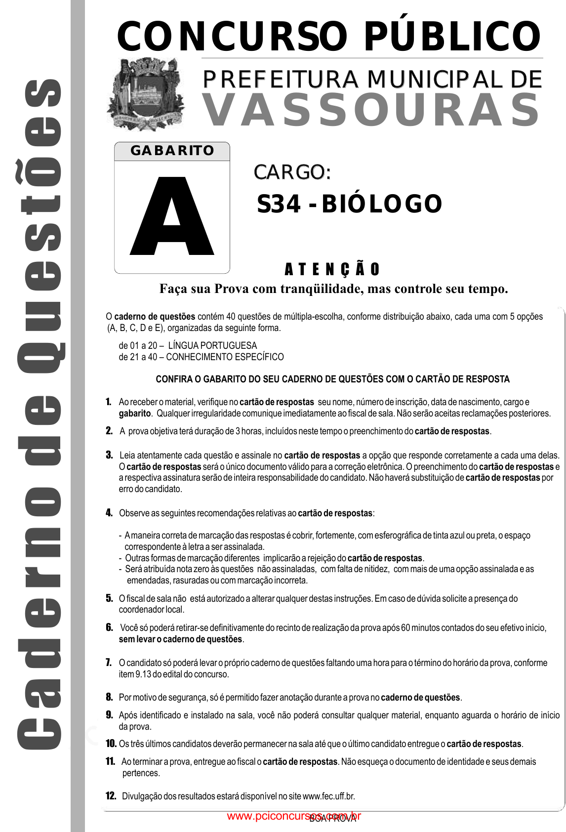 pcimarkpci MDAwMDowMDAwOjAwMDA6MDAwMDowMDAwOmZmZmY6MzZlOTpjMjU5:U2F0LCAxOCBTZXAgMjAyMSAxODo0NTozNSAtMDMwMA== C a d e r n o d e Q u e s t õ e s A T E N Ç Ã O Faça sua Prova com tranqüilidade, mas controle seu tempo. CONCURSO PÚBLICO PREFEITURA MUNICIPAL DEPREFEITURA MUNICIPAL DE VASSOURAS GABARITO A CARGO:CARGO: S34 - BIÓLOGO O caderno de questões contém 40 questões de múltipla-escolha, conforme distribuição abaixo, cada uma com 5 opções (A, B, C, D e E), organizadas da seguinte forma. de 01 a 20 – LÍNGUA PORTUGUESA de 21 a 40 – CONHECIMENTO ESPECÍFICO CONFIRA O GABARITO DO SEU CADERNO DE QUESTÕES COM O CARTÃO DE RESPOSTA 1. Ao receber o material, verifique no cartão de respostas seu nome, número de inscrição, data de nascimento, cargo e gabarito. Qualquer irregularidade comunique imediatamente ao fiscal de sala. Não serão aceitas reclamações posteriores. 2. A prova objetiva terá duração de 3 horas, incluídos neste tempo o preenchimento do cartão de respostas. 3. Leia atentamente cada questão e assinale no cartão de respostas a opção que responde corretamente a cada uma delas. O cartão de respostas será o único documento válido para a correção eletrônica. O preenchimento do cartão de respostas e a respectiva assinatura serão de inteira responsabilidade do candidato. Não haverá substituição de cartão de respostas por erro do candidato. 4. Observe as seguintes recomendações relativas ao cartão de respostas: - A maneira correta de marcação das respostas é cobrir, fortemente, com esferográfica de tinta azul ou preta, o espaço correspondente à letra a ser assinalada. - Outras formas de marcação diferentes implicarão a rejeição do cartão de respostas. - Será atribuída nota zero às questões não assinaladas, com falta de nitidez, com mais de uma opção assinalada e as emendadas, rasuradas ou com marcação incorreta. 5. O fiscal de sala não está autorizado a alterar qualquer destas instruções. Em caso de dúvida solicite a presença do coordenador local. 6. Você só poderá retirar-se definitivamente do recinto de realização da prova após 60 minutos contados do seu efetivo início, sem levar o caderno de questões. 7. O candidato só poderá levar o próprio caderno de questões faltando uma hora para o término do horário da prova, conforme item 9.13 do edital do concurso. 8. Por motivo de segurança, só é permitido fazer anotação durante a prova no caderno de questões. 9. Após identificado e instalado na sala, você não poderá consultar qualquer material, enquanto aguarda o horário de início da prova. 10. Os três últimos candidatos deverão permanecer na sala até que o último candidato entregue o cartão de respostas. 11. Ao terminar a prova, entregue ao fiscal o cartão de respostas. Não esqueça o documento de identidade e seus demais pertences. 12. Divulgação dos resultados estará disponível no site www.fec.uff.br. BOA PROVAwww.pciconcursos.com.br pcimarkpci MDAwMDowMDAwOjAwMDA6MDAwMDowMDAwOmZmZmY6MzZlOTpjMjU5:U2F0LCAxOCBTZXAgMjAyMSAxODo0NTozNSAtMDMwMA== 02 Língua Portuguesa Leia atentamente o texto abaixo e responda às questões propostas. A função administrativa do Estado se exprime através de atos de vontade ou de atos materiais. Entre os primeiros distinguem-se os atos que visam a produzir um determinado efeito jurídico, criando, modificando ou extinguindo uma relação jurídica. É em função dessas características essenciais que encontraremos os atos e os fatos administrativos. Quando a Administração Pública, por intermédio de seus agentes, exprime uma manifestação de vontade que visa à produção de um efeito jurídico, temos um ato administrativo. Se a atividade administrativa se traduz em atos de vontade que não visam, diretamente, a produzir tais efeitos jurídicos (ainda que, indiretamente, possam eles surgir sem que tenham sido queridos pelo agente) ou em meros atos materiais de execução, temos um fato administrativo. O ato administrativo é a forma pela qual opera, por excelência, a ação administrativa, como manifestação unilateral e coativa do Estado, completando-se a função administrativa, quando representada mediante acordos bilaterais de vontade, através de contratos administrativos. O ato administrativo comporta um sentido formal e um sentido material. São atos administrativos formais todos aqueles praticados por um órgão administrativo. São atos administrat ivos mater ia is os que representam, substancialmente, o exercício da função administrativa do Estado, independentemente do órgão de sua execução. Nesses últimos se incluirão, lato sensu, os atos formalmente legislativos ou jurisdicionais que, pelo seu conteúdo, disciplinam matéria administrativa, como as leis orçamentárias e os inquéritos parlamentares ou os atos de jurisdição graciosa. Nos primeiros, os atos praticados pela autoridade administrativa, posto que materialmente legislativos ou jurisdicionais. (Adaptado de TÁCITO, Caio. Ato e fato administrativo. Jurídica. Rio de Janeiro: MIC, ano XIV, v. XXXIII, 1968, p.485.) 2. Informa o texto que a cassação do direito à exploração de uma atividade comercial, por parte da autoridade administrativa competente, assim se caracteriza do ponto de vista jurídico: A) ato administrativo formal; B) ato administrativo material; C) fato administrativo formal; D) fato administrativo material; E) fato administrativo eventual. 3. Entre as afirmações abaixo, a que está no texto é: A) a natureza do ato administrativo é proporcional à do fato administrativo; B) há entre ato administrativo e fato administrativo uma relação de causalidade; C) os atos e os fatos administrativos incluem-se entre os atos de vontade; D) qualquer ato administrativo tem correspondência necessária a um fato administrativo; E) todo ato de vontade do cidadão é caracterizado como ato administrativo. 1. A leitura adequada do texto confere à express