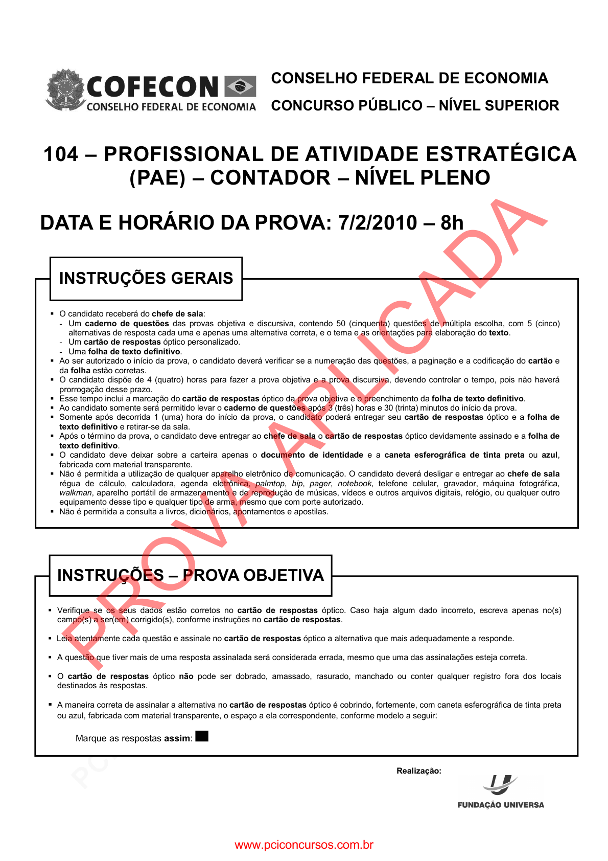 pcimarkpci MDAwMDowMDAwOjAwMDA6MDAwMDowMDAwOmZmZmY6MzZlOTpjMjU5:VGh1LCAxNiBTZXAgMjAyMSAxNDo1NDowMCAtMDMwMA== � Verifique se os seus dados estão corretos no cartão de r espostas óptico. Caso haja algum dado incorreto, escreva apenas no(s) campo(s) a ser(em) corrigido(s), conforme instruções no cartão de respostas . � Leia atentamente cada questão e assinale no cartão de respostas óptico a alternativa que mais adequadamente a responde. � A questão que tiver mais de uma resposta assinalada será considerada errada, mesmo que uma das assinalações esteja correta. � O cartão de respostas óptico não pode ser dobrado, amassado, rasurado, manchado ou conter qualquer registro fora dos locais destinados às respostas. � A maneira correta de assinalar a alternativa no cartão de respostas óptico é cobrindo, fortemente, com caneta esferográfica de tinta preta ou azul, fabricada com material transparente, o espaço a ela correspondente, conforme modelo a seguir: Marque as respostas assim : INSTRUÇÕES – PROVA OBJETIVA INSTRUÇÕES GERAIS Realização: 104 – PROFISSIONAL DE ATIVIDADE ESTRATÉGICA (PAE) – CONTADOR – NÍVEL PLENO � O candidato receberá do chefe de s ala: - Um caderno de questões das provas objetiva e discursiva, contendo 50 (cinquenta) questões de múltipla escolha, com 5 (cinco) alternativas de resposta cada uma e apenas uma alternativa correta, e o tema e as orientações para elaboração do texto . - Um cartão de respostas óptico personalizado. - Uma folha de texto definitivo . � Ao ser autorizado o início da prova, o candidato deverá verificar se a numeração das questões, a paginação e a codificação do cartão e da folha estão corretas. � O candidato dispõe de 4 (quatro) horas para fazer a prova objetiva e a prova discursiva, devendo controlar o tempo, pois não haverá prorrogação desse prazo. � Esse tempo inclui a marcação do cartão de respostas óptico da prova objetiva e o preenchimento da folha de texto definitivo . � Ao candidato somente será permitido levar o caderno de questões após 3 (três) horas e 30 (trinta) minutos do início da prova. � Somente após decorrida 1 (uma) hora do início da prova, o candidato poderá entregar seu cartão de respostas óptico e a folha de texto definitivo e retirar-se da sala. � Após o término da prova, o candidato deve entregar ao chefe de sala o cartão de respostas óptico devidamente assinado e a folha de texto definitivo . � O candidato deve deixar sobre a carteira apenas o documento de identidade e a caneta esferográfica de tinta preta ou azul , fabricada com material transparente. � Não é permitida a utilização de qualquer aparelho eletrônico de comunicação. O candidato deverá desligar e entregar ao chefe de sala régua de cálculo, calculadora, agenda eletrônica, palmtop, bip, pager, notebook, telefone celular, gravador, máquina fotográfica, walkman, aparelho portátil de armazenamento e de reprodução de músicas, vídeos e outros arquivos digitais, relógio, ou qualquer outro equipamento desse tipo e qualquer tipo de arma, mesmo que com porte autorizado. � Não é permitida a consulta a livros, dicionários, apontamentos e apostilas. DATA E HORÁRIO DA PROVA: 7/2/2010 – 8h CONSELHO FEDERAL DE ECONOMIA CONCURSO PÚBLICO – NÍVEL SUPERIOR P R O V A A P L IC A D A www.pciconcursos.com.br pcimarkpci MDAwMDowMDAwOjAwMDA6MDAwMDowMDAwOmZmZmY6MzZlOTpjMjU5:VGh1LCAxNiBTZXAgMjAyMSAxNDo1NDowMCAtMDMwMA== P R O V A A P L IC A D A www.pciconcursos.com.br pcimarkpci MDAwMDowMDAwOjAwMDA6MDAwMDowMDAwOmZmZmY6MzZlOTpjMjU5:VGh1LCAxNiBTZXAgMjAyMSAxNDo1NDowMCAtMDMwMA== FUNDAÇÃO UNIVERSA COFECON – PAE – CONTADOR – NÍVEL PLENO (CÓDIGO 104) Página 3 de 15 CONHECIMENTOS BÁSICOS Texto I, para responder às questões 1 e 2. Descubra o seu economista interior 1 4 7 10 13 16 19 22 25 28 31 34 (...) Ciente desse exagero tão comum a seus colegas economistas, Tyler Cowen cita três princípios básicos capazes de distinguir a boa economia (aquela que é compreensível para as pessoas comuns) da má economia (repleta de ciladas de desumanidade, de verborragia e de excessiva embromação): 1. O Teste do Cartão-Postal Deve ser possível tomar um bom argumento econômico e escrevê-lo no verso de um cartão postal de tamanho razoável. Se um argumento tem passos demais, pelo menos um deles fatalmente estará redondamente incorreto. Ou, ainda, se tem passos demais, não saberemos como todos esses diferentes passos se encaixam uns nos outros para estabelecer a conclusão do argumento. 2. O Teste da Vovó A maioria dos argumentos econômicos deve ser compreensível para sua avó. A vovó pode até não concordar, mas no mínimo precisa entender do que o economista está falando. Se a vovó é a economista da família, e abusa ela própria do jargão, tente um de seus recalcitrantes primos. 3. O Princípio do "A-há" O Princípio do "A há" é uma extensão do Teste da Vovó. Se os conceitos básicos forem bem apresentados, o economês tem de fazer sentido. Bons economistas acreditam que vivemos nossas vidas segundo princípios que qualquer um pode entender. Talvez aconteça de nem sempre compreendermos o que estamos fazendo quando tomamos decisões, mas os argumentos econômicos e os mecanismos devem ser reconhecíveis. Afinal de contas, o argumento é sobre nós. Assim, se alguma observação econômica claramente expressa é objetiva, deve estimular as áreas “A- há”, também conhecidas pelos nomes de “eureka” e insigh de nosso cérebro. Sei que isso pode soar um pouco metafísico, mas a ideia é que uma observação econômica claramente expressa deve de fato fazer alguma diferença para nós no nível pessoal. Ela tem de ser uma revelação. Internet: <http://www.cofecon.org.br/index.php?option=com_content&task= view&id=1939&Itemid=102> (com adaptações). Acesso em 9/1/2010. QUESTÃO 1 _____________________________________ Acerca do desempenho p