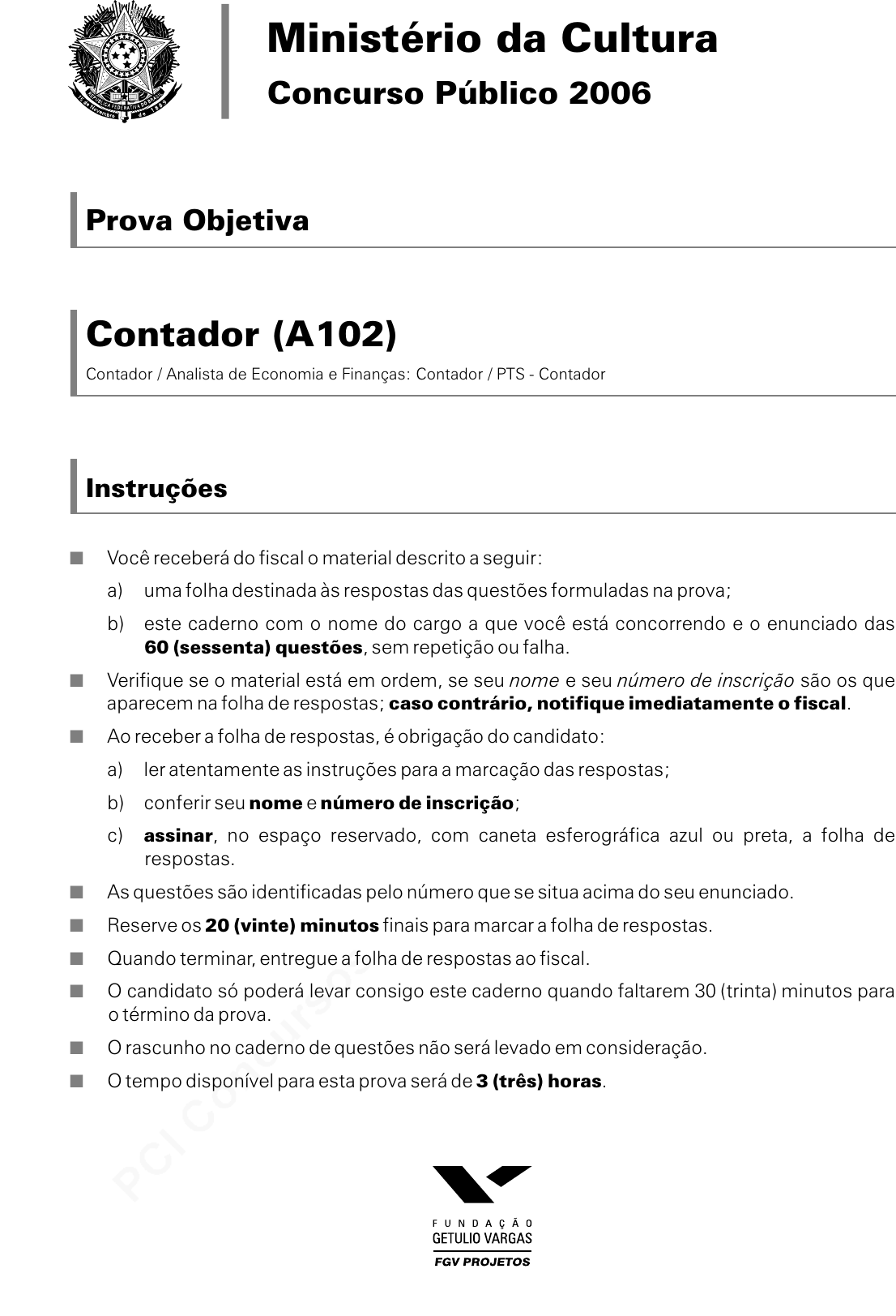 pcimarkpci MDAwMDowMDAwOjAwMDA6MDAwMDowMDAwOmZmZmY6MzZlOTpjMjU5:VGh1LCAxNiBTZXAgMjAyMSAxNToxNDo0NCAtMDMwMA== Prova Objetiva Contador (A102) Contador / Analista de Economia e Finanças: Contador / PTS - Contador Ministério da Cultura Concurso Público 2006 Instruções � � � � � � � � � Você receberá do fiscal o material descrito a seguir: a) uma folha destinada às respostas das questões formuladas na prova; b) este caderno com o nome do cargo a que você está concorrendo e o enunciado das , sem repetição ou falha. Verifique se o material está em ordem, se seu e seu são os que aparecem na folha de respostas; . Ao receber a folha de respostas, é obrigação do candidato: c) , no espaço reservado, com caneta esferográfica azul ou preta, a folha de respostas. As questões são identificadas pelo número que se situa acima do seu enunciado. Reserve os finais para marcar a folha de respostas. Quando terminar, entregue a folha de respostas ao fiscal. O rascunho no caderno de questões não será levado em consideração. O tempo disponível para esta prova será de . 60 (sessenta) questões caso contrário, notifique imediatamente o fiscal assinar 20 (vinte) minutos 3 (três) horas nome número de inscrição a) ler atentamente as instruções para a marcação das respostas; b) conferir seu e ; O candidato só poderá levar consigo este caderno quando faltarem 30 (trinta) minutos para o término da prova. nome número de inscrição pcimarkpci MDAwMDowMDAwOjAwMDA6MDAwMDowMDAwOmZmZmY6MzZlOTpjMjU5:VGh1LCAxNiBTZXAgMjAyMSAxNToxNDo0NCAtMDMwMA== pcimarkpci MDAwMDowMDAwOjAwMDA6MDAwMDowMDAwOmZmZmY6MzZlOTpjMjU5:VGh1LCAxNiBTZXAgMjAyMSAxNToxNDo0NCAtMDMwMA== Concurso Público 2006 | 3 MinC – Ministério da Cultura PORTUGUÊS Texto I Casa da Leitura Chico Mendes (*Eliana Yunes) Pense num bairro de periferia, numa rua ainda de barro, numa pré-escola de terra batida, sob um teto de amianto que já foi abrigo de aves, mas imagine uma vizinhança de gente simpática, prestimosa, desejosa de novos horizontes na vida e você localiza em Rio Branco, no bairro Chico Mendes, uma rua Gregório Filho, cruzamento com a rua do Angico, onde foi inaugurada a segunda Casa de Leitura da capital. A Casa de Leitura Chico Mendes, cuidada como se fosse uma casa de encantamentos, tem cerca, canteiros verdes, goiabeiras e cupuaçuzeiro; a partir de hoje tem dez novas seringueiras que em 15 anos vão estar chovendo sementes no quintal, como hoje, as do Theatro Helio Melo. Uma varanda aberta, acolhedora, envolve a casinha de madeira reformada, com cortinas de chita nas janelas e cadeira de vime ao lado das redes de balanço coloridas. Pepetas no beiral anunciam para a criançada que ali mora a liberdade de voar... com o pensamento! No único salãozinho de leitura, uma roda central em tronco grosso de madeira pende como um candelabro, baixo, ao alcance das mãos e olhos ávidos, curiosos, remexendo o acervo dos livros expostos... Nos cantos, troncos naturais polidos e cortados sustentam outras coleções como mesas de apoio, enquanto os muito pequenos, sentados lado a lado em esteiras de palha de bananeira, rolam as páginas coloridas. Na pirâmide de caixotes em que se guardam os livros, culmina uma miniatura da casa de Chico Mendes em Xapuri. Do outro lado sua foto, sorridente, vivo, dialoga com suas imagens do primeiro Prêmio Chico Mendes de Cultura. Uma sala com Internet convida os jovens a outras leituras, com CDs, música e plástica. Foi comovente acompanhar o hasteamento das bandeiras, por um senador da República, Tião Viana, pela presidente do Comitê Chico Mendes e pela diretora da Associação de Moradores, sob as vozes e batuque das crianças do Som da Floresta. O mate gelado corria sem pressa, e os vizinhos, convidados e imprensa se misturavam para ouvir histórias, receber a bênção e acompanhar os brevíssimos discursos. Antes de começar a festa, os vizinhos já tinham tomado conta da Casa, na alegria deste sinal de vida nova... Esse exemplo de união pela cidadania deveria mover muitas vezes o poder público, o empresariado, os artistas e a comunidade para semear Casas da Leitura pelo Acre como seringueiras e castanheiras. (*Eliana Yunes é idealizadora e primeira coordenadora do PROLER – Programa Nacional de Leitura / Fundação Biblioteca Nacional.) (Fonte: http://www.ac.gov.br/secom/noticias/jan2005/n01_25jan2005.html. Acesso em 19/03/2006) 1 Dentre as alternativas a seguir, uma não exerce papel adjetivo no texto I. Assinale-a. (A) de periferia (L.1) (B) de barro (L.1) (C) segunda (L.7) (D) com Internet (L.29) (E) convidados (L.36) 2 No vocábulo pré-escola (L.2), o prefixo pré mantém-se separado por hífen. Assinale a alternativa cuja palavra, contendo esse mesmo prefixo, não tenha sido grafada na forma preferida atualmente. (A) preestabelecer (B) predeterminar (C) pré-estréia (D) pré-existência (E) pré-matrícula 3 Assinale a alternativa que relacione corretamente os parágrafos à natureza textual predominante. PARÁGRAFOS 2º 3º 4º 5º 6º (A) dissertativo dissertativo dissertativo narrativo descritivo (B) descritivo descritivo descritivo narrativo dissertativo (C) narrativo dissertativo descritivo descritivo narrativo (D) descritivo narrativo narrativo descritivo dissertativo (E) dissertativo descritivo narrativo dissertativo descritivo 4 "Pense num bairro de periferia, (...) mas imagine uma vizinhança de gente simpática, (...) e você localiza em Rio Branco (...)" (L.1-5) Assinale a alternativa em que, passando-se a forma você para vós, as alterações foram efetuadas seguindo a norma culta. (A) Pensais num bairro de periferia, (...) mas imaginais uma vizinhança de gente simpática, (...) e vós localizais em Rio Branco (...) (B) Pensai num bairro de periferia, (...) mas imaginai uma vizinhança de gente simpática, (...) e vós localizai em Rio Branco (...) (C) Penseis num bairro de periferia, (...) mas imagineis uma vizinhança de gente simpátic
