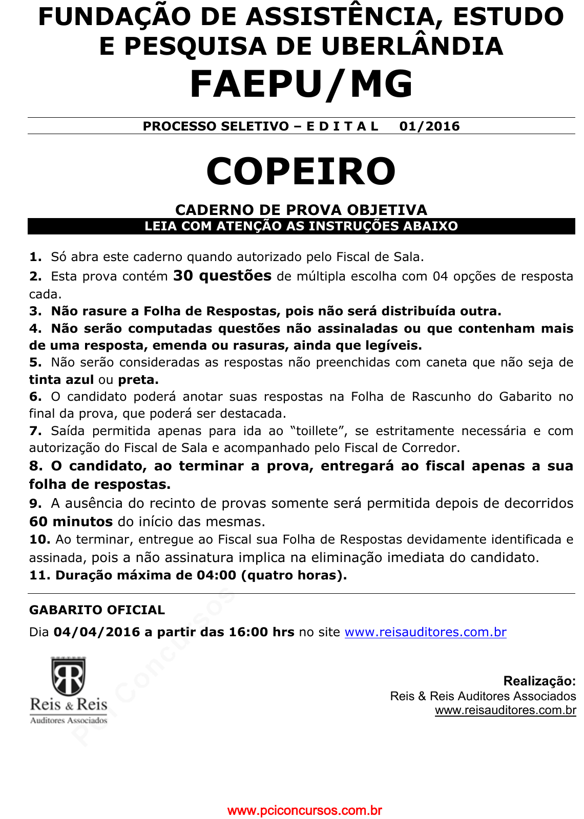 pcimarkpci MDAwMDowMDAwOjAwMDA6MDAwMDowMDAwOmZmZmY6MzZlOTpjMjU5:VGh1LCAxNiBTZXAgMjAyMSAxNjoxMjo1MyAtMDMwMA== FUNDAÇÃO DE ASSISTÊNCIA, ESTUDO E PESQUISA DE UBERLÂNDIA FAEPU/MG PROCESSO SELETIVO – E D I T A L 01/2016 COPEIRO CADERNO DE PROVA OBJETIVA LEIA COM ATENÇÃO AS INSTRUÇÕES ABAIXO 1. Só abra este caderno quando autorizado pelo Fiscal de Sala. 2. Esta prova contém 30 questões de múltipla escolha com 04 opções de resposta cada. 3. Não rasure a Folha de Respostas, pois não será distribuída outra. 4. Não serão computadas questões não assinaladas ou que contenham mais de uma resposta, emenda ou rasuras, ainda que legíveis. 5. Não serão consideradas as respostas não preenchidas com caneta que não seja de tinta azul ou preta. 6. O candidato poderá anotar suas respostas na Folha de Rascunho do Gabarito no final da prova, que poderá ser destacada. 7. Saída permitida apenas para ida ao “toillete”, se estritamente necessária e com autorização do Fiscal de Sala e acompanhado pelo Fiscal de Corredor. 8. O candidato, ao terminar a prova, entregará ao fiscal apenas a sua folha de respostas. 9. A ausência do recinto de provas somente será permitida depois de decorridos 60 minutos do início das mesmas. 10. Ao terminar, entregue ao Fiscal sua Folha de Respostas devidamente identificada e assinada, pois a não assinatura implica na eliminação imediata do candidato. 11. Duração máxima de 04:00 (quatro horas). GABARITO OFICIAL Dia 04/04/2016 a partir das 16:00 hrs no site www.reisauditores.com.br Realização: Reis & Reis Auditores Associados www.reisauditores.com.br www.pciconcursos.com.br pcimarkpci MDAwMDowMDAwOjAwMDA6MDAwMDowMDAwOmZmZmY6MzZlOTpjMjU5:VGh1LCAxNiBTZXAgMjAyMSAxNjoxMjo1MyAtMDMwMA== 2 PROVA Nº 01 – PORTUGUÊS FUNDAMENTAL INCOMPLETO Leia o texto abaixo e responda às questões de 01 a 03. A GUERRA DA HIGIENE Se você pensa que a única guerra que seu corpo precisa enfrentar é contra as bactérias que causam as cáries, comece a se preparar! Existem muitas doenças que aparecem por causa da falta de higiene. Quantas vezes você já ouviu aquela famosa frase: "Já lavou as mãos antes de comer?". E aquela outra: "Não tome água sem filtrar!". São coisas que a gente já está careca de saber, mas nem sempre dá muita atenção. Se você imaginasse o que uma simples e asquerosa mosca é capaz de fazer com a sua comida, você ia lavar tudo rapidinho! Só que higiene não é só o cuidado com o corpo, não. Muita gente no Brasil pega doenças por falta de saneamento básico, ou seja, uma rede de esgotos decente, água encanada e coleta de lixo. Sem saneamento básico e sem dar a menor bola para a limpeza do corpo, da comida e até da nossa casa, fica muito difícil ganhar a guerra da higiene contra um monte de doenças. E para enfrentar essa guerra, o negócio é conhecer direito o inimigo! Se a gente bobear, eles estão sempre filando uma bóia! Tem sempre algum bicão querendo abocanhar uma parte do nosso rango. Se a gente não souber cuidar da comida e guardá-la direitinho, esses intrusos fazem a festa. E o pior de tudo: além de não serem convidados, eles ainda fazem a gente ficar doente! Eles são o esverdeado bolor, a asquerosa mosca e os micróbios. É mais difícil de acreditar nas coisas que a gente não vê, não é mesmo? Pois fique atento: os micróbios, apesar de serem invisíveis, são os nossos piores inimigos e estão em toda parte. Existem alguns que são inofensivos, mas também existem aqueles que não perdoam, deixam muita gente doente e podem até matar. Com esses, todo cuidado é pouco! Uma das únicas maneiras de evitar que os micróbios ataquem nosso corpo é uma higiene nota dez: lavar muito bem as mãos, filtrar e ferver sempre a água, lavar com cuidado todos os alimentos. 01) Marque a alternativa INCORRETA sobre o texto: a) Alguns micróbios são inofensivos, mas outros podem até matar; b) Devemos tomar água filtrada; c) A falta de saneamento básico pode provocar doenças; d) A higiene é só o cuidado com o corpo; 02) Os micróbios são: a) Invisíveis; b) Palpáveis; c) Perceptíveis; d) Evidentes. www.pciconcursos.com.br pcimarkpci MDAwMDowMDAwOjAwMDA6MDAwMDowMDAwOmZmZmY6MzZlOTpjMjU5:VGh1LCAxNiBTZXAgMjAyMSAxNjoxMjo1MyAtMDMwMA== 3 03) “Se a gente bobear, eles estão sempre filando uma bóia!” Essa frase do texto se refere: a) A rede de esgotos; b) As pessoas que são penetras nas festas; c) O esverdeado bolor, a asquerosa mosca e os micróbios; d) As bactérias que causam as cáries. Interprete os quadrinhos abaixo e responda a questão nº 04 04) O garoto dos quadrinhos colocou o porquinho na esteira porque? a) Queria que ele ganhasse a corrida dos porquinhos; b) Não queria que ele tivesse o mesmo destino do outro, ser assado para refeição; c) Queria que ele ficasse forte como o outro porco; d) Não queria que ele ficasse obeso e cansado como o outro. 05) Marque a alternativa que a palavra não está no masculino: a) Barraco; b) Computador; c) Torradeira; d) Sorvete. 06) Marque a alternativa em que a palavra não é escrita com ç: a) Alvoro__o; b) Deten__ão; c) Do__ura; d) Demi__ão. 07) Marque a alternativa em que a palavra é escrita com g: a) Ti_ela; b) Can_ica; c) Ma_estade; d) _iló. www.pciconcursos.com.br pcimarkpci MDAwMDowMDAwOjAwMDA6MDAwMDowMDAwOmZmZmY6MzZlOTpjMjU5:VGh1LCAxNiBTZXAgMjAyMSAxNjoxMjo1MyAtMDMwMA== 4 08) Marque a alternativa onde há ERRO de acentuação: a) Túnel; b) Bálsamo; c) Abobóra; d) Trapézio. 09) Os antônimos de bom e terminar são respectivamente: a) Mau – acabar; b) Mau – começar; c) Mal – voltar; d) Mal – iniciar. 10) Marque a alternativa em que a pontuação está CORRETA: a) Ela, comprou lápis borracha e caneta para fazer a prova. b) O Daniel ex-integrante, da comissão veio assistir, à; reunião. c) Juliana a aluna, destaque passou, no vestibular! d) Estas crianças, com certeza, serão aprovadas. PROVA Nº 02 – MATEMÁTICA FUNDAMENTAL INCOMPLET