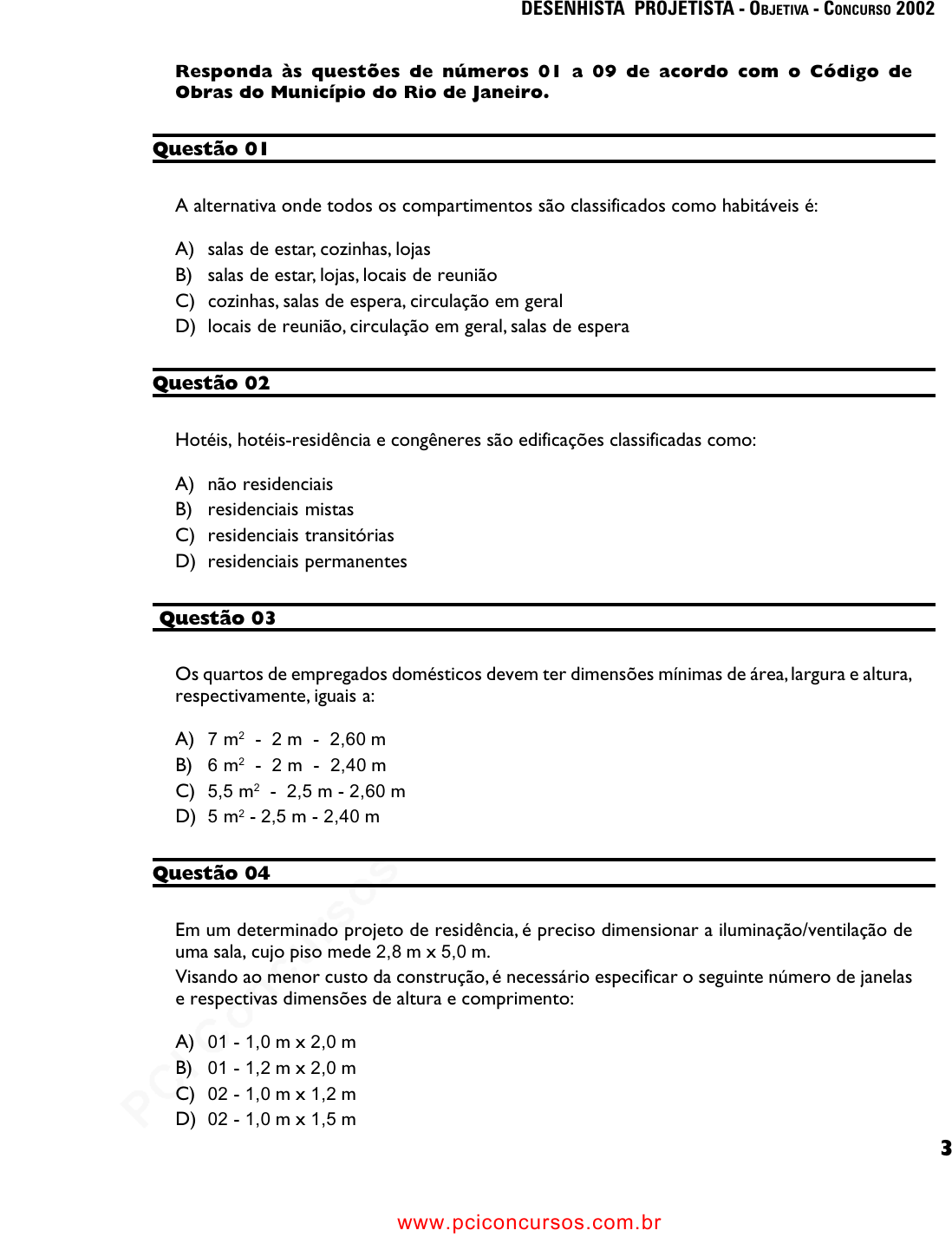 pcimarkpci MDAwMDowMDAwOjAwMDA6MDAwMDowMDAwOmZmZmY6MzZlOTpjMjU5:VGh1LCAxNiBTZXAgMjAyMSAxODozODoyMyAtMDMwMA== 3 DESENHISTA PROJETISTA - OBJETIVA - CONCURSO 2002 Responda às questões de números 01 a 09 de acordo com o Código de Obras do Município do Rio de Janeiro. Questão 01 A alternativa onde todos os compartimentos são classificados como habitáveis é: A) salas de estar, cozinhas, lojas B) salas de estar, lojas, locais de reunião C) cozinhas, salas de espera, circulação em geral D) locais de reunião, circulação em geral, salas de espera Questão 02 Hotéis, hotéis-residência e congêneres são edificações classificadas como: A) não residenciais B) residenciais mistas C) residenciais transitórias D) residenciais permanentes Questão 03 Os quartos de empregados domésticos devem ter dimensões mínimas de área, largura e altura, respectivamente, iguais a: A) 7 m2 - 2 m - 2,60 m B) 6 m2 - 2 m - 2,40 m C) 5,5 m2 - 2,5 m - 2,60 m D) 5 m2 - 2,5 m - 2,40 m Questão 04 Em um determinado projeto de residência, é preciso dimensionar a iluminação/ventilação de uma sala, cujo piso mede 2,8 m x 5,0 m. Visando ao menor custo da construção, é necessário especificar o seguinte número de janelas e respectivas dimensões de altura e comprimento: A) 01 - 1,0 m x 2,0 m B) 01 - 1,2 m x 2,0 m C) 02 - 1,0 m x 1,2 m D) 02 - 1,0 m x 1,5 m www.pciconcursos.com.br pcimarkpci MDAwMDowMDAwOjAwMDA6MDAwMDowMDAwOmZmZmY6MzZlOTpjMjU5:VGh1LCAxNiBTZXAgMjAyMSAxODozODoyMyAtMDMwMA== 4 DESENHISTA PROJETISTA - OBJETIVA - CONCURSO 2002 Questão 05 As inclinações mínimas das águas do telhado são definidas pelo tipo do material e formato das telhas. No caso de telha de cerâmica tipo canal ou colonial, a inclinação mínima deverá ter um percentual de: A) 5% B) 10% C) 25% D) 40% Questão 06 A distância mínima entre a edificação e o alinhamento é denominada afastamento do tipo: A) frontal B) lateral C) posterior D) longitudinal Questão 07 Para representação dos cortes do projeto arquitetônico, é utilizada a seguinte escala: A) 1:10 B) 1:20 C) 1:50 D) 1:75 Questão 08 As rampas de uso coletivo para pedestres não poderão ter largura inferior a 1,20 m e sua inclinação máxima terá um percentual de: A) 10% B) 20% C) 30% D) 40% www.pciconcursos.com.br pcimarkpci MDAwMDowMDAwOjAwMDA6MDAwMDowMDAwOmZmZmY6MzZlOTpjMjU5:VGh1LCAxNiBTZXAgMjAyMSAxODozODoyMyAtMDMwMA== 5 DESENHISTA PROJETISTA - OBJETIVA - CONCURSO 2002 Questão 09 As escadas para uso coletivo terão largura mínima livre de: A) 0,80 m B) 1,00 m C) 1,20 m D) 1,50 m Responda às questões de números 10 a 15 de acordo com o Programa Autocad R14. Questão 10 Para transformar blocos, polylines e hachuras em linhas individuais, utiliza-se o seguinte comando: A) COPY B) SCALE C) EXPLODE D) TRANSFORMER Questão 11 Para efetuar o desenho de um segmento de reta, com precisão, por meio de coordenadas relativas polares, o comando correto é: A) @ (o valor de X), (o valor de Y) B) @ (o valor de Z), (o valor de X) C) @ (o ângulo desejado) > (a dimensão do segmento de reta) D) @ (a dimensão do segmento de reta) < (o ângulo desejado) Questão 12 O comando utilizado para travar ou destravar uma layer selecionada é: A) LOCK B) PEDIT C) BLOCK D) HATCH www.pciconcursos.com.br pcimarkpci MDAwMDowMDAwOjAwMDA6MDAwMDowMDAwOmZmZmY6MzZlOTpjMjU5:VGh1LCAxNiBTZXAgMjAyMSAxODozODoyMyAtMDMwMA== 6 DESENHISTA PROJETISTA - OBJETIVA - CONCURSO 2002 Questão 13 Durante a execução de um comando de edição, ao selecionar a entidade com uma janela da direita para a esquerda, o usuário está aplicando o comando denominado: A) LIMITS B) MODIFY C) WINDOW D) CROSSING Questão 14 O comando redo, quando ativado, tem como objetivo: A) executar a limpeza dos blips da tela B) selecionar entidades através de janelas C) desfazer o último comando undo executado D) inverter os comandos realizados através do teclado Questão 15 A ferramenta que garante a escolha de pontos notáveis de entidades, com precisão, é denominada: A) SCALE B) OFFSET C) STRETCH D) OBJECT SNAP Questão 16 A lâmpada que não utiliza filamento metálico para produzir energia luminosa é caracterizada como: A) negra B) halógena C) fluorescente D) incandescente www.pciconcursos.com.br pcimarkpci MDAwMDowMDAwOjAwMDA6MDAwMDowMDAwOmZmZmY6MzZlOTpjMjU5:VGh1LCAxNiBTZXAgMjAyMSAxODozODoyMyAtMDMwMA== 7 DESENHISTA PROJETISTA - OBJETIVA - CONCURSO 2002 Questão 17 A relação entre a projeção horizontal de uma edificação e a área do terreno é denominada: A) zona de projeção B) taxa de ocupação C) área total construída D) índice de aproveitamento Questão 18 Nas instalações hidráulicas, quando a água, ao descer pela tubulação, com velocidade elevada, é bruscamente interrompida, provoca um fenômeno denominado: A) golpe de aríete B) pressão estática C) rompimento do fecho hídrico D) estrangulamento da tubulação Questão 19 Para evitar o transbordamento de água de um reservatório, utiliza-se a seguinte canalização: A) ramal B) barrilete C) extravasor D) sub-ramais Questão 20 Em projetos de instalações de esgoto sanitário, a tubulação secundária é representada pela simbologia indicada em: A) →→→→→→→→→ B) C) . . . . . . . . . . . . . . . . . D) __ __ __ __ __ __ __ __ . . __ . . ____ . . www.pciconcursos.com.br pcimarkpci MDAwMDowMDAwOjAwMDA6MDAwMDowMDAwOmZmZmY6MzZlOTpjMjU5:VGh1LCAxNiBTZXAgMjAyMSAxODozODoyMyAtMDMwMA== 8 DESENHISTA PROJETISTA - OBJETIVA - CONCURSO 2002 Questão 21 A simbologia utilizada para o desenho de canalizações destinadas ao combate de incêndio é: A) B) C) D) Questão 22 Para demonstrar a tubulação de abastecimento de água de um compartimento, na vertical e na horizontal simultaneamente, utiliza-se a perspectiva do tipo: A) cônica B) cavaleira C) trimétrica D) isométrica Questão 23 De acordo com a NBR 5410, em instalações elétricas residenciais, a seção mínima dos condutores para iluminação deverá ser, em mm2, i