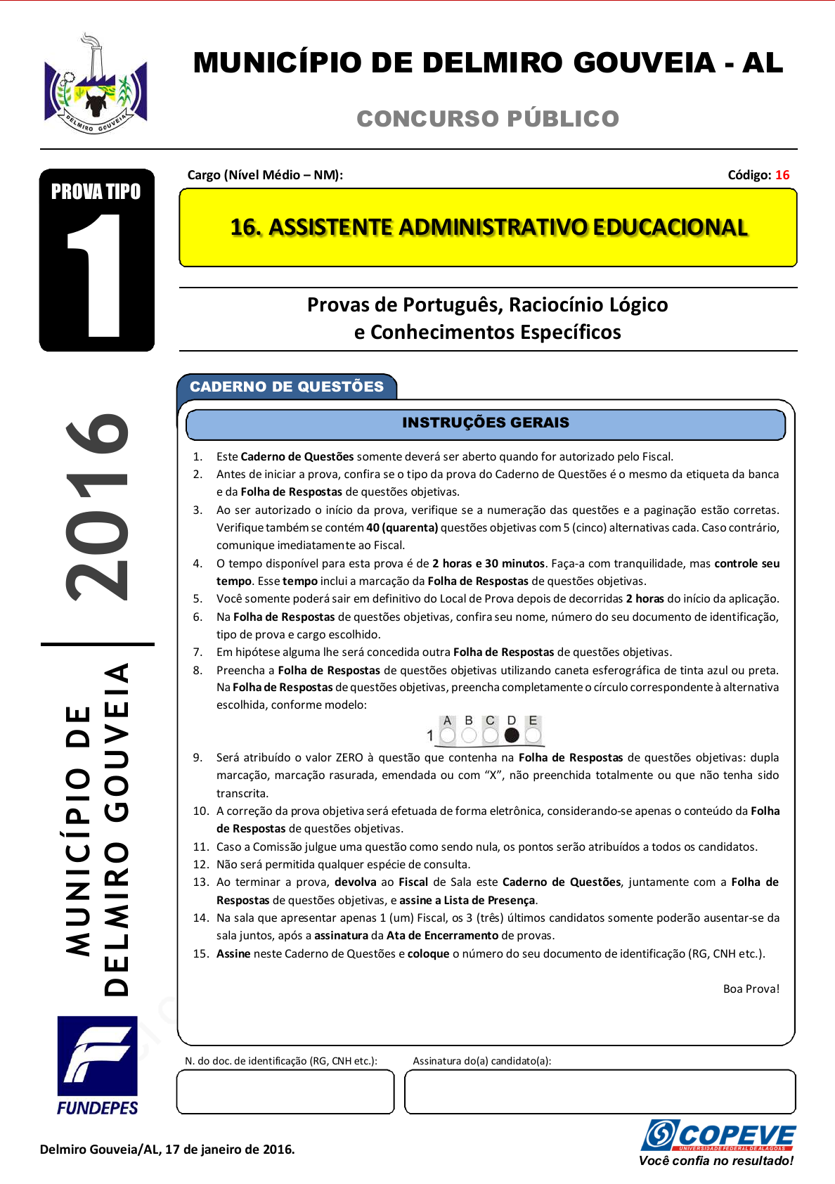 pcimarkpci MDAwMDowMDAwOjAwMDA6MDAwMDowMDAwOmZmZmY6MzZlOTpjMjU5:RnJpLCAxNyBTZXAgMjAyMSAyMjo1OTo1NyAtMDMwMA== 16. ASSISTENTE ADMINISTRATIVO EDUCACIONAL MUNICÍPIO DE DELMIRO GOUVEIA - AL CONCURSO PÚBLICO Cargo (Nível Médio – NM): Código: 16 Provas de Português, Raciocínio Lógico e Conhecimentos Específicos N. do doc. de identificação (RG, CNH etc.): Assinatura do(a) candidato(a): Você confia no resultado! Delmiro Gouveia/AL, 17 de janeiro de 2016. M U N IC ÍP IO D E D E L M IR O G O U V E IA 2 0 1 6 1 PROVA TIPO CADERNO DE QUESTÕES 1. Este Caderno de Questões somente deverá ser aberto quando for autorizado pelo Fiscal. 2. Antes de iniciar a prova, confira se o tipo da prova do Caderno de Questões é o mesmo da etiqueta da banca e da Folha de Respostas de questões objetivas. 3. Ao ser autorizado o início da prova, verifique se a numeração das questões e a paginação estão corretas. Verifique também se contém 40 (quarenta) questões objetivas com 5 (cinco) alternativas cada. Caso contrário, comunique imediatamente ao Fiscal. 4. O tempo disponível para esta prova é de 2 horas e 30 minutos. Faça-a com tranquilidade, mas controle seu tempo. Esse tempo inclui a marcação da Folha de Respostas de questões objetivas. 5. Você somente poderá sair em definitivo do Local de Prova depois de decorridas 2 horas do início da aplicação. 6. Na Folha de Respostas de questões objetivas, confira seu nome, número do seu documento de identificação, tipo de prova e cargo escolhido. 7. Em hipótese alguma lhe será concedida outra Folha de Respostas de questões objetivas. 8. Preencha a Folha de Respostas de questões objetivas utilizando caneta esferográfica de tinta azul ou preta. Na Folha de Respostas de questões objetivas, preencha completamente o círculo correspondente à alternativa escolhida, conforme modelo: 9. Será atribuído o valor ZERO à questão que contenha na Folha de Respostas de questões objetivas: dupla marcação, marcação rasurada, emendada ou com “X”, não preenchida totalmente ou que não tenha sido transcrita. 10. A correção da prova objetiva será efetuada de forma eletrônica, considerando-se apenas o conteúdo da Folha de Respostas de questões objetivas. 11. Caso a Comissão julgue uma questão como sendo nula, os pontos serão atribuídos a todos os candidatos. 12. Não será permitida qualquer espécie de consulta. 13. Ao terminar a prova, devolva ao Fiscal de Sala este Caderno de Questões, juntamente com a Folha de Respostas de questões objetivas, e assine a Lista de Presença. 14. Na sala que apresentar apenas 1 (um) Fiscal, os 3 (três) últimos candidatos somente poderão ausentar-se da sala juntos, após a assinatura da Ata de Encerramento de provas. 15. Assine neste Caderno de Questões e coloque o número do seu documento de identificação (RG, CNH etc.). Boa Prova! INSTRUÇÕES GERAIS pcimarkpci MDAwMDowMDAwOjAwMDA6MDAwMDowMDAwOmZmZmY6MzZlOTpjMjU5:RnJpLCAxNyBTZXAgMjAyMSAyMjo1OTo1NyAtMDMwMA== NM – 16. ASSISTENTE ADMINISTRATIVO EDUCACIONAL Município de Delmiro Gouveia - Alagoas Concurso Público 2016 Prova tipo 1 1 17 jan. 2016 PORTUGUÊS QUESTÃO 01 ________________________________ Disponível em: <https://www.google.com.br/>. Acesso em: 09 dez. 2015. O se usado no segundo quadrinho pertence a categoria gramatical de A) pronome pessoal oblíquo, indicando reciprocidade. B) conjunção subordinativa integrante e mero conectivo. C) conjunção subordinativa condicional e mero conectivo. D) pronome pessoal oblíquo e é indicador de indeterminação do sujeito. E) pronome pessoal oblíquo, exercendo função de partícula apassivadora. QUESTÃO 02 ________________________________ Disponível em: <http://buritisonline.com.br/geral/saude/buritis-abre-campanha-de-vacinacao-contra-gripe>. Acesso em: 30 nov. 2015. A função da linguagem predominante na campanha publicitária de vacinação da figura tem o objetivo de A) expor. B) educar. C) sugerir. D) lembrar. E) convencer. QUESTÃO 03 ________________________________ Considerando as regras de uso dos pronomes este , esse e aquele (e variações), assinale a alternativa que apresenta o uso adequado do(s) pronome(s) demonstrativo(s). A) Este senhor de terno, no fim da sala, é meu avô. B) Essa calça que estou usando está muito apertada. C) Transparência pública e cortes orçamentários: estes foram os assuntos da última assembleia. D) Filosofia e Matemática me fascinam: essa me desenvolve o raciocínio concreto, aquela o abstrato. E) Os assuntos da próxima reunião serão estes : aprovação do plano de cargo e carreira dos servidores e licitação para concurso público. QUESTÃO 04 _______________________________ O outro Ele queria muito ser eleito. Não: ele precisava muito ser eleito. Estava atrás de um emprego que lhe desse um bom salário, mordomias e verbas para gastar na contratação de assessores – além, claro, das múltiplas oportunidades que, como vereador, teria. O problema era arrumar votos. Não tinha amigos, não era conhecido, nem sequer recebera um apelido pitoresco que pudesse usar na propaganda. Mas o pior não era isso. O pior é que combinava um visual péssimo – baixinho, gordinho, careca – com uma congênita inabilidade para falar em público. Em desespero, resolveu procurar um marqueteiro. Estava disposto a gastar uma boa grana nisso, desde que pudesse garantir a eleição. O marqueteiro, famoso, exigiu honorários salgados , mas garantiu resultados. Que de fato, não se fizeram esperar. Em poucas semanas o candidato era outro. Mais magro, mais alto (saltos especiais) com uma bela peruca, parecia agora um galã de novela. Além disso se transformara num fantástico orador, um orador capaz de galvanizar o público com uma única frase. [...] SCLIAR, Moacyr.O imaginário cotidiano. São Paulo: Gaia, 2006. Dentre os vocábulos destacados no texto, qual deles foi empregado em sentido figurado? A) Mordomias. B) Congênita. C) Pitoresco. D