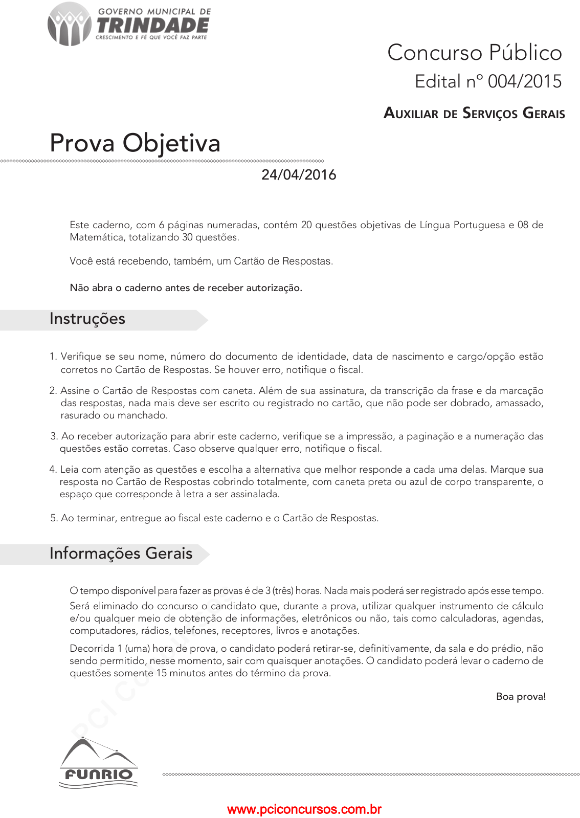 pcimarkpci MDAwMDowMDAwOjAwMDA6MDAwMDowMDAwOmZmZmY6MzZlOTpjMjU5:U2F0LCAxOCBTZXAgMjAyMSAxMzozODo1NCAtMDMwMA== AuxiliAr de ServiçoS GerAiS Concurso Público Edital nº 004/2015 Prova Objetiva 24/04/2016 Boa prova! Este caderno, com 6 páginas numeradas, contém 20 questões objetivas de Língua Portuguesa e 08 de Matemática, totalizando 30 questões. Você está recebendo, também, um Cartão de Respostas. Não abra o caderno antes de receber autorização. Instruções 1. Verifique se seu nome, número do documento de identidade, data de nascimento e cargo/opção estão corretos no Cartão de Respostas. Se houver erro, notifique o fiscal. 2. Assine o Cartão de Respostas com caneta. Além de sua assinatura, da transcrição da frase e da marcação das respostas, nada mais deve ser escrito ou registrado no cartão, que não pode ser dobrado, amassado, rasurado ou manchado. 3. Ao receber autorização para abrir este caderno, verifique se a impressão, a paginação e a numeração das questões estão corretas. Caso observe qualquer erro, notifique o fiscal. 4. Leia com atenção as questões e escolha a alternativa que melhor responde a cada uma delas. Marque sua resposta no Cartão de Respostas cobrindo totalmente, com caneta preta ou azul de corpo transparente, o espaço que corresponde à letra a ser assinalada. 5. Ao terminar, entregue ao fiscal este caderno e o Cartão de Respostas. Informações Gerais O tempo disponível para fazer as provas é de 3 (três) horas. Nada mais poderá ser registrado após esse tempo. Será eliminado do concurso o candidato que, durante a prova, utilizar qualquer instrumento de cálculo e/ou qualquer meio de obtenção de informações, eletrônicos ou não, tais como calculadoras, agendas, computadores, rádios, telefones, receptores, livros e anotações. Decorrida 1 (uma) hora de prova, o candidato poderá retirar-se, definitivamente, da sala e do prédio, não sendo permitido, nesse momento, sair com quaisquer anotações. O candidato poderá levar o caderno de questões somente 15 minutos antes do término da prova. www.pciconcursos.com.br pcimarkpci MDAwMDowMDAwOjAwMDA6MDAwMDowMDAwOmZmZmY6MzZlOTpjMjU5:U2F0LCAxOCBTZXAgMjAyMSAxMzozODo1NCAtMDMwMA== www.pciconcursos.com.br pcimarkpci MDAwMDowMDAwOjAwMDA6MDAwMDowMDAwOmZmZmY6MzZlOTpjMjU5:U2F0LCAxOCBTZXAgMjAyMSAxMzozODo1NCAtMDMwMA== Concurso Público - Auxiliar de Serviços Gerais PREFEITURA MUNICIPAL DE TRINDADE/GO - EDITAL Nº 004/2015 3 AçúcAr O açúcar refinado comum não é necessário na alimentação porque existem outras fontes mais saudáveis. O ideal é escolher outros tipos: o mascavo ou o orgânico. Apesar disso, eles custam mais caro e adoçam menos. g1.globo.com/bemestar Texto I criancaeconsumo.org.br Texto II O trecho acima foi retirado do seguinte tipo de texto: (A) lei (B) poema (C) recado (D) profecia (E) reportagem 01Questão O ideal é escolher outros tipos. Essa frase indica uma: (A) piada (B) ordem (C) mentira (D) sugestão (E) pergunta 04Questão Na frase O ideal é escolher outros tipos, a palavra ideal é sinônimo de: (A) ilegal (B) desastroso (C) impossível (D) obrigatório (E) recomendado 05Questão Em comparação com o açúcar refinado comum, o açúcar mascavo é descrito no texto I como: (A) mais forte (B) mais barato (C) menos doce (D) mais amargo (E) menos gostoso 06Questão A principal dúvida da personagem é sobre a seguinte ação: (A) obedecer a seus pais (B) jogar o papel no chão (C) comprar uma bolsa nova (D) calçar seus sapatos novos (E) voltar para casa antes da chuva 10Questão O assunto principal do texto I é: (A) esporte (B) política (C) religião (D) educação (E) alimentação 02Questão Segundo o texto I, o açúcar refinado comum pode ser: (A) imposto (B) falsificado (C) substituído (D) encarecido (E) fundamental 03Questão Ao falar sobre o açúcar mascavo e o orgânico, a expressão Apesar disso transmite uma ideia de: (A) necessidade (B) desvantagem (C) brincadeira (D) inverdade (E) confissão 07Questão A última frase do texto I sugere que as pessoas escolhem alimentos considerando, além do sabor, também a seguinte característica: (A) cor (B) preço (C) origem (D) tamanho (E) embalagem 08Questão A partir do texto I, o leitor percebe que o açúcar refinado comum é: (A) pouco utilizado (B) melhor fonte de energia (C) distribuído gratuitamente (D) mais barato que outros tipos (E) indispensável na alimentação 09Questão LínguA PortuguesA www.pciconcursos.com.br pcimarkpci MDAwMDowMDAwOjAwMDA6MDAwMDowMDAwOmZmZmY6MzZlOTpjMjU5:U2F0LCAxOCBTZXAgMjAyMSAxMzozODo1NCAtMDMwMA== PREFEITURA MUNICIPAL DE TRINDADE/GO - EDITAL Nº 004/2015 Concurso Público - Auxiliar de Serviços Gerais4 LínguA PortuguesA No último quadrinho, a personagem da história está: (A) nervosa porque perdeu seus sapatos (B) chateada porque não encontrou sua bolsa (C) cansada porque correu muito durante o dia (D) triste porque não encontrou outras pessoas (E) feliz porque encontrou uma solução para o seu problema 11Questão O título Agindo pelo meio ambiente é reforçado pela seguinte intenção da personagem: (A) querer proteger a natureza (B) não se importar com o lixo (C) querer prejudicar a natureza (D) decidir jogar o papel no chão (E) ir embora e deixar o papel no chão 12Questão Uma ação da personagem que demonstra sua preocupação com o meio ambiente é: (A) sujar a rua (B) jogar o papel no chão (C) usar roupas recicladas (C) gritar com seus amigos (E) levar o papel para jogar na lixeira 13Questão A personagem acha que seu papel não irá prejudicar o meio ambiente porque é um papel: (A) usado (B) molhado (C) pequeno (D) reciclado (E) amassado 14Questão Ao final da história, a personagem demonstra ser uma menina: (A) brava (B) irritada (C) insensível (D) consciente (E) mal educada 16Questão A reação final de Mutum indica que seu choro era: (A) fingido (B) raivoso (C) covarde (D) constante (E) verdadeiro 19Questão Ei, Mutum, está chor