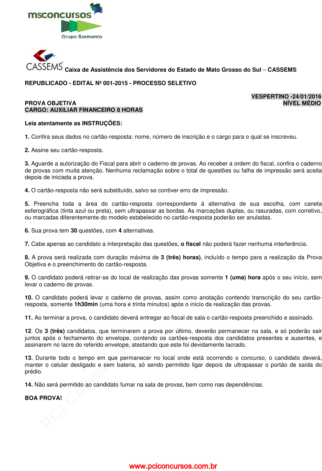 pcimarkpci MDAwMDowMDAwOjAwMDA6MDAwMDowMDAwOmZmZmY6MzZlOTpjMjU5:U2F0LCAxOCBTZXAgMjAyMSAxNjowMjowNiAtMDMwMA== Caixa de Assistência dos Servidores do Estado de Mato Grosso do Sul – CASSEMS REPUBLICADO - EDITAL Nº 001-2015 - PROCESSO SELETIVO VESPERTINO -24/01/2016 PROVA OBJETIVA NÍVEL MÉDIO CARGO: AUXILIAR FINANCEIRO 8 HORAS Leia atentamente as INSTRUÇÕES: 1. Confira seus dados no cartão-resposta: nome, número de inscrição e o cargo para o qual se inscreveu. 2. Assine seu cartão-resposta. 3. Aguarde a autorização do Fiscal para abrir o caderno de provas. Ao receber a ordem do fiscal, confira o caderno de provas com muita atenção. Nenhuma reclamação sobre o total de questões ou falha de impressão será aceita depois de iniciada a prova. 4. O cartão-resposta não será substituído, salvo se contiver erro de impressão. 5. Preencha toda a área do cartão-resposta correspondente à alternativa de sua escolha, com caneta esferográfica (tinta azul ou preta), sem ultrapassar as bordas. As marcações duplas, ou rasuradas, com corretivo, ou marcadas diferentemente do modelo estabelecido no cartão-resposta poderão ser anuladas. 6. Sua prova tem 30 questões, com 4 alternativas. 7. Cabe apenas ao candidato a interpretação das questões, o fiscal não poderá fazer nenhuma interferência. 8. A prova será realizada com duração máxima de 3 (três) horas), incluído o tempo para a realização da Prova Objetiva e o preenchimento do cartão-resposta. 9. O candidato poderá retirar-se do local de realização das provas somente 1 (uma) hora após o seu início, sem levar o caderno de provas. 10. O candidato poderá levar o caderno de provas, assim como anotação contendo transcrição do seu cartão- resposta, somente 1h30min (uma hora e trinta minutos) após o início da realização das provas. 11. Ao terminar a prova, o candidato deverá entregar ao fiscal de sala o cartão-resposta preenchido e assinado. 12. Os 3 (três) candidatos, que terminarem a prova por último, deverão permanecer na sala, e só poderão sair juntos após o fechamento do envelope, contendo os cartões-resposta dos candidatos presentes e ausentes, e assinarem no lacre do referido envelope, atestando que este foi devidamente lacrado. 13. Durante todo o tempo em que permanecer no local onde está ocorrendo o concurso, o candidato deverá, manter o celular desligado e sem bateria, só sendo permitido ligar depois de ultrapassar o portão de saída do prédio. 14. Não será permitido ao candidato fumar na sala de provas, bem como nas dependências. BOA PROVA! www.pciconcursos.com.brwww.pciconcursos.com.br pcimarkpci MDAwMDowMDAwOjAwMDA6MDAwMDowMDAwOmZmZmY6MzZlOTpjMjU5:U2F0LCAxOCBTZXAgMjAyMSAxNjowMjowNiAtMDMwMA== 2 LÍNGUA PORTUGUESA Leia o texto abaixo e, depois, responda às próximas cinco questões. As algas As algas das águas salgadas são mais amadas, são mais amargas As algas marinhas não andam sozinhas, de um reino maravilhoso são as rainhas. As algas muito amigas inventam cantigas pra embalar os habitantes do mar. As algas tão sábias são cheias de lábias se jogam sem medo e descobrem o segredo mais profundo que há bem no fundo do mar. As algas em seus verdores são plantas e são flores. Um pouco de tudo: de bichos, de gente, de flores, de Elias José. São Paulo: Paulinas, 1982. p. 17. 01. Escolha a alternativa que mencione, de forma sucinta, o assunto tratado no texto. a) Algas b) Fundo do mar c) Águas salgadas d) Um reino maravilhoso 02. Qual a finalidade do texto e que outra característica indica a que gênero pertence? a) Apresentar uma informação sobre acontecimentos do dia a dia. É escrito de forma a não ocupar todo o espaço na página. b) Narrar uma história fantástica. Tem sonoridade e sugere cores. c) Ser lido e apreciado por sua sonoridade, ritmo e pelo modo incomum como trata de algo. Apresenta repetição de sons de vogais e de consoantes de modo que se perceba que foi intencional por parte do autor. d) Argumentar sobre um assunto polêmico. Descreve seres vivos e situações de modo incomum. 03. O poema, ao falar das plantas aquáticas, descreve-as de uma determinada maneira. Escolha a alternativa cuja descrição dessas plantas esteja correta, de acordo com o texto. a) Sensível, especial, incomum, porque as algas são descritas por meio das emoções que sentem, das relações afetivas que têm e da forma como se comportam no mar. b) Direta e clara, pois as algas são apresentadas da forma como realmente existem na natureza. c) Incompreensível, uma vez que não é possível entender do que trata o texto. d) Humorística, conforme se pode perceber pela escolha das palavras do texto. 04. Escolha a alternativa em que a palavra retirada do texto apresenta-se com a sua correta justificativa de acentuação gráfica. a) “águas” – oxítona terminada em ditongo. b) “sábias” – proparoxítona terminada em ditongo. c) “lábias” – paroxítona terminada em s. d) “há” – monossílaba tônica terminada em a(s). 05. Considerando as palavras mencionadas em cada alternativa, escolha aquela em que há correspondência entre o número de fonemas e o de letras. a) “há”; “de”. b) “bem”; “mar”. c) “fundo”; “algas”. www.pciconcursos.com.brwww.pciconcursos.com.br pcimarkpci MDAwMDowMDAwOjAwMDA6MDAwMDowMDAwOmZmZmY6MzZlOTpjMjU5:U2F0LCAxOCBTZXAgMjAyMSAxNjowMjowNiAtMDMwMA== 3 d) “que”; “são”. MATEMÁTICA 06. Simplificando a expressão (2a – b 2)2 , temos: a) 4a(1 + b 3) + b6 b) 4a(1 – b 3) + b6 c) 4a(1 – b 3) - b6 d) 4a(1 – b 3) + b9 07. Sabe-se que a taxa de juros praticada por uma operadora de cartão de crédito é de 12,5% ao mês, que em um determinado mês o valor da fatura da Dona Maria foi de R$ 1.100,00 e que, por motivos diversos, ela conseguiu pagar somente R$ 300,00 desse valor e não teve condições de pagar nada a mais nos 3 seguintes meses. Pergunta-se: qual o valor total da dívida desse cartão após