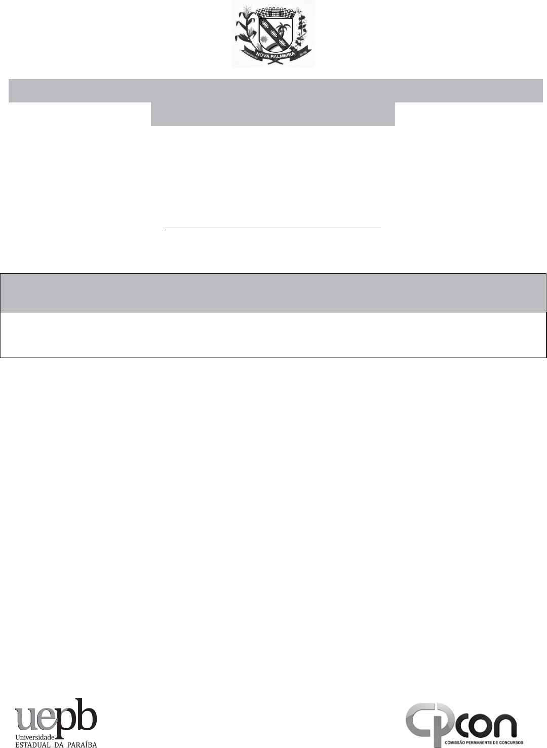 Operador de Máquinas Pesadas Instruções para a realização das provas NÍVEL MÉDIO / TÉCNICO EXAME GRAFOTÉCNICO (Transcreva a frase abaixo no local indicado na sua Folha de Respostas) "Art. 42 Os membros das Polícias Militares e Corpos de Bombeiros Militares, instituições organizadas com base na hierarquia e disciplina, são militares dos Estados, do Distrito Federal e dos Territórios. [...]" (CF/88) PREFEITURA MUNICIPAL DE NOVA PALMEIRA-PB Concurso Público - 2014 Verifique se este caderno contém 40 (quarenta) questões de múltipla escolha, sendo Português de 01 a 10, Informática de 11 a 20, Noções de Administração Pública de 21 a 25 e Conhecimentos Específicos de 26 a 40. Observe se há falhas ou imperfeições gráficas que causem dúvida. Caso existam, comunique imediatamente ao Fiscal de Sala. Verifique se os dados existentes na Folha de Resposta conferem com os dados do Cartão de Inscrição e da etiqueta afixada na sua carteira. Esta Prova tem duração de 4 (quatro) horas, sendo o início às 14h00. Não é permitida a saída do candidato antes de esgotado o tempo mínimo de 2 (duas) horas. É vetado, durante a prova, o intercâmbio ou empréstimo de material de qualquer natureza entre os candidatos, bem como o uso de celulares, calculadoras e/ou qualquer outro tipo de equipamento eletrônico. A fraude, ou tentativa, a indisciplina e o desrespeito às autoridades encarregadas dos trabalhos são faltas que eliminam o candidato. Assine, ao sair da sala, a Lista de Presença e entregue o seu Caderno de Prova e a Folha de Respostas, devidamente assinada, ao Fiscal de Sala. www.pciconcursos.com.br UNIVERSIDADE ESTADUAL DA PARAÍBA - Comissão Permanente de Concursos PREFEITURA MUNICIPAL DE NOVA PALMEIRA-PB - CONCURSO PÚBLICO - 2014 Texto 01 – Garimpando Nasci. Com o vazio instalado n'alma, foi assim que nasci: desejando! O desejo é o vazio d'alma em busca de superação. O homem vale pelo que ama. Só depois que ama, aprende a rir e chorar. Não há coisa mais perdida na vida do que chorar mal. Chora em vão quem chora pelo que não valha uma só lágrima. Chora as opções que nunca deveria ter feito. Nas encruzilhadas da vida estou condenado a fazer opções de rumos, de margens que não mais voltam, de caminhos que não se cruzarão mais. Começar a escolher é começar a amar. Alguém me ajudará dizendo uma palavra amiga. Mas, a escolha é minha porque o amor é meu. O risco também. Ninguém ama por procuração. Ninguém amará em meu lugar. [...] (Francisco Pereira Nóbrega, in: A palavra na construção do homem, João Pessoa, s/d). 1ª QUESTÃO Do texto, pode-se concluir que a temática tem predominância: ( ) No vazio instalado da alma, em busca de superação. ( ) No valor do amor na vida humana, pois o homem vale pelo que ama. ( ) Nas opções que o homem tem que tomar na vida. Analise as proposições e coloque (V) para verdadeiras e (F) para falsas. Escolha a alternativa adequada. a) F - V - F. b) V - V - F. c) V - F - F. d) F - F - V. e) F - V - V. 2ª QUESTÃO Marque a alternativa em cujo enunciado há aspecto conceitual. a) Alguém me ajudará, dizendo uma palavra amiga. b) Nasci com o vazio instalado n'alma. c) Não há coisa mais perdida na vida do que chorar mal. d) Nas encruzilhadas da vida, estou condenado a fazer opções. e) O desejo é o vazio d'alma em busca de superação. 3ª QUESTÃO Em “Nasci. Com o vazio instalado n'alma, foi assim que nasci: desejando”. Marque a alternativa correta, em relação ao que se afirma: a) Há um período simples, cuja oração apresenta sujeito inexistente. b) Há um período composto por duas orações, com sujeitos indeterminados. c) Há um período composto, com sujeitos ocultos, mas identificáveis pela flexão verbal. d) Há um período simples, cujo sujeito da oração é “o vazio instalado n'alma”. e) Há um período composto por três orações, mas sem sujeitos identificáveis. 4ª QUESTÃO A função de linguagem predominante no texto é: a) Poética, pois o emissor enfatiza a construção da mensagem, usando linguagem figurada. b) Metalinguista, tendo em vista que o emissor utiliza o código para explicar o próprio código. c) Conativa, porque o objetivo do emissor é influenciar o comportamento do receptor. d) Emotiva, pois o emissor está centrado em si mesmo, manifestando suas emoções. e) Referencial, pois expõe uma informação de modo objetivo. 5ª QUESTÃO Em “Mas, a escolha é minha porque o amor é meu”, pode-se afirmar que o termo MAS é um: a) Marcador que anuncia o desenvolvimento do discurso, indicando uma progressão semântica. b) Elo de coesão que marca oposição entre dois segmentos do texto. c) Conectivo que introduz um argumento decisivo, apresentado como acréscimo. d) Laço coesivo que apresenta um valor explicativo e complementar. e) Relator que introduz um segmento e acrescenta uma informação. 6ª QUESTÃO Da charge abaixo, é possível afirmar que: PORTUGUÊS I. Há uma crítica contundente ao desmatamento, conforme o novo código florestal. II. O “silenciamento” e postura do personagem expressam a coerência entre o tema e a imagem do texto. III. Não há explicitude na mensagem da charge, prejudicada pela ausência de texto verbal. Analise as proposições e marque a alternativa adequada. Está(ão) correta(s), apenas. a) I e III c) I e) II e III b) I e II d) III Do fragmento do texto, a seguir, responda às questões 07, 08 e 09. Preocupadas com o estancamento do fluxo de ideias que comprometia o entendimento geral, as vírgulas se constituíram em grande comissão e foram ter com o ponto que na qualidade de Senhor de todo território da Pontuação pudesse talvez encaminhar uma solução para o problema. [...] (Fragmento do texto “A revolta das vírgulas e a derrota do ponto” de Aluísio Flores in Oficina de Texto, Vozes, São Paulo: 2000, p. 114) PÁGINA 02 NÍVEL MÉDIO / TÉCNICO - OPERADOR DE MÁQUINAS PESADAS www.pciconcursos.com