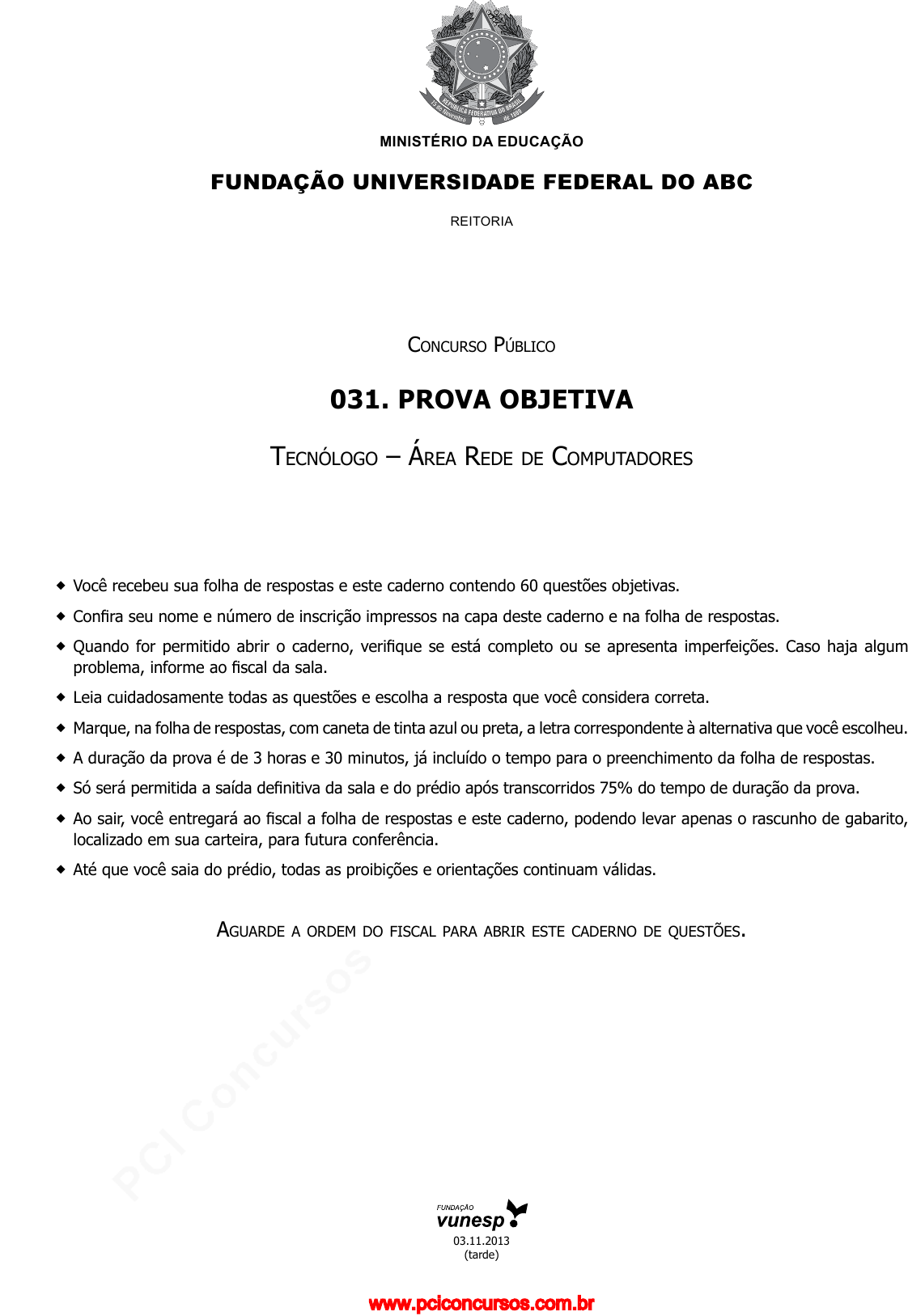 pcimarkpci MDAwMDowMDAwOjAwMDA6MDAwMDowMDAwOmZmZmY6MzZlOTpjMjU5:U3VuLCAxMiBTZXAgMjAyMSAwMDoxNzowMyAtMDMwMA== Ministério da Educação Fundação universidade Federal do aBC ReitoRia ConCurso PúbliCo 031. Prova objetiva TeCnólogo – Área rede de ComPuTadores � Você recebeu sua folha de respostas e este caderno contendo 60 questões objetivas. � Confira seu nome e número de inscrição impressos na capa deste caderno e na folha de respostas. � Quando for permitido abrir o caderno, verifique se está completo ou se apresenta imperfeições. Caso haja algum problema, informe ao fiscal da sala. � Leia cuidadosamente todas as questões e escolha a resposta que você considera correta. � Marque, na folha de respostas, com caneta de tinta azul ou preta, a letra correspondente à alternativa que você escolheu. � A duração da prova é de 3 horas e 30 minutos, já incluído o tempo para o preenchimento da folha de respostas. � Só será permitida a saída definitiva da sala e do prédio após transcorridos 75% do tempo de duração da prova. � Ao sair, você entregará ao fiscal a folha de respostas e este caderno, podendo levar apenas o rascunho de gabarito, localizado em sua carteira, para futura conferência. � Até que você saia do prédio, todas as proibições e orientações continuam válidas. aguarde a ordem do fisCal Para abrir esTe Caderno de quesTões. 03.11.2013 (tarde) www.pciconcursos.com.br pcimarkpci MDAwMDowMDAwOjAwMDA6MDAwMDowMDAwOmZmZmY6MzZlOTpjMjU5:U3VuLCAxMiBTZXAgMjAyMSAwMDoxNzowMyAtMDMwMA== 2UABC1301/031-Tecnól-ÁrRedesComp-Tarde CoNHeCiMeNtoS GeraiS Língua Portuguesa Leia o texto para responder às questões de números 01 a 06. Questão de igualdade De Barack Obama a Woody Allen, passando pelo “black bloc”, todo mundo resolveu imprecar contra a desigualdade. Há um interessante debate econômico sobre as repercussões sociais de diferenças crescentes entre a renda dos mais pobres e a dos mais ricos. Para os teóricos mais à direita, a disparidade não chega a ser um problema. Desde que não haja miséria e os mais pobres te- nham assegurada uma existência digna, a desigualdade funciona até como um motor da economia. É para comprar um carrão me- lhor do que o do vizinho que o sujeito se dispõe a trabalhar mais. Economistas mais à esquerda, entretanto, afirmam que, quando a diferença entre a maior e a menor remuneração cresce demais, a mobilidade social fica emperrada, o que gera uma série de problemas. Sistemas que beneficiam apenas uma elite, além de fracassarem em seu compromisso democrático, carregam as sementes de sua própria destruição. Nessa discussão, sou agnóstico e penso até que os dois lados podem estar certos. Mas há uma questão anterior, como coloca o filósofo Stephen Asma em “Against Fairness”. Para Asma, nós, seres humanos, estamos biologicamente programados para favorecer os próximos. O amor é discrimina- tório, diz. Se mães não protegessem suas crias, mamíferos e aves seriam inviáveis. Esse pendor simplesmente não combina com as exigências republicanas que nos impomos, ocasionando para- doxos. Acertadamente, condenamos o juiz que contrata parentes para seu gabinete, mas também recriminamos o empresário de sucesso que deixa de empregar seu irmão necessitado. Uma igualdade estrita exigiria que eu dê a meu filho o mes- mo valor que atribuo ao filho de um desconhecido e que dispense ao mendigo o tratamento que concedo a um amigo. Para Asma, éticas consequencialistas, centradas na igualdade, têm algo de profundamente desumano. (Helio Schwartsman. Folha de S.Paulo. 11.08.2013. Adaptado) 01. De acordo com o texto, (A) os governantes estão empenhados em evitar as reper- cussões sociais negativas provocadas pelo debate sobre a desigualdade social. (B) para os economistas, teóricos com postura política de esquerda são responsáveis pelo recente debate em torno da desigualdade. (C) a crescente discussão sobre a má distribuição de rique- zas contribuiu para o surgimento de medidas concretas a fim de corrigir a desigualdade. (D) as consequências sociais da crescente diferença entre a renda dos mais ricos e a dos mais pobres têm sido intensamente discutidas. (E) economistas são unânimes em defender que a desigual- dade é economicamente inviável, pelo fato de não pos- sibilitar mobilidade social. 02. Segundo a opinião do autor, o fato de condenarmos o juiz que contrata parentes para seu gabinete, mas recriminarmos o empresário que deixa de empregar seu irmão necessitado se revela como uma (A) coerência. (B) virtude. (C) indecisão. (D) paridade. (E) contradição. 03. Segundo o pensamento do filósofo Stephen Asma, expresso no penúltimo parágrafo do texto, a propensão natural para favorecer os mais próximos (A) inexiste entre seres humanos. (B) inviabiliza a manutenção da vida. (C) é inerente aos seres humanos. (D) é uma imperfeição do instinto materno. (E) é o que distingue o homem das outras espécies. 04. O termo destacado na frase – É para comprar um carrão me- lhor do que o do vizinho que o sujeito se dispõe a trabalhar mais. –, no contexto, expressa (A) finalidade. (B) causa. (C) condição. (D) consequência. (E) conclusão. 05. Assinale a alternativa cujo termo em destaque expressa cir- cunstância de posse. (A) De Barack Obama a Woody Allen, passando pelo “black bloc”, todo mundo resolveu imprecar… (B) É para comprar um carrão melhor do que o do vizinho que o sujeito se dispõe a trabalhar mais. (C) … a mobilidade social fica emperrada, o que gera uma série de problemas. (D) … além de fracassarem em seu compromisso democrá- tico, carregam as sementes de sua própria destruição. (E) … recriminamos o empresário de sucesso que deixa de empregar seu irmão necessitado. www.pciconcursos.com.br pcimarkpci MDAwMDowMDAwOjAwMDA6MDAwMDowMDAwOmZmZmY6MzZlOTpjMjU5:U3VuLCAxMiBTZXAgMjAyMSAwMDoxNzowMyAtMDMwMA== 3 UABC1301/031-Tecnól-ÁrRedesComp