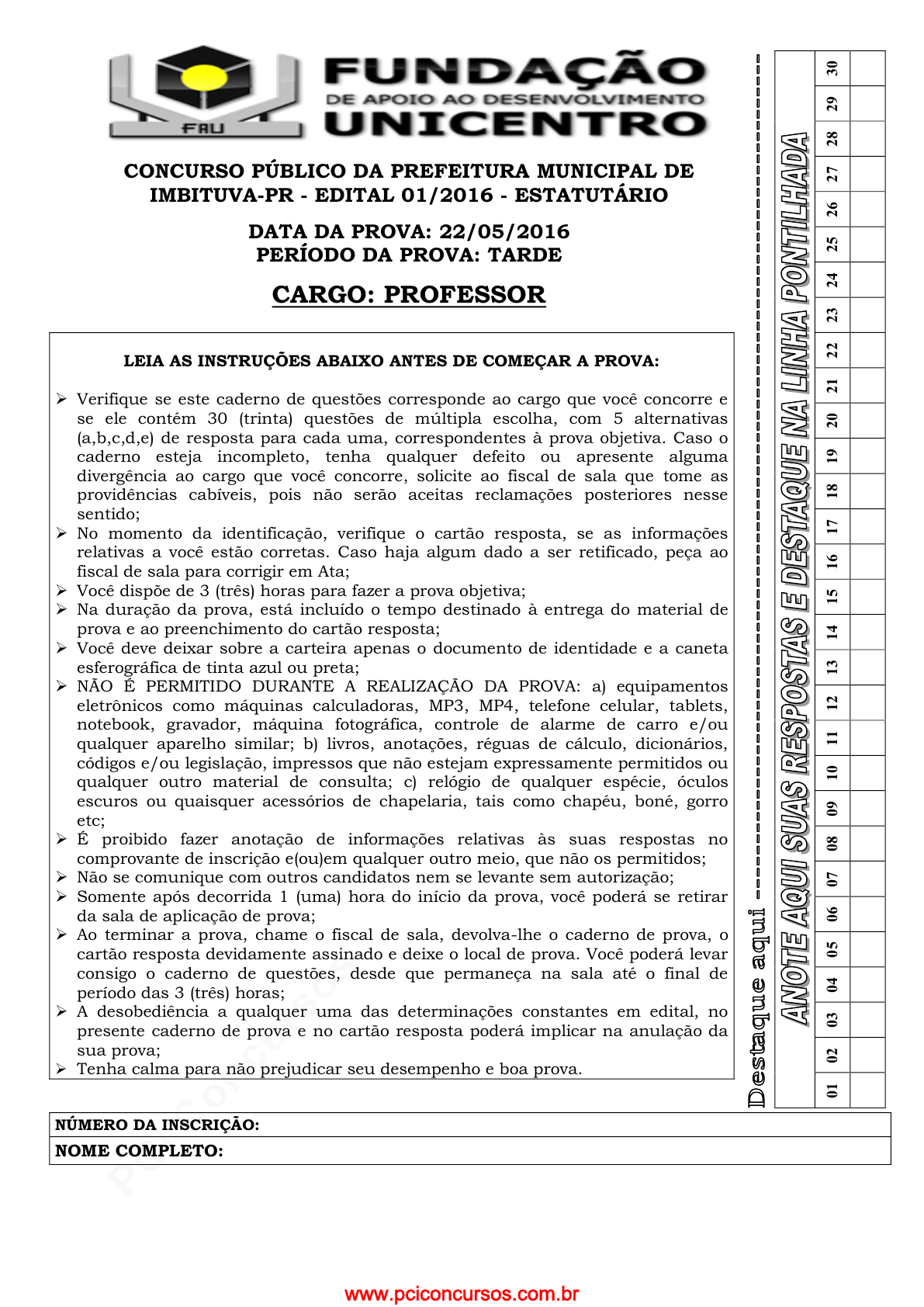 pcimarkpci MDAwMDowMDAwOjAwMDA6MDAwMDowMDAwOmZmZmY6MzZlOTpjMjU5:U3VuLCAxMiBTZXAgMjAyMSAwODoyMzozNSAtMDMwMA== CONCURSO PÚBLICO DA PREFEITURA MUNICIPAL DE IMBITUVA-PR - EDITAL 01/2016 - ESTATUTÁRIO DATA DA PROVA: 22/05/2016 PERÍODO DA PROVA: TARDE CARGO: PROFESSOR 3 0 2 9 2 8 2 7 2 6 2 5 2 4 2 3 2 2 2 1 2 0 1 9 1 8 1 7 1 6 1 5 1 4 1 3 1 2 1 1 1 0 0 9 0 8 0 7 0 6 0 5 0 4 0 3 0 2 0 1 LEIA AS INSTRUÇÕES ABAIXO ANTES DE COMEÇAR A PROVA: Verifique se este caderno de questões corresponde ao cargo que você concorre e se ele contém 30 (trinta) questões de múltipla escolha, com 5 alternativas (a,b,c,d,e) de resposta para cada uma, correspondentes à prova objetiva. Caso o caderno esteja incompleto, tenha qualquer defeito ou apresente alguma divergência ao cargo que você concorre, solicite ao fiscal de sala que tome as providências cabíveis, pois não serão aceitas reclamações posteriores nesse sentido; No momento da identificação, verifique o cartão resposta, se as informações relativas a você estão corretas. Caso haja algum dado a ser retificado, peça ao fiscal de sala para corrigir em Ata; Você dispõe de 3 (três) horas para fazer a prova objetiva; Na duração da prova, está incluído o tempo destinado à entrega do material de prova e ao preenchimento do cartão resposta; Você deve deixar sobre a carteira apenas o documento de identidade e a caneta esferográfica de tinta azul ou preta; NÃO É PERMITIDO DURANTE A REALIZAÇÃO DA PROVA: a) equipamentos eletrônicos como máquinas calculadoras, MP3, MP4, telefone celular, tablets, notebook, gravador, máquina fotográfica, controle de alarme de carro e/ou qualquer aparelho similar; b) livros, anotações, réguas de cálculo, dicionários, códigos e/ou legislação, impressos que não estejam expressamente permitidos ou qualquer outro material de consulta; c) relógio de qualquer espécie, óculos escuros ou quaisquer acessórios de chapelaria, tais como chapéu, boné, gorro etc; É proibido fazer anotação de informações relativas às suas respostas no comprovante de inscrição e(ou)em qualquer outro meio, que não os permitidos; Não se comunique com outros candidatos nem se levante sem autorização; Somente após decorrida 1 (uma) hora do início da prova, você poderá se retirar da sala de aplicação de prova; Ao terminar a prova, chame o fiscal de sala, devolva-lhe o caderno de prova, o cartão resposta devidamente assinado e deixe o local de prova. Você poderá levar consigo o caderno de questões, desde que permaneça na sala até o final de período das 3 (três) horas; A desobediência a qualquer uma das determinações constantes em edital, no presente caderno de prova e no cartão resposta poderá implicar na anulação da sua prova; Tenha calma para não prejudicar seu desempenho e boa prova. NÚMERO DA INSCRIÇÃO: NOME COMPLETO: www.pciconcursos.com.br pcimarkpci MDAwMDowMDAwOjAwMDA6MDAwMDowMDAwOmZmZmY6MzZlOTpjMjU5:U3VuLCAxMiBTZXAgMjAyMSAwODoyMzozNSAtMDMwMA== 2 01) Considere as seguintes afirmações: I - Os vocábulos “audácia”, “vitória” e “glória” são acentuados graficamente pela mesma regra. II - A frase “Caía do invasor a audácia estranha” tem como núcleo do sujeito simples “a audácia estranha”. III - Em “A liberdade é o sol que nos dá vida” o predicado classifica-se como nominal. Está CORRETO o que se afirma em: (A) Apenas as afirmativas I e II estão corretas. (B) Apenas a afirmativa I está correta. (C) Apenas a afirmativa II está correta. (D) Apenas a afirmativa III está correta. (E) Todas as afirmativas estão corretas. 02) Marque a opção em que o uso da crase é incorreto: (A) Fomos à praia. (B) Não devo nada à você. (C) Saimos às pressas. (D) Assisti àquele filme. (E) Ele só trabalha à noite. 03) Marque a opção que preenche, correta e respectivamente, as lacunas da frase abaixo: Tenho a satisfação de encaminhar a V.Sª cópia do ato de ___________ nomeação, na oportunidade felicito-____, desejando-________ êxito no exercício de _________ funções. (A) Vossa, lhe, lhe, vossas. (B) Sua, lhe, vos, suas. (C) Sua, o, lhe, suas. (D) Vossa, o, vos, vossas. (E) Sua, lhe, o vossas. 04) Assinale a alternativa em que o período é composto por subordinação: (A) Você prefere chá ou aceita um café? (B) As mulheres lutam a fim de que as respeitem profissionalmente. (C) Os jogadores ganharam e foram comemorar. (D) Não fui à festa, porém mandei um presente para o aniversariante. (E) As luzes apagam-se, abrem-se as cortinas e começa o espetáculo. 05) Assinale a alternativa em que ocorre INCORREÇÃO quanto à regência verbal: (A) Prefiro mais café do que leite. (B) O amor implica renúncia. (C) Nossa equipe aspira ao troféu de campeã. (D) Assistimos a um belo filme ontem. (E) Os princípios que ele se nega a obedecer são elementares para uma pessoa civilizada. 06) Uma foto foi ampliada em 20% do seu tamanho natural. O tamanho natural da foto é 8 cm. Quantos cm ela tem de comprimento agora? (A) 11,52 cm. (B) 8,8 cm. (C) 9,2 cm. (D) 9,6 cm. (E) 12 cm. 07) Sara irá repartir o bolo que ganhou com os seus filhos. Ela reservou a quarta parte para o lanche de amanhã. Repartiu o resto igualmente entre eles de forma que cada um recebeu 3/20 do bolo. Quantos filhos Sara tem? (A) 3. (B) 4. (C) 5. (D) 6. (E) 8. 08) O conjunto A tem 50 elementos, A∩B tem 23 elementos e AUB tem 119. O número de elementos do conjunto B é: (A) 27. (B) 23. (C) 69. (D) 92. (E) 105. 09) Em um grupo de amigos foi feita uma aposta, para irem a uma festa a fantasia eles teriam que usar algum acessório ao mesmo tempo: 1º - dente de coelho e nariz de palhaço, ou. 2º - nariz de palhaço e peruca, ou. 3º - peruca e dente de coelho. Mas alguns resolveram fugir a regra e foram só com a peruca. Sabendo que sete pessoas usaram a 1º opção, nove a 2º opção e treze a 3º opção e o total de amigos eram 36. Quantos fugiram a regra e só usaram a peruca? (A) 