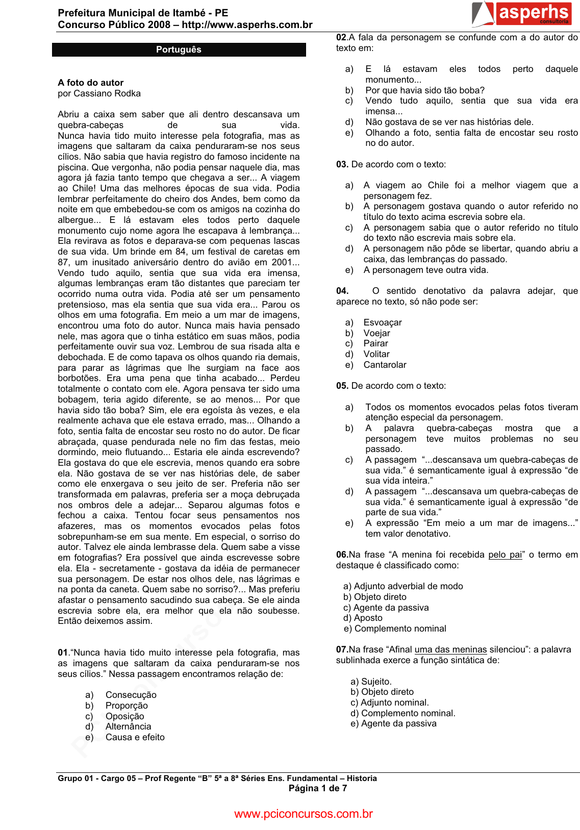 pcimarkpci MDAwMDowMDAwOjAwMDA6MDAwMDowMDAwOmZmZmY6MzZlOTpjMjU5:U3VuLCAxMiBTZXAgMjAyMSAxMDoyNToyNSAtMDMwMA== Prefeitura Municipal de Itambé - PE Concurso Público 2008 – http://www.asperhs.com.br Grupo 01 - Cargo 05 – Prof Regente “B” 5ª a 8ª Séries Ens. Fundamental – Historia Página 1 de 7 Português A foto do autor por Cassiano Rodka Abriu a caixa sem saber que ali dentro descansava um quebra-cabeças de sua vida. Nunca havia tido muito interesse pela fotografia, mas as imagens que saltaram da caixa penduraram-se nos seus cílios. Não sabia que havia registro do famoso incidente na piscina. Que vergonha, não podia pensar naquele dia, mas agora já fazia tanto tempo que chegava a ser... A viagem ao Chile! Uma das melhores épocas de sua vida. Podia lembrar perfeitamente do cheiro dos Andes, bem como da noite em que embebedou-se com os amigos na cozinha do albergue... E lá estavam eles todos perto daquele monumento cujo nome agora lhe escapava à lembrança... Ela revirava as fotos e deparava-se com pequenas lascas de sua vida. Um brinde em 84, um festival de caretas em 87, um inusitado aniversário dentro do avião em 2001... Vendo tudo aquilo, sentia que sua vida era imensa, algumas lembranças eram tão distantes que pareciam ter ocorrido numa outra vida. Podia até ser um pensamento pretensioso, mas ela sentia que sua vida era... Parou os olhos em uma fotografia. Em meio a um mar de imagens, encontrou uma foto do autor. Nunca mais havia pensado nele, mas agora que o tinha estático em suas mãos, podia perfeitamente ouvir sua voz. Lembrou de sua risada alta e debochada. E de como tapava os olhos quando ria demais, para parar as lágrimas que lhe surgiam na face aos borbotões. Era uma pena que tinha acabado... Perdeu totalmente o contato com ele. Agora pensava ter sido uma bobagem, teria agido diferente, se ao menos... Por que havia sido tão boba? Sim, ele era egoísta às vezes, e ela realmente achava que ele estava errado, mas... Olhando a foto, sentia falta de encostar seu rosto no do autor. De ficar abraçada, quase pendurada nele no fim das festas, meio dormindo, meio flutuando... Estaria ele ainda escrevendo? Ela gostava do que ele escrevia, menos quando era sobre ela. Não gostava de se ver nas histórias dele, de saber como ele enxergava o seu jeito de ser. Preferia não ser transformada em palavras, preferia ser a moça debruçada nos ombros dele a adejar... Separou algumas fotos e fechou a caixa. Tentou focar seus pensamentos nos afazeres, mas os momentos evocados pelas fotos sobrepunham-se em sua mente. Em especial, o sorriso do autor. Talvez ele ainda lembrasse dela. Quem sabe a visse em fotografias? Era possível que ainda escrevesse sobre ela. Ela - secretamente - gostava da idéia de permanecer sua personagem. De estar nos olhos dele, nas lágrimas e na ponta da caneta. Quem sabe no sorriso?... Mas preferiu afastar o pensamento sacudindo sua cabeça. Se ele ainda escrevia sobre ela, era melhor que ela não soubesse. Então deixemos assim. 01.“Nunca havia tido muito interesse pela fotografia, mas as imagens que saltaram da caixa penduraram-se nos seus cílios.” Nessa passagem encontramos relação de: a) Consecução b) Proporção c) Oposição d) Alternância e) Causa e efeito 02.A fala da personagem se confunde com a do autor do texto em: a) E lá estavam eles todos perto daquele monumento... b) Por que havia sido tão boba? c) Vendo tudo aquilo, sentia que sua vida era imensa... d) Não gostava de se ver nas histórias dele. e) Olhando a foto, sentia falta de encostar seu rosto no do autor. 03. De acordo com o texto: a) A viagem ao Chile foi a melhor viagem que a personagem fez. b) A personagem gostava quando o autor referido no título do texto acima escrevia sobre ela. c) A personagem sabia que o autor referido no título do texto não escrevia mais sobre ela. d) A personagem não pôde se libertar, quando abriu a caixa, das lembranças do passado. e) A personagem teve outra vida. 04. O sentido denotativo da palavra adejar, que aparece no texto, só não pode ser: a) Esvoaçar b) Voejar c) Pairar d) Volitar e) Cantarolar 05. De acordo com o texto: a) Todos os momentos evocados pelas fotos tiveram atenção especial da personagem. b) A palavra quebra-cabeças mostra que a personagem teve muitos problemas no seu passado. c) A passagem “...descansava um quebra-cabeças de sua vida.” é semanticamente igual à expressão “de sua vida inteira.” d) A passagem “...descansava um quebra-cabeças de sua vida.” é semanticamente igual à expressão “de parte de sua vida.” e) A expressão “Em meio a um mar de imagens...” tem valor denotativo. 06.Na frase “A menina foi recebida pelo pai” o termo em destaque é classificado como: a) Adjunto adverbial de modo b) Objeto direto c) Agente da passiva d) Aposto e) Complemento nominal 07.Na frase “Afinal uma das meninas silenciou”: a palavra sublinhada exerce a função sintática de: a) Sujeito. b) Objeto direto c) Adjunto nominal. d) Complemento nominal. e) Agente da passiva www.pciconcursos.com.br pcimarkpci MDAwMDowMDAwOjAwMDA6MDAwMDowMDAwOmZmZmY6MzZlOTpjMjU5:U3VuLCAxMiBTZXAgMjAyMSAxMDoyNToyNSAtMDMwMA== Prefeitura Municipal de Itambé - PE Concurso Público 2008 – http://www.asperhs.com.br Grupo 01 - Cargo 05 – Prof Regente “B” 5ª a 8ª Séries Ens. Fundamental – Historia Página 2 de 7 08.A alternativa na qual todas as palavra estão escritas corretamente é: a) Assessor, cabelereiro, alisar b) Baliza, pretensão, fuzível c) Acesso, conceção, visar d) Ascensão, irrequieto, catequisar e) Atrás, flecha, contra-senso 09. A alternativa que apresenta pontuação incorreta é: a) Os passantes chegam, olham, perguntam e prosseguem. b) Olha, José, não precisa mais voltar hoje. c) A História, diz Cícero, é e mestra da vida. d) Jorge Amado, um dos autores brasileiros mais conhecido a mundialmente publicou mais um livro. e) Casa de ferreiro, espeto de pau. 10. Marque a 