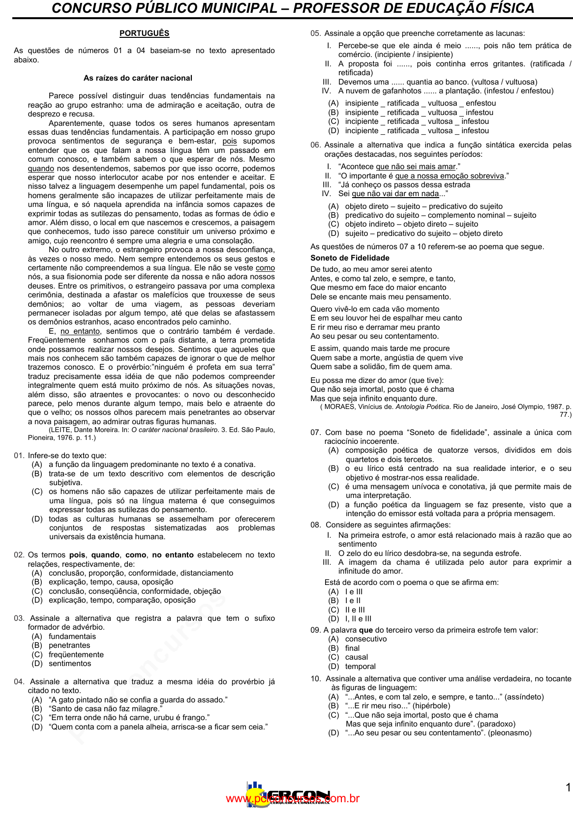 pcimarkpci MDAwMDowMDAwOjAwMDA6MDAwMDowMDAwOmZmZmY6MzZlOTpjMjU5:U3VuLCAxMiBTZXAgMjAyMSAxODo0ODoxNCAtMDMwMA== CONCURSO PÚBLICO MUNICIPAL – PROFESSOR DE EDUCAÇÃO FÍSICA 1 PORTUGUÊS As questões de números 01 a 04 baseiam-se no texto apresentado abaixo. As raízes do caráter nacional Parece possível distinguir duas tendências fundamentais na reação ao grupo estranho: uma de admiração e aceitação, outra de desprezo e recusa. Aparentemente, quase todos os seres humanos apresentam essas duas tendências fundamentais. A participação em nosso grupo provoca sentimentos de segurança e bem-estar, pois supomos entender que os que falam a nossa língua têm um passado em comum conosco, e também sabem o que esperar de nós. Mesmo quando nos desentendemos, sabemos por que isso ocorre, podemos esperar que nosso interlocutor acabe por nos entender e aceitar. E nisso talvez a linguagem desempenhe um papel fundamental, pois os homens geralmente são incapazes de utilizar perfeitamente mais de uma língua, e só naquela aprendida na infância somos capazes de exprimir todas as sutilezas do pensamento, todas as formas de ódio e amor. Além disso, o local em que nascemos e crescemos, a paisagem que conhecemos, tudo isso parece constituir um universo próximo e amigo, cujo reencontro é sempre uma alegria e uma consolação. No outro extremo, o estrangeiro provoca a nossa desconfiança, às vezes o nosso medo. Nem sempre entendemos os seus gestos e certamente não compreendemos a sua língua. Ele não se veste como nós, a sua fisionomia pode ser diferente da nossa e não adora nossos deuses. Entre os primitivos, o estrangeiro passava por uma complexa cerimônia, destinada a afastar os malefícios que trouxesse de seus demônios; ao voltar de uma viagem, as pessoas deveriam permanecer isoladas por algum tempo, até que delas se afastassem os demônios estranhos, acaso encontrados pelo caminho. E, no entanto, sentimos que o contrário também é verdade. Freqüentemente sonhamos com o país distante, a terra prometida onde possamos realizar nossos desejos. Sentimos que aqueles que mais nos conhecem são também capazes de ignorar o que de melhor trazemos conosco. E o provérbio:”ninguém é profeta em sua terra” traduz precisamente essa idéia de que não podemos compreender integralmente quem está muito próximo de nós. As situações novas, além disso, são atraentes e provocantes: o novo ou desconhecido parece, pelo menos durante algum tempo, mais belo e atraente do que o velho; os nossos olhos parecem mais penetrantes ao observar a nova paisagem, ao admirar outras figuras humanas. (LEITE, Dante Moreira. In: O caráter nacional brasileiro. 3. Ed. São Paulo, Pioneira, 1976. p. 11.) 01. Infere-se do texto que: (A) a função da linguagem predominante no texto é a conativa. (B) trata-se de um texto descritivo com elementos de descrição subjetiva. (C) os homens não são capazes de utilizar perfeitamente mais de uma língua, pois só na língua materna é que conseguimos expressar todas as sutilezas do pensamento. (D) todas as culturas humanas se assemelham por oferecerem conjuntos de respostas sistematizadas aos problemas universais da existência humana. 02. Os termos pois, quando, como, no entanto estabelecem no texto relações, respectivamente, de: (A) conclusão, proporção, conformidade, distanciamento (B) explicação, tempo, causa, oposição (C) conclusão, conseqüência, conformidade, objeção (D) explicação, tempo, comparação, oposição 03. Assinale a alternativa que registra a palavra que tem o sufixo formador de advérbio. (A) fundamentais (B) penetrantes (C) freqüentemente (D) sentimentos 04. Assinale a alternativa que traduz a mesma idéia do provérbio já citado no texto. (A) “A gato pintado não se confia a guarda do assado.” (B) “Santo de casa não faz milagre.” (C) “Em terra onde não há carne, urubu é frango.” (D) “Quem conta com a panela alheia, arrisca-se a ficar sem ceia.” 05. Assinale a opção que preenche corretamente as lacunas: I. Percebe-se que ele ainda é meio ......, pois não tem prática de comércio. (incipiente / insipiente) II. A proposta foi ......, pois continha erros gritantes. (ratificada / retificada) III. Devemos uma ...... quantia ao banco. (vultosa / vultuosa) IV. A nuvem de gafanhotos ...... a plantação. (infestou / enfestou) (A) insipiente _ ratificada _ vultuosa _ enfestou (B) insipiente _ retificada _ vultuosa _ infestou (C) incipiente _ retificada _ vultosa _ infestou (D) incipiente _ ratificada _ vultosa _ infestou 06. Assinale a alternativa que indica a função sintática exercida pelas orações destacadas, nos seguintes períodos: I. “Acontece que não sei mais amar.” II. “O importante é que a nossa emoção sobreviva.” III. “Já conheço os passos dessa estrada IV. Sei que não vai dar em nada...” (A) objeto direto – sujeito – predicativo do sujeito (B) predicativo do sujeito – complemento nominal – sujeito (C) objeto indireto – objeto direto – sujeito (D) sujeito – predicativo do sujeito – objeto direto As questões de números 07 a 10 referem-se ao poema que segue. Soneto de Fidelidade De tudo, ao meu amor serei atento Antes, e como tal zelo, e sempre, e tanto, Que mesmo em face do maior encanto Dele se encante mais meu pensamento. Quero vivê-lo em cada vão momento E em seu louvor hei de espalhar meu canto E rir meu riso e derramar meu pranto Ao seu pesar ou seu contentamento. E assim, quando mais tarde me procure Quem sabe a morte, angústia de quem vive Quem sabe a solidão, fim de quem ama. Eu possa me dizer do amor (que tive): Que não seja imortal, posto que é chama Mas que seja infinito enquanto dure. ( MORAES, Vinícius de. Antologia Poética. Rio de Janeiro, José Olympio, 1987. p. 77.) 07. Com base no poema “Soneto de fidelidade”, assinale a única com raciocínio incoerente. (A) composição poética de quatorze versos, divididos em dois quartetos