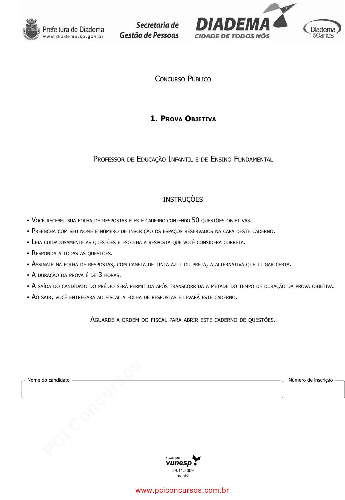 pcimarkpci MDAwMDowMDAwOjAwMDA6MDAwMDowMDAwOmZmZmY6MzZlOTpjMjU5:U3VuLCAxMiBTZXAgMjAyMSAyMDowNzowNCAtMDMwMA== CONCURSO PÚBLICO 1. PROVA OBJETIVA PROFESSOR DE EDUCAÇÃO INFANTIL E DE ENSINO FUNDAMENTAL INSTRUÇÕES � VOCÊ RECEBEU SUA FOLHA DE RESPOSTAS E ESTE CADERNO CONTENDO 50 QUESTÕES OBJETIVAS. � PREENCHA COM SEU NOME E NÚMERO DE INSCRIÇÃO OS ESPAÇOS RESERVADOS NA CAPA DESTE CADERNO. � LEIA CUIDADOSAMENTE AS QUESTÕES E ESCOLHA A RESPOSTA QUE VOCÊ CONSIDERA CORRETA. � RESPONDA A TODAS AS QUESTÕES. � ASSINALE NA FOLHA DE RESPOSTAS, COM CANETA DE TINTA AZUL OU PRETA, A ALTERNATIVA QUE JULGAR CERTA. � A DURAÇÃO DA PROVA É DE 3 HORAS. � A SAÍDA DO CANDIDATO DO PRÉDIO SERÁ PERMITIDA APÓS TRANSCORRIDA A METADE DO TEMPO DE DURAÇÃO DA PROVA OBJETIVA. � AO SAIR, VOCÊ ENTREGARÁ AO FISCAL A FOLHA DE RESPOSTAS E LEVARÁ ESTE CADERNO. AGUARDE A ORDEM DO FISCAL PARA ABRIR ESTE CADERNO DE QUESTÕES. 29.11.2009 manhã www.pciconcursos.com.br pcimarkpci MDAwMDowMDAwOjAwMDA6MDAwMDowMDAwOmZmZmY6MzZlOTpjMjU5:U3VuLCAxMiBTZXAgMjAyMSAyMDowNzowNCAtMDMwMA== 2PMDI0901/01-ProfEdInf e de EnsFund-manhã LÍNGUA PORTUGUESA Para responder às questões de números 01 a 10, leia o texto. Cidade feliz RIO DE JANEIRO – Há tempos, escrevi num livro que, as- sim como os londrinos são bons em táxi, guarda-chuva, pigarro, cachorro e consciência de classe, e os parisienses, em baguete, boina, livro usado, cigarro sem filtro e bidê, o carioca sempre se orgulhou de seu know-how em botequim, sandália de dedo, frescobol, caldinho de feijão e botar apelido nos outros. Pois logo poderá somar outro item a seu currículo: organizar grandes competições esportivas. O Rio receberá os Jogos Mundiais Militares em 2011, a Copa das Confederações em 2013, a Copa do Mundo em 2014 (abrigará, entre outros, o jogo final, além de ser sede da seleção, da Fifa e do centro de imprensa) e, agora, a Olimpíada e a Para-Olimpíada em 2016. Ou seja, há espaço na agenda para 2012 e 2015. E, até que se acenda a chama olímpica, ainda teremos sete Carnavais e outros tantos verões e Réveillons. Estamos numa maré boa. Nos últimos meses, o Rio ganhou o título de “cidade mais feliz do mundo” (segundo pesquisa de um instituto americano com 10 mil pessoas em 20 países), foi considerado (pelos entendidos) o “melhor destino gay do mundo” e se tornou a primeira cidade da América do Sul a merecer uma edição do Guia Verde Michelin, com 20 lugares agraciados com a cotação máxima de três estrelas e 40 com duas. Junte a isso a boa colocação do Rio como polo nacional do audiovisual e de pesquisa acadêmica nas áreas de saúde, biologia, biotecnologia, petróleo, astronomia e humanas em geral – e, acres- cento eu, da baixa gastronomia, conceito criado aqui e irradiado para as demais potências – para entender como, depois de tanto apanhar, nossa autoestima tem melhorado muito. Mas, como diria o carioca Noel Rosa, o Rio não quer abafar ninguém. Só quer mostrar que faz Olimpíada tão bem. (Ruy Castro, Folha de S.Paulo, 03.10.2009) 01. De acordo com o texto, é correto afirmar que (A) o Rio prepara-se para concorrer a novos eventos nos anos de 2012 e 2015. (B) o Rio, ao contrário de outras cidades, não apresenta peculiaridades significativas. (C) os títulos recebidos pelo Rio denotam preconceito e favorecem a elite carioca. (D) a autoestima dos cariocas elevou-se devido aos famosos carnavais e Réveillons. (E) a valorização do Rio excede os limites da área turística, esportiva e gastronômica. 02. Assinale a alternativa em que o trecho, – O Rio receberá os Jogos Mundiais Militares em 2011, a Copa das Confederações em 2013, a Copa do Mundo em 2014 (abrigará, entre outros, o jogo final, além de ser sede da seleção, da Fifa e do centro de imprensa) e, agora, a Olimpíada e a Para-Olimpíada em 2016. – reescrito, encontra-se corretamente pontuado: (A) O Rio receberá, não apenas os Jogos Mundiais Militares em 2011, a Copa das Confederações em 2013, e a Copa do Mundo, em 2014, mas também, agora a Olimpíada, e a Para-Olimpíada em 2016. (B) O Rio receberá, não apenas, os Jogos Mundiais Militares em 2011, a Copa das Confederações em 2013 e a Copa do Mundo em 2014 mas também agora, a Olimpíada e a Para-Olimpíada em 2016. (C) O Rio, receberá não apenas os Jogos Mundiais Militares em 2011, a Copa das Confederações em 2013 e a Copa do Mundo em 2014 mas também agora, a Olimpíada e a Para-Olimpíada em 2016. (D) O Rio receberá não apenas os Jogos Mundiais Militares em 2011, a Copa das Confederações em 2013 e a Copa do Mundo em 2014 mas também, agora, a Olimpíada e a Para-Olimpíada em 2016. (E) O Rio, receberá não apenas os Jogos Mundiais Militares em 2011, a Copa das Confederações em 2013 e a Copa do Mundo, em 2014 mas também, agora, a Olimpíada e a Para-Olimpíada em 2016. 03. Em – E, até que se acenda a chama olímpica, ainda tere- mos sete Carnavais e outros tantos verões e Réveillons. – (2.º parágrafo), as expressões até que e ainda estabelecem, respectivamente, relação de (A) lugar – concessão. (B) tempo – tempo. (C) condição – tempo. (D) tempo – alternância. (E) concessão – tempo. 04. Assinale a alternativa em que os substantivos compostos fazem o plural a exemplo de o guarda-chuva: (A) guarda-civil; bem-te-vi (B) abaixo-assinado; mula sem cabeça (C) para-raio; beija-flor (D) cachorro-quente; pica-pau (E) guarda-sol; peixe-espada www.pciconcursos.com.br pcimarkpci MDAwMDowMDAwOjAwMDA6MDAwMDowMDAwOmZmZmY6MzZlOTpjMjU5:U3VuLCAxMiBTZXAgMjAyMSAyMDowNzowNCAtMDMwMA== 3 PMDI0901/01-ProfEdInf e de EnsFund-manhã 05. A frase – O Rio receberá os Jogos Mundiais Militares em 2011 – está construída na voz ativa. Transpondo-a para a voz passiva, ela assume a seguinte redação: (A) Os Jogos Mundiais Militares serão recebidos pelo Rio em 2011. (B) Os Jogos Mundiais Militares deverão ser recebidos pelo Rio em 2011. (C) Re