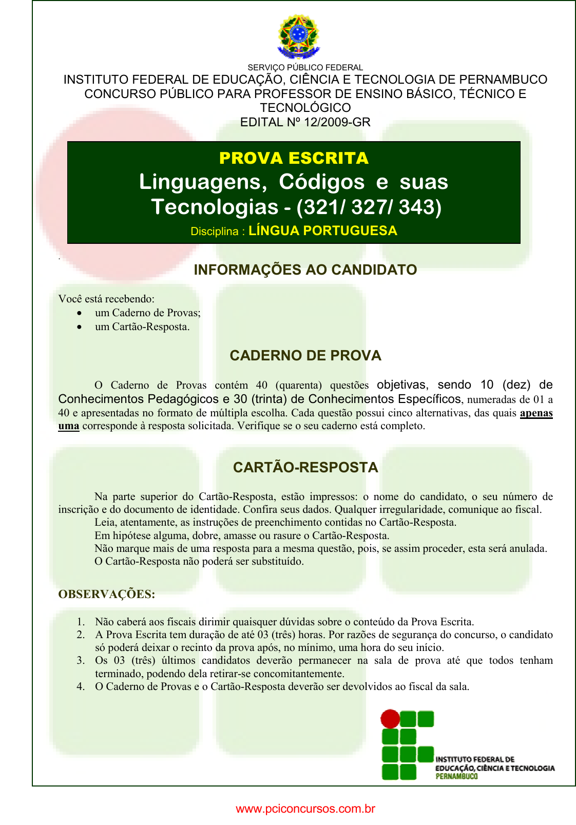 pcimarkpci MDAwMDowMDAwOjAwMDA6MDAwMDowMDAwOmZmZmY6MzZlOTpjMjU5:TW9uLCAxMyBTZXAgMjAyMSAwMjoxMDozMCAtMDMwMA== SERVIÇO PÚBLICO FEDERAL INSTITUTO FEDERAL DE EDUCAÇÃO, CIÊNCIA E TECNOLOGIA DE PERNAMBUCO CONCURSO PÚBLICO PARA PROFESSOR DE ENSINO BÁSICO, TÉCNICO E TECNOLÓGICO EDITAL Nº 12/2009-GR . INFORMAÇÕES AO CANDIDATO Você está recebendo: • um Caderno de Provas; • um Cartão-Resposta. CADERNO DE PROVA O Caderno de Provas contém 40 (quarenta) questões objetivas, sendo 10 (dez) de Conhecimentos Pedagógicos e 30 (trinta) de Conhecimentos Específicos, numeradas de 01 a 40 e apresentadas no formato de múltipla escolha. Cada questão possui cinco alternativas, das quais apenas uma corresponde à resposta solicitada. Verifique se o seu caderno está completo. CARTÃO-RESPOSTA Na parte superior do Cartão-Resposta, estão impressos: o nome do candidato, o seu número de inscrição e do documento de identidade. Confira seus dados. Qualquer irregularidade, comunique ao fiscal. Leia, atentamente, as instruções de preenchimento contidas no Cartão-Resposta. Em hipótese alguma, dobre, amasse ou rasure o Cartão-Resposta. Não marque mais de uma resposta para a mesma questão, pois, se assim proceder, esta será anulada. O Cartão-Resposta não poderá ser substituído. OBSERVAÇÕES: 1. Não caberá aos fiscais dirimir quaisquer dúvidas sobre o conteúdo da Prova Escrita. 2. A Prova Escrita tem duração de até 03 (três) horas. Por razões de segurança do concurso, o candidato só poderá deixar o recinto da prova após, no mínimo, uma hora do seu início. 3. Os 03 (três) últimos candidatos deverão permanecer na sala de prova até que todos tenham terminado, podendo dela retirar-se concomitantemente. 4. O Caderno de Provas e o Cartão-Resposta deverão ser devolvidos ao fiscal da sala. PROVA ESCRITA Linguagens, Códigos e suas Tecnologias - (321/ 327/ 343) Disciplina : LÍNGUA PORTUGUESA www.pciconcursos.com.br pcimarkpci MDAwMDowMDAwOjAwMDA6MDAwMDowMDAwOmZmZmY6MzZlOTpjMjU5:TW9uLCAxMyBTZXAgMjAyMSAwMjoxMDozMCAtMDMwMA== CONHECIMENTO PEDAGÓGICO APLICADO AO ENSINO DE LÍNGUA E LITERATURA 1. Quando o professor assume uma concepção de língua como ação interlocutiva situada e, portanto, sujeita à interferência dos usuários, o ato de selecionar o quê e como ensinar implica defender a) a adesão a metodologias tecnológicas. b) a hegemonia da norma padrão. c) o privilégio dos exercícios estruturais. d) o trabalho com gêneros orais e escritos. e) o uso do texto para o ensino da gramática. 2. Na escola, o trabalho docente com a língua materna deve ser organizado em eixos de ensino sobre os quais podem ser feitas as seguintes afirmativas: I. A abordagem a gêneros orais da comunicação pública formal inclui, sobretudo, o estudo dos aspectos de correção linguística adotados na norma escrita padrão. II. As ambiguidades de ordem sintática, assim como os efeitos de sentido decorrentes da ordem da palavra na oração, são aspectos a serem considerados no eixo da análise linguística. III. Um aspecto essencial no trabalho com a leitura é a atividade inferencial, isto é, fazer o aluno produzir novas informações a partir de outras, retiradas do próprio texto ou de fora dele. IV. Na leitura literária, o professor deve considerar a adequação dos textos ao leitor e a qualidade estética desses textos, os quais devem ser abordados de modo a realçar os aspectos relativos a imagens, ritmo, criatividade e valores sociais implicados. V. No trabalho com a produção de texto na escola, no âmbito do Ensino Médio, devem ser priorizadas as sequências tipológicas argumentativas, ao contrário das narrativas, mais adequadas aos aspectos cognitivos e socioafetivos das crianças. Estão corretas, apenas: a) I, II e III. b) I, II e IV. c) I, III e IV. d) II, III e IV. e) III, IV e V. 3. Sobre o ensino da linguagem oral na escola, considere as seguintes afirmativas: I. No trabalho pedagógico com a linguagem oral, os marcadores conversacionais bem como as repetições e paráfrases constituem aspectos linguísticos a serem observados. II. Uma atividade pedagógica que culmine com uma leitura oral de texto produzido pelos alunos constitui uma boa oportunidade para o professor trabalhar a distinção entre fala e escrita. III. Uma atividade que envolva grupos de alunos em uma discussão sobre determinado tema constitui necessariamente uma prática pedagógica da linguagem oral, pois que envolve a interlocução. IV. O ensino da fala não tem o mesmo sentido do ensino da escrita, pois a fala, que é adquirida espontaneamente no contexto familiar, na escola, deve ter como foco de ensino certos usos sociais específicos. V. Para que práticas escolarizadas como seminários e júris simulados constituam oportunidade de ensino da linguagem oral, o professor há que se preocupar em sistematizar o modo como funcionam tais gêneros orais. Estão corretas, apenas: a) I, II e IV. b) I, III e V. c) I, IV e V. d) II, IV e V. e) III, IV e V. www.pciconcursos.com.br pcimarkpci MDAwMDowMDAwOjAwMDA6MDAwMDowMDAwOmZmZmY6MzZlOTpjMjU5:TW9uLCAxMyBTZXAgMjAyMSAwMjoxMDozMCAtMDMwMA== 4. Considere o trabalho com os gêneros textuais escritos na escola, para analisar as seguintes afirmativas: I. No planejamento pedagógico de atividades que envolvam gêneros textuais, o professor deve priorizar a investigação das características de tais gêneros, com vistas ao seu reconhecimento e nomeação pelo aluno. II. A simulação de usos de gêneros de outros domínios discursivos na escola representa um problema teórico incontornável, uma vez que fora de seu ambiente de circulação os gêneros perdem sua função real. III. O planejamento de uma sequência didática de produção de texto prevê o desenvolvimento de gêneros textuais que atendam situações reais e envolvem o contexto de produção e recepção do texto. IV. Estabelecer, em uma proposta de produção de texto, o gênero em que ess