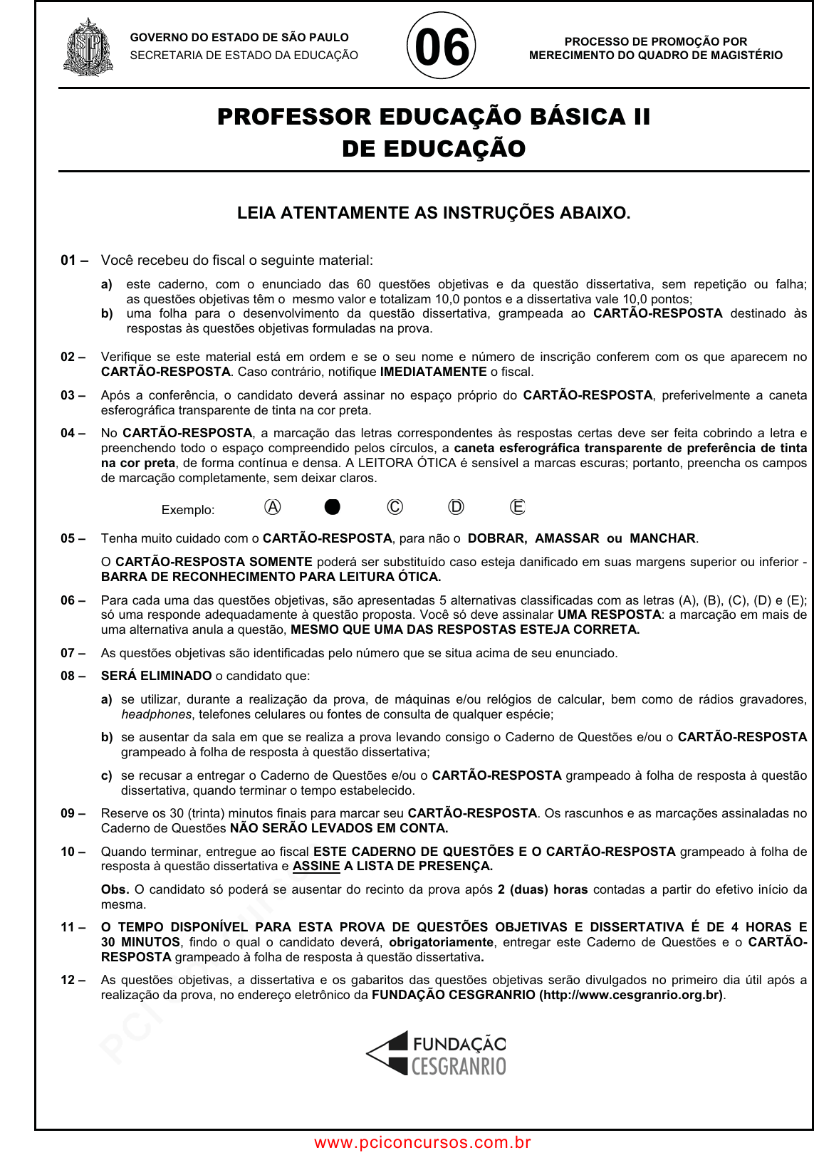 pcimarkpci MDAwMDowMDAwOjAwMDA6MDAwMDowMDAwOmZmZmY6MzZlOTpjMjU5:TW9uLCAxMyBTZXAgMjAyMSAwNTo0MDoyNCAtMDMwMA== GOVERNO DO ESTADO DE SÃO PAULO SECRETARIA DE ESTADO DA EDUCAÇÃO PROCESSO DE PROMOÇÃO POR MERECIMENTO DO QUADRO DE MAGISTÉRIO PROFESSOR EDUCAÇÃO BÁSICA II DE EDUCAÇÃO LEIA ATENTAMENTE AS INSTRUÇÕES ABAIXO. 01 – Você recebeu do fiscal o seguinte material: a) este caderno, com o enunciado das 60 questões objetivas e da questão dissertativa, sem repetição ou falha; as questões objetivas têm o mesmo valor e totalizam 10,0 pontos e a dissertativa vale 10,0 pontos; b) uma folha para o desenvolvimento da questão dissertativa, grampeada ao CARTÃO-RESPOSTA destinado às respostas às questões objetivas formuladas na prova. 02 – Verifique se este material está em ordem e se o seu nome e número de inscrição conferem com os que aparecem no CARTÃO-RESPOSTA. Caso contrário, notifique IMEDIATAMENTE o fiscal. 03 – Após a conferência, o candidato deverá assinar no espaço próprio do CARTÃO-RESPOSTA, preferivelmente a caneta esferográfica transparente de tinta na cor preta. 04 – No CARTÃO-RESPOSTA, a marcação das letras correspondentes às respostas certas deve ser feita cobrindo a letra e preenchendo todo o espaço compreendido pelos círculos, a caneta esferográfica transparente de preferência de tinta na cor preta, de forma contínua e densa. A LEITORA ÓTICA é sensível a marcas escuras; portanto, preencha os campos de marcação completamente, sem deixar claros. Exemplo: 05 – Tenha muito cuidado com o CARTÃO-RESPOSTA, para não o DOBRAR, AMASSAR ou MANCHAR. O CARTÃO-RESPOSTA SOMENTE poderá ser substituído caso esteja danificado em suas margens superior ou inferior - BARRA DE RECONHECIMENTO PARA LEITURA ÓTICA. 06 – Para cada uma das questões objetivas, são apresentadas 5 alternativas classificadas com as letras (A), (B), (C), (D) e (E); só uma responde adequadamente à questão proposta. Você só deve assinalar UMA RESPOSTA: a marcação em mais de uma alternativa anula a questão, MESMO QUE UMA DAS RESPOSTAS ESTEJA CORRETA. 07 – As questões objetivas são identificadas pelo número que se situa acima de seu enunciado. 08 – SERÁ ELIMINADO o candidato que: a) se utilizar, durante a realização da prova, de máquinas e/ou relógios de calcular, bem como de rádios gravadores, headphones, telefones celulares ou fontes de consulta de qualquer espécie; b) se ausentar da sala em que se realiza a prova levando consigo o Caderno de Questões e/ou o CARTÃO-RESPOSTA grampeado à folha de resposta à questão dissertativa; c) se recusar a entregar o Caderno de Questões e/ou o CARTÃO-RESPOSTA grampeado à folha de resposta à questão dissertativa, quando terminar o tempo estabelecido. 09 – Reserve os 30 (trinta) minutos finais para marcar seu CARTÃO-RESPOSTA. Os rascunhos e as marcações assinaladas no Caderno de Questões NÃO SERÃO LEVADOS EM CONTA. 10 – Quando terminar, entregue ao fiscal ESTE CADERNO DE QUESTÕES E O CARTÃO-RESPOSTA grampeado à folha de resposta à questão dissertativa e ASSINE A LISTA DE PRESENÇA. Obs. O candidato só poderá se ausentar do recinto da prova após 2 (duas) horas contadas a partir do efetivo início da mesma. 11 – O TEMPO DISPONÍVEL PARA ESTA PROVA DE QUESTÕES OBJETIVAS E DISSERTATIVA É DE 4 HORAS E 30 MINUTOS, findo o qual o candidato deverá, obrigatoriamente, entregar este Caderno de Questões e o CARTÃO- RESPOSTA grampeado à folha de resposta à questão dissertativa. 12 – As questões objetivas, a dissertativa e os gabaritos das questões objetivas serão divulgados no primeiro dia útil após a realização da prova, no endereço eletrônico da FUNDAÇÃO CESGRANRIO (http://www.cesgranrio.org.br). 06 www.pciconcursos.com.br pcimarkpci MDAwMDowMDAwOjAwMDA6MDAwMDowMDAwOmZmZmY6MzZlOTpjMjU5:TW9uLCAxMyBTZXAgMjAyMSAwNTo0MDoyNCAtMDMwMA== � � �2 PEB�II�–�PARTE�GERAL� PEB II PARTE GERAL 1 De modo mais abrangente, o que se espera que o aluno demonstre, ao término da escolaridade básica, (A) competências e habilidades para leitura de diferentes mídias. (B) domínio de algoritmos computacionais e de uma língua estrangeira. (C) competências para transformar informação em conhecimento e saber utilizá-lo em diferentes contextos. (D) domínio das novas tecnologias exigidas pelo mundo do trabalho. (E) domínio das técnicas de comunicação e expressão. 2 Com base no princípio da centralidade atribuída ao desenvolvimento da competência leitora e escritora na Proposta Curricular do Estado de São Paulo, espera- se que os professores das diferentes disciplinas compreendam que apenas I os professores de Língua Portuguesa são os responsáveis por favorecer o desenvolvimento desta competência. II os professores das disciplinas da área de Ciências Humanas contribuem para o desenvolvimento desta competência por meio de interpretação de textos. III os professores de Matemática estão dispensados desta atribuição, pois só utilizam textos científicos. IV os professores das disciplinas da área de Ciências da Natureza estão habilitados a favorecer o desenvolvimento dessa competência por meio de textos científicos, entre outros. Estão corretas (A) I, apenas. (B) I, II e IV apenas. (C) I, III e IV apenas. (D) II, III e IV apenas. (E) I, II, III e IV. 3 Quando Luzia começou a trabalhar na escola estadual em que é professora, tinha muita dificuldade em identificar os papéis e funções dos diferentes profissionais. Hoje, depois de alguns anos na escola e de muitas reuniões, ela já compreende como se estabelecem as relações entre os diferentes agentes e suas responsabilidades. Assim, Luzia deve entender que (A) o professor coordenador é um profissional com autonomia para modificar o projeto pedagógico da escola sempre que achar necessário. (B) na escola, cabe ao professor a identificação das dificuldades do aluno, a definição dos conteúdos e 