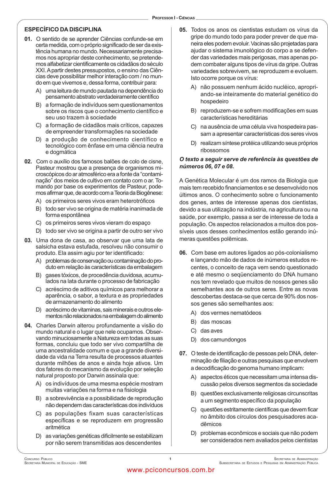 pcimarkpci MDAwMDowMDAwOjAwMDA6MDAwMDowMDAwOmZmZmY6MzZlOTpjMjU5:TW9uLCAxMyBTZXAgMjAyMSAwNjo0NTozMSAtMDMwMA== 1 SECRETARIA DE ADMINISTRAÇÃO SUBSECRETARIA DE ESTUDOS E PESQUISAS EM ADMINISTRAÇÃO PÚBLICA CONCURSO PÚBLICO SECRETARIA MUNICIPAL DE EDUCAÇÃO - SME PROFESSOR I - CIÊNCIAS ESPECÍFICO DA DISCIPLINA 01. O sentido de se aprender Ciências confunde-se em certa medida, com o próprio significado de ser da exis- tência humana no mundo. Necessariamente precisa- mos nos apropriar deste conhecimento, se pretende- mos alfabetizar cientificamente os cidadãos do século XXI. A partir destes pressupostos, o ensino das Ciên- cias deve possibilitar melhor interação com / no mun- do em que vivemos e, dessa forma, contribuir para: A) uma leitura de mundo pautada na dependência do pensamento abstrato verdadeiramente científico B) a formação de indivíduos sem questionamentos sobre os riscos que o conhecimento científico e seu uso trazem à sociedade C) a formação de cidadãos mais críticos, capazes de empreender transformações na sociedade D) a produção de conhecimento científico e tecnológico com ênfase em uma ciência neutra e dogmática 02. Com o auxílio dos famosos balões de colo de cisne, Pasteur mostrou que a presença de organismos mi- croscópicos do ar atmosférico era a fonte da “contami- nação” dos meios de cultivo em contato com o ar. To- mando por base os experimentos de Pasteur, pode- mos afirmar que, de acordo com a Teoria da Biogênese: A) os primeiros seres vivos eram heterotróficos B) todo ser vivo se origina de matéria inanimada de forma espontânea C) os primeiros seres vivos vieram do espaço D) todo ser vivo se origina a partir de outro ser vivo 03. Uma dona de casa, ao observar que uma lata de salsicha estava estufada, resolveu não consumir o produto. Ela assim agiu por ter identificado: A) problemas de conservação ou contaminação do pro- duto em relação às características da embalagem B) gases tóxicos, de procedência duvidosa, acumu- lados na lata durante o processo de fabricação C) acréscimo de aditivos químicos para melhorar a aparência, o sabor, a textura e as propriedades de armazenamento do alimento D) acréscimo de vitaminas, sais minerais e outros ele- mentos não relacionados na embalagem do alimento 04. Charles Darwin alterou profundamente a visão do mundo natural e o lugar que nele ocupamos. Obser- vando minuciosamente a Natureza em todas as suas formas, concluiu que todo ser vivo compartilha de uma ancestralidade comum e que a grande diversi- dade da vida na Terra resulta de processos atuantes durante milhões de anos e ainda hoje ativos. Um dos fatores do mecanismo da evolução por seleção natural proposto por Darwin assinala que: A) os indivíduos de uma mesma espécie mostram muitas variações na forma e na fisiologia B) a sobrevivência e a possibilidade de reprodução não dependem das características dos indivíduos C) as populações fixam suas características específicas e se reproduzem em progressão aritmética D) as variações genéticas dificilmente se estabilizam por não serem transmitidas aos descendentes 05. Todos os anos os cientistas estudam os vírus da gripe do mundo todo para poder prever de que ma- neira eles podem evoluir. Vacinas são projetadas para ajudar o sistema imunológico do corpo a se defen- der das variedades mais perigosas, mas apenas po- dem combater alguns tipos de vírus da gripe. Outras variedades sobrevivem, se reproduzem e evoluem. Isto ocorre porque os vírus: A) não possuem nenhum ácido nucléico, apropri- ando-se inteiramente do material genético do hospedeiro B) reproduzem-se e sofrem modificações em suas características hereditárias C) na ausência de uma célula viva hospedeira pas- sam a apresentar características dos seres vivos D) realizam síntese protéica utilizando seus próprios ribossomos O texto a seguir serve de referência às questões de números 06, 07 e 08. A Genética Molecular é um dos ramos da Biologia que mais tem recebido financiamentos e se desenvolvido nos últimos anos. O conhecimento sobre o funcionamento dos genes, antes de interesse apenas dos cientistas, devido a sua utilização na indústria, na agricultura ou na saúde, por exemplo, passa a ser de interesse de toda a população. Os aspectos relacionados a muitos dos pos- síveis usos desses conhecimentos estão gerando inú- meras questões polêmicas. 06. Com base em autores ligados ao pós-colonialismo e lançando mão de dados de inúmeros estudos re- centes, o conceito de raça vem sendo questionado e até mesmo o seqüenciamento do DNA humano nos tem revelado que muitos de nossos genes são semelhantes aos de outros seres. Entre as novas descobertas destaca-se que cerca de 90% dos nos- sos genes são semelhantes aos: A) dos vermes nematódeos B) das moscas C) das aves D) dos camundongos 07. O teste de identificação de pessoas pelo DNA, deter- minação de filiação e outras pesquisas que envolvem a decodificação do genoma humano implicam: A) aspectos éticos que necessitam uma intensa dis- cussão pelos diversos segmentos da sociedade B) questões exclusivamente religiosas circunscritas a um segmento específico da população C) questões estritamente científicas que devem ficar no âmbito dos círculos dos pesquisadores aca- dêmicos D) problemas econômicos e sociais que não podem ser considerados nem avaliados pelos cientistas www.pciconcursos.com.br pcimarkpci MDAwMDowMDAwOjAwMDA6MDAwMDowMDAwOmZmZmY6MzZlOTpjMjU5:TW9uLCAxMyBTZXAgMjAyMSAwNjo0NTozMSAtMDMwMA== 2 CONCURSO PÚBLICO SECRETARIA MUNICIPAL DE EDUCAÇÃO - SME SECRETARIA DE ADMINISTRAÇÃO SUBSECRETARIA DE ESTUDOS E PESQUISAS EM ADMINISTRAÇÃO PÚBLICA PROFESSOR I - CIÊNCIAS 08. O conhecimento sobre o funcionamento dos genes é fundamental para o estudo da Genética Molecular. Um gene é: A) uma molécula de RNA, isto é, um polímero de nucleotídeos, geralmente em cadeia simples B) um cr