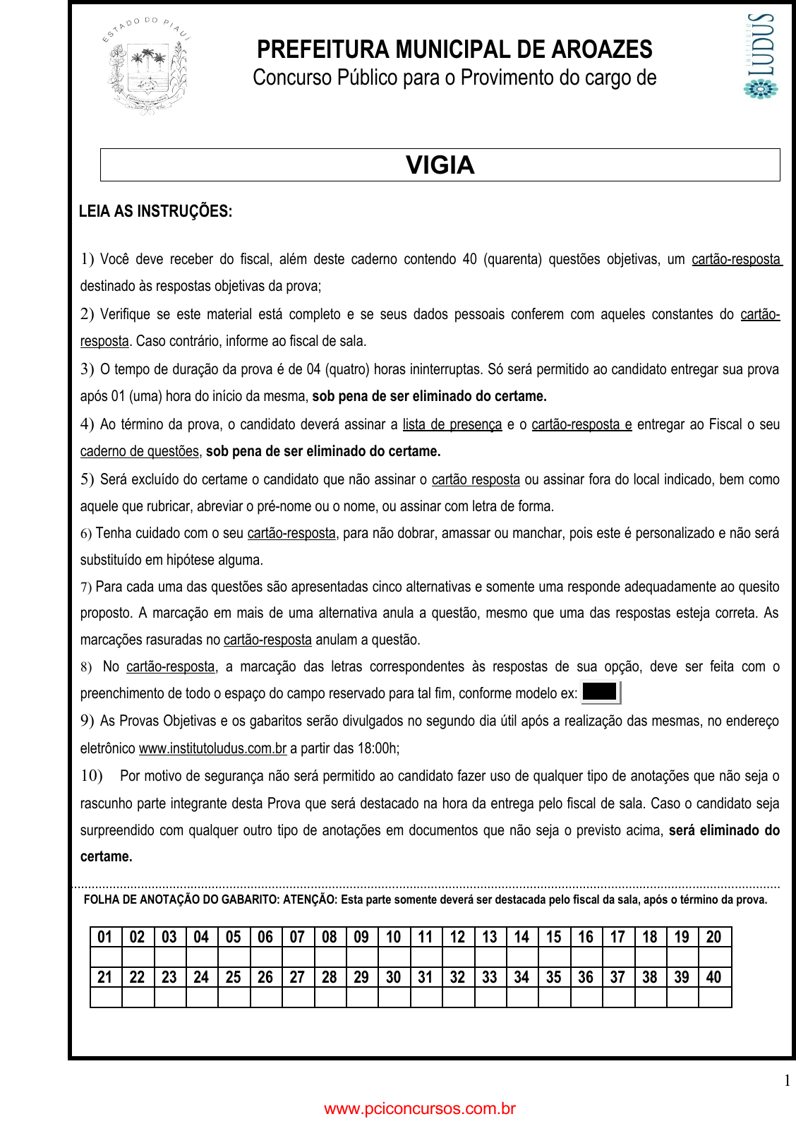 pcimarkpci MDAwMDowMDAwOjAwMDA6MDAwMDowMDAwOmZmZmY6MzZlOTpjMjU5:RnJpLCAxMCBTZXAgMjAyMSAxODo1MjoxNiAtMDMwMA== PREFEITURA MUNICIPAL DE AROAZES Concurso Público para o Provimento do cargo de VIGIA LEIA AS INSTRUÇÕES: 1) Você deve receber do fiscal, além deste caderno contendo 40 (quarenta) questões objetivas, um cartão-resposta destinado às respostas objetivas da prova; 2) Verifique se este material está completo e se seus dados pessoais conferem com aqueles constantes do cartão- resposta. Caso contrário, informe ao fiscal de sala. 3) O tempo de duração da prova é de 04 (quatro) horas ininterruptas. Só será permitido ao candidato entregar sua prova após 01 (uma) hora do início da mesma, sob pena de ser eliminado do certame. 4) Ao término da prova, o candidato deverá assinar a lista de presença e o cartão-resposta e entregar ao Fiscal o seu caderno de questões, sob pena de ser eliminado do certame. 5) Será excluído do certame o candidato que não assinar o cartão resposta ou assinar fora do local indicado, bem como aquele que rubricar, abreviar o pré-nome ou o nome, ou assinar com letra de forma. 6) Tenha cuidado com o seu cartão-resposta, para não dobrar, amassar ou manchar, pois este é personalizado e não será substituído em hipótese alguma. 7) Para cada uma das questões são apresentadas cinco alternativas e somente uma responde adequadamente ao quesito proposto. A marcação em mais de uma alternativa anula a questão, mesmo que uma das respostas esteja correta. As marcações rasuradas no cartão-resposta anulam a questão. 8) No cartão-resposta, a marcação das letras correspondentes às respostas de sua opção, deve ser feita com o preenchimento de todo o espaço do campo reservado para tal fim, conforme modelo ex: 9) As Provas Objetivas e os gabaritos serão divulgados no segundo dia útil após a realização das mesmas, no endereço eletrônico www.institutoludus.com.br a partir das 18:00h; 10) Por motivo de segurança não será permitido ao candidato fazer uso de qualquer tipo de anotações que não seja o rascunho parte integrante desta Prova que será destacado na hora da entrega pelo fiscal de sala. Caso o candidato seja surpreendido com qualquer outro tipo de anotações em documentos que não seja o previsto acima, será eliminado do certame. ......................................................................................................................................................................................................... FOLHA DE ANOTAÇÃO DO GABARITO: ATENÇÃO: Esta parte somente deverá ser destacada pelo fiscal da sala, após o término da prova. 01 02 03 04 05 06 07 08 09 10 11 12 13 14 15 16 17 18 19 20 21 22 23 24 25 26 27 28 29 30 31 32 33 34 35 36 37 38 39 40 1 www.pciconcursos.com.br pcimarkpci MDAwMDowMDAwOjAwMDA6MDAwMDowMDAwOmZmZmY6MzZlOTpjMjU5:RnJpLCAxMCBTZXAgMjAyMSAxODo1MjoxNiAtMDMwMA== EM BRANCO INSCRIÇÃO: ASSINATURA:______________________________________________________________________________ 2 www.pciconcursos.com.br pcimarkpci MDAwMDowMDAwOjAwMDA6MDAwMDowMDAwOmZmZmY6MzZlOTpjMjU5:RnJpLCAxMCBTZXAgMjAyMSAxODo1MjoxNiAtMDMwMA== LÍNGUA PORTUGUESA 1. Assinale a alternativa que apresenta erro de separação de sílabas: a) Har-mo-ni-a. b) Má-go-as. c) Sus-sur-ro. d) Rit-mo. e) Pseu-dô-ni-mo. 2. Assinale a alternativa que completa corretamente a frase abaixo: Elas _____________ tomaram todos os cuidados ______________, saindo ____________. a) próprio, possíveis, duas e duas. b) próprias, possível, de duas. c) próprias, possível, em duas. d) próprio, possíveis, de duas. e) próprias, possíveis, duas a duas. 3. Assinale a alternativa em que está correta a formação do plural: a) Júnior, júniors. b) Gavião, gaviães. c) Fuzil, fuzíveis. d) Mal, maus. e) Atlas, atlas. 4. Qual alternativa apresenta erro de acentuação: a) Café. b) Hífen. c) Amável d) Parabéns. e) Iguaçú. 5. Assinale a palavra que se encontra no aumentativo. a) Captação. b) Casarão. c) Iluminação. d) Irrigação. e) Diminuição. 6. Assinale a seguir a única palavra que se apresenta no feminino. a) Água. b) Equipamento. c) Lixo. d) Carro. e) Transporte. 7. A acentuação das palavras está corretamente justificada, EXCETO em: a) é: monossílaba tônica. b) pagará: oxítona terminada em “a”. c) ecológica: proparoxítona. d) história: proparoxítona. e) público: proparoxítona. 8. Complete as lacunas abaixo, empregando MAL e MAU e marque a alternativa correta. 1. Saiu ______ agasalhado. 2. Não saímos devido ao ______ tempo. 3. Fiz um _______ negócio. A ordem CORRETA, de cima para baixo é: a) mau, mal, mau. b) mal,mau,mau. c) mal, mal, mau. d) mal, mau, mal. e) mau, mau, mal. 9. Complete as palavras abaixo com CH ou X: 1. Coquelu ___ e. 2. En ___ ugar. 3. ___ icote. 4. Cai___ ote. 5. Trou ___ a. A ordem CORRETA, de cima para baixo é: a) x, ch, X, x, x. b) x, ch, Ch, x, x. c) ch, ch, X, x, ch. d) ch, x, Ch, x, x. e) x, ch, Ch, ch, x. 10. Assinale a alternativa INCORRETA, quanto à acentuação gráfica: a) Urubú. b) Páscoa. c) Enérgico. d) Tamanduá. e) Fóssil. www.pciconcursos.com.br pcimarkpci MDAwMDowMDAwOjAwMDA6MDAwMDowMDAwOmZmZmY6MzZlOTpjMjU5:RnJpLCAxMCBTZXAgMjAyMSAxODo1MjoxNiAtMDMwMA== MATEMÁTICA 11. Uma família consumiu 63L (sessenta e três litros) de leite em vinte e um dias. Qual foi o consumo médio diário de leite nesse período? a) 2,5 litros b) 2 litros c) 1,5 litros d) 1 litro e) 3 litros 12. Maurício tem 1,83 m e sua irmã Manuela tem 1,74 m. Qual a diferença de altura entre eles? a) 11 cm b) 9 cm c) 12 cm d) 8 cm e) 7 cm 13. Alessandro assistiu dois filmes com durações de 1 h e 46 min e 1 h e 54 min. Quanto tempo ela passou assistindo os dois filmes? a) 3 h e 40 min b) 3 h e 20 min c) 3 h e 10 min d) 3 h e 30 min e) 3 h e 50 min 14. Numa padaria foram separados trezentos e quarenta e dois pães em sacolas com seis pães em cada uma. Quantas sacolas foram utilizadas? a) 43 b)