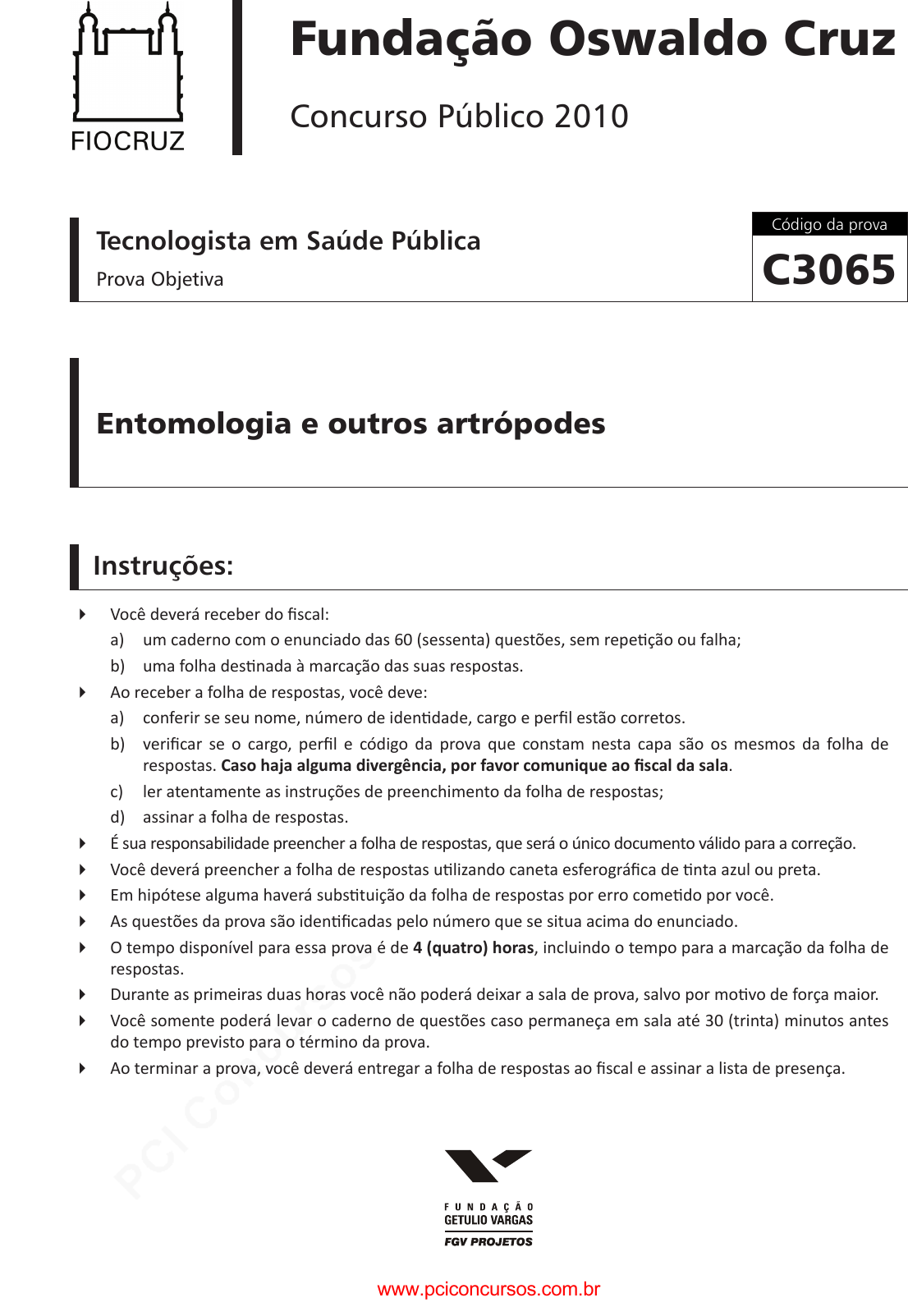 pcimarkpci MDAwMDowMDAwOjAwMDA6MDAwMDowMDAwOmZmZmY6MzZlOTpjMjU5:U2F0LCAxMSBTZXAgMjAyMSAwMDoyMTo0NyAtMDMwMA== Entomologia e outros artrópodes C3065 Código da prova Tecnologista em Saúde Pública Prova Objetiva Instruções: Você deverá receber do fiscal: a) um caderno com o enunciado das 60 (sessenta) questões, sem repetição ou falha; b) uma folha destinada à marcação das suas respostas. Ao receber a folha de respostas, você deve: a) conferir se seu nome, número de identidade, cargo e perfil estão corretos. b) verificar se o cargo, perfil e código da prova que constam nesta capa são os mesmos da folha de respostas. Caso haja alguma divergência, por favor comunique ao fiscal da sala. c) ler atentamente as instruções de preenchimento da folha de respostas; d) assinar a folha de respostas. É sua responsabilidade preencher a folha de respostas, que será o único documento válido para a correção. Você deverá preencher a folha de respostas utilizando caneta esferográfica de tinta azul ou preta. Em hipótese alguma haverá substituição da folha de respostas por erro cometido por você. As questões da prova são identificadas pelo número que se situa acima do enunciado. O tempo disponível para essa prova é de 4 (quatro) horas, incluindo o tempo para a marcação da folha de respostas. Durante as primeiras duas horas você não poderá deixar a sala de prova, salvo por motivo de força maior. Você somente poderá levar o caderno de questões caso permaneça em sala até 30 (trinta) minutos antes do tempo previsto para o término da prova. Ao terminar a prova, você deverá entregar a folha de respostas ao fiscal e assinar a lista de presença. Fundação Oswaldo Cruz Concurso Público 2010 www.pciconcursos.com.br pcimarkpci MDAwMDowMDAwOjAwMDA6MDAwMDowMDAwOmZmZmY6MzZlOTpjMjU5:U2F0LCAxMSBTZXAgMjAyMSAwMDoyMTo0NyAtMDMwMA== www.pciconcursos.com.br pcimarkpci MDAwMDowMDAwOjAwMDA6MDAwMDowMDAwOmZmZmY6MzZlOTpjMjU5:U2F0LCAxMSBTZXAgMjAyMSAwMDoyMTo0NyAtMDMwMA== Tecnologista em Saúde Pública – Entomologia e outros artrópodes Prova Objetiva – C3065 | 3 Língua Portuguesa Texto A era do sustentável Provavelmente a única chance de salvar efetivamente as florestas tropicais e aqueles que lá vivem é encontrar uma forma para que elas possam coexistir com a lógica do mundo moderno, inclusive no Brasil. Ambientalistas do mundo inteiro reconhecem, no íntimo, que nesses países de enormes desigualdades sociais, onde estão as últimas florestas tropicais intactas, a pressão sobre os recursos naturais é grande e as formas de fiscalização das eventuais leis de proteção são muito frágeis. Esta lógica significa uma função econômica para a floresta, explorando-a sem destruí-la e sem exaurir seus recursos naturais. É nesta linha que o uso sustentado das florestas ganhou grande força na consciência dos formadores de opinião que defendem o meio ambiente. É também neste caminho que várias experiências e inúmeras pesquisas estão fervilhando no momento, pelo Brasil e pelo mundo afora. Aqui, vemos o trabalho nas reservas extrativistas, o fornecimento de matéria-prima para a indústria de cosméticos e farmacêutica, a exploração de madeira certificada. O conceito de uso sustentado dos recursos naturais vai muito além das florestas, para hoje estar incorporado a todas as atividades da humanidade. O ressiclar, reutilizar, substituir e otimizar deixaram de ser “moda” para se tornarem obrigação de quem deseja garantir a qualidade das futuras gerações. (Peter Milko) 01 O pensamento nuclear do texto pode ser expresso do seguinte modo: (A) a exploração das florestas deve ser feita de maneira sustentável, sem que haja perdas futuras com a devastação da reserva natural. (B) para a salvação das florestas tropicais brasileiras, é indispensável definir uma estratégia que possa preservar ecossistemas, como a Mata Atlântica. (C) é indispensável, para a preservação das nossas florestas, a adoção de uma política preservacionista e do aprimoramento da fiscalização. (D) o Brasil precisa adotar urgentemente medidas que estejam no mesmo caminho das inúmeras pesquisas modernas. (E) o futuro de nossas florestas está dependente da adoção de medidas urgentes de preservação ambiental, que só pode ser obtida se for permitido um extrativismo limitado. 02 No título do texto ocorre o seguinte fato gramatical: (A) a modificação de classe gramatical do vocábulo sustentável. (B) o uso indevido de uma forma verbal como substantivo. (C) a utilização de um substantivo por outro. (D) o emprego inadequado de um adjetivo. (E) um erro de concordância nominal. 03 Como epígrafe deste texto aparece um pensamento de Lester Brown: “Uma sociedade sustentável é aquela que satisfaz suas necessidades, sem diminuir as perspectivas das gerações futuras”. O segmento do texto que se relaciona mais de perto a esse pensamento é: (A) “Provavelmente a única chance de salvar efetivamente as florestas tropicais e aqueles que lá vivem é encontrar uma forma para que elas possam coexistir com a lógica do mundo moderno, inclusive no Brasil”. (B) “Ambientalistas do mundo inteiro reconhecem, no íntimo, que nesses países de enormes desigualdades sociais, onde estão as últimas florestas tropicais intactas, a pressão sobre os recursos naturais é grande e as formas de fiscalização das eventuais leis de proteção são muito frágeis”. (C) “Esta lógica significa uma função econômica para a floresta, explorando-a sem destruí-la e sem exaurir seus recursos naturais”. (D) “É nesta linha que o uso sustentado das florestas ganhou grande força na consciência dos formadores de opinião que defendem o meio ambiente”. (E) “O conceito de uso sustentado dos recursos naturais vai muito além das florestas, para hoje estar incorporado a todas as atividades da humanidade”. 04 O texto é um editorial de uma revista intitulada Horizonte geográfico. 