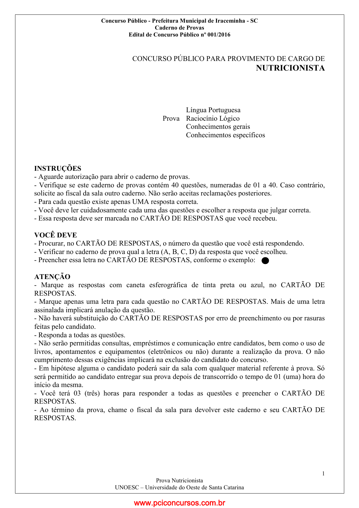 pcimarkpci MDAwMDowMDAwOjAwMDA6MDAwMDowMDAwOmZmZmY6MzZlOTpjMjU5:TW9uLCAxMyBTZXAgMjAyMSAxNjo0OTowNSAtMDMwMA== Concurso Público - Prefeitura Municipal de Iraceminha - SC Caderno de Provas Edital de Concurso Público nº 001/2016 1 Prova Nutricionista UNOESC – Universidade do Oeste de Santa Catarina A CONCURSO PÚBLICO PARA PROVIMENTO DE CARGO DE NUTRICIONISTA Prova Língua Portuguesa Raciocínio Lógico Conhecimentos gerais Conhecimentos específicos INSTRUÇÕES - Aguarde autorização para abrir o caderno de provas. - Verifique se este caderno de provas contém 40 questões, numeradas de 01 a 40. Caso contrário, solicite ao fiscal da sala outro caderno. Não serão aceitas reclamações posteriores. - Para cada questão existe apenas UMA resposta correta. - Você deve ler cuidadosamente cada uma das questões e escolher a resposta que julgar correta. - Essa resposta deve ser marcada no CARTÃO DE RESPOSTAS que você recebeu. VOCÊ DEVE - Procurar, no CARTÃO DE RESPOSTAS, o número da questão que você está respondendo. - Verificar no caderno de prova qual a letra (A, B, C, D) da resposta que você escolheu. - Preencher essa letra no CARTÃO DE RESPOSTAS, conforme o exemplo: ATENÇÃO - Marque as respostas com caneta esferográfica de tinta preta ou azul, no CARTÃO DE RESPOSTAS. - Marque apenas uma letra para cada questão no CARTÃO DE RESPOSTAS. Mais de uma letra assinalada implicará anulação da questão. - Não haverá substituição do CARTÃO DE RESPOSTAS por erro de preenchimento ou por rasuras feitas pelo candidato. - Responda a todas as questões. - Não serão permitidas consultas, empréstimos e comunicação entre candidatos, bem como o uso de livros, apontamentos e equipamentos (eletrônicos ou não) durante a realização da prova. O não cumprimento dessas exigências implicará na exclusão do candidato do concurso. - Em hipótese alguma o candidato poderá sair da sala com qualquer material referente à prova. Só será permitido ao candidato entregar sua prova depois de transcorrido o tempo de 01 (uma) hora do início da mesma. - Você terá 03 (três) horas para responder a todas as questões e preencher o CARTÃO DE RESPOSTAS. - Ao término da prova, chame o fiscal da sala para devolver este caderno e seu CARTÃO DE RESPOSTAS. www.pciconcursos.com.br pcimarkpci MDAwMDowMDAwOjAwMDA6MDAwMDowMDAwOmZmZmY6MzZlOTpjMjU5:TW9uLCAxMyBTZXAgMjAyMSAxNjo0OTowNSAtMDMwMA== Concurso Público - Prefeitura Municipal de Iraceminha - SC Caderno de Provas Edital de Concurso Público nº 001/2016 2 Prova Nutricionista UNOESC – Universidade do Oeste de Santa Catarina Língua Portuguesa Spike Lee decide boicotar o Oscar por ausência de atores negros¹ Quando a Academia de Artes e Ciências Cinematográficas anunciou os indicados ao Oscar em 2015, surpreendeu pelas ausências. Em meio aos indicados, faltavam mulheres e profissionais negros. Elas, apesar de ter feito bons filmes, não concorriam ao prêmio de melhor direção. Entre os atores, todas as faces tinham tez branca. A cerimônia de premiação de 2015 foi marcada por críticas a esse sistema, que negligencia talentos. Houve discursos inflamados, como o de Patrícia Arquette pela igualdade de gênero. Houve apresentações inspiradas, como a de John Legend cantando o tema de Selma – filme sobre a marcha de Martin Luther King em favor dos direitos civis dos negros. O recado era óbvio – o Oscar era uma premiação branca e masculina demais. Era preciso mudar. Não mudou. Um ano depois, o Oscar continua masculino e branco – como a maioria dos votantes da Academia, uma instituição lembrada pelo seu conservadorismo. Dos 20 atores e atrizes indicados por suas atuações como protagonistas ou coadjuvantes, nenhum é negro. O cineasta Spike Lee (Malcom X), decidiu se opor a essa falta de diversidade através de um boicote ao Oscar. Lee recebeu um Oscar honorário, pelo conjunto de sua obra, em novembro passado. Pelo Instagram, nesta segunda-feira (18), anunciou que ele e a esposa não vão participar da premiação em fevereiro, como forma de protesto. "Nós não podemos apoiar isso e eu não quero desrespeitar os meus amigos, o apresentador Chris Rock, o produtor Reggie Hudlin, a presidente [Cheryl Boone] Isaacs e a Academia. Mas, como é possível pelo segundo ano consecutivo todos os 20 candidatos na categoria de ator serem brancos? [...]. Não sabemos atuar?”, escreveu em sua conta na rede social. Na mensagem, Lee também diz que, todos os anos, quando os indicados são anunciados, seu telefone toca – são repórteres querendo saber como ele se sente com a ausência de talentos negros. “Eu gostaria de pedir que os repórteres perguntassem a todos os indicados brancos e aos chefes de estúdio como eles se sentem”. (¹ Redação Época 18/01/2015¹ - texto adaptado especialmente para essa prova). 01. O principal assunto do texto é: A) A ausência de mulheres e negros indicados ao Oscar 2015. B) Ano após ano, a premiação do Oscar é para brancos e atores masculinos. C) A discriminação de negros e mulheres na premiação do Oscar. D) O boicote do cineasta Lee - não se fará presente ao Oscar pela falta de diversidade. www.pciconcursos.com.br pcimarkpci MDAwMDowMDAwOjAwMDA6MDAwMDowMDAwOmZmZmY6MzZlOTpjMjU5:TW9uLCAxMyBTZXAgMjAyMSAxNjo0OTowNSAtMDMwMA== Concurso Público - Prefeitura Municipal de Iraceminha - SC Caderno de Provas Edital de Concurso Público nº 001/2016 3 Prova Nutricionista UNOESC – Universidade do Oeste de Santa Catarina 02. “O recado era óbvio”. A expressão, no primeiro parágrafo, refere-se: A) Às críticas que negligenciam talentos; discursos inflamados; apresentações inspiradas ao Oscar. B) Ao protesto de Lee, que pelo Instagram deu o recado que ele e a esposa não vão participar da premiação em fevereiro. C) Ao Oscar masculino e branco. D) As ausências de mulheres e negros. 03. Em relação ao texto, é correto o que se afirma em: A) Trata-se de um artigo de opinião, no qu