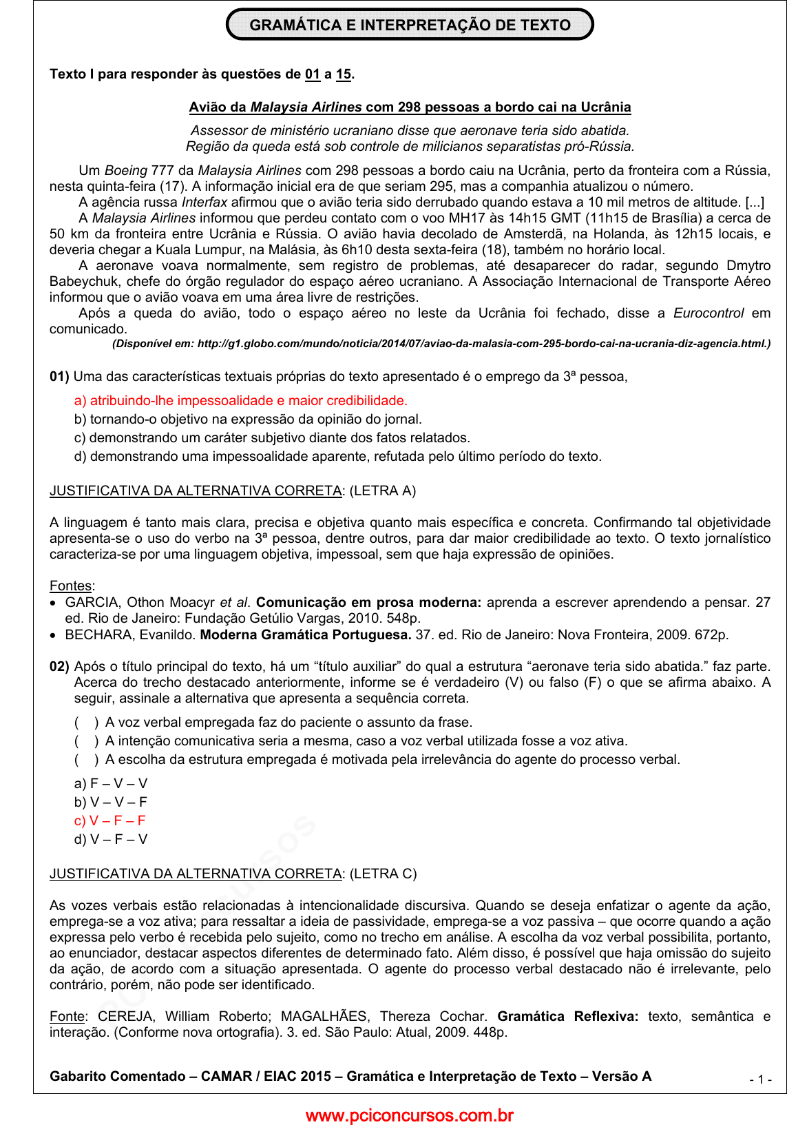 pcimarkpci MDAwMDowMDAwOjAwMDA6MDAwMDowMDAwOmZmZmY6MzZlOTpjMjU5:VHVlLCAxNCBTZXAgMjAyMSAwNDo1MzoyOCAtMDMwMA== Gabarito Comentado – CAMAR / EIAC 2015 – Gramática e Interpretação de Texto – Versão A - 1 - GRAMÁTICA E INTERPRETAÇÃO DE TEXTO Texto I para responder às questões de 01 a 15. Avião da Malaysia Airlines com 298 pessoas a bordo cai na Ucrânia Assessor de ministério ucraniano disse que aeronave teria sido abatida. Região da queda está sob controle de milicianos separatistas pró-Rússia. Um Boeing 777 da Malaysia Airlines com 298 pessoas a bordo caiu na Ucrânia, perto da fronteira com a Rússia, nesta quinta-feira (17). A informação inicial era de que seriam 295, mas a companhia atualizou o número. A agência russa Interfax afirmou que o avião teria sido derrubado quando estava a 10 mil metros de altitude. [...] A Malaysia Airlines informou que perdeu contato com o voo MH17 às 14h15 GMT (11h15 de Brasília) a cerca de 50 km da fronteira entre Ucrânia e Rússia. O avião havia decolado de Amsterdã, na Holanda, às 12h15 locais, e deveria chegar a Kuala Lumpur, na Malásia, às 6h10 desta sexta-feira (18), também no horário local. A aeronave voava normalmente, sem registro de problemas, até desaparecer do radar, segundo Dmytro Babeychuk, chefe do órgão regulador do espaço aéreo ucraniano. A Associação Internacional de Transporte Aéreo informou que o avião voava em uma área livre de restrições. Após a queda do avião, todo o espaço aéreo no leste da Ucrânia foi fechado, disse a Eurocontrol em comunicado. (Disponível em: http://g1.globo.com/mundo/noticia/2014/07/aviao-da-malasia-com-295-bordo-cai-na-ucrania-diz-agencia.html.) 01) Uma das características textuais próprias do texto apresentado é o emprego da 3ª pessoa, a) atribuindo-lhe impessoalidade e maior credibilidade. b) tornando-o objetivo na expressão da opinião do jornal. c) demonstrando um caráter subjetivo diante dos fatos relatados. d) demonstrando uma impessoalidade aparente, refutada pelo último período do texto. JUSTIFICATIVA DA ALTERNATIVA CORRETA: (LETRA A) A linguagem é tanto mais clara, precisa e objetiva quanto mais específica e concreta. Confirmando tal objetividade apresenta-se o uso do verbo na 3ª pessoa, dentre outros, para dar maior credibilidade ao texto. O texto jornalístico caracteriza-se por uma linguagem objetiva, impessoal, sem que haja expressão de opiniões. Fontes: GARCIA, Othon Moacyr et al. Comunicação em prosa moderna: aprenda a escrever aprendendo a pensar. 27 ed. Rio de Janeiro: Fundação Getúlio Vargas, 2010. 548p. BECHARA, Evanildo. Moderna Gramática Portuguesa. 37. ed. Rio de Janeiro: Nova Fronteira, 2009. 672p. 02) Após o título principal do texto, há um “título auxiliar” do qual a estrutura “aeronave teria sido abatida.” faz parte. Acerca do trecho destacado anteriormente, informe se é verdadeiro (V) ou falso (F) o que se afirma abaixo. A seguir, assinale a alternativa que apresenta a sequência correta. ( ) A voz verbal empregada faz do paciente o assunto da frase. ( ) A intenção comunicativa seria a mesma, caso a voz verbal utilizada fosse a voz ativa. ( ) A escolha da estrutura empregada é motivada pela irrelevância do agente do processo verbal. a) F – V – V b) V – V – F c) V – F – F d) V – F – V JUSTIFICATIVA DA ALTERNATIVA CORRETA: (LETRA C) As vozes verbais estão relacionadas à intencionalidade discursiva. Quando se deseja enfatizar o agente da ação, emprega-se a voz ativa; para ressaltar a ideia de passividade, emprega-se a voz passiva – que ocorre quando a ação expressa pelo verbo é recebida pelo sujeito, como no trecho em análise. A escolha da voz verbal possibilita, portanto, ao enunciador, destacar aspectos diferentes de determinado fato. Além disso, é possível que haja omissão do sujeito da ação, de acordo com a situação apresentada. O agente do processo verbal destacado não é irrelevante, pelo contrário, porém, não pode ser identificado. Fonte: CEREJA, William Roberto; MAGALHÃES, Thereza Cochar. Gramática Reflexiva: texto, semântica e interação. (Conforme nova ortografia). 3. ed. São Paulo: Atual, 2009. 448p. www.pciconcursos.com.br pcimarkpci MDAwMDowMDAwOjAwMDA6MDAwMDowMDAwOmZmZmY6MzZlOTpjMjU5:VHVlLCAxNCBTZXAgMjAyMSAwNDo1MzoyOCAtMDMwMA== Gabarito Comentado – CAMAR / EIAC 2015 – Gramática e Interpretação de Texto – Versão A - 2 - 03) “A Associação Internacional de Transporte Aéreo informou que o avião voava em uma área livre de restrições.” (4º§). A respeito do período anterior, assinale a afirmativa correta. a) O período é composto por duas orações coordenadas. b) Através do emprego da oração reduzida, a informação torna-se objetiva. c) O conteúdo da segunda oração coordenada justifica o conteúdo da primeira. d) A segunda oração é um exemplo de oração subordinada substantiva objetiva direta. JUSTIFICATIVA DA ALTERNATIVA CORRETA: (LETRA D) A oração substantiva pode desempenhar no período as mesmas funções que o substantivo exerce nas orações: sujeito, objeto direto, objeto indireto, predicativo, complemento nominal e aposto. Assim, de acordo com sua função, recebe as seguintes denominações: subjetiva, objetiva direta, objetiva indireta, predicativa, completiva nominal e apositiva. A oração subordinada substantiva objetiva direta, como no caso em análise, exerce a função de objeto direto da oração principal (Oração principal: “A Associação Internacional de Transporte Aéreo informou” – verbo transitivo direto; Oração subordinada substantiva objetiva direta: “que o avião voava em uma área livre de restrições”.). Fonte: CEREJA, William Roberto; MAGALHÃES, Thereza Cochar. Gramática Reflexiva: texto, semântica e interação. (Conforme nova ortografia). 3. ed. São Paulo: Atual, 2009. 448p. 04) O papel sintático exercido por palavras, expressões ou orações possui relevância te
