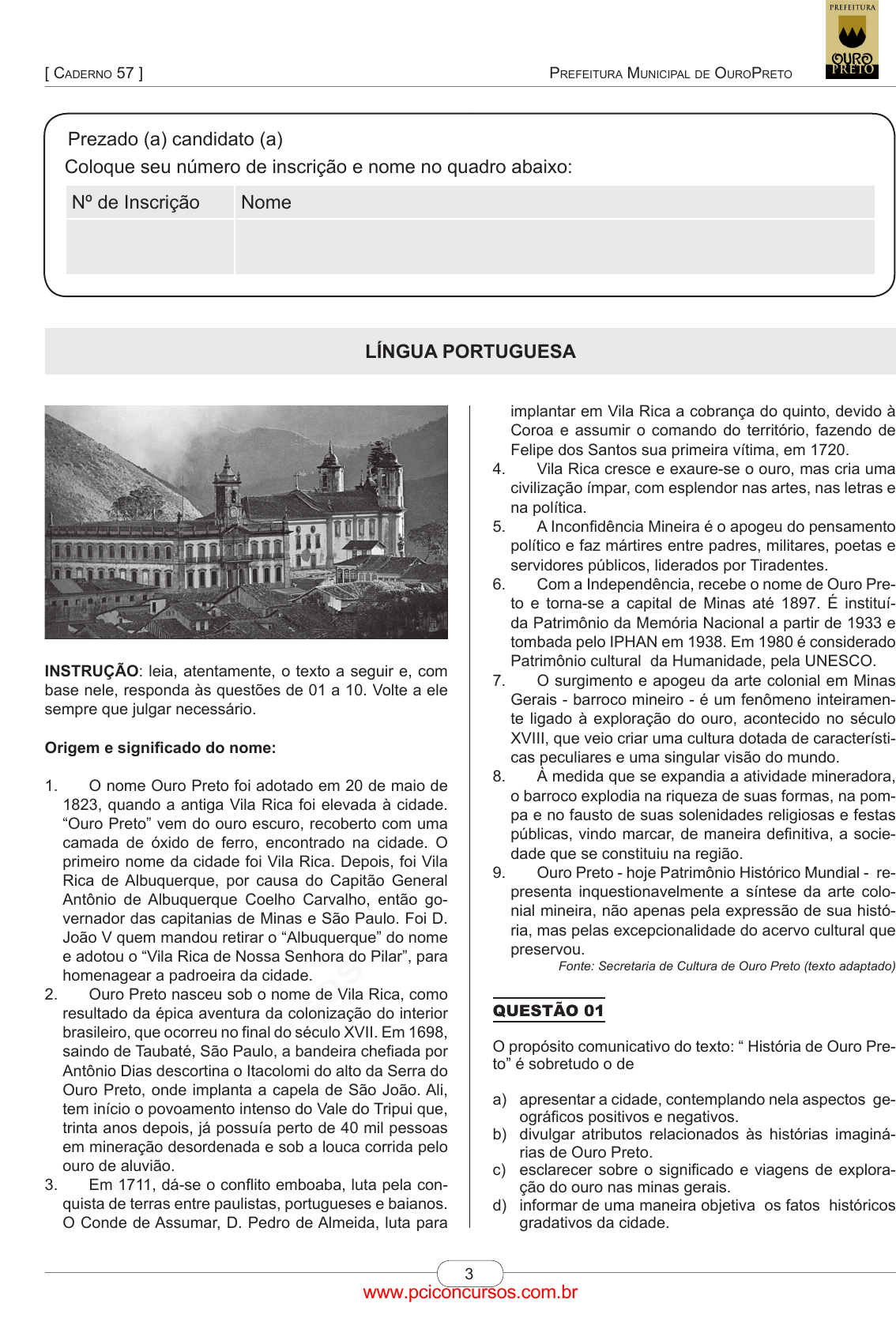 pcimarkpci MDAwMDowMDAwOjAwMDA6MDAwMDowMDAwOmZmZmY6MzZlOTpjMjU5:VHVlLCAxNCBTZXAgMjAyMSAwNDo1OToxMSAtMDMwMA== 3 Prefeitura MuniciPal de OurOPretO[ cadernO 57 ] LÍNGUA PORTUGUESA Prezado (a) candidato (a) Coloque seu número de inscrição e nome no quadro abaixo: Nº de Inscrição Nome INSTRUÇÃO: leia, atentamente, o texto a seguir e, com base nele, responda às questões de 01 a 10. Volte a ele sempre que julgar necessário. Origem e significado do nome: 1. O nome Ouro Preto foi adotado em 20 de maio de 1823, quando a antiga Vila Rica foi elevada à cidade. “Ouro Preto” vem do ouro escuro, recoberto com uma camada de óxido de ferro, encontrado na cidade. O primeiro nome da cidade foi Vila Rica. Depois, foi Vila Rica de Albuquerque, por causa do Capitão General Antônio de Albuquerque Coelho Carvalho, então go- vernador das capitanias de Minas e São Paulo. Foi D. João V quem mandou retirar o “Albuquerque” do nome e adotou o “Vila Rica de Nossa Senhora do Pilar”, para homenagear a padroeira da cidade. 2. Ouro Preto nasceu sob o nome de Vila Rica, como resultado da épica aventura da colonização do interior brasileiro, que ocorreu no final do século XVII. Em 1698, saindo de Taubaté, São Paulo, a bandeira chefiada por Antônio Dias descortina o Itacolomi do alto da Serra do Ouro Preto, onde implanta a capela de São João. Ali, tem início o povoamento intenso do Vale do Tripui que, trinta anos depois, já possuía perto de 40 mil pessoas em mineração desordenada e sob a louca corrida pelo ouro de aluvião. 3. Em 1711, dá-se o conflito emboaba, luta pela con- quista de terras entre paulistas, portugueses e baianos. O Conde de Assumar, D. Pedro de Almeida, luta para implantar em Vila Rica a cobrança do quinto, devido à Coroa e assumir o comando do território, fazendo de Felipe dos Santos sua primeira vítima, em 1720. 4. Vila Rica cresce e exaure-se o ouro, mas cria uma civilização ímpar, com esplendor nas artes, nas letras e na política. 5. A Inconfidência Mineira é o apogeu do pensamento político e faz mártires entre padres, militares, poetas e servidores públicos, liderados por Tiradentes. 6. Com a Independência, recebe o nome de Ouro Pre- to e torna-se a capital de Minas até 1897. É instituí- da Patrimônio da Memória Nacional a partir de 1933 e tombada pelo IPHAN em 1938. Em 1980 é considerado Patrimônio cultural da Humanidade, pela UNESCO. 7. O surgimento e apogeu da arte colonial em Minas Gerais - barroco mineiro - é um fenômeno inteiramen- te ligado à exploração do ouro, acontecido no século XVIII, que veio criar uma cultura dotada de característi- cas peculiares e uma singular visão do mundo. 8. À medida que se expandia a atividade mineradora, o barroco explodia na riqueza de suas formas, na pom- pa e no fausto de suas solenidades religiosas e festas públicas, vindo marcar, de maneira definitiva, a socie- dade que se constituiu na região. 9. Ouro Preto - hoje Patrimônio Histórico Mundial - re- presenta inquestionavelmente a síntese da arte colo- nial mineira, não apenas pela expressão de sua histó- ria, mas pelas excepcionalidade do acervo cultural que preservou. Fonte: Secretaria de Cultura de Ouro Preto (texto adaptado) QUESTÃO 01 O propósito comunicativo do texto: “ História de Ouro Pre- to” é sobretudo o de a) apresentar a cidade, contemplando nela aspectos ge- ográficos positivos e negativos. b) divulgar atributos relacionados às histórias imaginá- rias de Ouro Preto. c) esclarecer sobre o significado e viagens de explora- ção do ouro nas minas gerais. d) informar de uma maneira objetiva os fatos históricos gradativos da cidade. www.pciconcursos.com.br pcimarkpci MDAwMDowMDAwOjAwMDA6MDAwMDowMDAwOmZmZmY6MzZlOTpjMjU5:VHVlLCAxNCBTZXAgMjAyMSAwNDo1OToxMSAtMDMwMA== 4 [ cadernO 57 ] Prefeitura MuniciPal de OurOPretO QUESTÃO 02 Analise os seguintes trechos retirados do texto: I. Ouro Preto nasceu sob o nome de Vila Rica, como resultado da épica aventura da colonização do interior brasileiro, que ocorreu no final do século XVII. II. Em 1711, dá-se o conflito emboaba, luta pela conquis- ta de terras entre paulistas, portugueses e baianos. III. Vila Rica cresce e exaure-se o ouro, mas cria uma civilização ímpar, com esplendor nas artes, nas letras e na política. IV. Ouro Preto - hoje Patrimônio Histórico Mundial - re- presenta inquestionavelmente a síntese da arte colo- nial mineira, não apenas pela expressão de sua his- tória, mas pelas excepcionalidades do acervo cultural que preservou. As frases em que o vocábulo ou expressão grifada pode ser retirada, sem que haja alteração de sentido no texto, são. a) apenas as frases I e II. b) apenas as frases II e III. c) apenas as frases III e IV. d) apenas as frases I e IV. QUESTÃO 03 Para o desenvolvimento do texto, o articulador faz uso de vários recursos, EXCETO de a) dados históricos. b) inserção de discurso direto. c) fatos relevantes para a formação histórica. d) relato de acontecimentos. QUESTÃO 04 Baseando-se na estruturação do texto, a CORRETA orde- nação dos parágrafos se deu por meio de (da) a) tempo e espaço, de maneira a contextualizar os fatos narrados. b) contraste e paralelo, o que visa explicitar ideias não reveladas. c) exemplificação, para dar suporte um ponto de vista apresentado, anteriormente. d) apresentação de razões, uma vez que há vozes cre- denciadas no contexto. QUESTÃO 05 Em todas as alternativas, o termo sublinhado refere-se a uma palavra ou a uma expressão que o antecede no tex- to, EXCETO: a) “Ouro Preto” vem do ouro escuro, recoberto com uma camada de óxido de ferro, encontrado na cidade. b) Foi D. João V quem mandou retirar o “Albuquerque” do nome e adotou o “Vila Rica de Nossa Senhora do Pilar”, para homenagear a padroeira da cidade. c) Em 1980 é considerado Patrimônio cultural da Huma- nidade, pela UNESCO. d) Ouro Preto nasceu sob o nome de Vila Rica, como resultado da ép