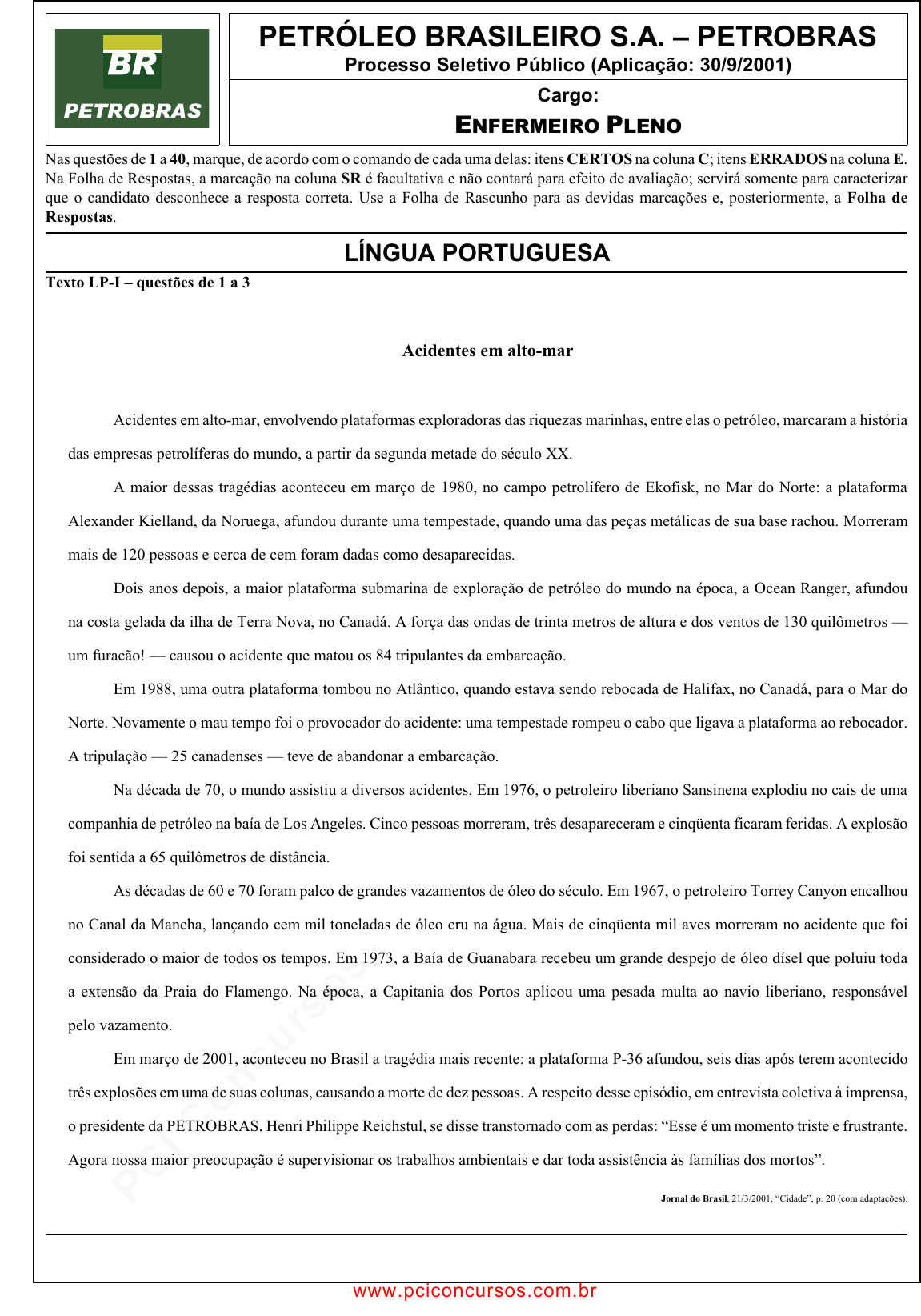 pcimarkpci MDAwMDowMDAwOjAwMDA6MDAwMDowMDAwOmZmZmY6MzZlOTpjMjU5:V2VkLCAxNSBTZXAgMjAyMSAxNDoyOToyMyAtMDMwMA== PETRÓLEO BRASILEIRO S.A. – PETROBRAS Processo Seletivo Público (Aplicação: 30/9/2001) Cargo: ENFERMEIRO PLENO Nas questões de 1 a 40, marque, de acordo com o comando de cada uma delas: itens CERTOS na coluna C; itens ERRADOS na coluna E. Na Folha de Respostas, a marcação na coluna SR é facultativa e não contará para efeito de avaliação; servirá somente para caracterizar que o candidato desconhece a resposta correta. Use a Folha de Rascunho para as devidas marcações e, posteriormente, a Folha de Respostas. LÍNGUA PORTUGUESA Texto LP-I – questões de 1 a 3 Acidentes em alto-mar Acidentes em alto-mar, envolvendo plataformas exploradoras das riquezas marinhas, entre elas o petróleo, marcaram a história das empresas petrolíferas do mundo, a partir da segunda metade do século XX. A maior dessas tragédias aconteceu em março de 1980, no campo petrolífero de Ekofisk, no Mar do Norte: a plataforma Alexander Kielland, da Noruega, afundou durante uma tempestade, quando uma das peças metálicas de sua base rachou. Morreram mais de 120 pessoas e cerca de cem foram dadas como desaparecidas. Dois anos depois, a maior plataforma submarina de exploração de petróleo do mundo na época, a Ocean Ranger, afundou na costa gelada da ilha de Terra Nova, no Canadá. A força das ondas de trinta metros de altura e dos ventos de 130 quilômetros — um furacão! — causou o acidente que matou os 84 tripulantes da embarcação. Em 1988, uma outra plataforma tombou no Atlântico, quando estava sendo rebocada de Halifax, no Canadá, para o Mar do Norte. Novamente o mau tempo foi o provocador do acidente: uma tempestade rompeu o cabo que ligava a plataforma ao rebocador. A tripulação — 25 canadenses — teve de abandonar a embarcação. Na década de 70, o mundo assistiu a diversos acidentes. Em 1976, o petroleiro liberiano Sansinena explodiu no cais de uma companhia de petróleo na baía de Los Angeles. Cinco pessoas morreram, três desapareceram e cinqüenta ficaram feridas. A explosão foi sentida a 65 quilômetros de distância. As décadas de 60 e 70 foram palco de grandes vazamentos de óleo do século. Em 1967, o petroleiro Torrey Canyon encalhou no Canal da Mancha, lançando cem mil toneladas de óleo cru na água. Mais de cinqüenta mil aves morreram no acidente que foi considerado o maior de todos os tempos. Em 1973, a Baía de Guanabara recebeu um grande despejo de óleo dísel que poluiu toda a extensão da Praia do Flamengo. Na época, a Capitania dos Portos aplicou uma pesada multa ao navio liberiano, responsável pelo vazamento. Em março de 2001, aconteceu no Brasil a tragédia mais recente: a plataforma P-36 afundou, seis dias após terem acontecido três explosões em uma de suas colunas, causando a morte de dez pessoas. A respeito desse episódio, em entrevista coletiva à imprensa, o presidente da PETROBRAS, Henri Philippe Reichstul, se disse transtornado com as perdas: “Esse é um momento triste e frustrante. Agora nossa maior preocupação é supervisionar os trabalhos ambientais e dar toda assistência às famílias dos mortos”. Jornal do Brasil, 21/3/2001, “Cidade”, p. 20 (com adaptações). www.pciconcursos.com.br pcimarkpci MDAwMDowMDAwOjAwMDA6MDAwMDowMDAwOmZmZmY6MzZlOTpjMjU5:V2VkLCAxNSBTZXAgMjAyMSAxNDoyOToyMyAtMDMwMA== UnB / CESPE – PETROBRAS Processo Seletivo Público (Aplicação: 30/9/2001) Cargo: Enfermeiro Pleno – 2 / 14 É permitida a reprodução, desde que citada a fonte. QUESTÃO 1 A partir da análise das idéias presentes no texto LP-I, julgue os itens a seguir. 1 Em relação aos acidentes narrados, os parágrafos iniciais do texto destacam as conseqüências lesivas à espécie humana, enquanto os parágrafos finais referem-se também aos prejuízos ao ambiente natural. 2 As causas dos fatos narrados residem no fato de que o ambiente marinho está mais sujeito a acidentes que o espaço terrestre, haja vista que o mar, historicamente, tem despertado no ser humano grande curiosidade e medo, motivando a busca de novas investigações. 3 Em todos os acidentes em alto-mar narrados, os motivos apresentados advêm de reações do ambiente marítimo à ação da espécie humana, irresponsável quando se trata de extrair riquezas das profundidades do mar. 4 Os fatos narrados dão conta de que o Hemisfério Norte está mais sujeito a acidentes em alto-mar que o Hemisfério Sul, devido ao grande desenvolvimento científico e tecnológico daquela região. 5 Quanto ao prejuízo humano, comparando o número de vítimas em acidentes envolvendo plataformas exploradoras de petróleo, a tragédia mais recente foi a menos grave da História. QUESTÃO 2 Considerando os princípios de tipologia textual, julgue os itens abaixo, relativos ao texto LP-I. 1 O texto estrutura-se em uma seqüência cronológica, em ordem crescente, do passado mais remoto aos dias atuais. 2 O texto apresentado estrutura-se a partir de dois componentes básicos: uma seqüência de acontecimentos e as implicações de tais ocorrências. 3 Mantendo uma estrutura dissertativa, o texto apresenta os fatos ocorridos e os argumentos que sustentam o posicionamento do autor acerca dos acontecimentos. 4 O texto descreve, em detalhes, os acidentes em alto-mar acontecidos na segunda metade do século XX, atribuindo sempre a fatores sobrenaturais as perdas sofridas. 5 O texto apresenta a estrutura de uma reportagem, em que predomina a narração de fatos, suas causas e conseqüências, sem grandes comentários avaliativos por parte do narrador. QUESTÃO 3 Os itens seguintes apresentam reescrituras dos parágrafos citados do texto LP-I. Julgue-os quanto à correção gramatical e à manutenção das idéias essenciais do respectivo texto. 1 Segundo parágrafo – Em março de 1980 houve a maior das tragédias, no campo petrolífero de Ekofisk, no Mar do Norte. Uma das peças metálica
