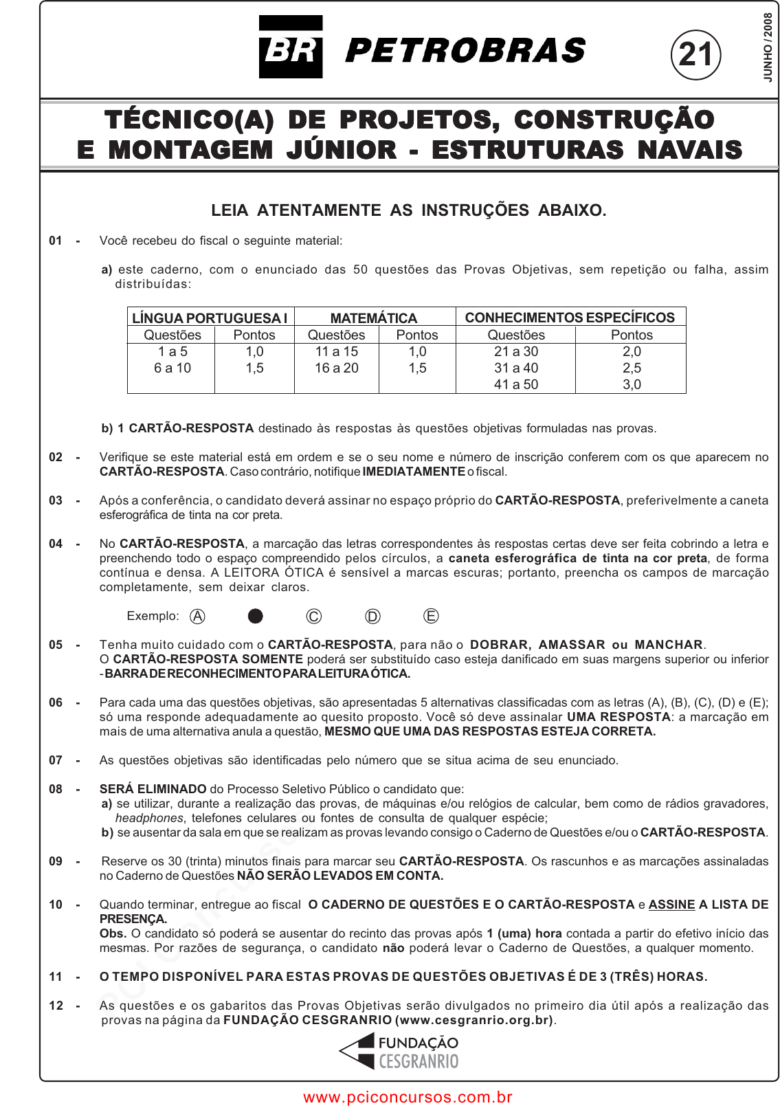 pcimarkpci MDAwMDowMDAwOjAwMDA6MDAwMDowMDAwOmZmZmY6MzZlOTpjMjU5:U2F0LCAxMSBTZXAgMjAyMSAwNjowMTo0OCAtMDMwMA== TÉCNICO(A) DE PRTÉCNICO(A) DE PRTÉCNICO(A) DE PRTÉCNICO(A) DE PRTÉCNICO(A) DE PROJETOJETOJETOJETOJETOSOSOSOSOS,,,,, CONSTR CONSTR CONSTR CONSTR CONSTRUÇÃOUÇÃOUÇÃOUÇÃOUÇÃO E MONTE MONTE MONTE MONTE MONTAAAAAGEM JÚNIOR - ESTRGEM JÚNIOR - ESTRGEM JÚNIOR - ESTRGEM JÚNIOR - ESTRGEM JÚNIOR - ESTRUTURAS NUTURAS NUTURAS NUTURAS NUTURAS NAAAAAVVVVVAISAISAISAISAIS JU N H O / 20 08 LEIA ATENTAMENTE AS INSTRUÇÕES ABAIXO. 01 - Você recebeu do fiscal o seguinte material: a) este caderno, com o enunciado das 50 questões das Provas Objetivas, sem repetição ou falha, assim distribuídas: b) 1 CARTÃO-RESPOSTA destinado às respostas às questões objetivas formuladas nas provas. 02 - Verifique se este material está em ordem e se o seu nome e número de inscrição conferem com os que aparecem no CARTÃO-RESPOSTA. Caso contrário, notifique IMEDIATAMENTE o fiscal. 03 - Após a conferência, o candidato deverá assinar no espaço próprio do CARTÃO-RESPOSTA, preferivelmente a caneta esferográfica de tinta na cor preta. 04 - No CARTÃO-RESPOSTA, a marcação das letras correspondentes às respostas certas deve ser feita cobrindo a letra e preenchendo todo o espaço compreendido pelos círculos, a caneta esferográfica de tinta na cor preta, de forma contínua e densa. A LEITORA ÓTICA é sensível a marcas escuras; portanto, preencha os campos de marcação completamente, sem deixar claros. Exemplo: 05 - Tenha muito cuidado com o CARTÃO-RESPOSTA, para não o DOBRAR, AMASSAR ou MANCHAR. O CARTÃO-RESPOSTA SOMENTE poderá ser substituído caso esteja danificado em suas margens superior ou inferior -BARRA DE RECONHECIMENTO PARA LEITURA ÓTICA. 06 - Para cada uma das questões objetivas, são apresentadas 5 alternativas classificadas com as letras (A), (B), (C), (D) e (E); só uma responde adequadamente ao quesito proposto. Você só deve assinalar UMA RESPOSTA: a marcação em mais de uma alternativa anula a questão, MESMO QUE UMA DAS RESPOSTAS ESTEJA CORRETA. 07 - As questões objetivas são identificadas pelo número que se situa acima de seu enunciado. 08 - SERÁ ELIMINADO do Processo Seletivo Público o candidato que: a) se utilizar, durante a realização das provas, de máquinas e/ou relógios de calcular, bem como de rádios gravadores, headphones, telefones celulares ou fontes de consulta de qualquer espécie; b) se ausentar da sala em que se realizam as provas levando consigo o Caderno de Questões e/ou o CARTÃO-RESPOSTA. 09 - Reserve os 30 (trinta) minutos finais para marcar seu CARTÃO-RESPOSTA. Os rascunhos e as marcações assinaladas no Caderno de Questões NÃO SERÃO LEVADOS EM CONTA. 10 - Quando terminar, entregue ao fiscal O CADERNO DE QUESTÕES E O CARTÃO-RESPOSTA e ASSINE A LISTA DE PRESENÇA. Obs. O candidato só poderá se ausentar do recinto das provas após 1 (uma) hora contada a partir do efetivo início das mesmas. Por razões de segurança, o candidato não poderá levar o Caderno de Questões, a qualquer momento. 11 - O TEMPO DISPONÍVEL PARA ESTAS PROVAS DE QUESTÕES OBJETIVAS É DE 3 (TRÊS) HORAS. 12 - As questões e os gabaritos das Provas Objetivas serão divulgados no primeiro dia útil após a realização das provas na página da FUNDAÇÃO CESGRANRIO (www.cesgranrio.org.br). A C D E 21 LÍNGUA PORTUGUESA I Questões 1 a 5 6 a 10 Pontos 1,0 1,5 MATEMÁTICA Questões 11 a 15 16 a 20 Pontos 1,0 1,5 CONHECIMENTOS ESPECÍFICOS Questões 21 a 30 31 a 40 41 a 50 Pontos 2,0 2,5 3,0 www.pciconcursos.com.br pcimarkpci MDAwMDowMDAwOjAwMDA6MDAwMDowMDAwOmZmZmY6MzZlOTpjMjU5:U2F0LCAxMSBTZXAgMjAyMSAwNjowMTo0OCAtMDMwMA== 2 TÉCNICO(A) DE PROJETOS, CONSTRUÇÃO E MONTAGEM JÚNIOR - ESTRUTURAS NAVAIS www.pciconcursos.com.br pcimarkpci MDAwMDowMDAwOjAwMDA6MDAwMDowMDAwOmZmZmY6MzZlOTpjMjU5:U2F0LCAxMSBTZXAgMjAyMSAwNjowMTo0OCAtMDMwMA== TÉCNICO(A) DE PROJETOS, CONSTRUÇÃO E MONTAGEM JÚNIOR - ESTRUTURAS NAVAIS 3 LÍNGUA PORTUGUESA I Como você lida com a frustração? A frustração pode ser para você um sinal para desistir ou um estímulo para continuar lutando. Vencedores são pessoas que aprenderam a fechar os ouvidos para as críticas e o desânimo, traduzindo as palavras duras para continuarem sua luta. Vencedores são pessoas que, pelo compromisso com uma visão ou uma fé, saíram de condições subumanas e, suportando frustração após frustração, se tornaram pessoas prósperas. Pode parecer contraditório, mas a chave do sucesso está na frustração maciça. Por exemplo, lembre-se de seus maiores sucessos... reveja os caminhos que você percorreu... perceba que antes de alcançar qualquer grande objetivo, sempre houve muitas frustrações, muitos fracassos. É você quem determina o valor final de sua experiência. Ter uma atitude visionária, além de recompensador, funciona como um antídoto para o medo do amanhã. A atitude de fé é o oposto da reação de medo. O medo é uma emoção necessár ia para defender-se de algo que ameaça a integridade física ou psicológica. Ele é indispensável para a sobrevivência, para lidar com crises e riscos. O problema é que o medo nem sempre vem de uma ameaça real. Algumas vezes brota de fantasias e crenças. Então, muitas das decisões que tomamos são para não ser um fracasso, não ficar sozinho, não perder a família... O não marca que a decisão era reativa, defensiva de uma ameaça que nem sempre era real. A partir do medo, desenhamos um mapa de onde não queremos chegar. Para que sua vida seja mais do que uma reação de medo você precisa fazer escolhas a partir de mapas novos. Os mapas construídos na infância não funcionam hoje. É preciso usar mapas com parâmetros de amanhã, do que você quer construir, e não com o que você não quer repetir. Entenda que o mapa da infância, que foi válido para chegar até aqui, não é o mesmo que pode te levar aonde você realmente deseja. A