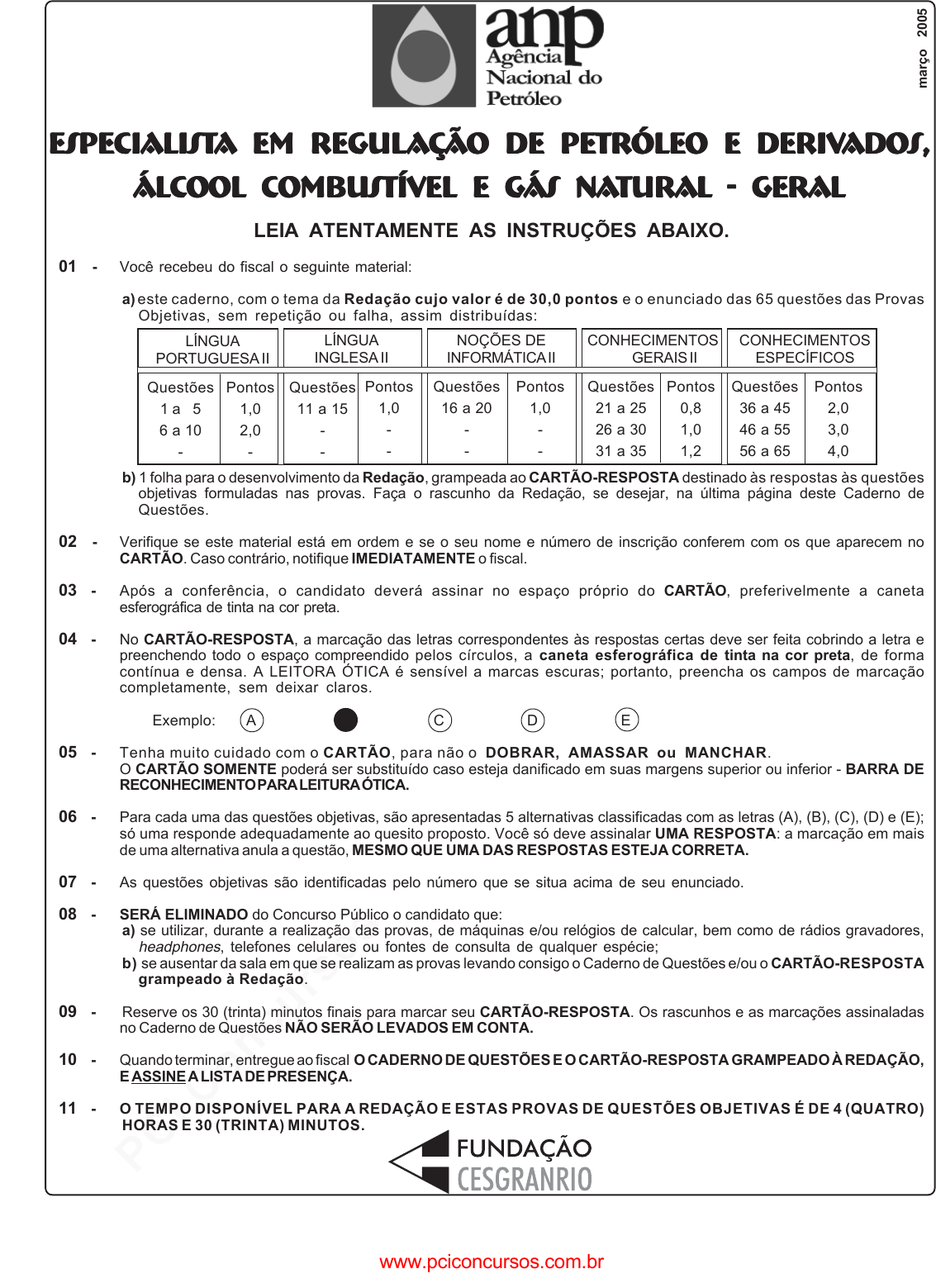 pcimarkpci MDAwMDowMDAwOjAwMDA6MDAwMDowMDAwOmZmZmY6MzZlOTpjMjU5:V2VkLCAxNSBTZXAgMjAyMSAyMjoyMzo0NCAtMDMwMA== ESPECIALISTESPECIALISTESPECIALISTESPECIALISTESPECIALISTA EM REGULA EM REGULA EM REGULA EM REGULA EM REGULAÇÃO DE PETRÓLEO E DERIVAÇÃO DE PETRÓLEO E DERIVAÇÃO DE PETRÓLEO E DERIVAÇÃO DE PETRÓLEO E DERIVAÇÃO DE PETRÓLEO E DERIVADOS,ADOS,ADOS,ADOS,ADOS, ÁLCOOL COMBUSTÍVEL E GÁS NAÁLCOOL COMBUSTÍVEL E GÁS NAÁLCOOL COMBUSTÍVEL E GÁS NAÁLCOOL COMBUSTÍVEL E GÁS NAÁLCOOL COMBUSTÍVEL E GÁS NATURTURTURTURTURAL - GERAL - GERAL - GERAL - GERAL - GERALALALALAL m ar ço 20 05 LEIA ATENTAMENTE AS INSTRUÇÕES ABAIXO. 01 - Você recebeu do fiscal o seguinte material: a) este caderno, com o tema da Redação cujo valor é de 30,0 pontos e o enunciado das 65 questões das Provas Objetivas, sem repetição ou falha, assim distribuídas: b) 1 folha para o desenvolvimento da Redação, grampeada ao CARTÃO-RESPOSTA destinado às respostas às questões objetivas formuladas nas provas. Faça o rascunho da Redação, se desejar, na última página deste Caderno de Questões. 02 - Verifique se este material está em ordem e se o seu nome e número de inscrição conferem com os que aparecem no CARTÃO. Caso contrário, notifique IMEDIATAMENTE o fiscal. 03 - Após a conferência, o candidato deverá assinar no espaço próprio do CARTÃO, preferivelmente a caneta esferográfica de tinta na cor preta. 04 - No CARTÃO-RESPOSTA, a marcação das letras correspondentes às respostas certas deve ser feita cobrindo a letra e preenchendo todo o espaço compreendido pelos círculos, a caneta esferográfica de tinta na cor preta, de forma contínua e densa. A LEITORA ÓTICA é sensível a marcas escuras; portanto, preencha os campos de marcação completamente, sem deixar claros. Exemplo: A B C D E 05 - Tenha muito cuidado com o CARTÃO, para não o DOBRAR, AMASSAR ou MANCHAR. O CARTÃO SOMENTE poderá ser substituído caso esteja danificado em suas margens superior ou inferior - BARRA DE RECONHECIMENTO PARA LEITURA ÓTICA. 06 - Para cada uma das questões objetivas, são apresentadas 5 alternativas classificadas com as letras (A), (B), (C), (D) e (E); só uma responde adequadamente ao quesito proposto. Você só deve assinalar UMA RESPOSTA: a marcação em mais de uma alternativa anula a questão, MESMO QUE UMA DAS RESPOSTAS ESTEJA CORRETA. 07 - As questões objetivas são identificadas pelo número que se situa acima de seu enunciado. 08 - SERÁ ELIMINADO do Concurso Público o candidato que: a) se utilizar, durante a realização das provas, de máquinas e/ou relógios de calcular, bem como de rádios gravadores, headphones, telefones celulares ou fontes de consulta de qualquer espécie; b) se ausentar da sala em que se realizam as provas levando consigo o Caderno de Questões e/ou o CARTÃO-RESPOSTA grampeado à Redação. 09 - Reserve os 30 (trinta) minutos finais para marcar seu CARTÃO-RESPOSTA. Os rascunhos e as marcações assinaladas no Caderno de Questões NÃO SERÃO LEVADOS EM CONTA. 10 - Quando terminar, entregue ao fiscal O CADERNO DE QUESTÕES E O CARTÃO-RESPOSTA GRAMPEADO À REDAÇÃO, E ASSINE A LISTA DE PRESENÇA. 11 - O TEMPO DISPONÍVEL PARA A REDAÇÃO E ESTAS PROVAS DE QUESTÕES OBJETIVAS É DE 4 (QUATRO) HORAS E 30 (TRINTA) MINUTOS. LÍNGUA INGLESA II Questões 11 a 15 - - Pontos 1,0 - - Questões 16 a 20 - - Pontos 1,0 - - NOÇÕES DE INFORMÁTICA II Questões 36 a 45 46 a 55 56 a 65 Pontos 2,0 3,0 4,0 CONHECIMENTOS ESPECÍFICOS CONHECIMENTOS GERAIS II Questões 21 a 25 26 a 30 31 a 35 Pontos 0,8 1,0 1,2 LÍNGUA PORTUGUESA II Questões 1 a 5 6 a 10 - Pontos 1,0 2,0 - www.pciconcursos.com.br pcimarkpci MDAwMDowMDAwOjAwMDA6MDAwMDowMDAwOmZmZmY6MzZlOTpjMjU5:V2VkLCAxNSBTZXAgMjAyMSAyMjoyMzo0NCAtMDMwMA== ESPECIALISTA EM REGULAÇÃO DE PETRÓLEO E DERIVADOS, ÁLCOOL COMBUSTÍVEL E GÁS NATURAL - GERAL 2 www.pciconcursos.com.br pcimarkpci MDAwMDowMDAwOjAwMDA6MDAwMDowMDAwOmZmZmY6MzZlOTpjMjU5:V2VkLCAxNSBTZXAgMjAyMSAyMjoyMzo0NCAtMDMwMA== 3 ESPECIALISTA EM REGULAÇÃO DE PETRÓLEO E DERIVADOS, ÁLCOOL COMBUSTÍVEL E GÁS NATURAL - GERAL REDAÇÃO A ANP e o Meio Ambiente A Agência Nacional do Petróleo tem por missão regular a indústria do petróleo e gás natural, tendo como diretriz a preservação do interesse público e do meio ambiente. A atuação da ANP vem ocorrendo em parceria com outros órgãos governamentais, universidades e demais agentes da sociedade que tenham competência e interesse em colaborar no estímulo à atividade econômica e preservação do meio ambiente. http://www.anp.gov.br/meio/anp_meio_ambiente.asp Considerando o trecho acima e o Texto I, apresentado na prova de Língua Portuguesa II, redija um texto dissertativo analisando o problema da poluição industrial, principalmente a decorrente do petróleo e seus derivados. Comente a sua participação, na qualidade de eventual futuro funcionário da ANP, no sentido de contribuir para que “os nossos verdes mares não deixem (nunca!) de refletir os raios de sol em suas ondas”. Seu texto deve ser escrito em prosa, com caneta esferográfica de tinta nas cores azul ou preta e ter o mínimo de 25 e o máximo de 30 linhas. Dê um título à sua redação e utilize a norma culta da língua. 3 www.pciconcursos.com.br pcimarkpci MDAwMDowMDAwOjAwMDA6MDAwMDowMDAwOmZmZmY6MzZlOTpjMjU5:V2VkLCAxNSBTZXAgMjAyMSAyMjoyMzo0NCAtMDMwMA== ESPECIALISTA EM REGULAÇÃO DE PETRÓLEO E DERIVADOS, ÁLCOOL COMBUSTÍVEL E GÁS NATURAL - GERAL 4 LÍNGUA PORTUGUESA II Texto I POLUIÇÃO! Sombras medonhas sobre os verdes mares Ainda existem lugares privilegiados – como certos pontos do litoral brasileiro – em que se conse- guem ver os mil matizes que o sol faz refletir nas ondas do mar: azul-regata, verde-jade, azul-celeste... verde- esmeralda. Mas, na maioria das praias próximas às grandes cidades, as águas parecem doentes: estão ficando paradas, cinzentas. Estão ficando imóveis, estáticas, plúmbeas, podres. N