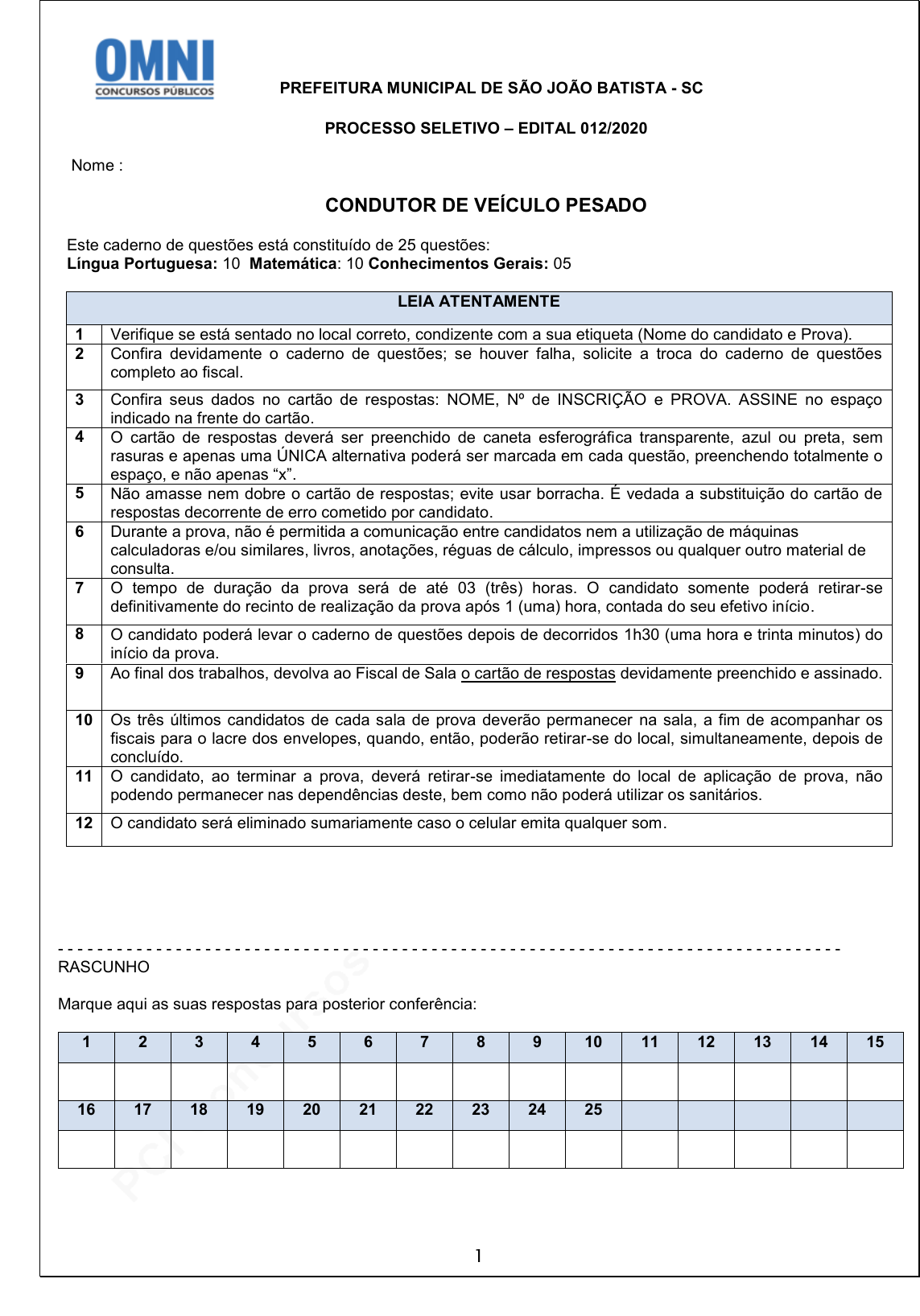 pcimarkpci MDAwMDowMDAwOjAwMDA6MDAwMDowMDAwOmZmZmY6MzZlOTpjMjU5:VGh1LCAxNiBTZXAgMjAyMSAxMjo1OToxMyAtMDMwMA== 1 PREFEITURA MUNICIPAL DE SÃO JOÃO BATISTA - SC PROCESSO SELETIVO – EDITAL 012/2020 Nome : CONDUTOR DE VEÍCULO PESADO Este caderno de questões está constituído de 25 questões: Língua Portuguesa: 10 Matemática: 10 Conhecimentos Gerais: 05 LEIA ATENTAMENTE 1 Verifique se está sentado no local correto, condizente com a sua etiqueta (Nome do candidato e Prova). 2 Confira devidamente o caderno de questões; se houver falha, solicite a troca do caderno de questões completo ao fiscal. 3 Confira seus dados no cartão de respostas: NOME, Nº de INSCRIÇÃO e PROVA. ASSINE no espaço indicado na frente do cartão. 4 O cartão de respostas deverá ser preenchido de caneta esferográfica transparente, azul ou preta, sem rasuras e apenas uma ÚNICA alternativa poderá ser marcada em cada questão, preenchendo totalmente o espaço, e não apenas “x”. 5 Não amasse nem dobre o cartão de respostas; evite usar borracha. É vedada a substituição do cartão de respostas decorrente de erro cometido por candidato. 6 Durante a prova, não é permitida a comunicação entre candidatos nem a utilização de máquinas calculadoras e/ou similares, livros, anotações, réguas de cálculo, impressos ou qualquer outro material de consulta. 7 O tempo de duração da prova será de até 03 (três) horas. O candidato somente poderá retirar-se definitivamente do recinto de realização da prova após 1 (uma) hora, contada do seu efetivo início. 8 O candidato poderá levar o caderno de questões depois de decorridos 1h30 (uma hora e trinta minutos) do início da prova. 9 Ao final dos trabalhos, devolva ao Fiscal de Sala o cartão de respostas devidamente preenchido e assinado. 10 Os três últimos candidatos de cada sala de prova deverão permanecer na sala, a fim de acompanhar os fiscais para o lacre dos envelopes, quando, então, poderão retirar-se do local, simultaneamente, depois de concluído. 11 O candidato, ao terminar a prova, deverá retirar-se imediatamente do local de aplicação de prova, não podendo permanecer nas dependências deste, bem como não poderá utilizar os sanitários. 12 O candidato será eliminado sumariamente caso o celular emita qualquer som. - - - - - - - - - - - - - - - - - - - - - - - - - - - - - - - - - - - - - - - - - - - - - - - - - - - - - - - - - - - - - - - - - - - - - - - - - - - - - - - - RASCUNHO Marque aqui as suas respostas para posterior conferência: 1 2 3 4 5 6 7 8 9 10 11 12 13 14 15 16 17 18 19 20 21 22 23 24 25 pcimarkpci MDAwMDowMDAwOjAwMDA6MDAwMDowMDAwOmZmZmY6MzZlOTpjMjU5:VGh1LCAxNiBTZXAgMjAyMSAxMjo1OToxMyAtMDMwMA== 2 RASCUNHO RASCUNHO pcimarkpci MDAwMDowMDAwOjAwMDA6MDAwMDowMDAwOmZmZmY6MzZlOTpjMjU5:VGh1LCAxNiBTZXAgMjAyMSAxMjo1OToxMyAtMDMwMA== 3 LÍNGUA PORTUGUESA Leia o texto abaixo e responda as questões de 1 a 5. “Quem é você?”, disse a Lagarta. Não era um começo de conversa muito estimulante. Alice respondeu um pouco tímida: “Eu… eu… no momento não sei, minha senhora… pelo menos sei quem eu era quando me levantei hoje de manhã, mas acho que devo ter mudado várias vezes desde então”. “O que você quer dizer?”, disse a Lagarta ríspida. “Explique-se!” “Acho que infelizmente não posso me explicar, minha senhora”, disse Alice, “porque já não sou eu, entende?” “Não entendo”, disse a Lagarta. “Receio não poder me expressar mais claramente”, respondeu Alice muito polida, “pois, para começo de conversa, não entendo a mim mesma. Ter muitos tamanhos num mesmo dia é muito confuso.” (Alice no País das Maravilhas p. 61) 1)Alice no País das Maravilhas, de Lewis Carroll, é, classicamente, um conto de fadas. Alguns elementos da história mostram isso. No trecho acima, vemos essa característica pelo seguinte fato: a) Alice, em seu diálogo, não consegue explicar quem é. b) Alice demonstra, que o diálogo não é algo estimulante. c) Alice conversa, diretamente, com uma lagarta. d) Nenhuma das alternativas. 2)Existe uma relação de temperamento muito distinta das personagens do diálogo. Fazendo a leitura, observa-se que há um contraste de temperamento entre Alice e a Lagarta. Esse contraste é definido pelas palavras: a) ríspida – polida. b) tímida – estimulante. c) tamanhos – confuso. d) Nenhuma das alternativas. 3)Em, “Alice respondeu um pouco tímida”, mantendo a relação de modo, da resposta de Alice, poderíamos utilizar: a) intimamente. b) timidamente. c) estimadamente. d) Nenhuma das alternativas. 4)Em, “pelo menos sei quem eu era quando me levantei”, o verbo em destaque, está conjugado em qual tempo do indicativo? a) Presente. b) Pretérito perfeito. c) Futuro do presente. d) Nenhuma das alternativas. 5)No trecho, “Receio não poder me expressar mais claramente”, Alice utilizou a palavra em destaque, para expressar: a)incerteza acompanhada de certo medo em relação a resultados ou consequências; apreensão, temor. b)hesitação entre opiniões diversas ou várias possibilidades de ação. c)afirmação falsa e desonrosa a respeito de alguém. d)Nenhuma das alternativas. 6)Leia: “Os crimes contra a honra são aqueles que prejudicam a moral, sendo considerados pelo legislador como de menor poten___ial ofen____ivo, razão pela qual as penas máximas não e___edem dois anos e no âmbito da lei dos juizados é aceita a transação, hipótese em que se evita o processo.” Fonte:https://ebradi.jusbrasil.com.br/artigos/42965235 4/qual-a-diferenca-entre-calunia-difamacao-e-injuria Assinale a alternativa que preenche respectivamente, as lacunas do texto: a)s – c – xc. b)c – s – xc. c)c – c – ss. d)Nenhuma das alternativas. 7)Ele dirige a empresa como o avô. O termo em destaque está incluso na frase para expressar: a)Alternativa. b)Adversidade. c)Comparação. d)Nenhuma das alternativas. 8)Devemos agir com agressividade, mas sem perder o norte. A pa
