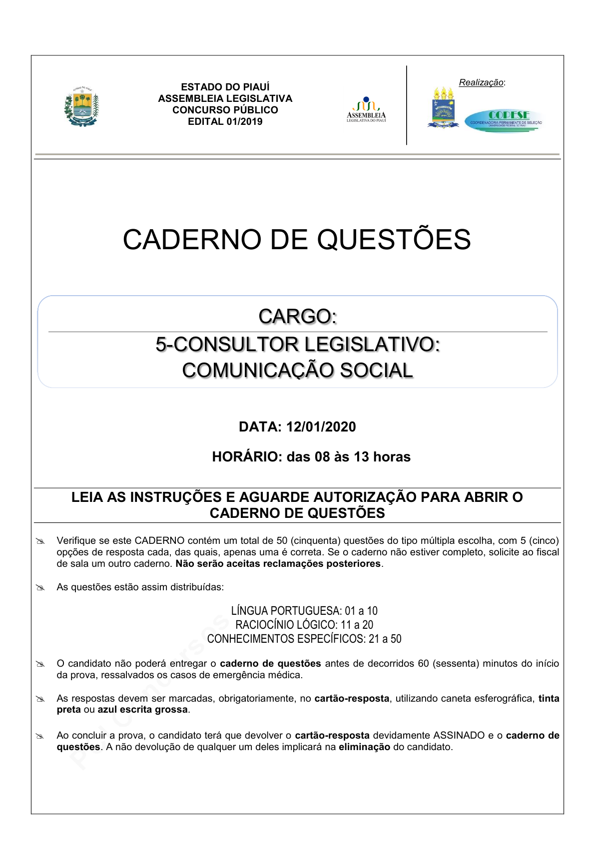 pcimarkpci MDAwMDowMDAwOjAwMDA6MDAwMDowMDAwOmZmZmY6MzZlOTpjMjU5:VGh1LCAxNiBTZXAgMjAyMSAxMzoyMTowNiAtMDMwMA== CADERNO DE QUESTÕES DATA: 12/01/2020 HORÁRIO: das 08 às 13 horas LEIA AS INSTRUÇÕES E AGUARDE AUTORIZAÇÃO PARA ABRIR O CADERNO DE QUESTÕES Verifique se este CADERNO contém um total de 50 (cinquenta) questões do tipo múltipla escolha, com 5 (cinco) opções de resposta cada, das quais, apenas uma é correta. Se o caderno não estiver completo, solicite ao fiscal de sala um outro caderno. Não serão aceitas reclamações posteriores. As questões estão assim distribuídas: LÍNGUA PORTUGUESA: 01 a 10 RACIOCÍNIO LÓGICO: 11 a 20 CONHECIMENTOS ESPECÍFICOS: 21 a 50 O candidato não poderá entregar o caderno de questões antes de decorridos 60 (sessenta) minutos do início da prova, ressalvados os casos de emergência médica. As respostas devem ser marcadas, obrigatoriamente, no cartão-resposta, utilizando caneta esferográfica, tinta preta ou azul escrita grossa. Ao concluir a prova, o candidato terá que devolver o cartão-resposta devidamente ASSINADO e o caderno de questões. A não devolução de qualquer um deles implicará na eliminação do candidato. ESTADO DO PIAUÍ ASSEMBLEIA LEGISLATIVA CONCURSO PÚBLICO EDITAL 01/2019 CARGO: 5-CONSULTOR LEGISLATIVO: COMUNICAÇÃO SOCIAL Realização: pcimarkpci MDAwMDowMDAwOjAwMDA6MDAwMDowMDAwOmZmZmY6MzZlOTpjMjU5:VGh1LCAxNiBTZXAgMjAyMSAxMzoyMTowNiAtMDMwMA== Concurso ALEPI – Edital 01/2019 – Cargo: Consultor Legislativo: Comunicação Social Página | 2 De acordo com o texto, analise e responda às questões 01 e 02: O modelo de financiamento eleitoral e sua legitimidade constitucional 01 02 03 04 05 06 07 08 09 10 11 12 13 14 15 16 17 18 19 20 21 22 23 24 25 26 27 28 29 30 31 32 33 34 35 36 37 38 39 40 41 42 43 As democracias maduras se caracterizam por um conjunto de práticas e valores aos quais se confere projeção institucional. O resultado dessa conformação se expressa num modelo de organização jurídico- política de Estado que se convencionou chamar de Estado Democrático de Direito. Por sua vez, compõe o núcleo desse modelo o princípio democrático e todos os direitos e liberdades que dele decorrem, sendo atribuído papel essencial à liberdade de voto do cidadão no processo eleitoral. A liberdade de voto do eleitor deve se fazer presente em todo processo eleitoral, concretizando-se tanto na liberdade de convencimento e informação por parte do eleitor como na liberdade de apresentação da candidatura. Assim, a formação da vontade política genuína exige a exclusão de todos os tipos de constrangimento e pressões que possam, de fora, impor-se ilegitimamente tanto aos eleitores quanto aos candidatos durante, e após, o período de campanha. Nesse contexto, ganha relevância o debate acerca do modelo de financiamento das campanhas que, em última instância, representa as condições materiais que proporcionam o exercício da atividade democrática pelos que almejam um cargo eletivo. Nas sociedades complexas, a arrecadação de recursos pelos candidatos é importante porque propicia a estrutura de campanha necessária para projetar a plataforma da candidatura por diferentes meios, visando atingir os diversos grupos sociais, o que pode influenciar decisivamente no resultado eleitoral final. Por isso, é latente a questão sobre o modo como as campanhas eleitorais são financiadas, desde os sujeitos interessados até os valores doados e arrecadados. A controvérsia reside na legitimidade e constitucionalidade da normativa infraconstitucional sobre o assunto e seu efetivo cumprimento. É na legislação infraconstitucional que se definem os mecanismos de angariação, limitação e controle dos recursos utilizados para financiar as campanhas eleitorais, sendo imperativo que respeitem o modelo democrático expresso na Carta Constitucional. O Conselho Federal da Ordem dos Advogados do Brasil ajuizou Ação Direta de Inconstitucionalidade, enfrentando o tema por meio da tentativa de declarar inconstitucionais. A OAB fundamentou o pleito nos vícios do processo eleitoral decorrentes do modo como se exercia o financiamento das campanhas por pessoas jurídicas e da oportunidade conferida aos cidadãos mais ricos de financiar a própria campanha sem limites. Sustentou que o modelo permissivo a estas práticas gera exacerbada dependência da política em relação ao poder econômico, ocasionando severa assimetria de recursos e, consequentemente, de possibilidade de êxito, entre aqueles que dispõem de vultosas quantias financeiras para aplicar na estrutura de campanha e os demais que não possuem. Alegou-se que a incidência das normas atacadas desvirtuava o sentido próprio da atividade política num Estado que se pretenda Democrático, visto que permitiam uma influência desproporcional do poder econômico no pleito eleitoral em favor daqueles com maior acesso a recursos materiais. Seria a primazia dos interesses do capital em detrimento dos interesses da sociedade civil organizada, resultando na dominância de interesses economicamente hegemônicos primeiramente na arena eleitoral e, posteriormente, no exercício das funções políticas e administrativas por aqueles que foram eleitos. Enfim, a influência das empresas no modo com se desenhava consistiria em prática sucedânea ao coronelismo da Velha República que, por atingir o núcleo do princípio democrático, deve ser contida pela atuação jurisdicional. Ademais, o modelo no qual os candidatos recebem recursos de pessoas físicas promove aproximação do cidadão com o processo eleitoral. A Carta Constitucional de 1988 veda a influência excessiva do poder econômico no processo eleitoral, mas, para alguns, isto deve ocorrer por meio de normatizações e do processo legislativo, enquanto a maioria considerou o modelo vigente para doação por empresas um elemento definitivo para contribuir com a defasagem democrática do Brasil. (Marcus Vinicius 
