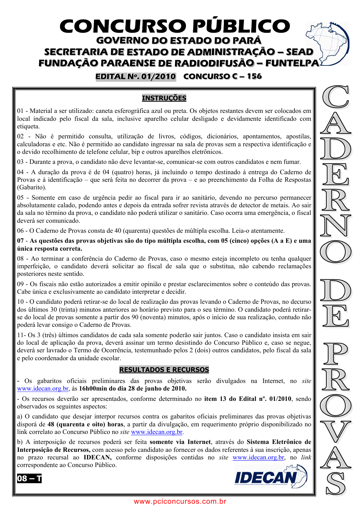 pcimarkpci MDAwMDowMDAwOjAwMDA6MDAwMDowMDAwOmZmZmY6MzZlOTpjMjU5:VGh1LCAxNiBTZXAgMjAyMSAxNTowMDozNyAtMDMwMA== GGGOOOVVVEEERRRNNNOOO DDDOOO EEESSSTTTAAADDDOOO DDDOOO PPPAAARRRÁÁÁ SSSEEECCCRRREEETTTAAARRRIIIAAA DDDEEE EEESSSTTTAAADDDOOO DDDEEE AAADDDMMMIIINNNIIISSSTTTRRRAAAÇÇÇÃÃÃOOO ––– SSSEEEAAADDD FFFUUUNNNDDDAAAÇÇÇÃÃÃOOO PPPAAARRRAAAEEENNNSSSEEE DDDEEE R RRAAADDDIIIOOODDDIIIFFFUUUSSSÃÃÃOOO ––– FFFUUUNNNTTTEEELLLPPPAAA EEEDDDIIITTTAAALLL NNNººº... 000111///222000111000 CCCOOONNNCCCUUURRRSSSOOO CCC ––– 111555666 INSTRUÇÕES 01 - Material a ser utilizado: caneta esferográfica azul ou preta. Os objetos restantes devem ser colocados em local indicado pelo fiscal da sala, inclusive aparelho celular desligado e devidamente identificado com etiqueta. 02 - Não é permitido consulta, utilização de livros, códigos, dicionários, apontamentos, apostilas, calculadoras e etc. Não é permitido ao candidato ingressar na sala de provas sem a respectiva identificação e o devido recolhimento de telefone celular, bip e outros aparelhos eletrônicos. 03 - Durante a prova, o candidato não deve levantar-se, comunicar-se com outros candidatos e nem fumar. 04 - A duração da prova é de 04 (quatro) horas, já incluindo o tempo destinado à entrega do Caderno de Provas e à identificação – que será feita no decorrer da prova – e ao preenchimento da Folha de Respostas (Gabarito). 05 - Somente em caso de urgência pedir ao fiscal para ir ao sanitário, devendo no percurso permanecer absolutamente calado, podendo antes e depois da entrada sofrer revista através de detector de metais. Ao sair da sala no término da prova, o candidato não poderá utilizar o sanitário. Caso ocorra uma emergência, o fiscal deverá ser comunicado. 06 - O Caderno de Provas consta de 40 (quarenta) questões de múltipla escolha. Leia-o atentamente. 07 - As questões das provas objetivas são do tipo múltipla escolha, com 05 (cinco) opções (A a E) e uma única resposta correta. 08 - Ao terminar a conferência do Caderno de Provas, caso o mesmo esteja incompleto ou tenha qualquer imperfeição, o candidato deverá solicitar ao fiscal de sala que o substitua, não cabendo reclamações posteriores neste sentido. 09 - Os fiscais não estão autorizados a emitir opinião e prestar esclarecimentos sobre o conteúdo das provas. Cabe única e exclusivamente ao candidato interpretar e decidir. 10 - O candidato poderá retirar-se do local de realização das provas levando o Caderno de Provas, no decurso dos últimos 30 (trinta) minutos anteriores ao horário previsto para o seu término. O candidato poderá retirar- se do local de provas somente a partir dos 90 (noventa) minutos, após o início de sua realização, contudo não poderá levar consigo o Caderno de Provas. 11- Os 3 (três) últimos candidatos de cada sala somente poderão sair juntos. Caso o candidato insista em sair do local de aplicação da prova, deverá assinar um termo desistindo do Concurso Público e, caso se negue, deverá ser lavrado o Termo de Ocorrência, testemunhado pelos 2 (dois) outros candidatos, pelo fiscal da sala e pelo coordenador da unidade escolar. RESULTADOS E RECURSOS - Os gabaritos oficiais preliminares das provas objetivas serão divulgados na Internet, no site www.idecan.org.br, às 16h00min do dia 28 de junho de 2010. - Os recursos deverão ser apresentados, conforme determinado no item 13 do Edital nº. 01/2010, sendo observados os seguintes aspectos: a) O candidato que desejar interpor recursos contra os gabaritos oficiais preliminares das provas objetivas disporá de 48 (quarenta e oito) horas, a partir da divulgação, em requerimento próprio disponibilizado no link correlato ao Concurso Público no site www.idecan.org.br. b) A interposição de recursos poderá ser feita somente via Internet, através do Sistema Eletrônico de Interposição de Recursos, com acesso pelo candidato ao fornecer os dados referentes à sua inscrição, apenas no prazo recursal ao IDECAN, conforme disposições contidas no site www.idecan.org.br, no link correspondente ao Concurso Público. 08 – T www.pciconcursos.com.br pcimarkpci MDAwMDowMDAwOjAwMDA6MDAwMDowMDAwOmZmZmY6MzZlOTpjMjU5:VGh1LCAxNiBTZXAgMjAyMSAxNTowMDozNyAtMDMwMA== CCCOOONNNCCCUUURRRSSSOOO PPPÚÚÚBBBLLLIIICCCOOO ––– SSSEEEAAADDD///FFFUUUNNNTTTEEELLLPPPAAA CONTADOR www.idecan.org.br atendimento@idecan.org.br - 2 - CCAARRGGOO:: CCOONNTTAADDOORR TEXTO: O Twitter e o cargo público O último levantamento do “Politweets” aponta que 391 políticos eleitos no Brasil já aderiram ao Twitter. O número não representa a parcela de políticos presentes na rede de microblogging, visto que muitos estão sem mandato e concorrem ao pleito neste ano. Além disso, há centenas de vereadores nas mais de seis mil cidades brasileiras que ingressam na rede sem se identificar como tal. Não há como negar, no entanto, que a cada dia, o Twitter ganha novos adeptos na política – seja para quem a faz diretamente ou simplesmente se interessa por ela – e que a ferramenta vem se consolidando como instrumento necessário para o exercício de qualquer cargo público. É uma maneira fácil e rápida de disseminar uma mensagem, socializar uma agenda, divulgar um espaço (blog, site, endereço em redes sociais) e estreitar o relacionamento com a população, permitindo que ela possa acompanhar o dia a dia de seus eleitos. O Twitter é, portanto, um facilitador para o encontro entre eleitor e eleito (ou postulante ao cargo). Não se trata de uma ferramenta que faça ganhar eleição, mas pode ajudar um candidato a perdê-la para um concorrente que esteja mais próximo do seu público, usando a rede de microblogging. O desafio é ser ouvido: escândalos afastam o cidadão da política. A principal função do Twitter na política é aproximar quem quer falar de quem quer ouvir e o grande desafio é ser ouvido. Com um sistema político complexo e de difícil com
