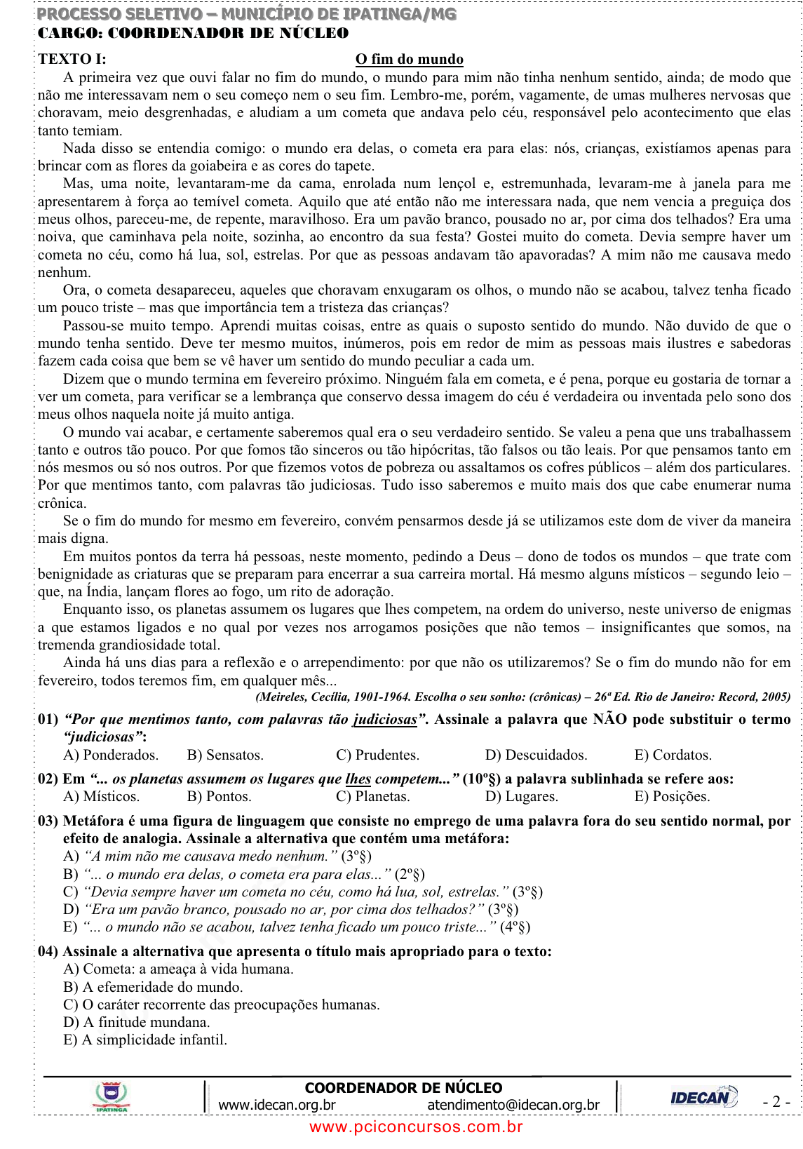 pcimarkpci MDAwMDowMDAwOjAwMDA6MDAwMDowMDAwOmZmZmY6MzZlOTpjMjU5:VGh1LCAxNiBTZXAgMjAyMSAxNTo1OTozNiAtMDMwMA== PPPRRROOOCCCEEESSSSSSOOO SSSEEELLLEEETTTIIIVVVOOO ––– MMMUUUNNNIIICCCÍÍÍPPPIIIOOO DDDEEE IIIPPPAAATTTIIINNNGGGAAA///MMMGGG COORDENADOR DE NÚCLEO www.idecan.org.br atendimento@idecan.org.br - 2 - CARGO: COORDENADOR DE NÚCLEO TEXTO I: O fim do mundo A primeira vez que ouvi falar no fim do mundo, o mundo para mim não tinha nenhum sentido, ainda; de modo que não me interessavam nem o seu começo nem o seu fim. Lembro-me, porém, vagamente, de umas mulheres nervosas que choravam, meio desgrenhadas, e aludiam a um cometa que andava pelo céu, responsável pelo acontecimento que elas tanto temiam. Nada disso se entendia comigo: o mundo era delas, o cometa era para elas: nós, crianças, existíamos apenas para brincar com as flores da goiabeira e as cores do tapete. Mas, uma noite, levantaram-me da cama, enrolada num lençol e, estremunhada, levaram-me à janela para me apresentarem à força ao temível cometa. Aquilo que até então não me interessara nada, que nem vencia a preguiça dos meus olhos, pareceu-me, de repente, maravilhoso. Era um pavão branco, pousado no ar, por cima dos telhados? Era uma noiva, que caminhava pela noite, sozinha, ao encontro da sua festa? Gostei muito do cometa. Devia sempre haver um cometa no céu, como há lua, sol, estrelas. Por que as pessoas andavam tão apavoradas? A mim não me causava medo nenhum. Ora, o cometa desapareceu, aqueles que choravam enxugaram os olhos, o mundo não se acabou, talvez tenha ficado um pouco triste – mas que importância tem a tristeza das crianças? Passou-se muito tempo. Aprendi muitas coisas, entre as quais o suposto sentido do mundo. Não duvido de que o mundo tenha sentido. Deve ter mesmo muitos, inúmeros, pois em redor de mim as pessoas mais ilustres e sabedoras fazem cada coisa que bem se vê haver um sentido do mundo peculiar a cada um. Dizem que o mundo termina em fevereiro próximo. Ninguém fala em cometa, e é pena, porque eu gostaria de tornar a ver um cometa, para verificar se a lembrança que conservo dessa imagem do céu é verdadeira ou inventada pelo sono dos meus olhos naquela noite já muito antiga. O mundo vai acabar, e certamente saberemos qual era o seu verdadeiro sentido. Se valeu a pena que uns trabalhassem tanto e outros tão pouco. Por que fomos tão sinceros ou tão hipócritas, tão falsos ou tão leais. Por que pensamos tanto em nós mesmos ou só nos outros. Por que fizemos votos de pobreza ou assaltamos os cofres públicos – além dos particulares. Por que mentimos tanto, com palavras tão judiciosas. Tudo isso saberemos e muito mais dos que cabe enumerar numa crônica. Se o fim do mundo for mesmo em fevereiro, convém pensarmos desde já se utilizamos este dom de viver da maneira mais digna. Em muitos pontos da terra há pessoas, neste momento, pedindo a Deus – dono de todos os mundos – que trate com benignidade as criaturas que se preparam para encerrar a sua carreira mortal. Há mesmo alguns místicos – segundo leio – que, na Índia, lançam flores ao fogo, um rito de adoração. Enquanto isso, os planetas assumem os lugares que lhes competem, na ordem do universo, neste universo de enigmas a que estamos ligados e no qual por vezes nos arrogamos posições que não temos – insignificantes que somos, na tremenda grandiosidade total. Ainda há uns dias para a reflexão e o arrependimento: por que não os utilizaremos? Se o fim do mundo não for em fevereiro, todos teremos fim, em qualquer mês... (Meireles, Cecília, 1901-1964. Escolha o seu sonho: (crônicas) – 26ª Ed. Rio de Janeiro: Record, 2005) 01) “Por que mentimos tanto, com palavras tão judiciosas”. Assinale a palavra que NÃO pode substituir o termo “judiciosas”: A) Ponderados. B) Sensatos. C) Prudentes. D) Descuidados. E) Cordatos. 02) Em “... os planetas assumem os lugares que lhes competem...” (10º§) a palavra sublinhada se refere aos: A) Místicos. B) Pontos. C) Planetas. D) Lugares. E) Posições. 03) Metáfora é uma figura de linguagem que consiste no emprego de uma palavra fora do seu sentido normal, por efeito de analogia. Assinale a alternativa que contém uma metáfora: A) “A mim não me causava medo nenhum.” (3º§) B) “... o mundo era delas, o cometa era para elas...” (2º§) C) “Devia sempre haver um cometa no céu, como há lua, sol, estrelas.” (3º§) D) “Era um pavão branco, pousado no ar, por cima dos telhados?” (3º§) E) “... o mundo não se acabou, talvez tenha ficado um pouco triste...” (4º§) 04) Assinale a alternativa que apresenta o título mais apropriado para o texto: A) Cometa: a ameaça à vida humana. B) A efemeridade do mundo. C) O caráter recorrente das preocupações humanas. D) A finitude mundana. E) A simplicidade infantil. www.pciconcursos.com.br pcimarkpci MDAwMDowMDAwOjAwMDA6MDAwMDowMDAwOmZmZmY6MzZlOTpjMjU5:VGh1LCAxNiBTZXAgMjAyMSAxNTo1OTozNiAtMDMwMA== PPPRRROOOCCCEEESSSSSSOOO SSSEEELLLEEETTTIIIVVVOOO ––– MMMUUUNNNIIICCCÍÍÍPPPIIIOOO DDDEEE IIIPPPAAATTTIIINNNGGGAAA///MMMGGG COORDENADOR DE NÚCLEO www.idecan.org.br atendimento@idecan.org.br - 3 - 05) Todas as alternativas contêm afirmações erradas sobre o texto, EXCETO: A) O texto é narrado em terceira pessoa. B) O texto contrapõe épocas diferentes, ratificando a semelhança entre elas. C) A autora enfatiza o caráter religioso da humanidade. D) A autora lança mão de fatos pouco consistentes para fazer reflexões sobre o ser humano. E) O texto relata o destino da humanidade. 06) Em relação ao texto, só há uma alternativa correta. Assinale-a: A) A autora usa o diálogo para dar mais vivacidade à cena. B) A autora usa uma linguagem hermética para acentuar o caráter filosófico de seu texto. C) A autora usa elementos temporais para caracterizar as atitudes humanas. D) A autora usa premissas já desgastadas. E) Os elementos temporais foram usados pela autora 