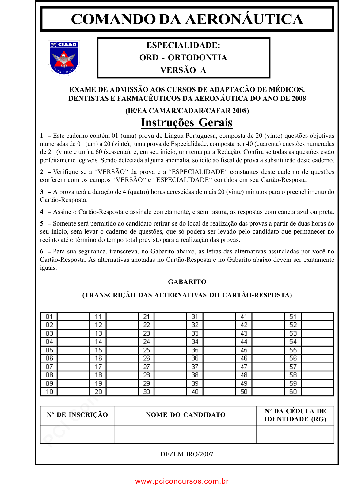 pcimarkpci MDAwMDowMDAwOjAwMDA6MDAwMDowMDAwOmZmZmY6MzZlOTpjMjU5:VGh1LCAxNiBTZXAgMjAyMSAxODowNzozMiAtMDMwMA== Instruções Gerais COMANDO DA AERONÁUTICA EXAME DE ADMISSÃO AOS CURSOS DE ADAPTAÇÃO DE MÉDICOS, DENTISTAS E FARMACÊUTICOS DA AERONÁUTICA DO ANO DE 2008 (IE/EA CAMAR/CADAR/CAFAR 2008) 1 Este caderno contém 01 (uma) prova de Língua Portuguesa, composta de 20 (vinte) questões objetivas numeradas de 01 (um) a 20 (vinte), uma prova de Especialidade, composta por 40 (quarenta) questões numeradas de 21 (vinte e um) a 60 (sessenta), e, em seu início, um tema para Redação. Confira se todas as questões estão perfeitamente legíveis. Sendo detectada alguma anomalia, solicite ao fiscal de prova a substituição deste caderno. 2 Verifique se a VERSÃO da prova e a ESPECIALIDADE constantes deste caderno de questões conferem com os campos VERSÃO e ESPECIALIDADE contidos em seu Cartão-Resposta. 3 A prova terá a duração de 4 (quatro) horas acrescidas de mais 20 (vinte) minutos para o preenchimento do Cartão-Resposta. 4 Assine o Cartão-Resposta e assinale corretamente, e sem rasura, as respostas com caneta azul ou preta. 5 Somente será permitido ao candidato retirar-se do local de realização das provas a partir de duas horas do seu início, sem levar o caderno de questões, que só poderá ser levado pelo candidato que permanecer no recinto até o término do tempo total previsto para a realização das provas. 6 Para sua segurança, transcreva, no Gabarito abaixo, as letras das alternativas assinaladas por você no Cartão-Resposta. As alternativas anotadas no Cartão-Resposta e no Gabarito abaixo devem ser exatamente iguais. GABARITO (TRANSCRIÇÃO DAS ALTERNATIVAS DO CARTÃO-RESPOSTA) ESPECIALIDADE: ORD - ORTODONTIA VERSÃO A DEZEMBRO/2007 Nº DE INSCRIÇÃO NOME DO CANDIDATO Nº DA CÉDULA DE IDENTIDADE (RG) www.pciconcursos.com.br pcimarkpci MDAwMDowMDAwOjAwMDA6MDAwMDowMDAwOmZmZmY6MzZlOTpjMjU5:VGh1LCAxNiBTZXAgMjAyMSAxODowNzozMiAtMDMwMA== TEMA PARA REDAÇÃO Construa um texto dissertativo sobre o tema A valorização dos talentos na Era da Economia do Conhecimento . O constante na página ao lado e o texto da prova de Língua Portuguesa fornecem elementos para a análise dessa questão. Seu texto deverá conter no mínimo 80 palavras, e a versão final deverá ser escrita com caneta preta ou azul, em letra legível. TÍTULO ________________________________________________________________________________________________ 1 5 10 15 20 25 30 2 www.pciconcursos.com.br pcimarkpci MDAwMDowMDAwOjAwMDA6MDAwMDowMDAwOmZmZmY6MzZlOTpjMjU5:VGh1LCAxNiBTZXAgMjAyMSAxODowNzozMiAtMDMwMA== INSTRUÇÕES PARA A REDAÇÃO Leia o tema. Analise as idéias nele contidas e faça uma redação expondo seus pontos de vista e conclusões. Dê um TÍTULO adequado ao texto. Seu texto deverá conter o mínimo de 80 (oitenta) palavras. A Redação que NÃO contiver o mínimo de 80 (oitenta) palavras terá 1 (hum) décimo deduzido por omissão de cada palavra, até o limite de 70 (setenta) palavras. À Redação com número inferior a 70 (setenta) palavras será atribuída nota zero. A Redação deverá obrigatoriamente ser transcrita do rascunho para a folha de texto definitiva da Prova de Redação, em tinta azul ou preta. Não serão fornecidas folhas adicionais para complementação da redação, devendo o candidato limitar-se a uma única folha padrão recebida, com 30 (trinta) linhas. Receberá o grau 0 (zero) a redação realizada a lápis, assinada, rubricada ou que contenha palavras ou marcas que a identifique. A NÃO obediência ao tema e/ou tipo de texto proposto (dissertativo-argumentativo) anulará a redação. O texto será avaliado a partir do uso adequado da norma culta da língua portuguesa, da coerência textual, da coesão lexical e gramatical, da argumentação adequada, de acordo com o constante em Edital. TEMA DA REDAÇÃO É interessante como alguns acontecimentos se repetem na história da humanidade. Assim como as moedas de ouro, que perderam lugar e status para o PIB (Produto Interno Bruto) dentro da economia padrão, o talento (moeda da Grécia antiga) também deixou de ser moeda metal visível e palpável. No entanto seu status nos dias atuais desfruta de forças jamais imagináveis. Vivemos em uma economia que é movida a talento. Na Era da Economia do Conhecimento , talento passa a significar uma série de aptidões naturais do ser humano, todas elas classificadas com qualidades presentes desde a mais tenra idade ou mesmo adquiridas com extrema facilidade em idades mais avançadas quando comparadas à população geral. Adaptado de: Ana Beatriz B. Silva Disponível em: http://www1.uol.com.br/vyaestelar/talento.htm. Acessado em: 14 nov. 2007. Tema: A valorização dos talentos na Era da Economia do Conhecimento 3 www.pciconcursos.com.br pcimarkpci MDAwMDowMDAwOjAwMDA6MDAwMDowMDAwOmZmZmY6MzZlOTpjMjU5:VGh1LCAxNiBTZXAgMjAyMSAxODowNzozMiAtMDMwMA== 4ORD - ORTODONTIA - VERSÃO A Questões de 1 a 20 Língua Portuguesa Texto 1 O talento, uniformemente distribuído por toda a população, (1) é essencialmente imprevisível. Esta entidade fantástica, produto das variações sutis e __________ na fiação infinitamente complexa de cada cérebro humano, (2) desconhece __________ de gênero, de raça ou de renda. Governada unicamente pela lei probabilística dos grandes números (3) atravessa, insensível, as fronteiras geográficas mais bem guardadas ou os __________ sociais mais arraigados. Na Índia (4) atropela o apartheid disfarçado em estrutura de casta e em todo o mundo (5) ridiculariza os teóricos fascistas da eugenia. Ao pai genial não se (6) assegura maior chance de filhos especiais, embora estes, geralmente crescendo em ambientes excepcionalmente estimulantes, possam manifestar lampejos que sugerem, ao observador desatento ou precondicionado, vínculos de natureza genética. E há espaço para todos, que vastas e infinitamente complexas são as dimensões de manifestaç