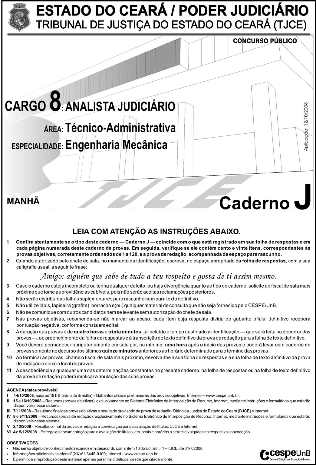 UnB/CESPE – TJCE Caderno J Cargo 8: Analista Judiciário – Área: Técnico-Administrativa – Especialidade: Engenharia Mecânica – 1 – • De acordo com o comando a que cada um dos itens de 1 a 120 se refira, marque, na folha de respostas, para cada item: o campo designado com o código C, caso julgue o item CERTO; ou o campo designado com o código E, caso julgue o item ERRADO. A ausência de marcação ou a marcação de ambos os campos não serão apenadas, ou seja, não receberão pontuação negativa. Para as devidas marcações, use a folha de respostas, único documento válido para a correção das suas provas. • Nos itens que avaliam Noções de Informática, a menos que seja explicitamente informado o contrário, considere que: todos os programas mencionados estão em configuração-padrão, em português; o mouse está configurado para pessoas destras; expressões como clicar, clique simples e clique duplo referem-se a cliques com o botão esquerdo do mouse; teclar corresponde à operação de pressionar uma tecla e, rapidamente, liberá-la, acionando-a apenas uma vez. Considere também que não há restrições de proteção, de funcionamento e de uso em relação aos programas, arquivos, diretórios, recursos e equipamentos mencionados. • Sempre que utilizadas, as siglas subseqüentes devem ser interpretadas com a significação associada a cada uma delas, da seguinte forma: EUA = Estados Unidos da América; MP = Ministério Público; OAB = Ordem dos Advogados do Brasil; TJCE = Tribunal de Justiça do Estado do Ceará. CONHECIMENTOS BÁSICOS Tudo parece ter começado a mudar nos últimos anos1 e as revisões profundas por que estão passando os discursos e as práticas identitárias deixam no ar a dúvida sobre se a concepção hegemônica da modernidade se equivocou na4 identificação das tendências dos processos sociais, ou se tais tendências se inverteram totalmente em tempos recentes, ou, ainda, sobre se se está perante uma inversão de tendências7 ou, antes, perante cruzamentos múltiplos de tendências opostas sem que seja possível identificar os vetores mais potentes. Como se calcula, as dúvidas são acima de tudo10 sobre se o que presenciamos é realmente novo ou se é apenas novo o olhar com que o presenciamos. Estamos em uma época em que é muito difícil ser-se linear. Porque estamos13 em uma fase de revisão radical do paradigma epistemológico da ciência moderna, é bem possível que seja sobretudo o olhar que esteja mudando. Mas, por outro lado, não parece16 crível que essa mudança tivesse ocorrido sem nada ter mudado no objeto do olhar que o olha. Boaventura Souza Santos. Modernidade, identidade e a cultura de fronteira. Tempo Social, USP, 1993, p. 39 (com adaptações). Acerca das idéias do texto acima e de suas estruturas lingüísticas, julgue os itens de 1 a 9. 1 A retirada da expressão “ter começado a” (R.1) preservaria a correção gramatical e a coerência da argumentação do texto, mas a idéia de que o processo de mudança se estende do passado ao presente seria perdida. 2 Na linha 2, o uso da preposição “por” antes do pronome relativo deve-se à regência da forma verbal “passando”, que está empregada no texto com a acepção de vivenciando. 3 A preposição “sobre” (R.3), que introduz os complementos da palavra “dúvida” (R.3), está subentendida imediatamente antes da primeira ocorrência de “se” (R.5). 4 Na linha 8, a preposição “perante”, no contexto em que ocorre, contribui para que a “inversão de tendências” (R.7) seja interpretada como um processo ainda em curso. 5 O desenvolvimento das idéias do texto permite inserir, na linha 10, sem prejudicar sua correção gramatical, uma vírgula logo após “são” e outra logo após “tudo”, demarcando-se a expressão “acima de tudo”. 6 No período “Estamos em uma época em que é muito difícil ser-se linear” (R.12-13), a expressão “em uma época” tem a função de localizar no tempo a afirmação de “ser-se linear”. Por isso, a preposição “em” logo após “época”, que tem igual função, poderia ser eliminada sem que houvesse prejuízo para a coerência e a correção gramatical do texto. 7 Mantendo-se a relação de sentidos originalmente estabelecida entre os três períodos finais do texto, pode-se suprimir o ponto antes de “Porque” (R.13), desde que esta palavra seja reescrita com inicial minúscula. 8 Segundo o texto, enquanto houver a confusão e a indefinição do “paradigma epistemológico da ciência moderna” (R.14-15), as práticas identitárias estarão baseadas em dúvidas. 9 No desenvolvimento das idéias do texto, a expressão “essa mudança” (R.17) retoma a idéia de “o olhar que esteja mudando” (R.15-16). Em primeiro lugar, é preciso definir o que vem a ser1 igualdade social. Esse conceito pressupõe que todos sejam forçados a viver em casas idênticas, ganhar os mesmos salários, comer as mesmas comidas e acreditar nos mesmos4 valores? Essa abordagem já foi tentada e os resultados foram e são desastrosos, para não dizer trágicos. Como os fundadores dos EUA sabiam muito bem, é impossível para7 um governo arcar com a missão de assegurar igualdade para todos os cidadãos. As pessoas não nascem iguais. Elas possuem habilidades e talentos próprios. O principal papel10 de um governo não é ir contra essa realidade e forçar algo que não existe nem existirá. O bom governo é aquele que oferece oportunidades iguais para todos buscarem a própria13 felicidade. Veja, 3/9/2008, p.17-20 (com adaptações). Com base na organização do texto acima, julgue os itens subseqüentes. 10 Na linha 1, a forma verbal “vem” está no singular porque concorda com o pronome demonstrativo “o”. 11 Preservam-se a coerência textual e a correção gramatical ao se escrever, em lugar da oração desenvolvida “que todos sejam forçados” (R.2-3), a reduzida equivalente serem 
