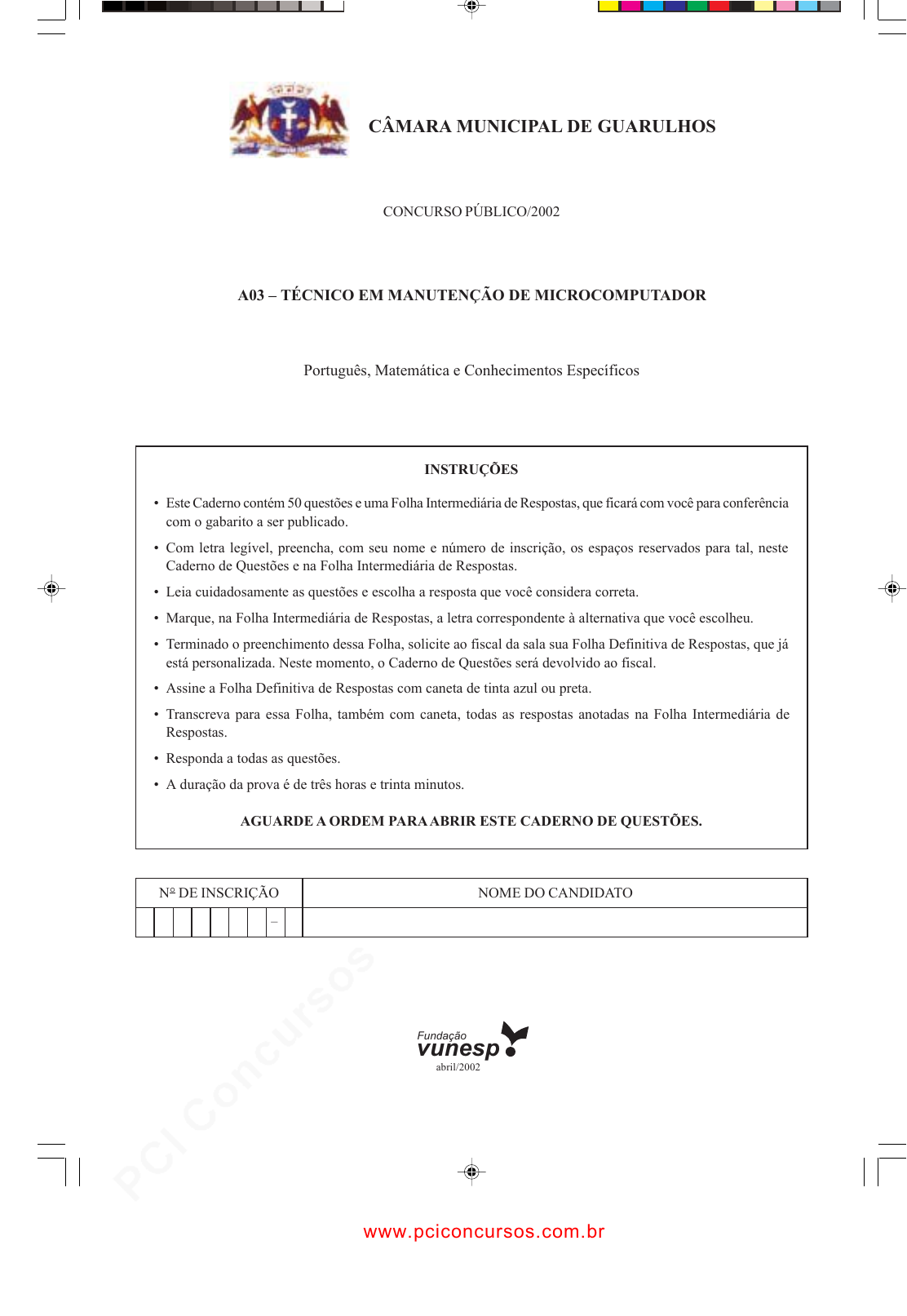 pcimarkpci MDAwMDowMDAwOjAwMDA6MDAwMDowMDAwOmZmZmY6MzZlOTpjMjU5:U2F0LCAxMSBTZXAgMjAyMSAxNjozMTowMSAtMDMwMA== CÂMARA MUNICIPAL DE GUARULHOS CONCURSO PÚBLICO/2002 A03 – TÉCNICO EM MANUTENÇÃO DE MICROCOMPUTADOR Português, Matemática e Conhecimentos Específicos INSTRUÇÕES • Este Caderno contém 50 questões e uma Folha Intermediária de Respostas, que ficará com você para conferência com o gabarito a ser publicado. • Com letra legível, preencha, com seu nome e número de inscrição, os espaços reservados para tal, neste Caderno de Questões e na Folha Intermediária de Respostas. • Leia cuidadosamente as questões e escolha a resposta que você considera correta. • Marque, na Folha Intermediária de Respostas, a letra correspondente à alternativa que você escolheu. • Terminado o preenchimento dessa Folha, solicite ao fiscal da sala sua Folha Definitiva de Respostas, que já está personalizada. Neste momento, o Caderno de Questões será devolvido ao fiscal. • Assine a Folha Definitiva de Respostas com caneta de tinta azul ou preta. • Transcreva para essa Folha, também com caneta, todas as respostas anotadas na Folha Intermediária de Respostas. • Responda a todas as questões. • A duração da prova é de três horas e trinta minutos. AGUARDE A ORDEM PARA ABRIR ESTE CADERNO DE QUESTÕES. N° DE INSCRIÇÃO NOME DO CANDIDATO – Fundação vunesp abril/2002 www.pciconcursos.com.br pcimarkpci MDAwMDowMDAwOjAwMDA6MDAwMDowMDAwOmZmZmY6MzZlOTpjMjU5:U2F0LCAxMSBTZXAgMjAyMSAxNjozMTowMSAtMDMwMA== CMG/TécManMicro/Port 2 PORTUGUÊS Leia o texto e responda às questões de números 01 a 06. Estava à toa na vida, o meu amor me chamou Pra ver a banda passar cantando coisas de amor. A minha gente sofrida despediu-se da dor Pra ver a banda passar cantando coisas de amor. O homem sério que contava dinheiro parou. O faroleiro que contava vantagem parou. A namorada que contava estrelas parou para ver, ouvir e dar passagem. A moça triste que vivia calada sorriu. A rosa triste que vivia fechada se abriu. A meninada toda se assanhou pra ver a banda passar cantando coisas de amor. (...) (HOLLANDA, Chico Buarque de. A Banda.) 01. A passagem da banda provocou no povo da cidade (A) indignação com o tumulto. (B) apatia diante do fato. (C) hesitação quanto às atitudes a serem tomadas. (D) intransigência com a desordem. (E) transformação do comportamento. 02. Na expressão minha gente (verso 3), o uso do pronome possessivo minha indica (A) indiferença. (B) desprezo. (C) ironia. (D) cortesia. (E) afeto. 03. Nos versos 5 e 6, as palavras que destacadas referem-se, respectivamente, a (A) homem sério e faroleiro. (B) faroleiro e dinheiro. (C) dinheiro e vantagem. (D) vantagem e homem sério. (E) homem sério e banda. 04. A oração pra ver a banda passar (verso 2) pode ser substi- tuída por outra de sentido equivalente, apresentada na alter- nativa (A) porque viu a banda passar. (B) quando viu a banda passar. (C) a fim de que eu visse a banda passar. (D) assim que a banda passou. (E) embora tivesse visto a banda passar. 05. Assinale a alternativa em que a palavra grifada está empre- gada em sentido figurado. (A) O homem sério que contava dinheiro parou. (B) O meu amor me chamou... (C) A moça triste que vivia calada sorriu. (D) A rosa triste que vivia fechada se abriu. (E) A meninada toda se assanhou. 06. No trecho – pra ver a banda passar, cantando coisas de amor (verso 2) –, tem-se o seguinte: (A) “passar” como ação posterior a “cantando”. (B) “passar” como ação anterior a “cantando”. (C) “passar” como ação simultânea a “cantando”. (D) “ver” como ação anterior a “passar”. (E) “ver” como ação posterior a “passar”. 07. Assinale a alternativa em que a colocação pronominal está correta. (A) Me disseram que hoje choverá. (B) As pessoas nem importaram-se com o ocorrido. (C) Se visse-a, não teria dúvidas sobre sua conduta. (D) Nunca se deve acreditar em fofocas. (E) Ele disse que amava-me muito. Nas questões de números 08 a 10, assinale a alternativa cuja seqüência preenche, corretamente, as lacunas do texto. 08. Muito , disse ela. Vocês procederam , consi- derando meu ponto de vista e minha argumentação . (A) obrigada, certo, sensatos (B) obrigado, certo, sensato (C) obrigada, certos, sensatos (D) obrigados, certo, sensatos (E) obrigada, certas, sensata www.pciconcursos.com.br pcimarkpci MDAwMDowMDAwOjAwMDA6MDAwMDowMDAwOmZmZmY6MzZlOTpjMjU5:U2F0LCAxMSBTZXAgMjAyMSAxNjozMTowMSAtMDMwMA== 3 CMG/TécManMicro/Port 09. Nenhum de nós dizer o cidadão portou-se tão . (A) soubemos, porque, eminente, mau (B) soubemos, por quê, iminente, mal (C) soube, por que, eminente, mal (D) soube, porque, eminente, mau (E) soube, porquê, iminente, mal 10. Dirigi-me essa professora a fim de colocar-me disposição para o trabalho planejado tanto tempo. (A) a, a, a (B) à, à, a (C) à, a, há (D) a, à, à (E) a, à, há Leia o texto e responda às questões de números 11 a 13. Talvez estejamos cometendo um equívoco, mas a intolerân- cia e o preconceito quase sempre são resultantes de uma inocência deteriorada, que compõe o cenário moderno. 11. De acordo com o texto, é correto afirmar que (A) atualmente todos são intolerantes e preconceituosos. (B) a intolerância e o preconceito estão presentes na socie- dade urbana sem sombra de dúvidas. (C) há a convicção de que o preconceito e a intolerância têm a mesma origem. (D) embora não haja certeza, a intolerância e o preconceito podem ter a mesma origem. (E) há sérias dúvidas sobre a existência da intolerância e do preconceito. 12. Em inocência deteriorada, o adjetivo significa (A) pura, cândida. (B) exteriorizada, externa. (C) escondida, interna. (D) indevida, imprópria. (E) adulterada, estragada. 13. A palavra equívoco obedece à mesma regra de acentuação das seguintes palavras: (A) júpiter, espírito, gramática. (B) retórica, farmácia, saída. (C)