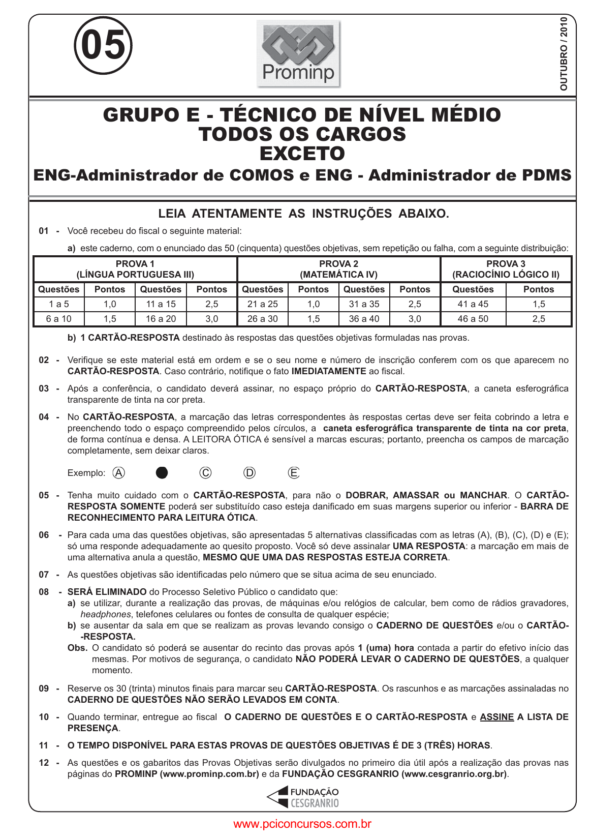 pcimarkpci MDAwMDowMDAwOjAwMDA6MDAwMDowMDAwOmZmZmY6MzZlOTpjMjU5:U2F0LCAxMSBTZXAgMjAyMSAxNzowNTozNyAtMDMwMA== 1 GRUPO E - TÉCNICO DE NÍVEL MÉDIO - TODOS OS CARGOS EXCETO ENG-Administrador de COMOS e ENG - Administrador de PDMS LEIA ATENTAMENTE AS INSTRUÇÕES ABAIXO. 01 - Você recebeu do fiscal o seguinte material: a) este caderno, com o enunciado das 50 (cinquenta) questões objetivas, sem repetição ou falha, com a seguinte distribuição: b) 1 CARTÃO-RESPOSTA destinado às respostas das questões objetivas formuladas nas provas. 02 - Verifique se este material está em ordem e se o seu nome e número de inscrição conferem com os que aparecem no CARTÃO-RESPOSTA. Caso contrário, notifique o fato IMEDIATAMENTE ao fiscal. 03 - Após a conferência, o candidato deverá assinar, no espaço próprio do CARTÃO-RESPOSTA, a caneta esferográfica transparente de tinta na cor preta. 04 - No CARTÃO-RESPOSTA, a marcação das letras correspondentes às respostas certas deve ser feita cobrindo a letra e preenchendo todo o espaço compreendido pelos círculos, a caneta esferográfica transparente de tinta na cor preta, de forma contínua e densa. A LEITORA ÓTICA é sensível a marcas escuras; portanto, preencha os campos de marcação completamente, sem deixar claros. Exemplo: 05 - Tenha muito cuidado com o CARTÃO-RESPOSTA, para não o DOBRAR, AMASSAR ou MANCHAR. O CARTÃO- RESPOSTA SOMENTE poderá ser substituído caso esteja danificado em suas margens superior ou inferior - BARRA DE RECONHECIMENTO PARA LEITURA ÓTICA. 06 - Para cada uma das questões objetivas, são apresentadas 5 alternativas classificadas com as letras (A), (B), (C), (D) e (E); só uma responde adequadamente ao quesito proposto. Você só deve assinalar UMA RESPOSTA: a marcação em mais de uma alternativa anula a questão, MESMO QUE UMA DAS RESPOSTAS ESTEJA CORRETA. 07 - As questões objetivas são identificadas pelo número que se situa acima de seu enunciado. 08 - SERÁ ELIMINADO do Processo Seletivo Público o candidato que: a) se utilizar, durante a realização das provas, de máquinas e/ou relógios de calcular, bem como de rádios gravadores, headphones, telefones celulares ou fontes de consulta de qualquer espécie; b) se ausentar da sala em que se realizam as provas levando consigo o CADERNO DE QUESTÕES e/ou o CARTÃO- -RESPOSTA. Obs. O candidato só poderá se ausentar do recinto das provas após 1 (uma) hora contada a partir do efetivo início das mesmas. Por motivos de segurança, o candidato NÃO PODERÁ LEVAR O CADERNO DE QUESTÕES, a qualquer momento. 09 - Reserve os 30 (trinta) minutos finais para marcar seu CARTÃO-RESPOSTA. Os rascunhos e as marcações assinaladas no CADERNO DE QUESTÕES NÃO SERÃO LEVADOS EM CONTA. 10 - Quando terminar, entregue ao fiscal O CADERNO DE QUESTÕES E O CARTÃO-RESPOSTA e ASSINE A LISTA DE PRESENÇA. 11 - O TEMPO DISPONÍVEL PARA ESTAS PROVAS DE QUESTÕES OBJETIVAS É DE 3 (TRÊS) HORAS. 12 - As questões e os gabaritos das Provas Objetivas serão divulgados no primeiro dia útil após a realização das provas nas páginas do PROMINP (www.prominp.com.br) e da FUNDAÇÃO CESGRANRIO (www.cesgranrio.org.br). 05 O U TU B R O / 20 10 PROVA 1 (LÍNGUA PORTUGUESA III) PROVA 2 (MATEMÁTICA IV) PROVA 3 (RACIOCÍNIO LÓGICO II) Questões Pontos Questões Pontos Questões Pontos Questões Pontos Questões Pontos 1 a 5 1,0 11 a 15 2,5 21 a 25 1,0 31 a 35 2,5 41 a 45 1,5 6 a 10 1,5 16 a 20 3,0 26 a 30 1,5 36 a 40 3,0 46 a 50 2,5 GRUPO E - TÉCNICO DE NÍVEL MÉDIO TODOS OS CARGOS EXCETO ENG-Administrador de COMOS e ENG - Administrador de PDMS www.pciconcursos.com.br pcimarkpci MDAwMDowMDAwOjAwMDA6MDAwMDowMDAwOmZmZmY6MzZlOTpjMjU5:U2F0LCAxMSBTZXAgMjAyMSAxNzowNTozNyAtMDMwMA== GRUPO E - TÉCNICO DE NÍVEL MÉDIO - TODOS OS CARGOS EXCETO ENG-Administrador de COMOS e ENG - Administrador de PDMS 2 LÍNGUA PORTUGUESA III COMO NÃO PENSEI NISSO ANTES? Para ser um inventor, basta enxergar os proble- mas como matéria-prima para a criatividade e apos- tar nas próprias ideias. “No meio do caminho tinha uma pedra/ tinha uma pedra no meio do caminho.” O poeta Carlos Drum- mond de Andrade criou um dos textos mais famosos da literatura brasileira ao buscar inspiração num obs- táculo. De forma parecida, muita gente, famosa ou anônima, no decorrer da história, tem convertido suas dificuldades em criações. Não é difícil perceber que, na origem de todos os objetos criados pelo homem, havia um problema. Foi de tanto machucar os pés ao caminhar descalço que algum remoto ancestral inventou o calçado, por exemplo. Cansado de beber água usando as próprias mãos, alguém concebeu o copo. E por aí vai. Diante de uma pedra no caminho, pode-se la- mentá-la ou tentar removê-la. A primeira opção é a mais fácil, mas não leva a nada. A segunda nos per- mite não só dar um fim ao empecilho, mas também deixar uma contribuição para a humanidade. Foi esse rumo que o motorista de caminhão aposentado José Roberto Rodrigues, de 55 anos, escolheu. Há 15 anos, em um acampamento, José viu um botijão de gás ir pelos ares. Impressionado com o acidente, pôs na cabeça que poderia fazer algo para evitá-lo. Anos depois, teve a ideia: se acondicionasse o botijão dentro de uma estrutura fechada e a conec- tasse com a área externa da casa, o problema estaria resolvido. Afinal, a explosão só acontece se há acú- mulo de gás dentro da cozinha. Estava concebida a cápsula antiexplosão. Para construir a engenhoca, ele pegou um balde grande de plástico, desses usados como lixeira, e fez dois furos: um para a mangueira do botijão e outro para permitir a conexão com o exterior da casa. Se o gás vazar, sai para o ambiente externo. “Fiz tudo sozinho”, orgulha-se José. Tempos depois, inspirado pelas filhas, que vol- ta e meia deixavam a comida queimar, aperfeiçoou o invento. Adicionou-lhe um dispositivo capaz de con- trolar o tempo pelo qual o fogão permanece aceso. Para isso, com